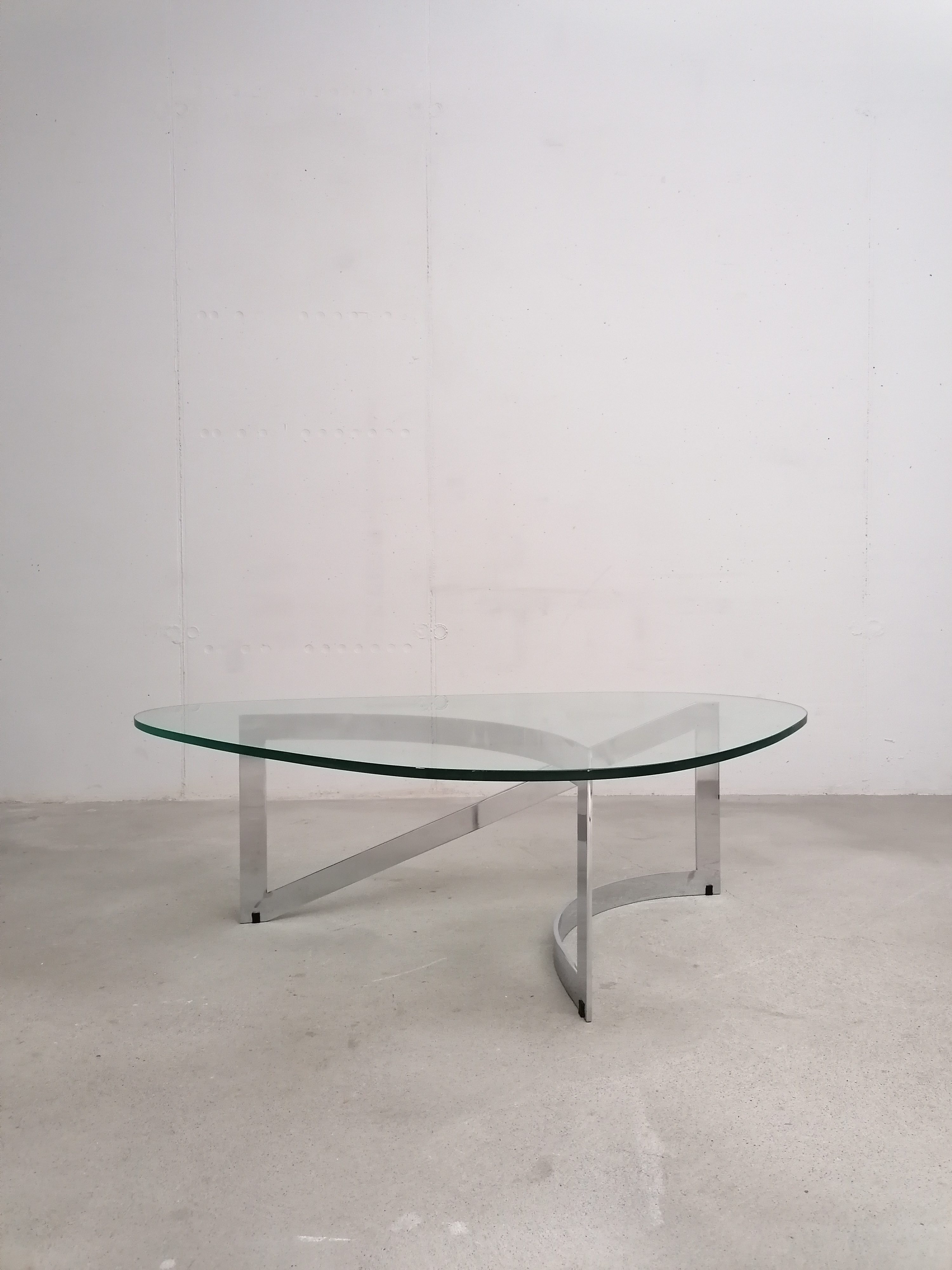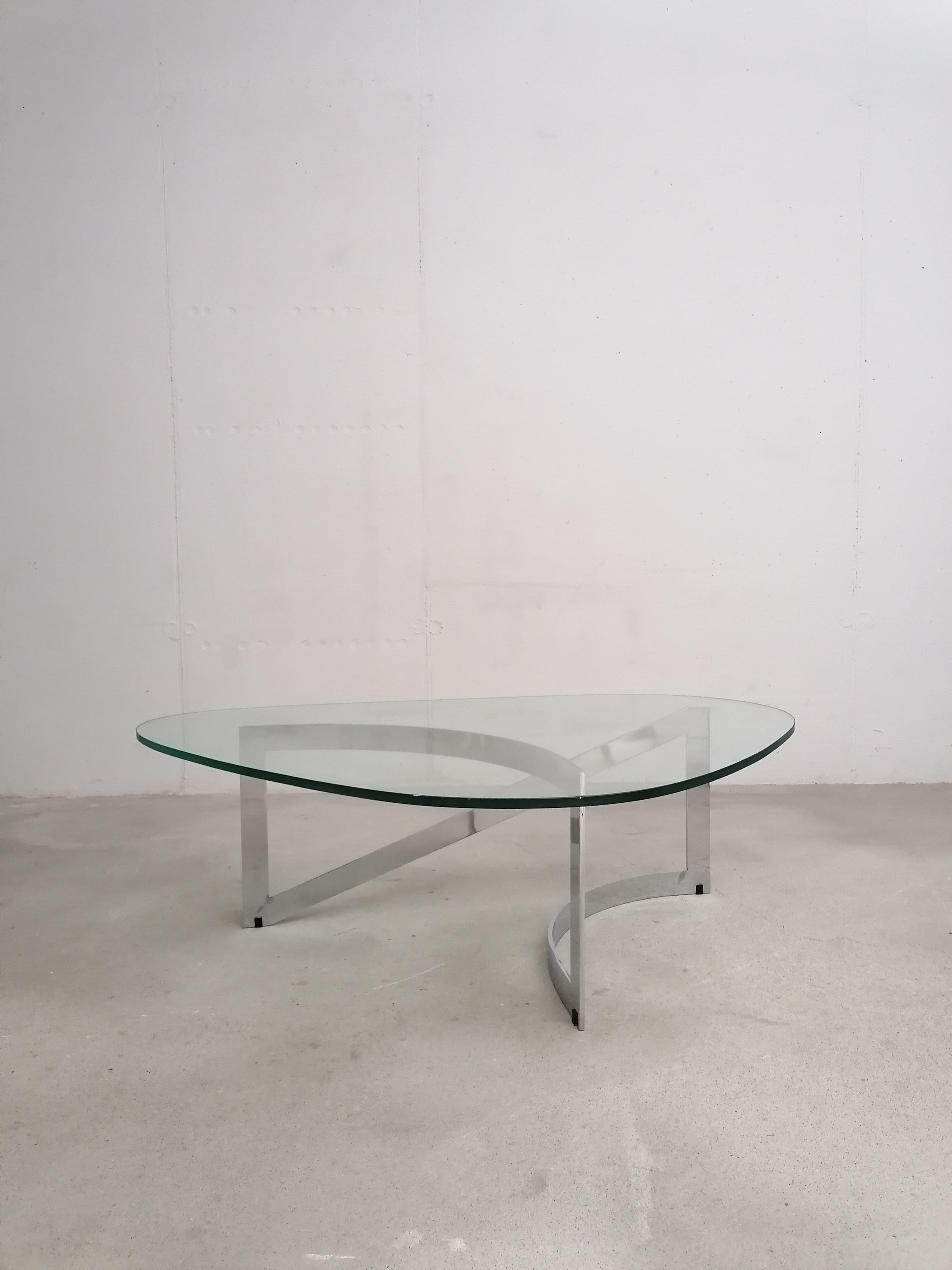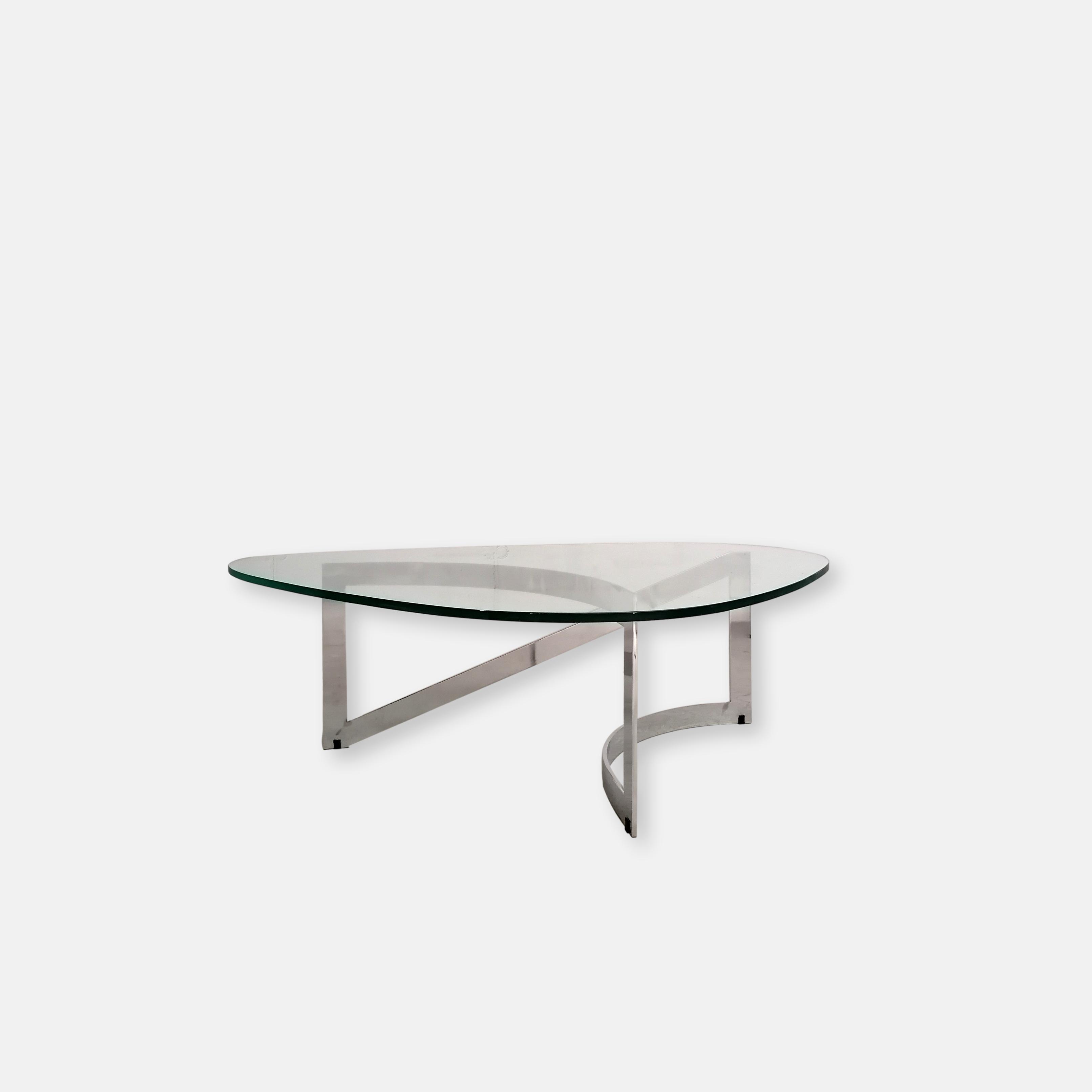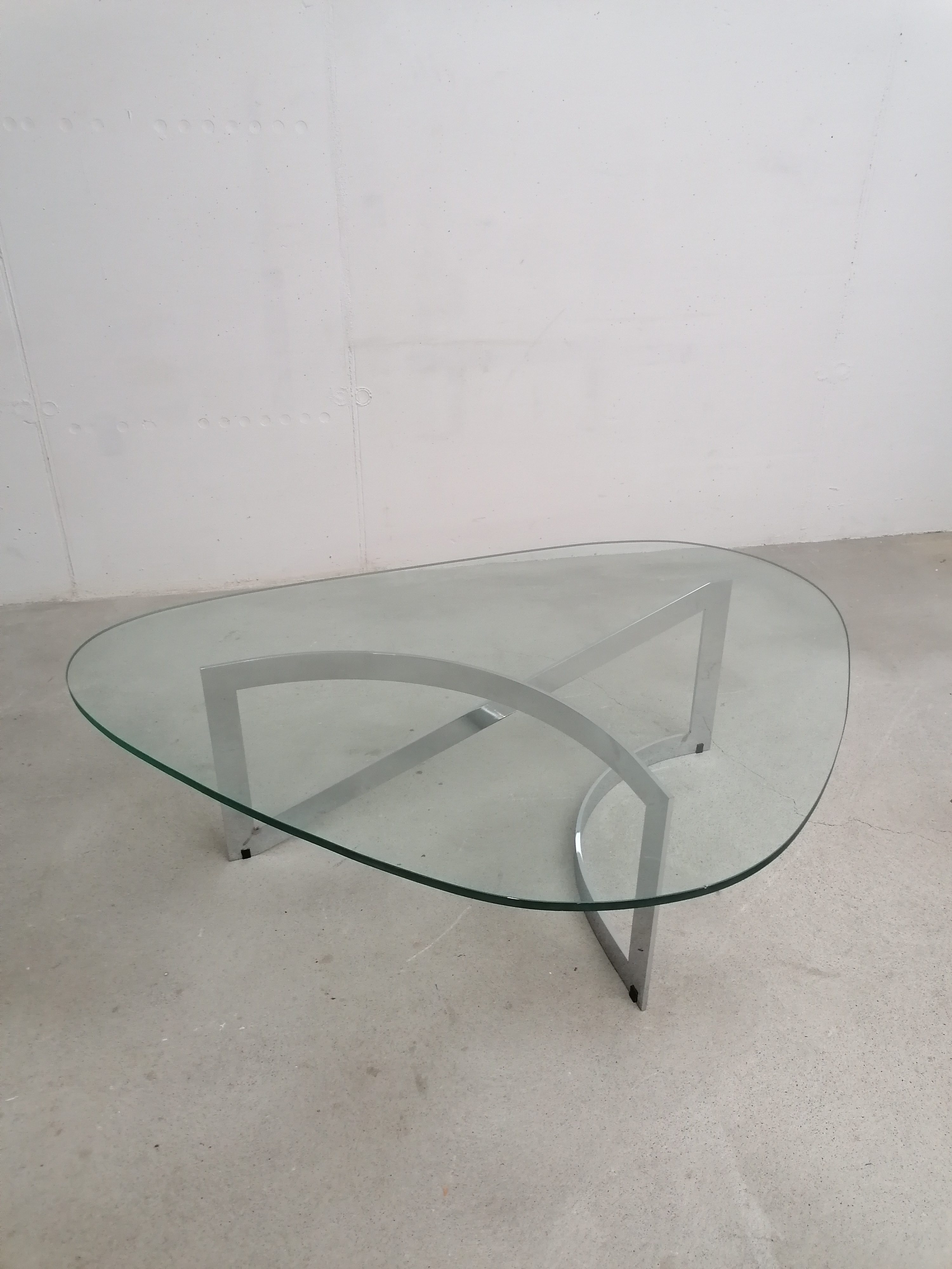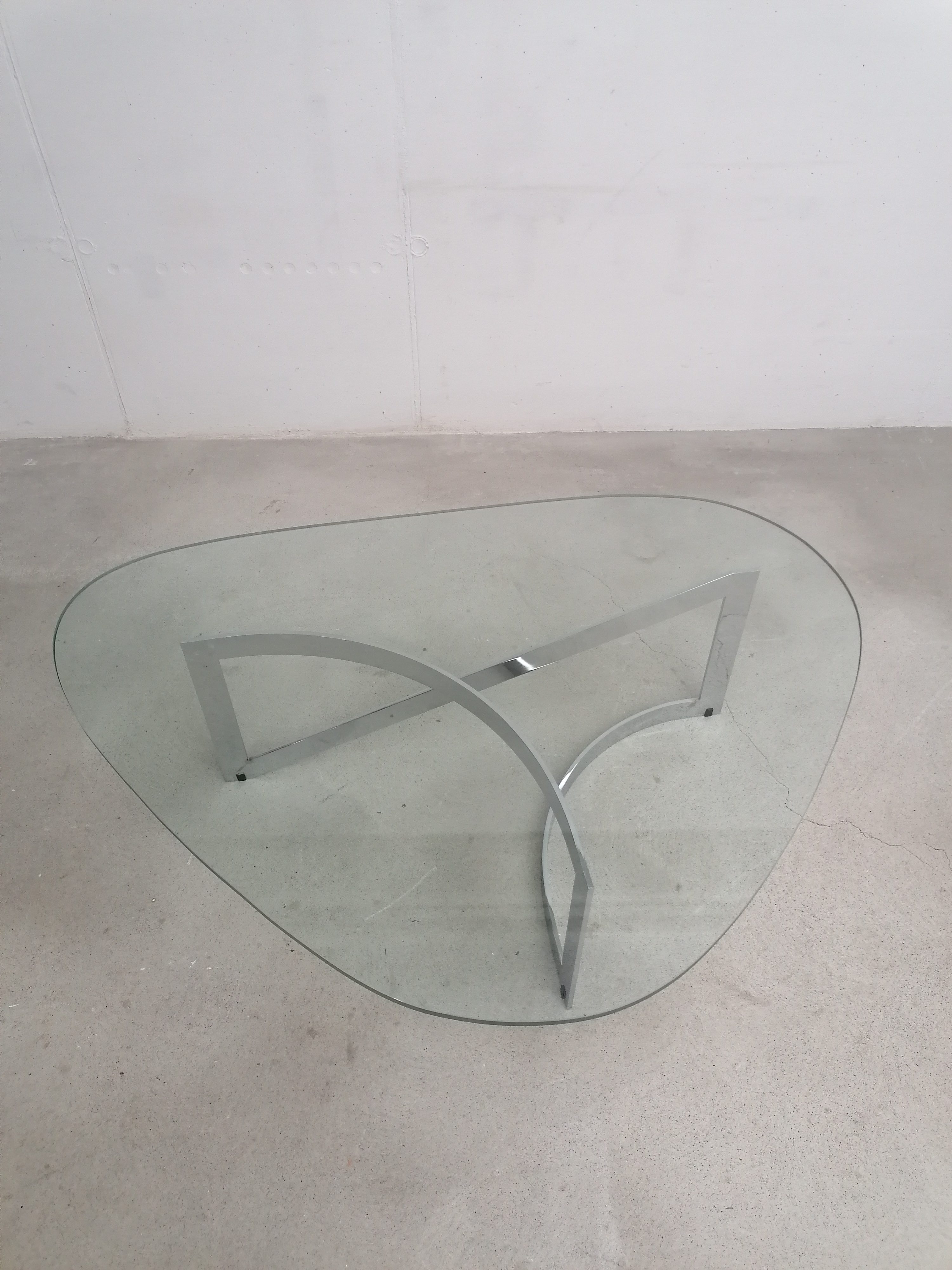 Produit venduTable basse constituée d’un piètement en lame d’acier chromé et d’un plateau en verre. Un petit éclats très discret est présent en bordure du verre. Quelques légères traces d’usage sur le verre. Plateau assez lourd.