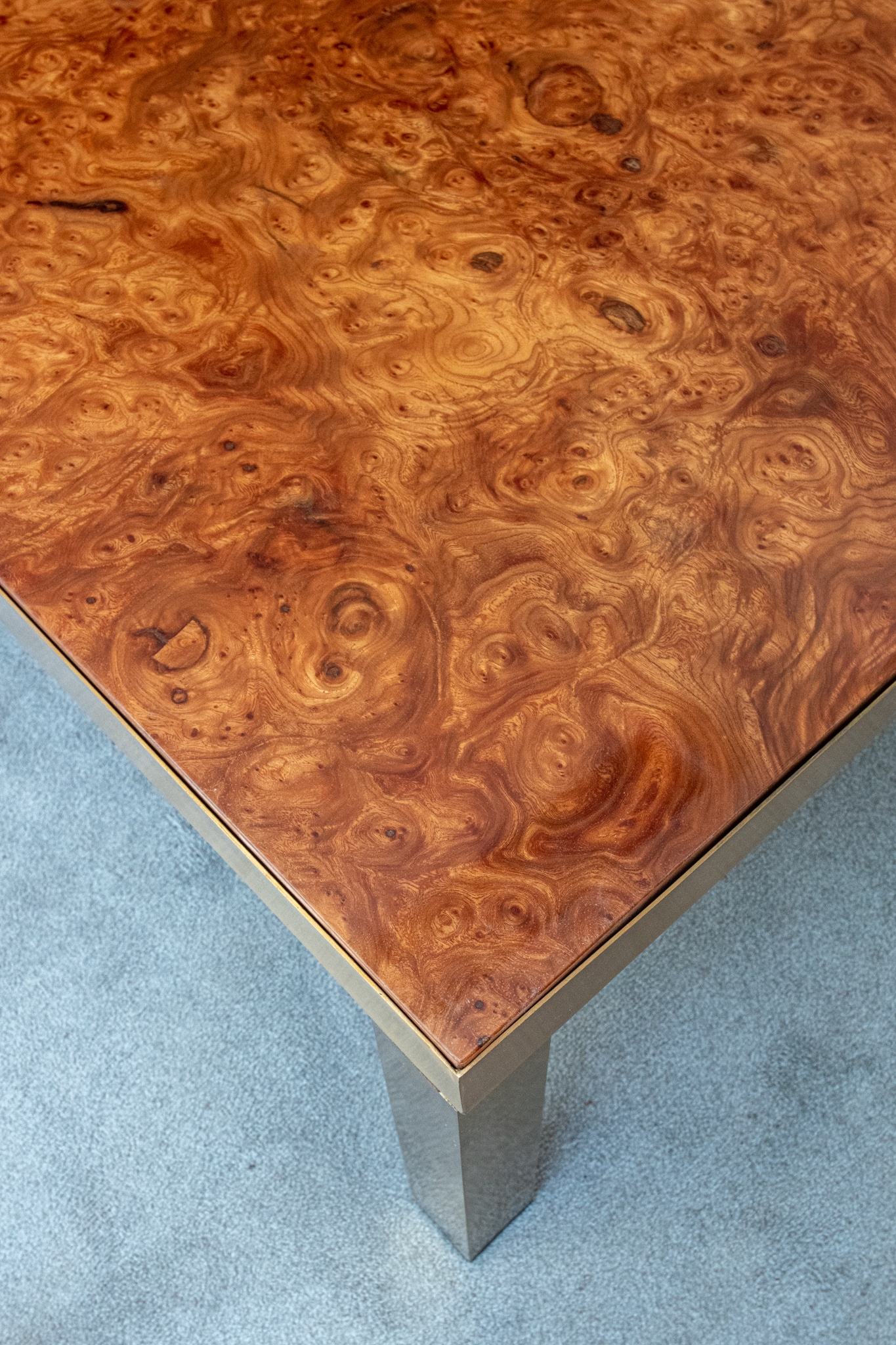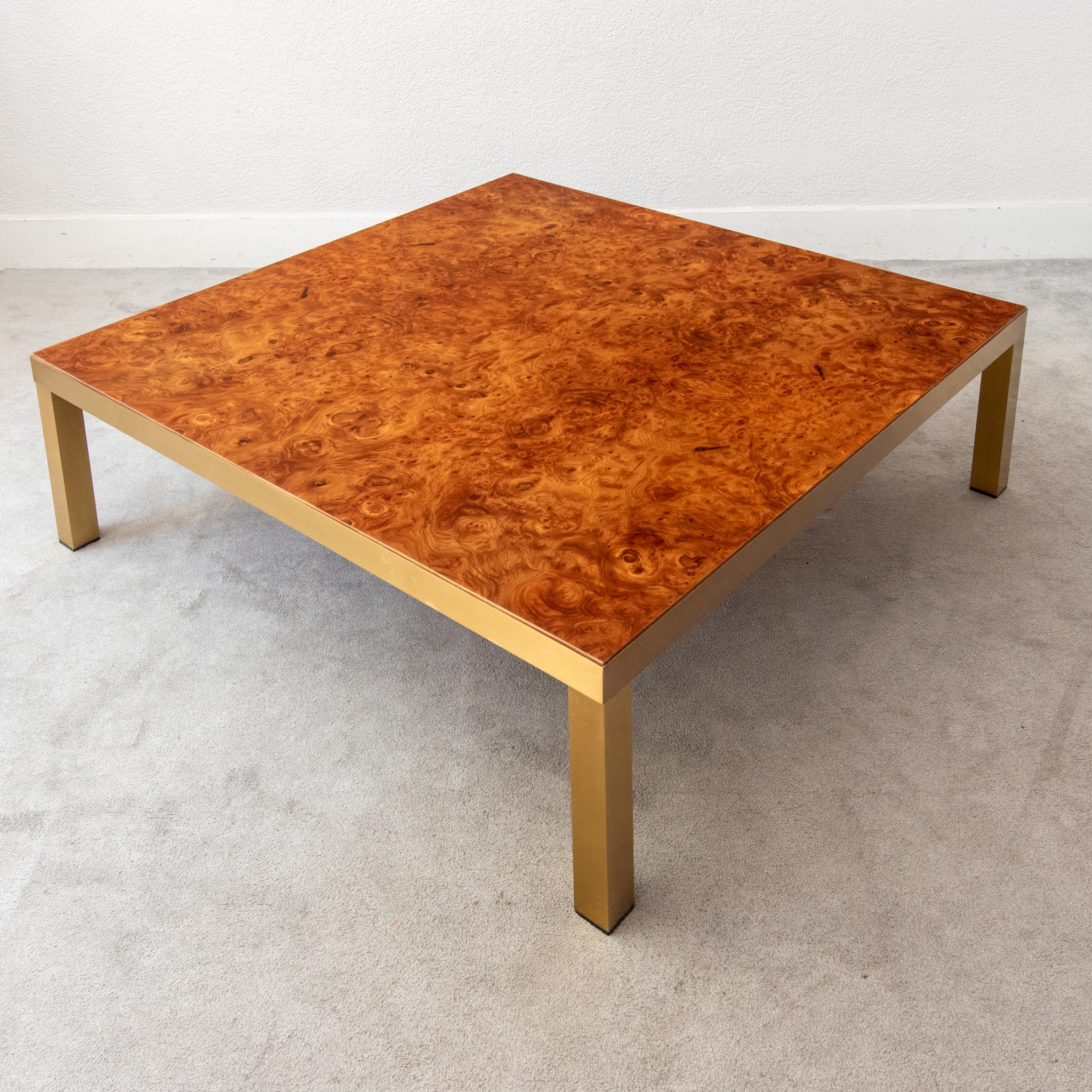 Table basse loupe d’érable et laiton, attribué à La Permanente Mobili Cantù, Italie années 70.