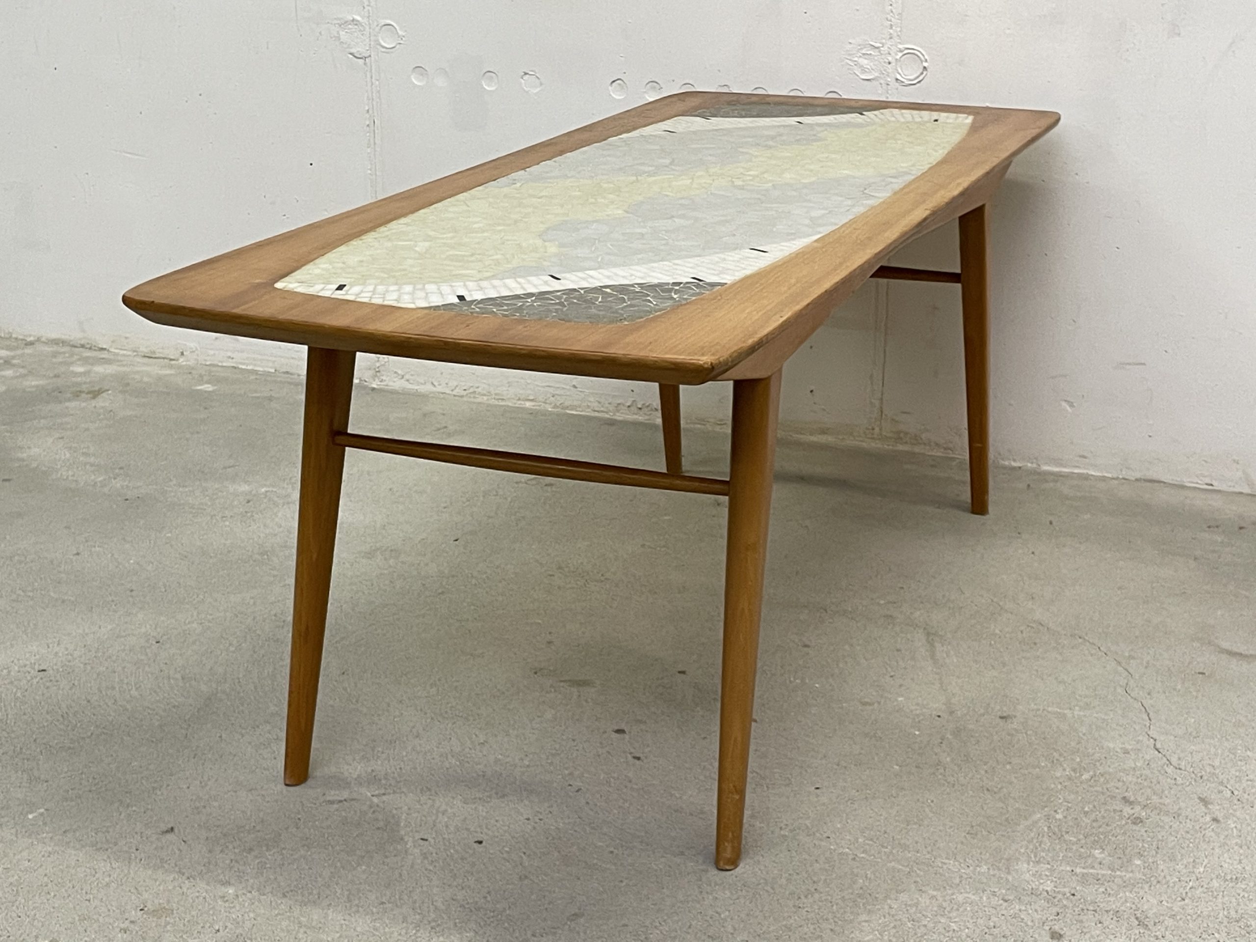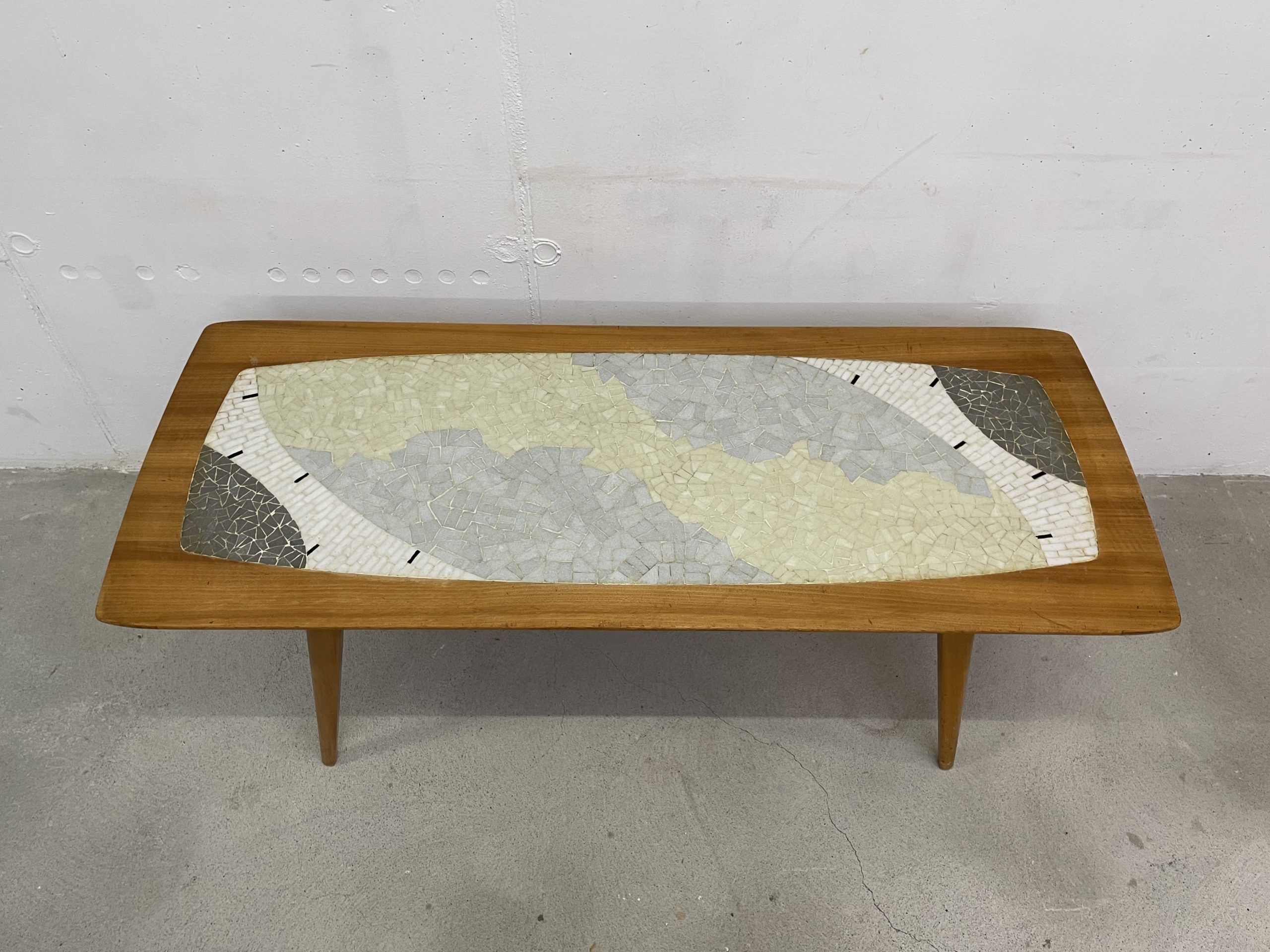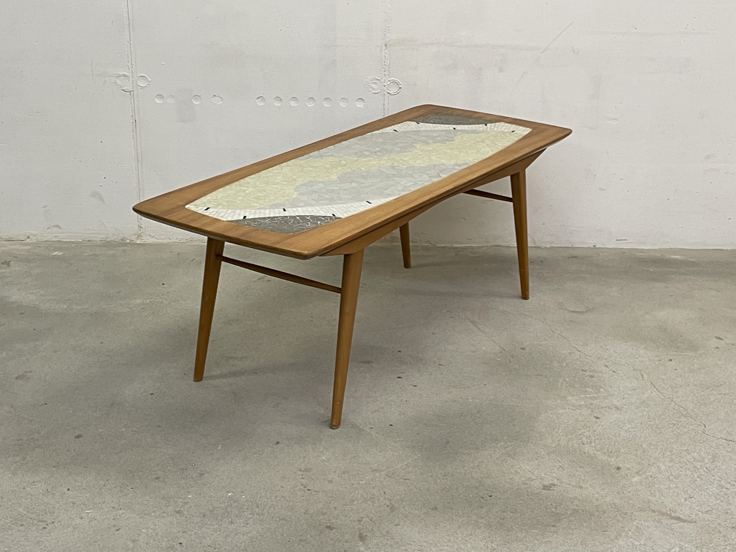 Produit venduTable basse en bois clair avec revêtement en mosaïque sur le dessus. L’état général de la table est bon; elle comporte des traces normales d’utilisation et de petites taches peu visibles.