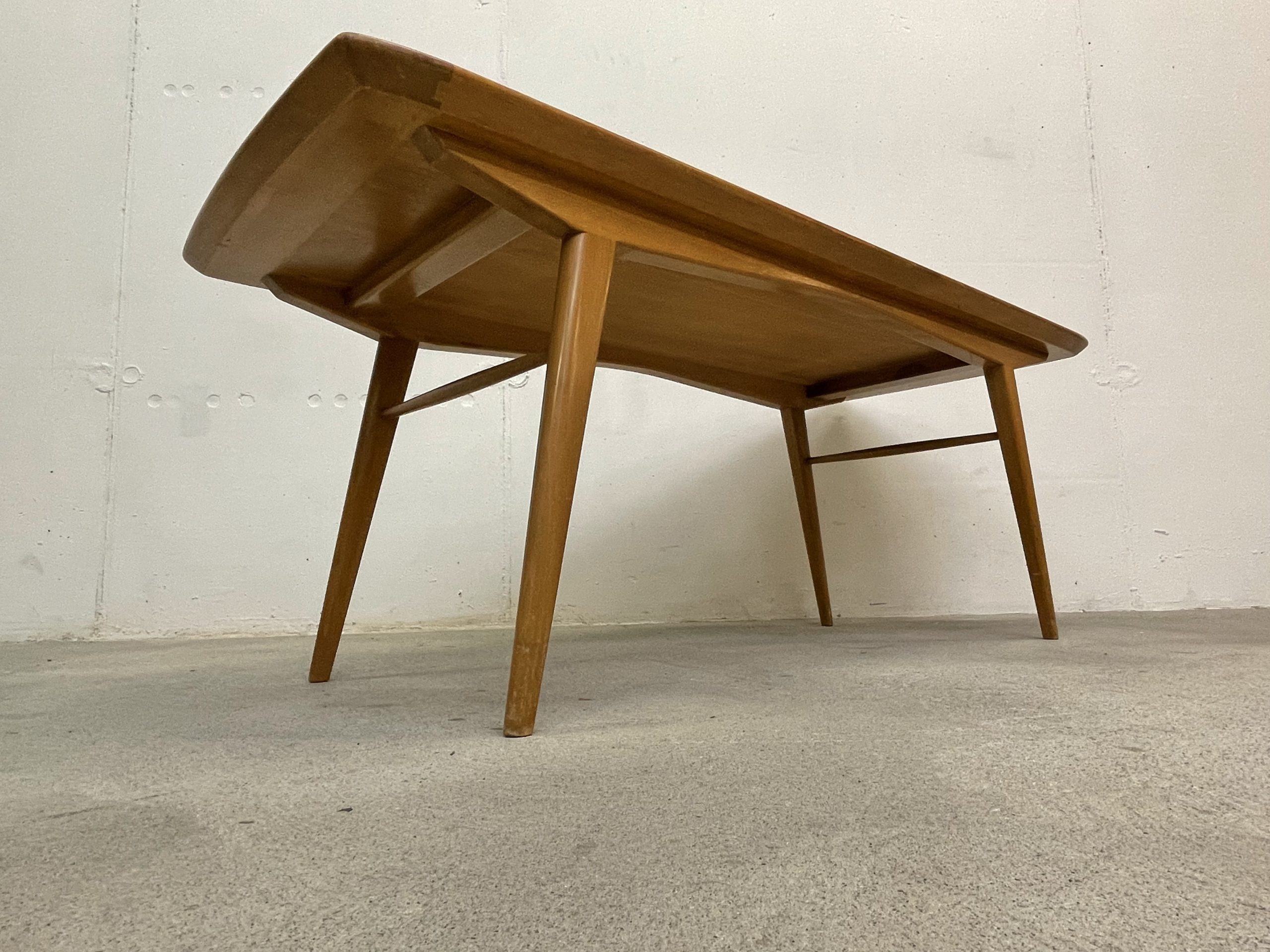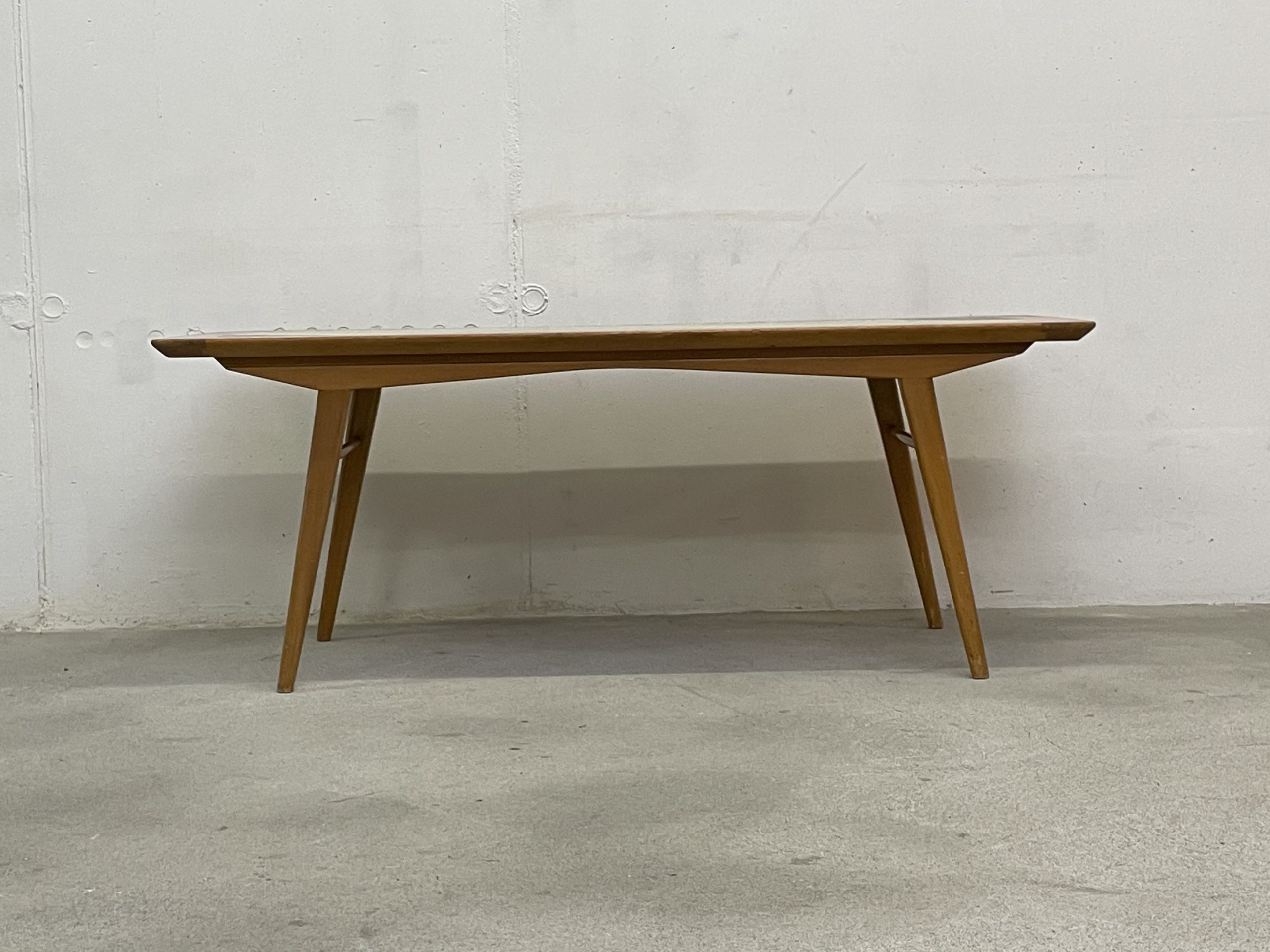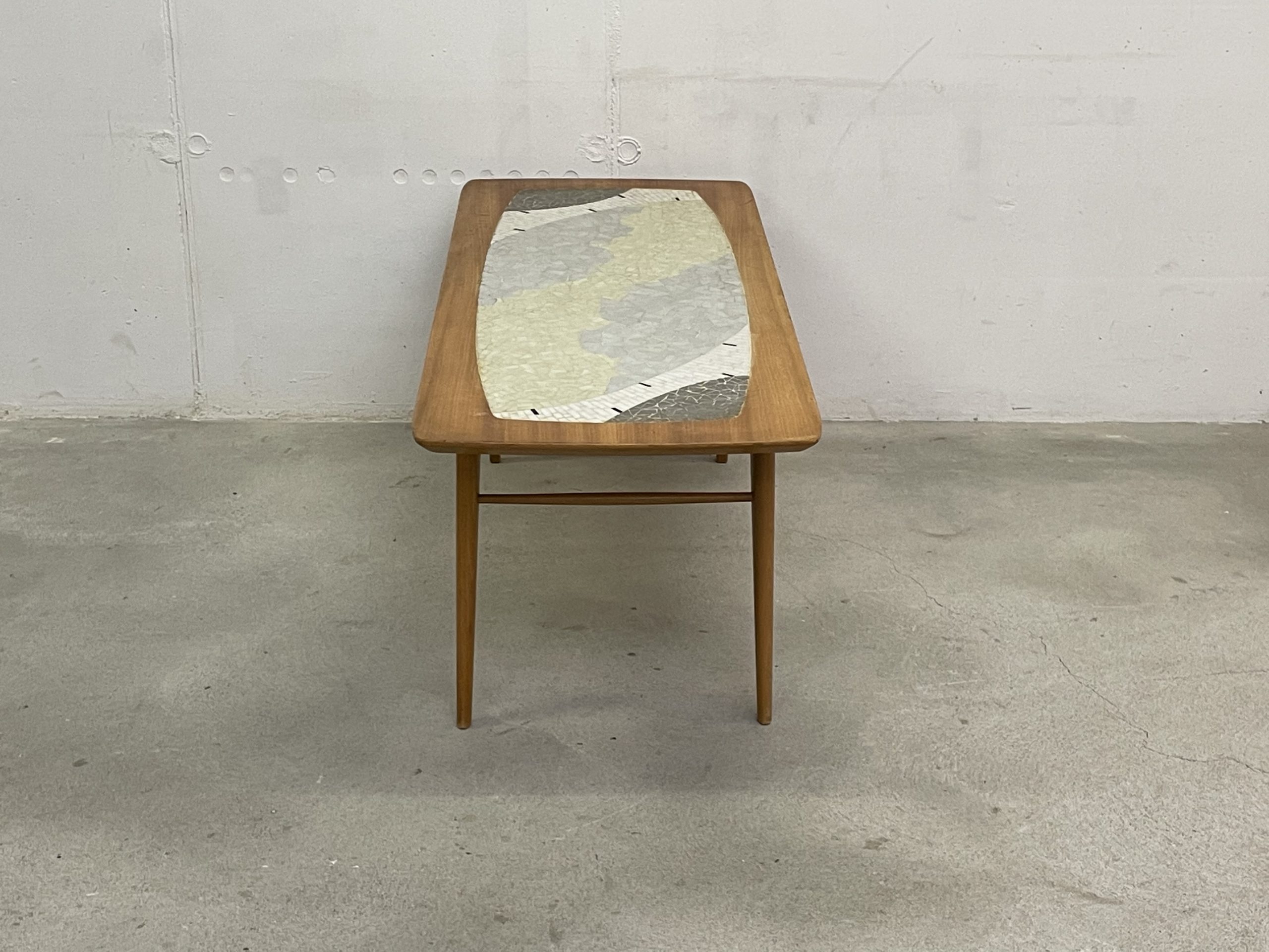 Produit venduTable basse en bois clair avec revêtement en mosaïque sur le dessus. L’état général de la table est bon; elle comporte des traces normales d’utilisation et de petites taches peu visibles.