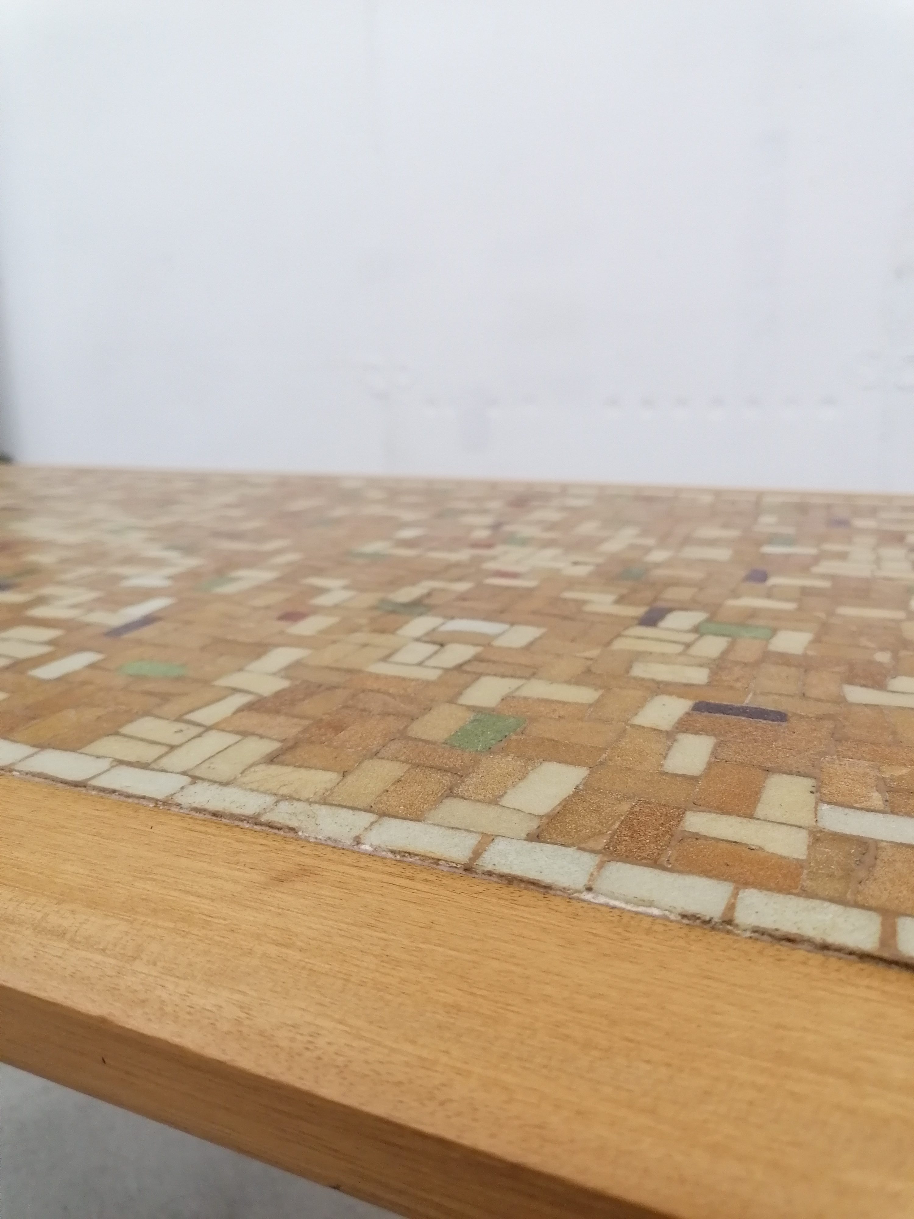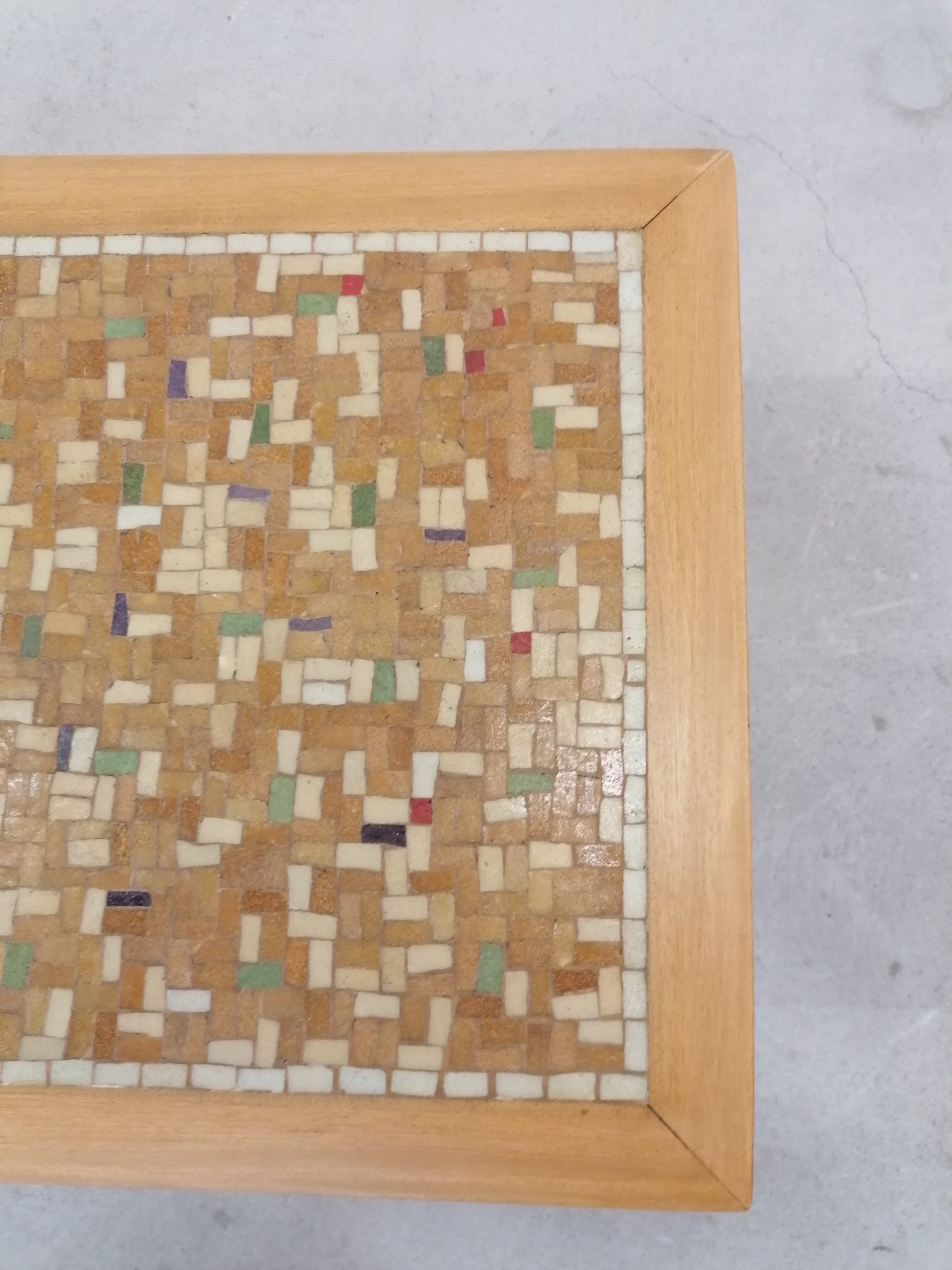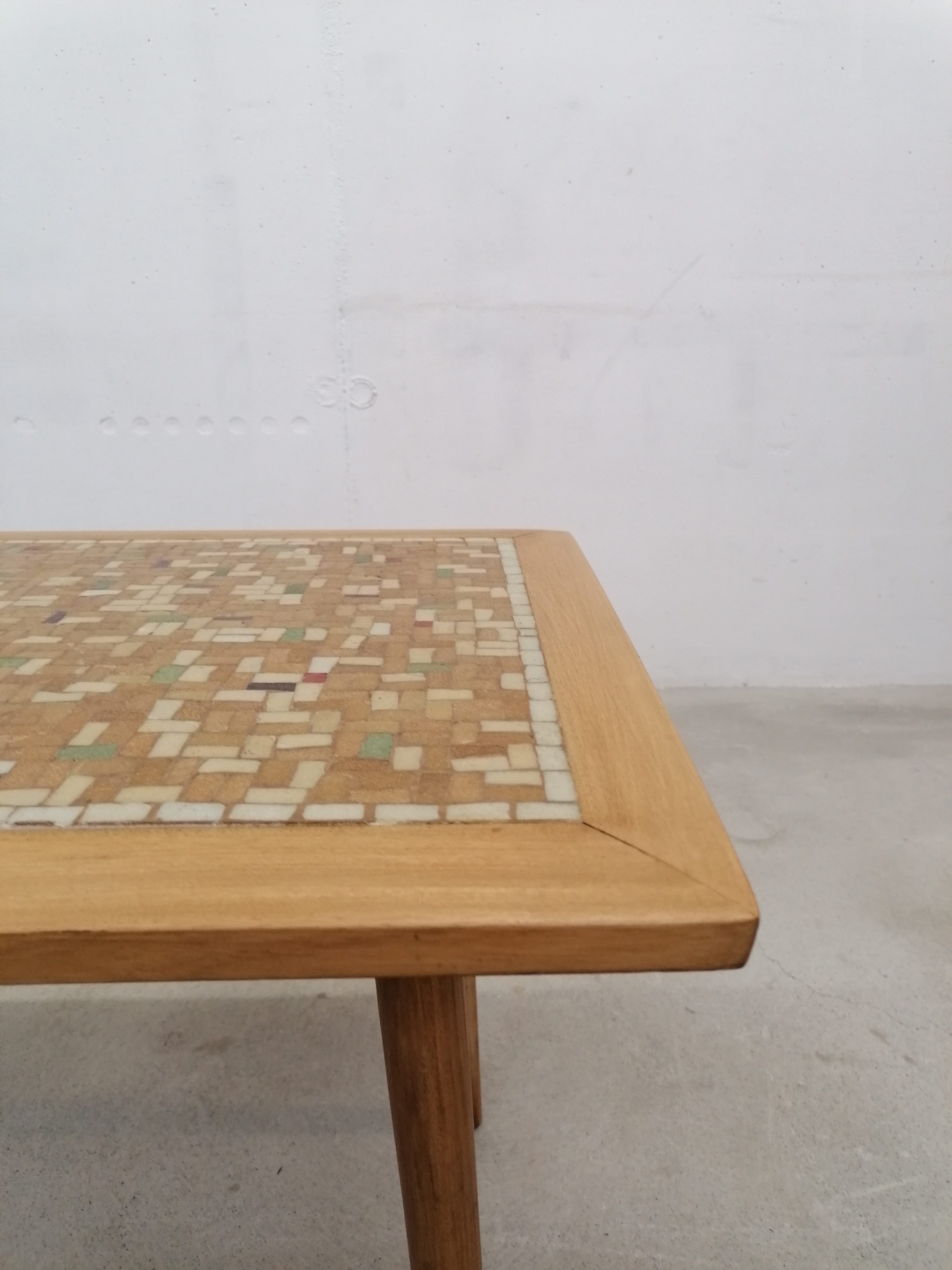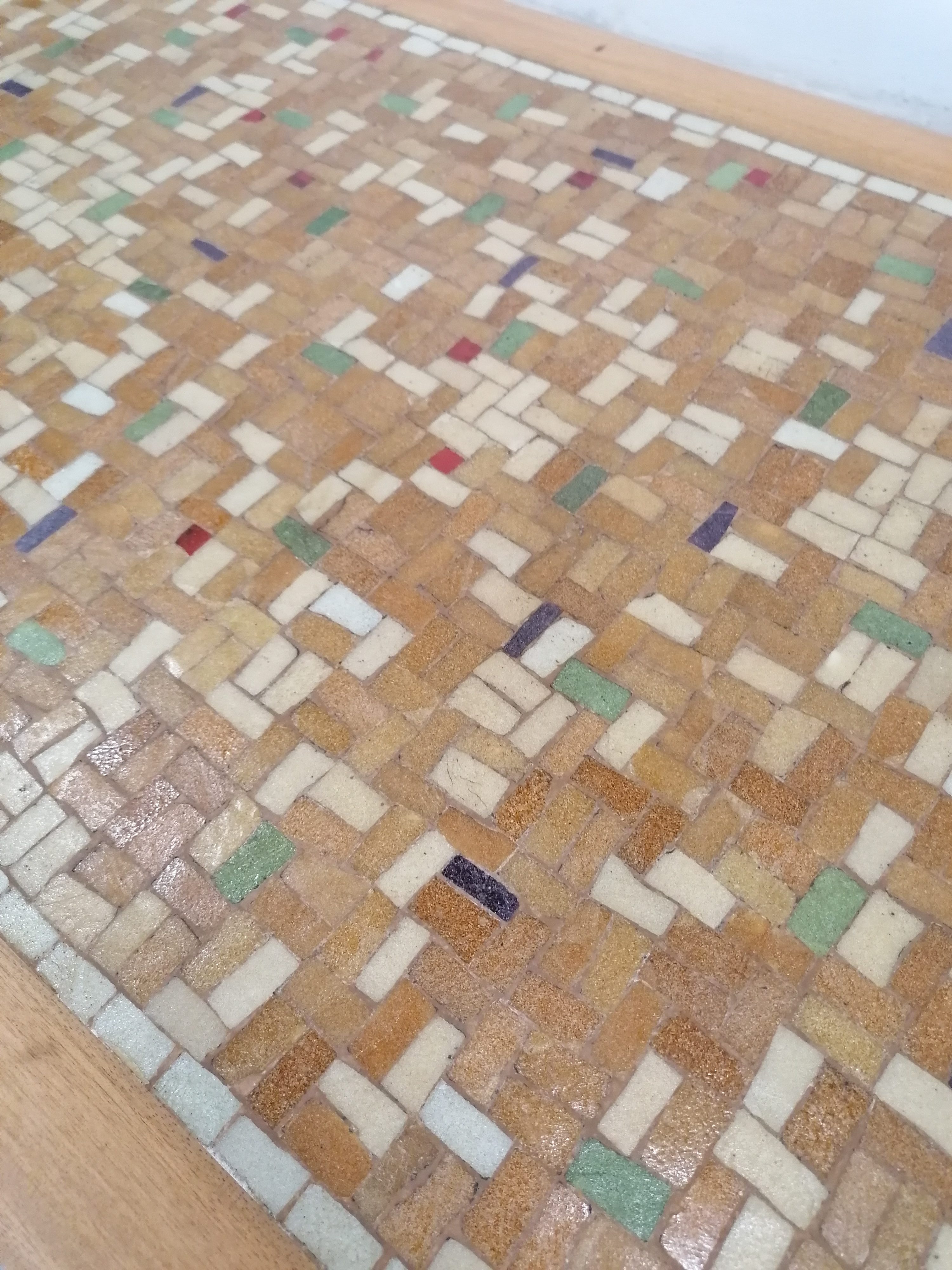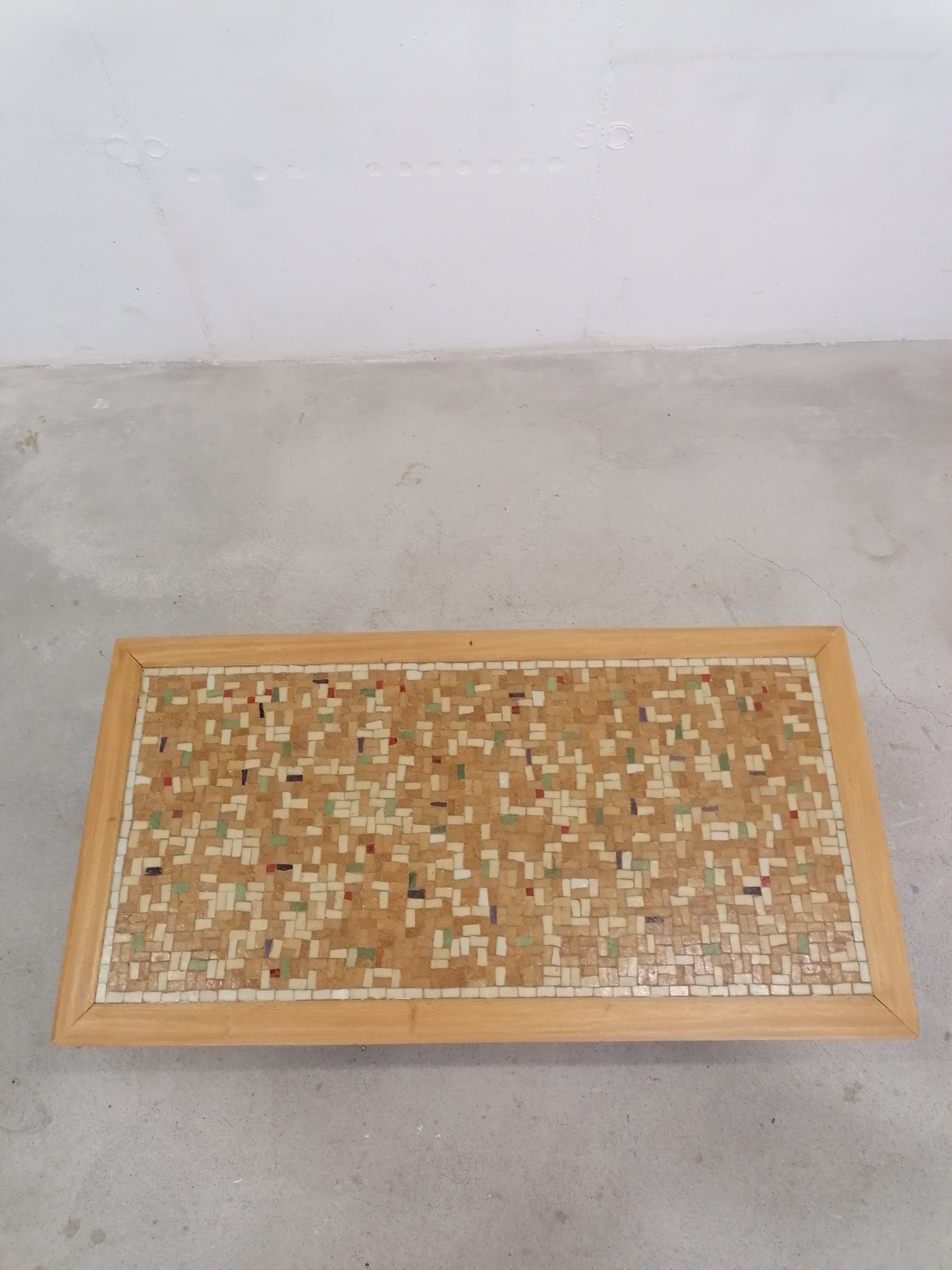 Table basse vintage avec structure en bois. Sur le plateau est présent un élégant mosaïque dans des jolies couleurs automnales marron et orange.