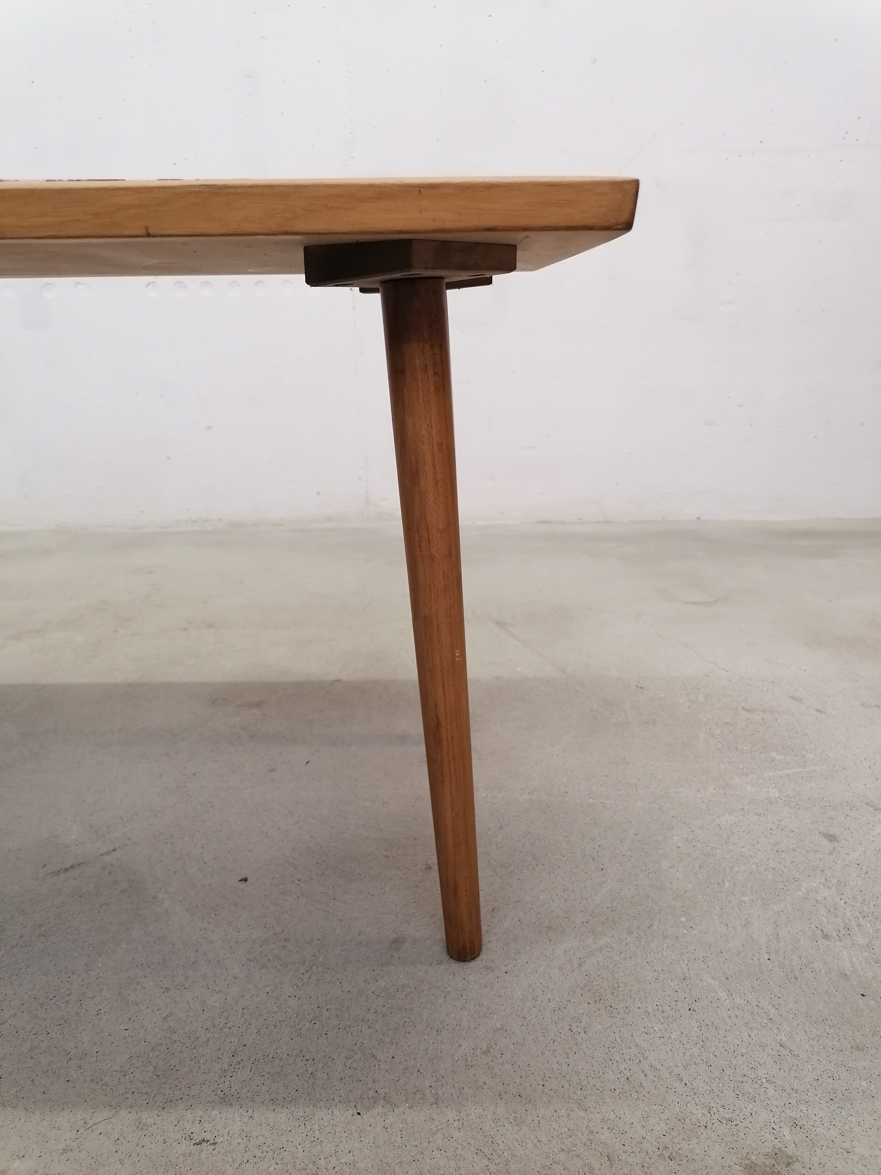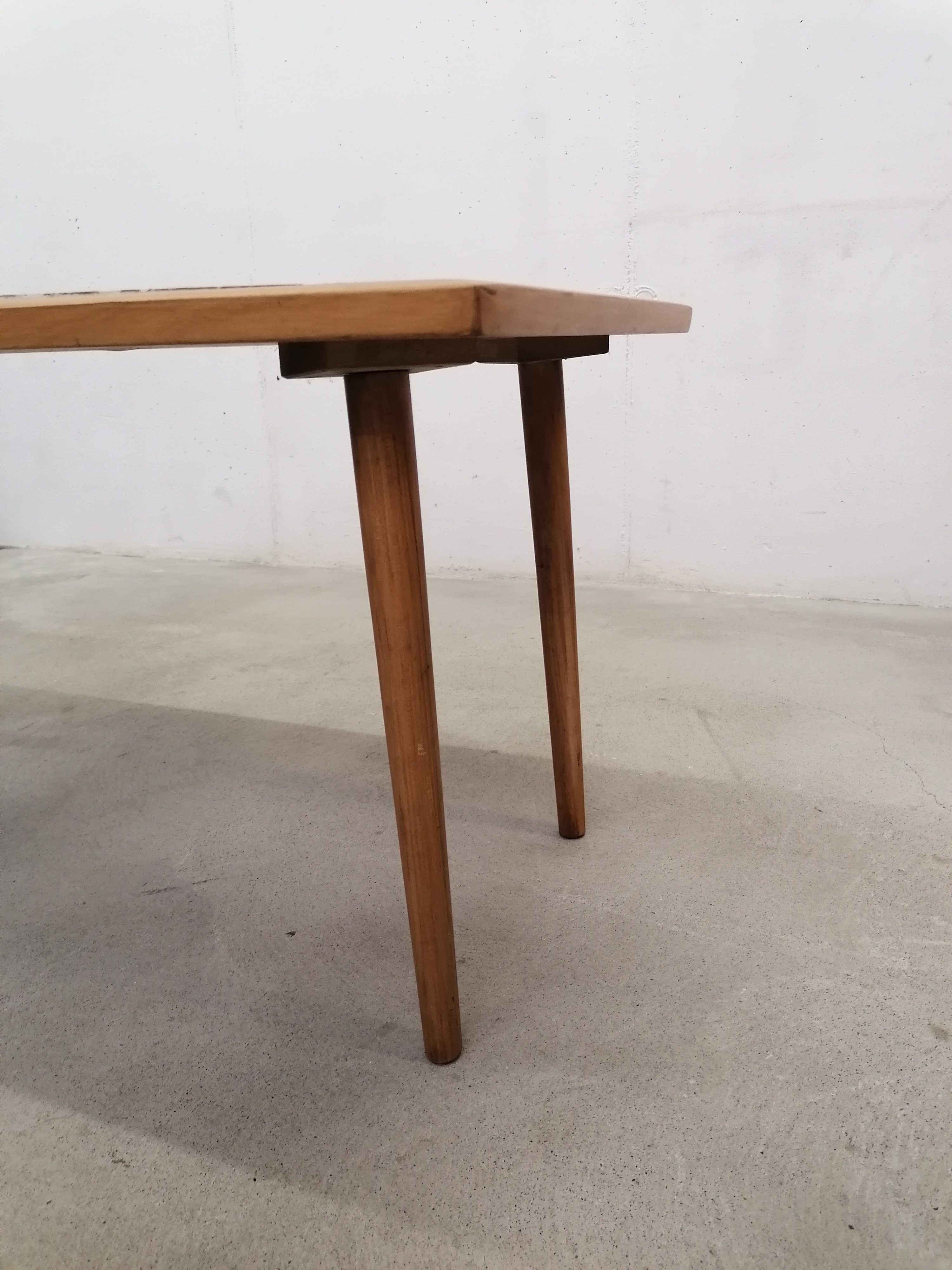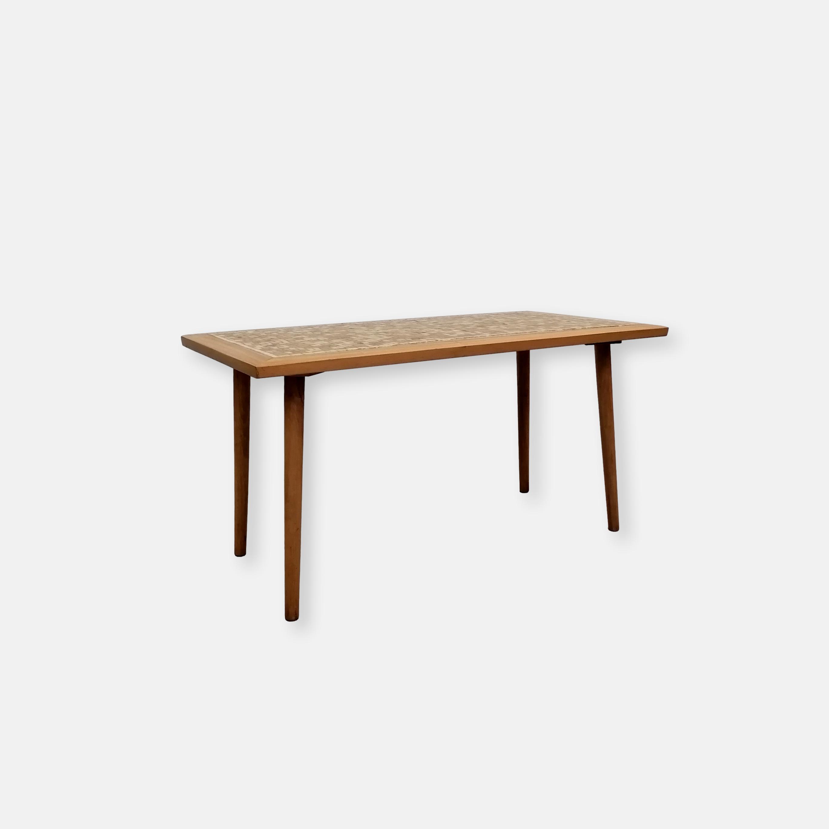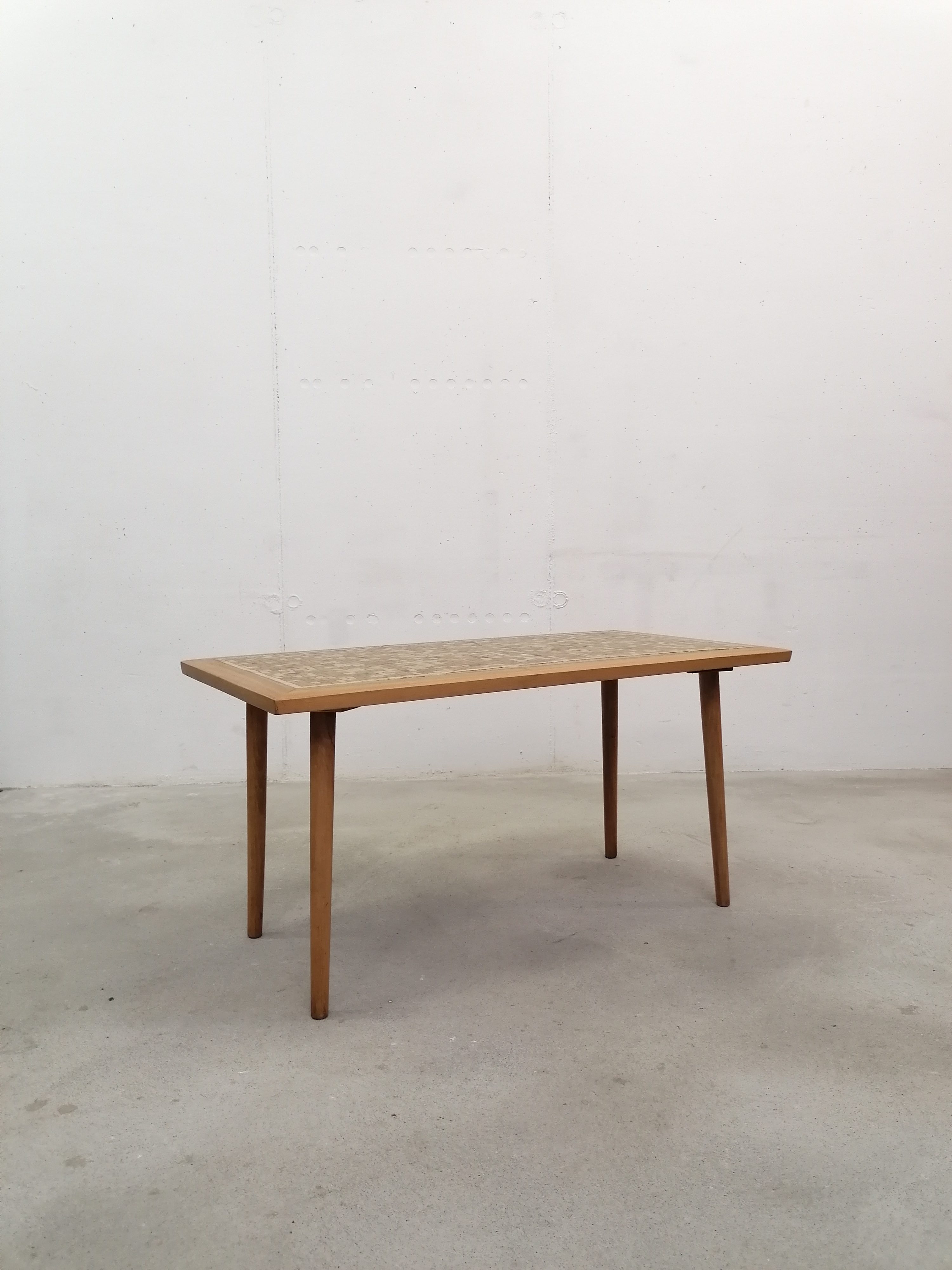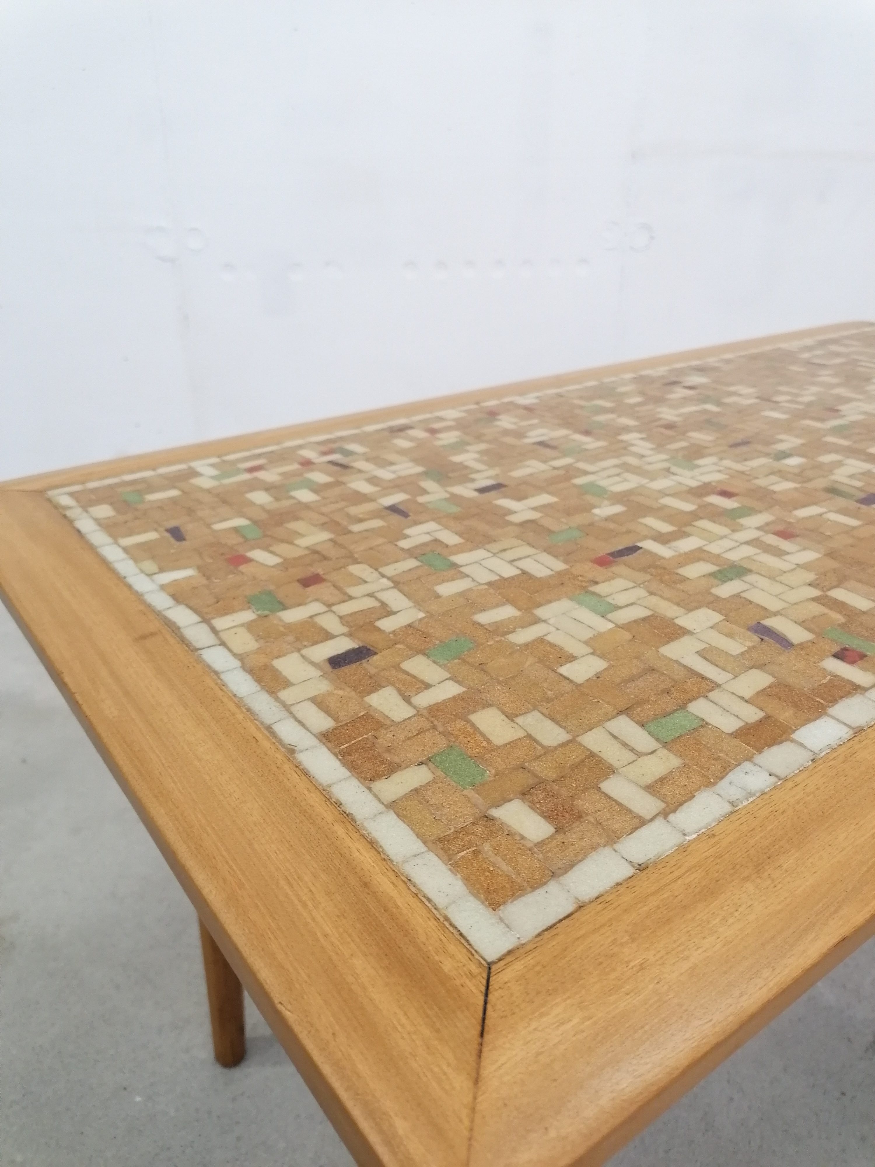 Table basse vintage avec structure en bois. Sur le plateau est présent un élégant mosaïque dans des jolies couleurs automnales marron et orange.
