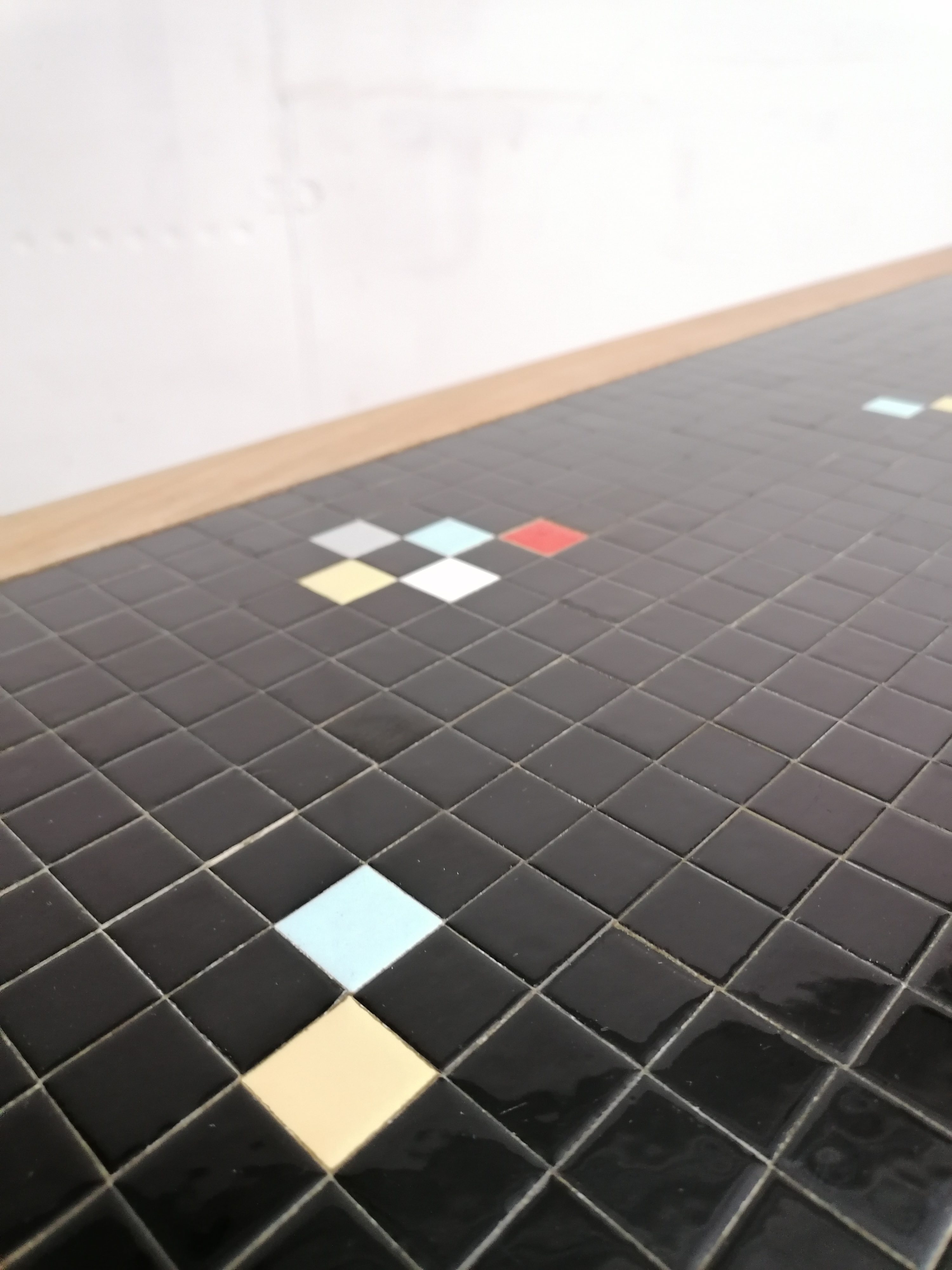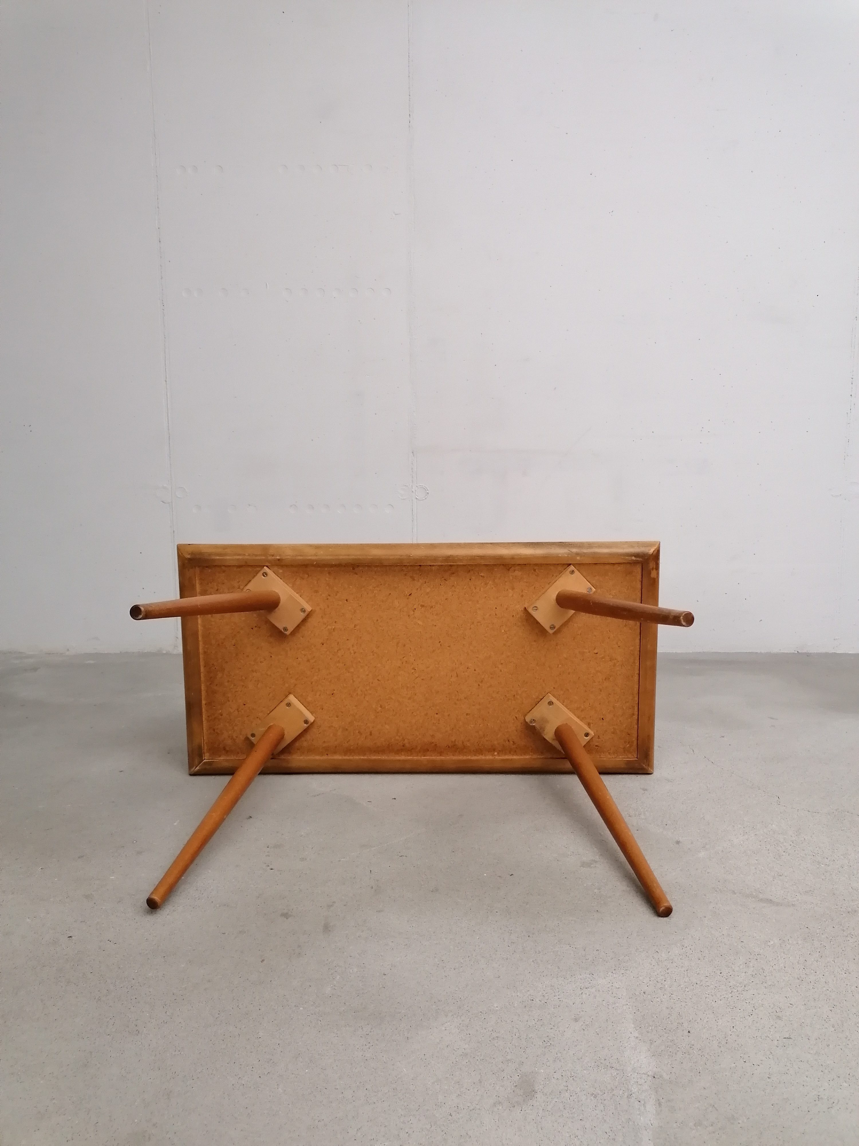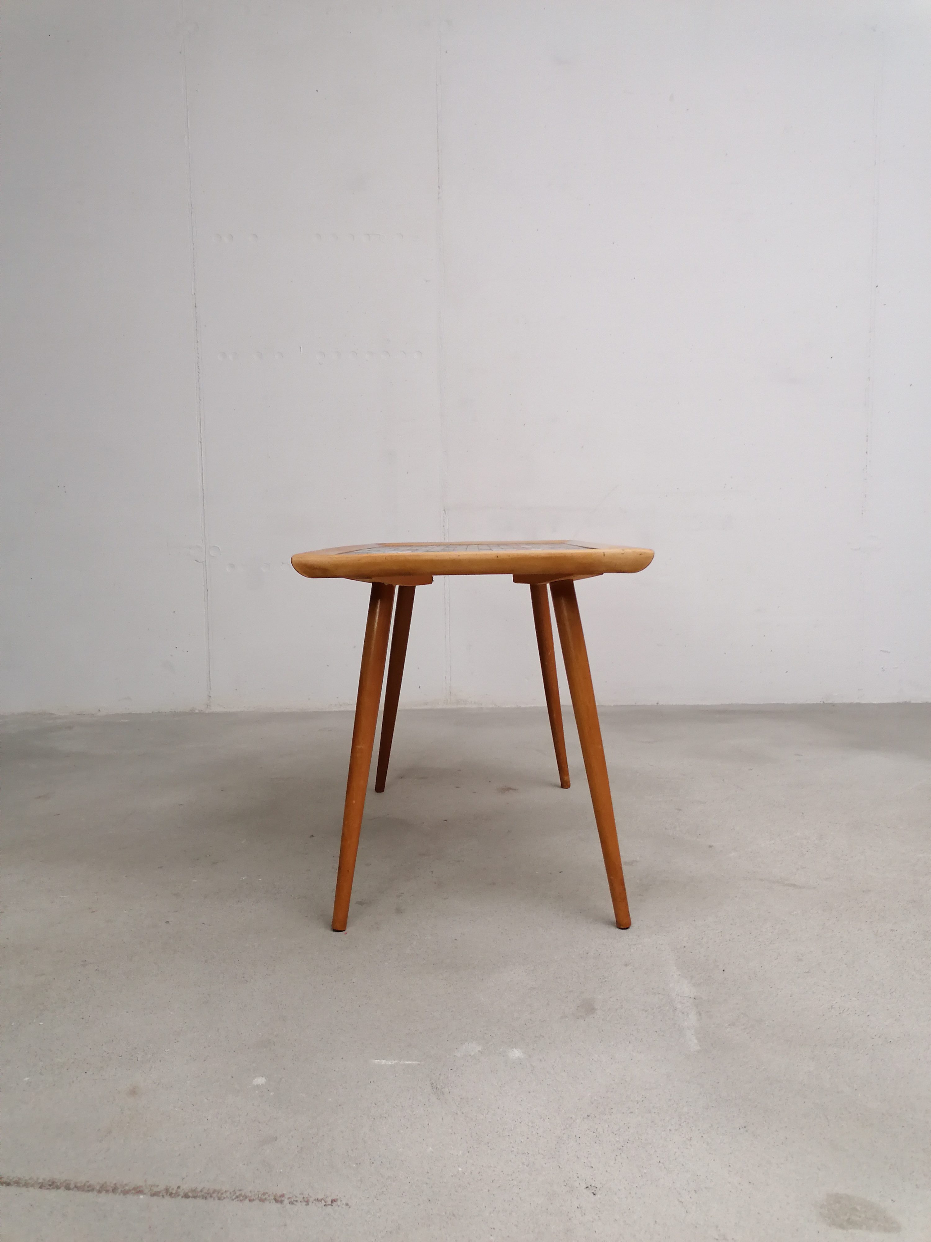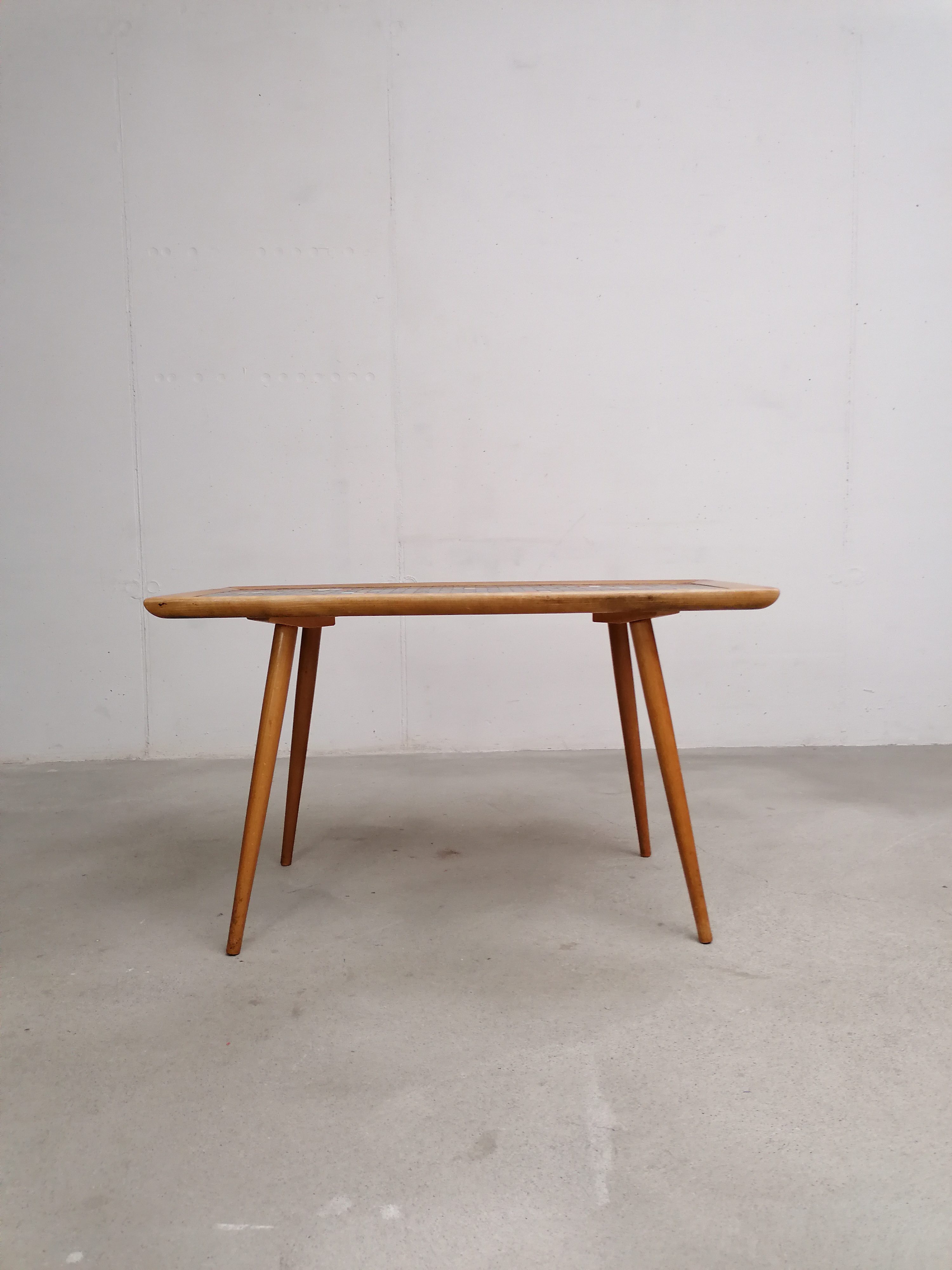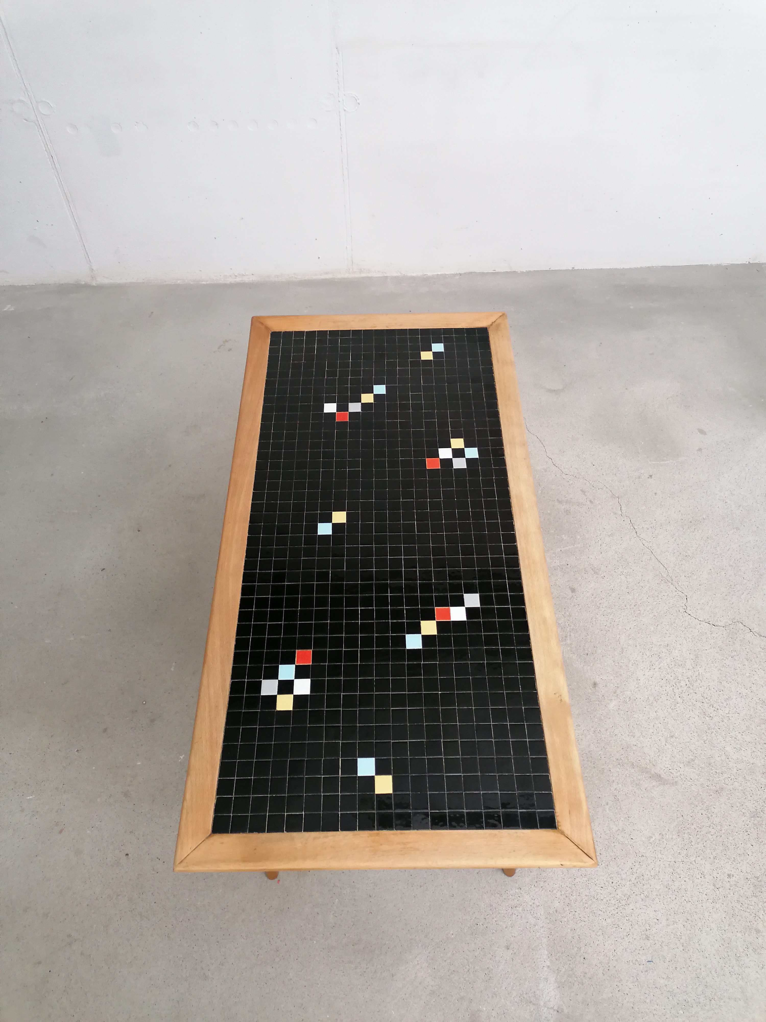 Produit venduTable basse mosaïque vintage avec structure en bois et plateau avec carreaux en céramique. Quelques traces d’usure sur le bois mais stable et solide et parfaitement fonctionnelle.