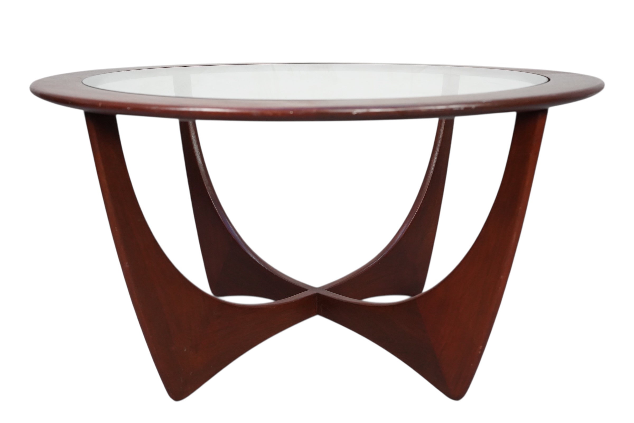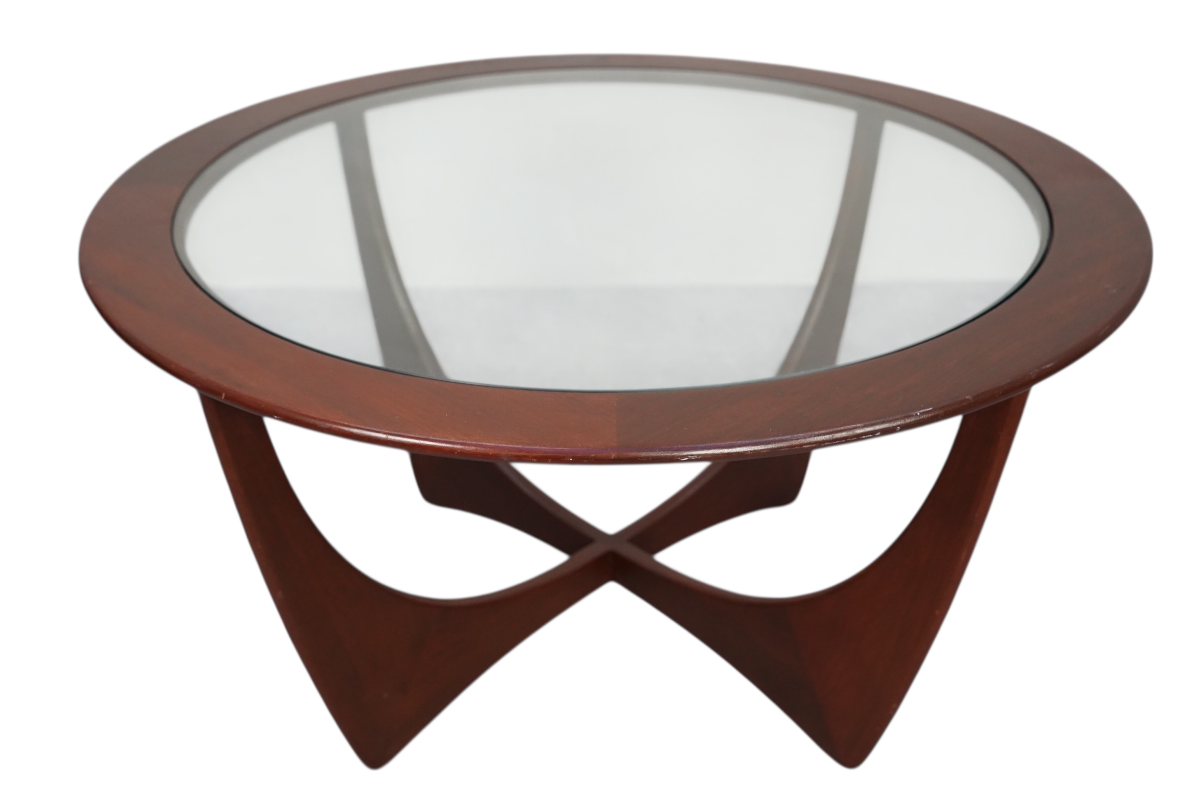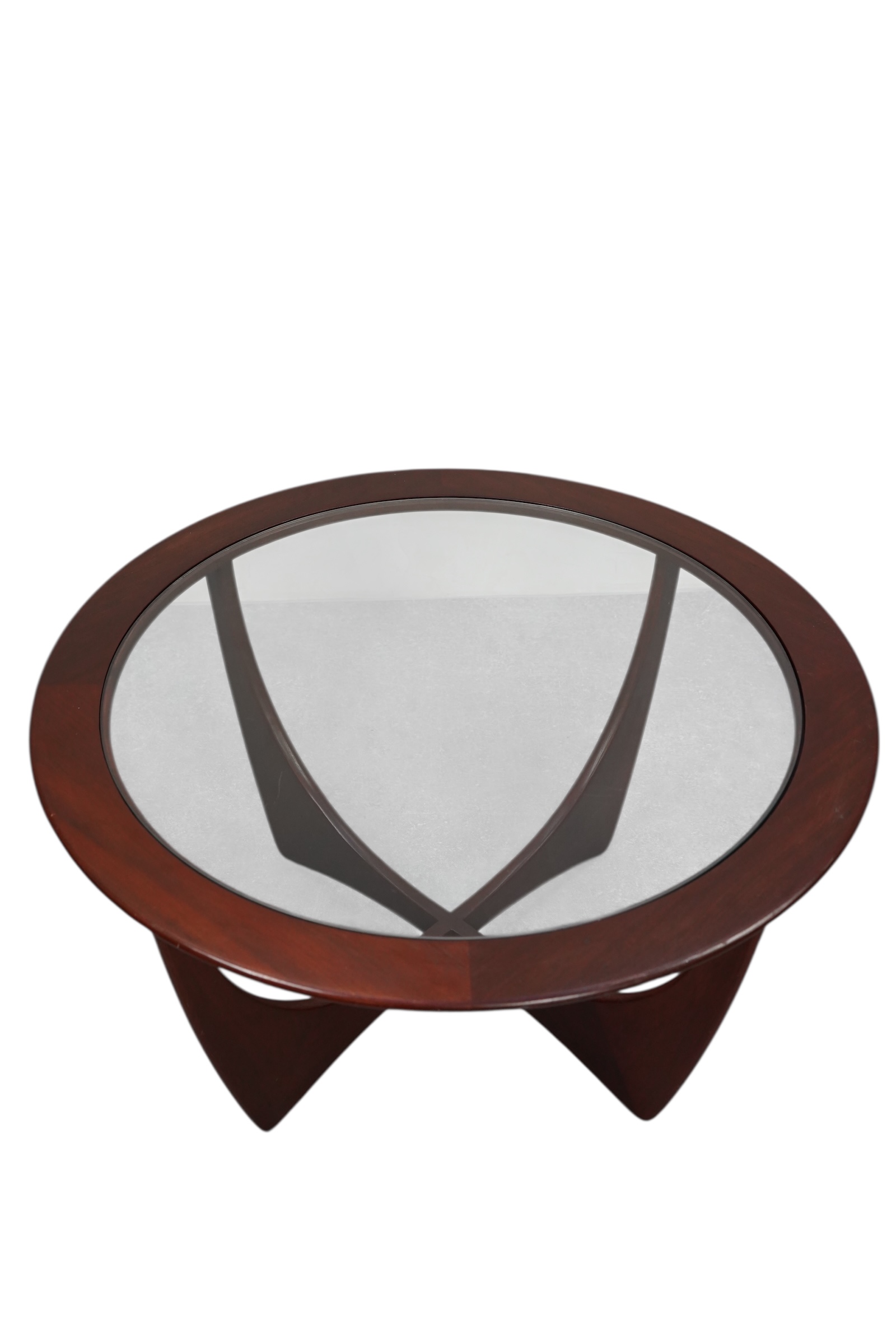Table basse ronde astro conçue par le designer scandinave Victor Wilkins pour le fabricant britannique G-Plan, 1960’s. La table basse populaire Fresco » se compose d’un cadre en teck massif au tond chaud munie d’un plateau en verre.