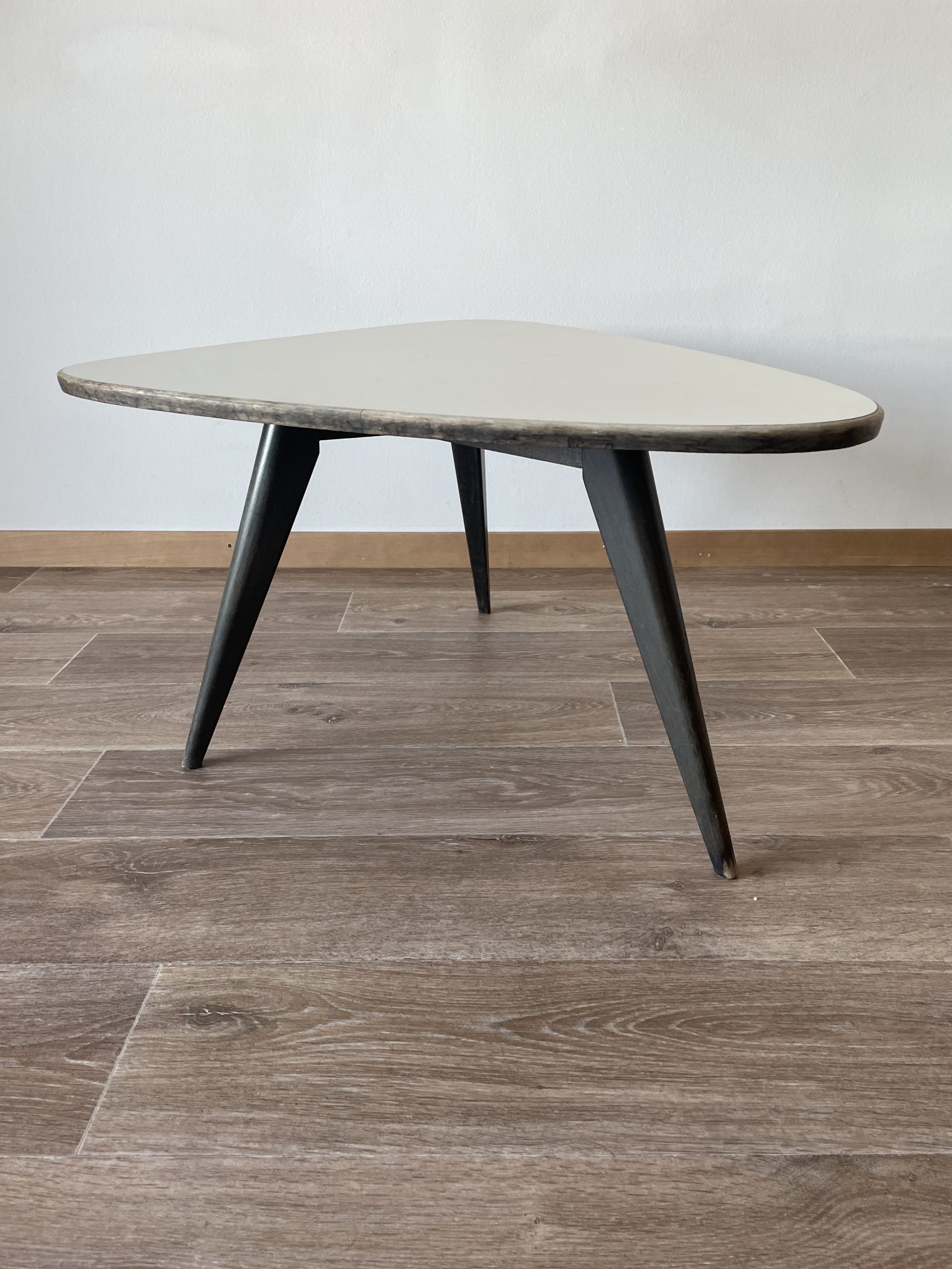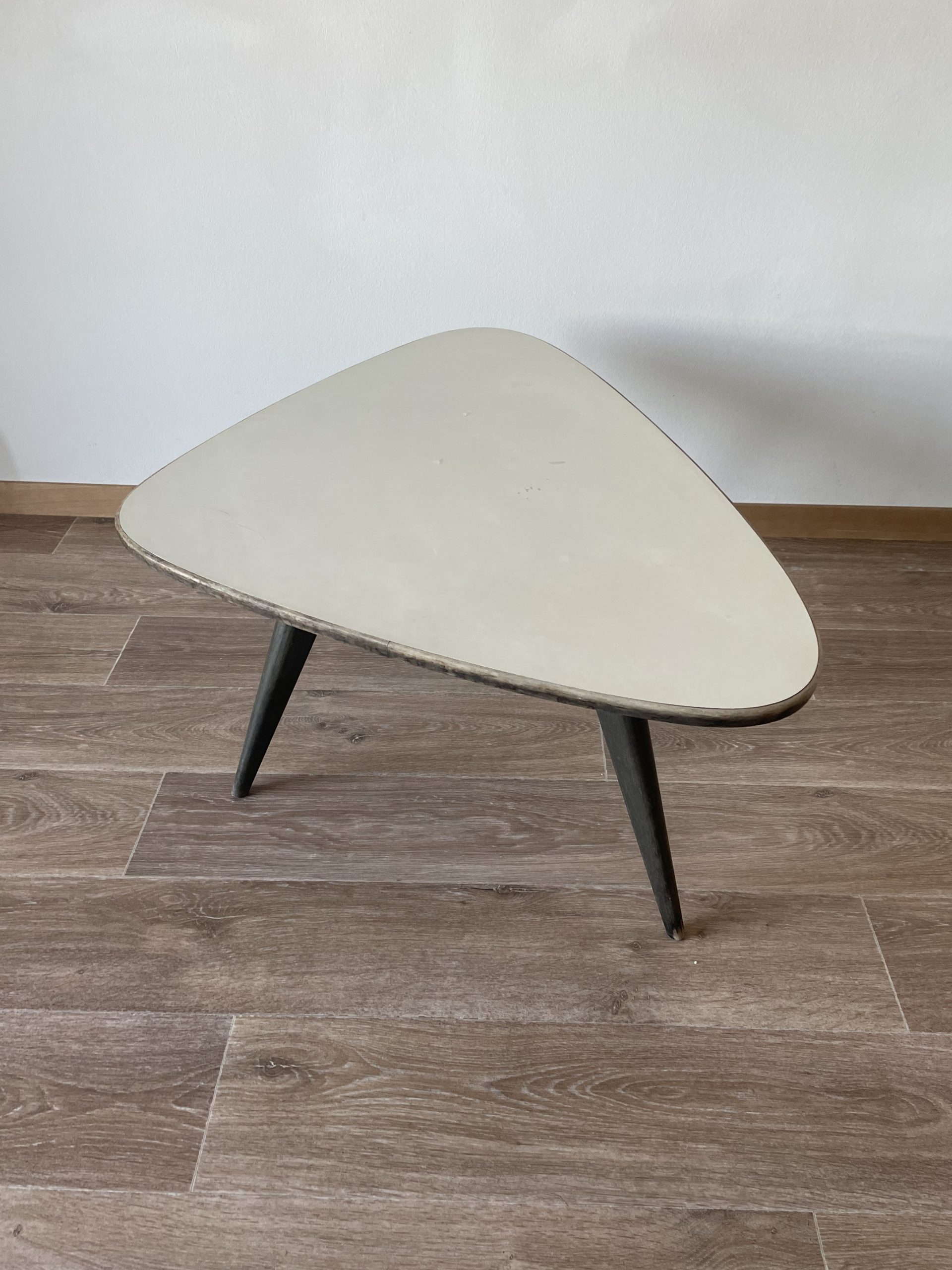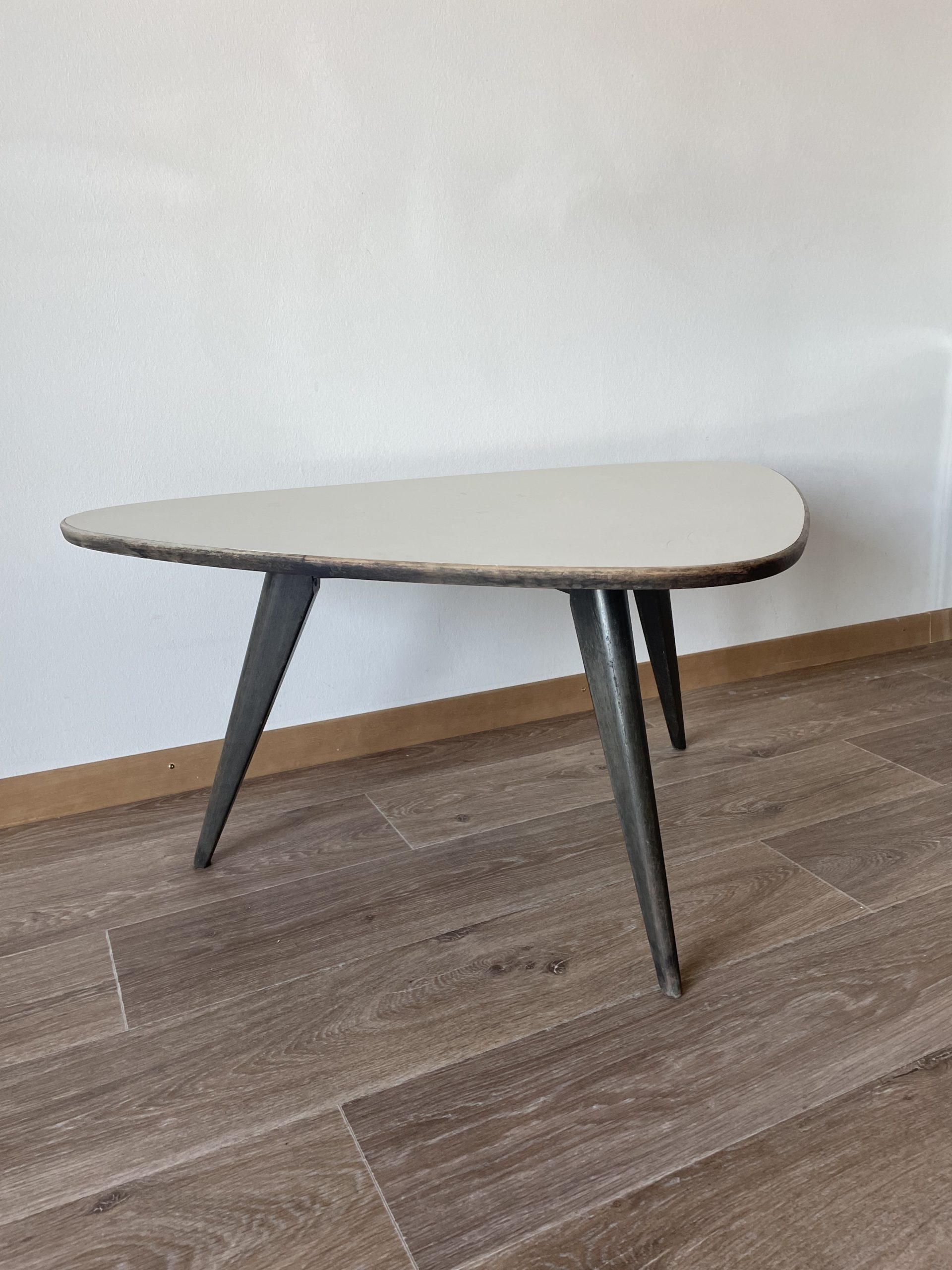 Produit venduTable basse tripode vintage avec piétement en bois sombre et plateau en formica blanc.