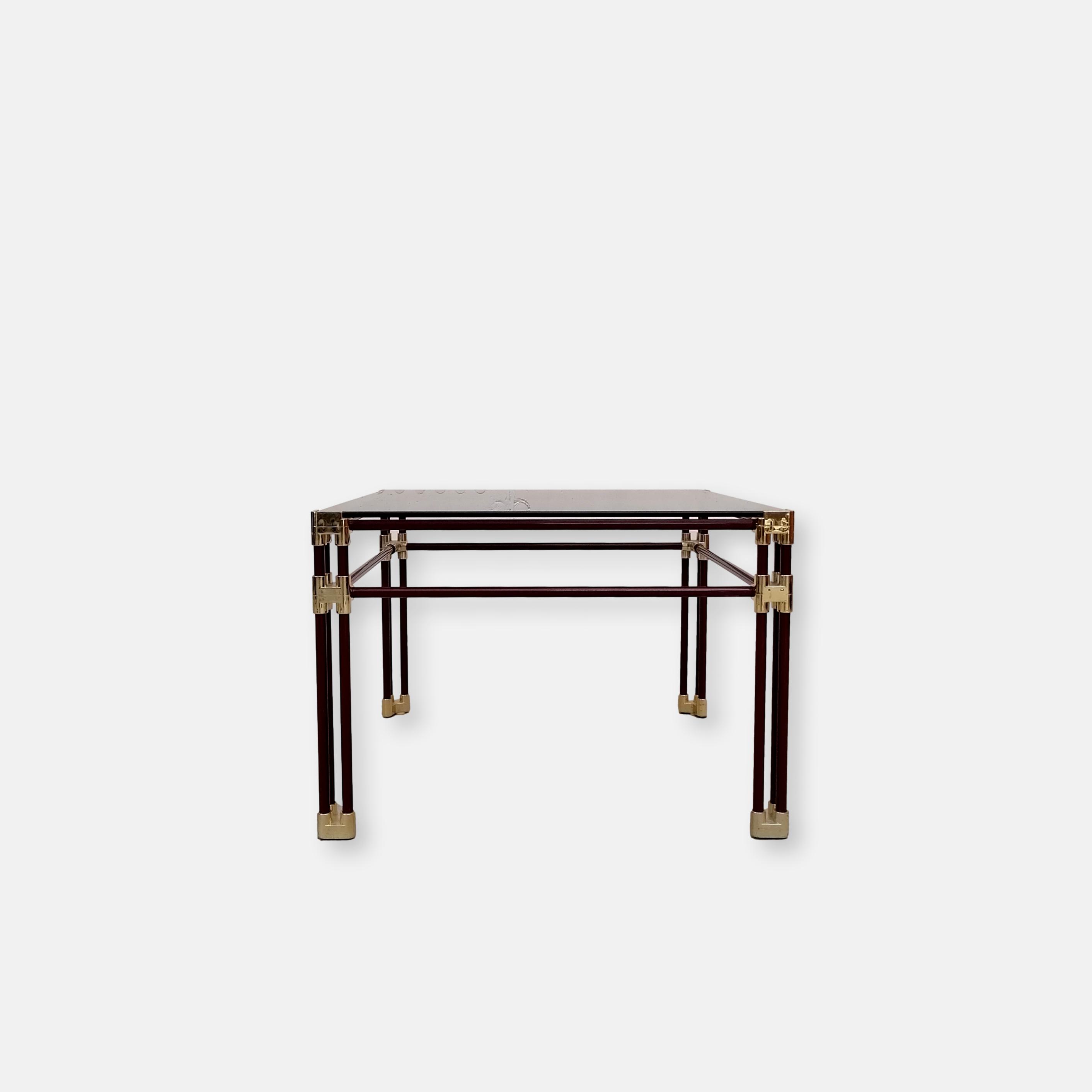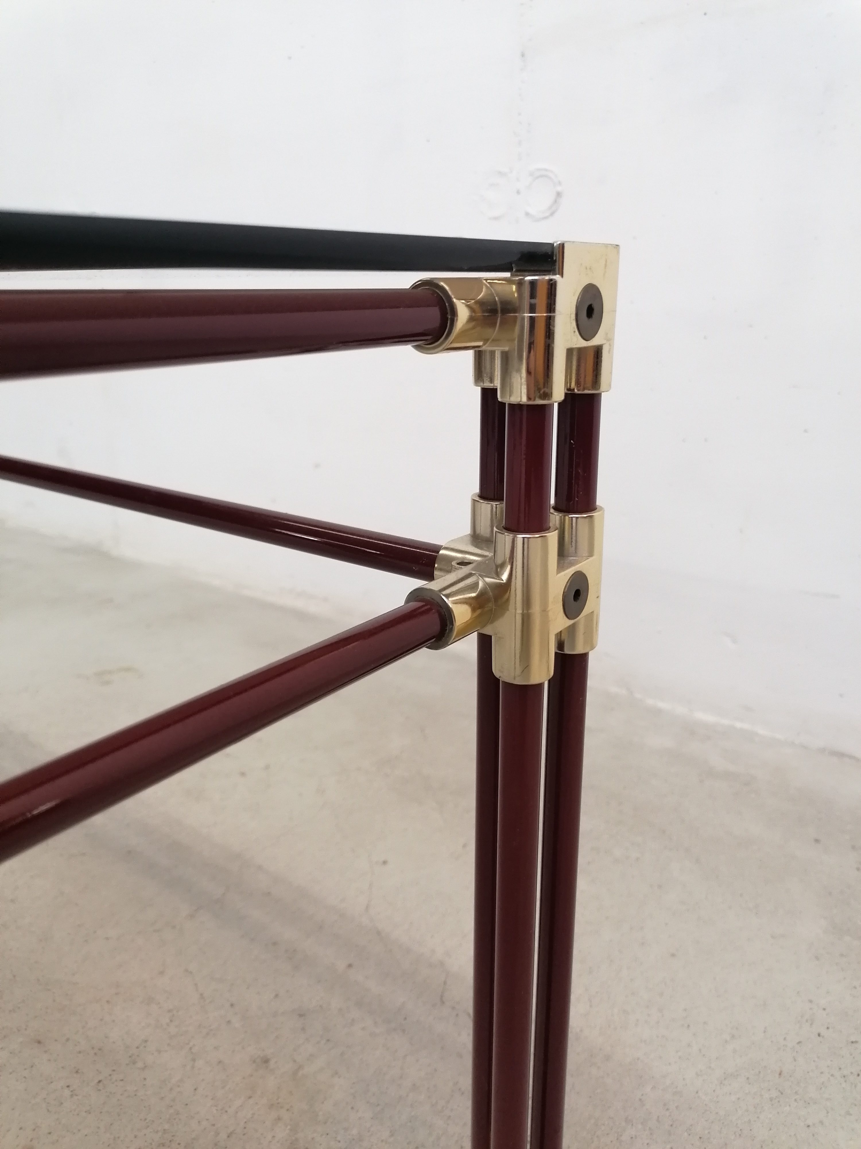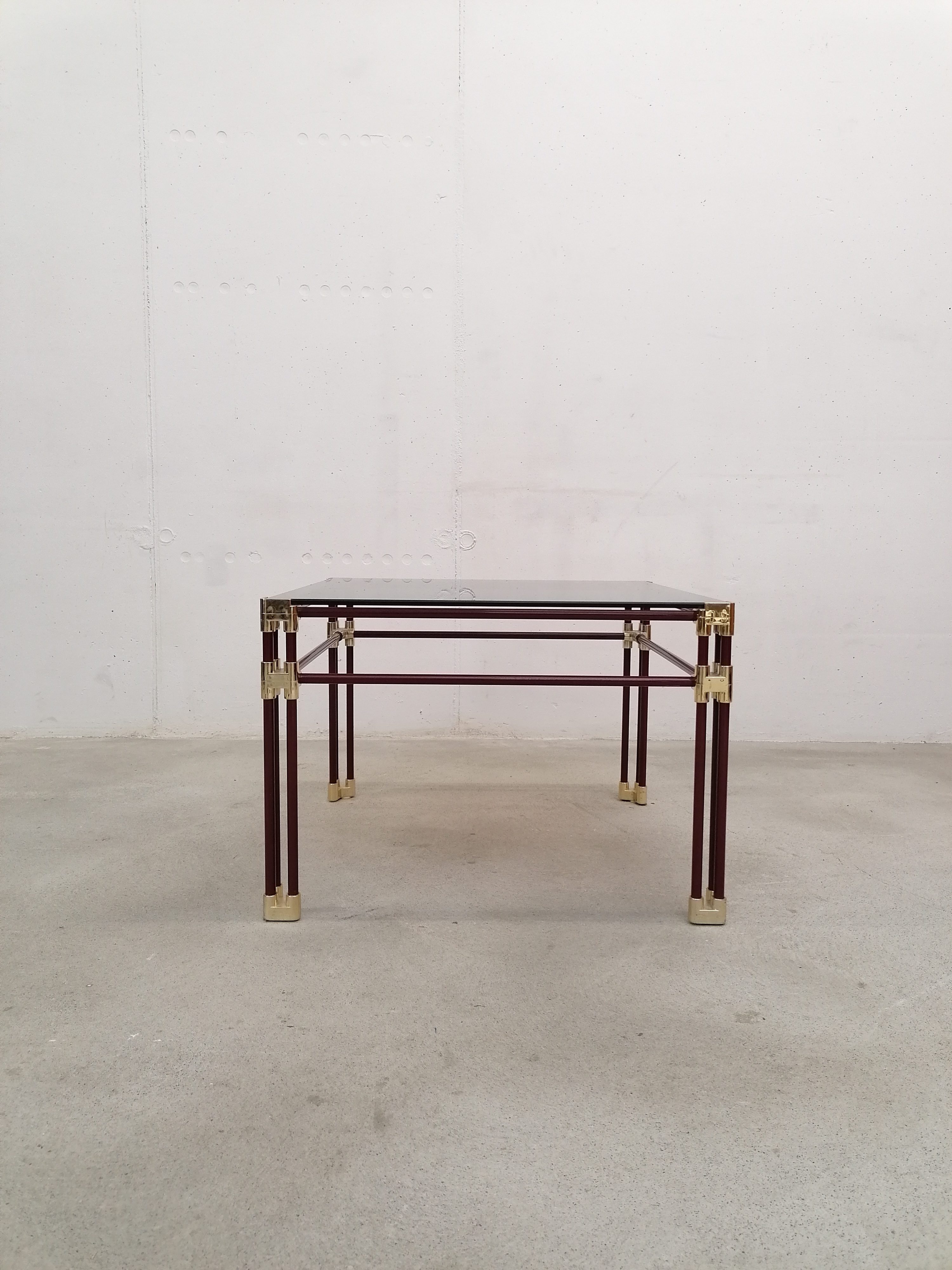 Table basse fabriquée en Italie dans les années 70 avec structure en métal tubulaire en laqué violet et laiton doré.