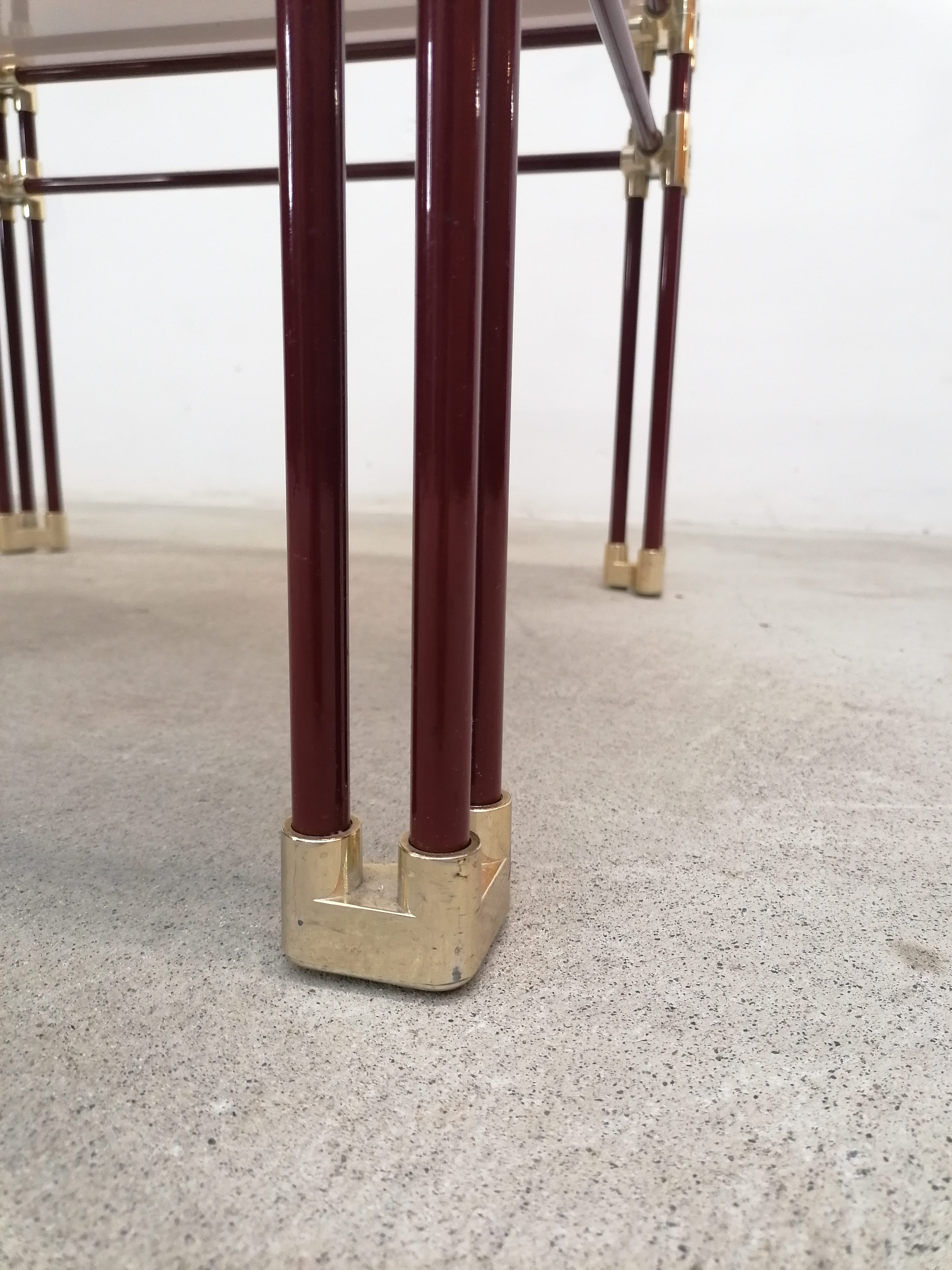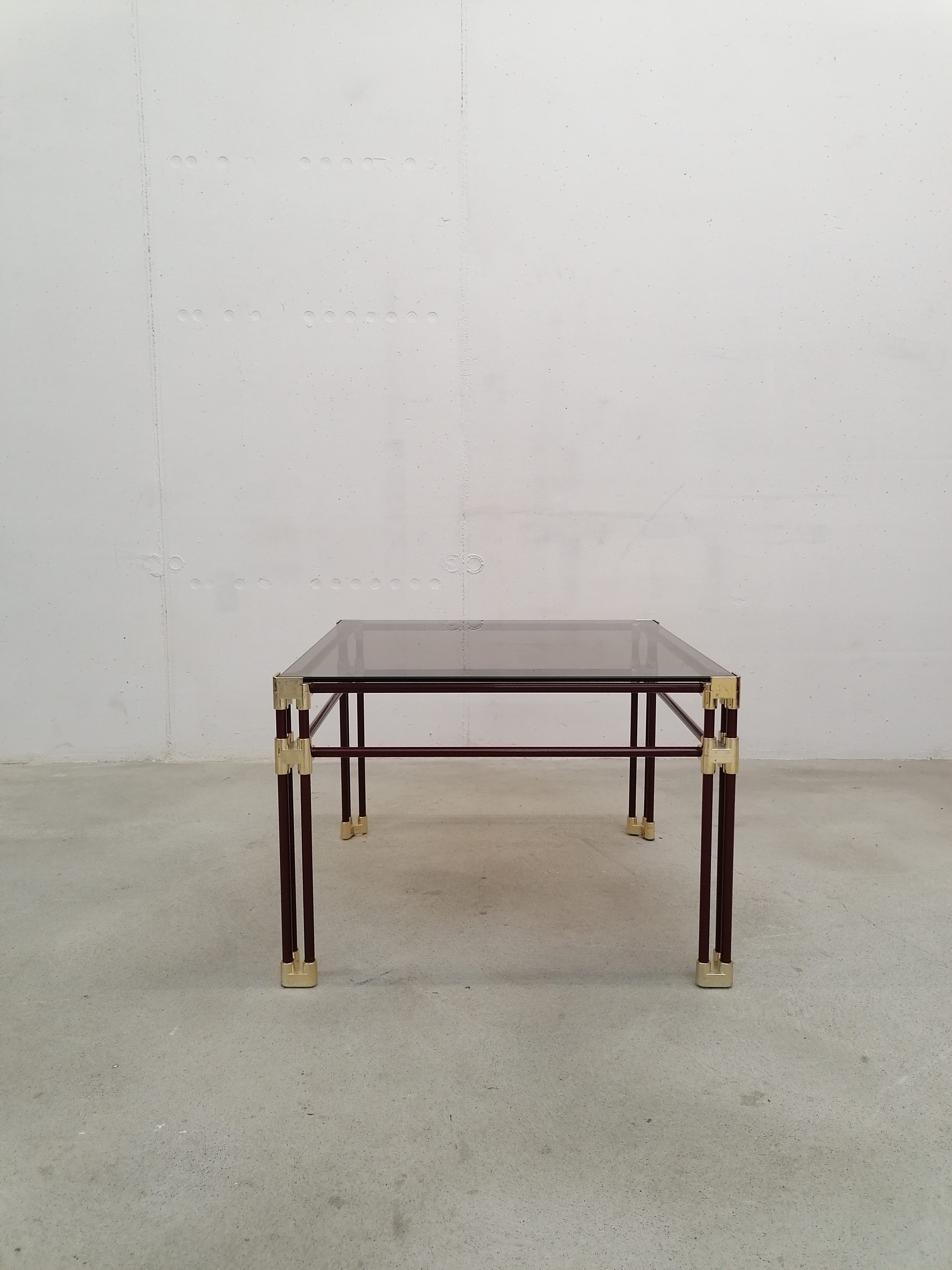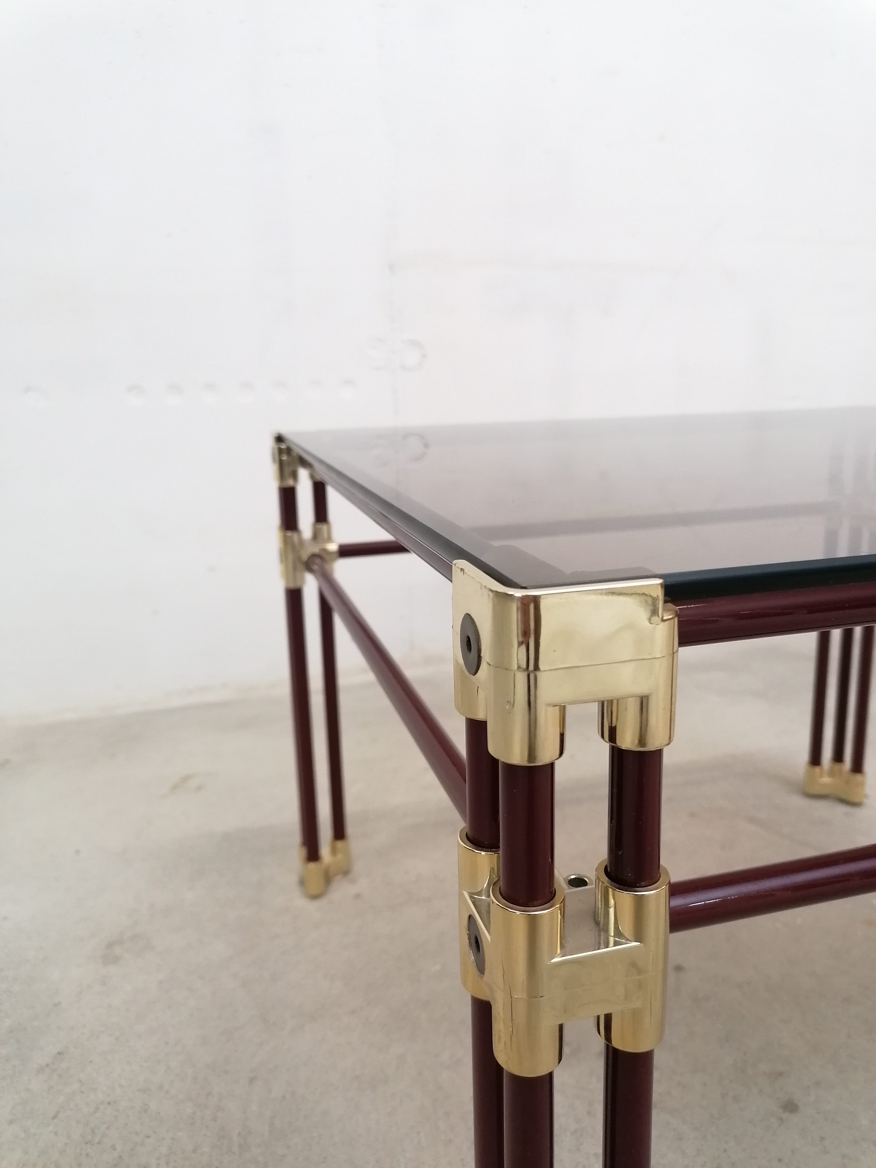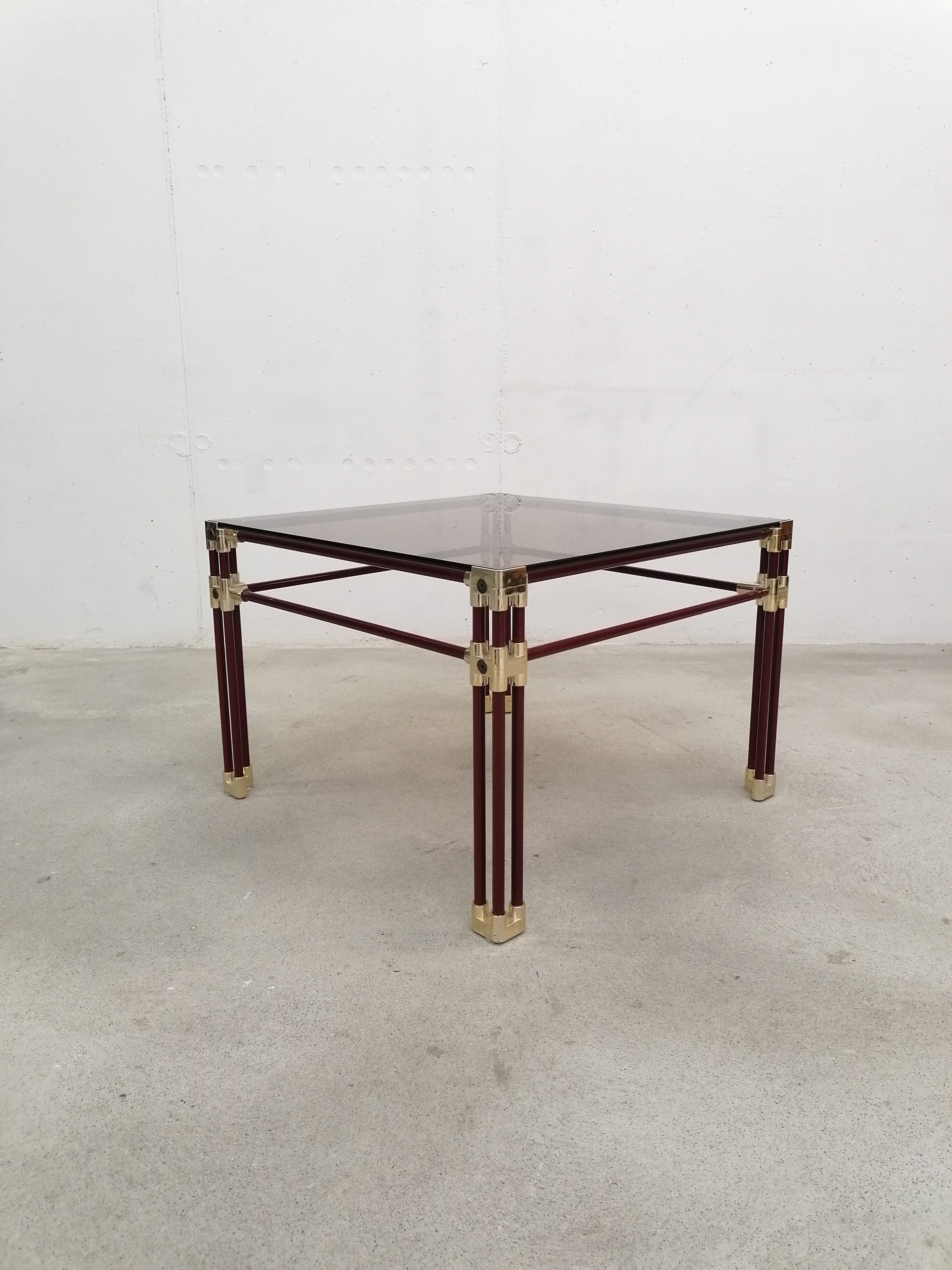 Table basse fabriquée en Italie dans les années 70 avec structure en métal tubulaire en laqué violet et laiton doré.