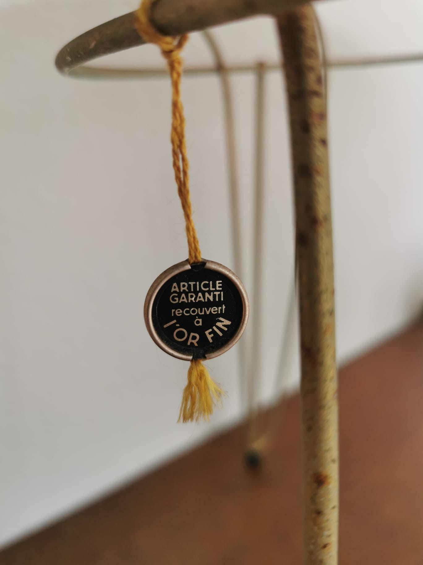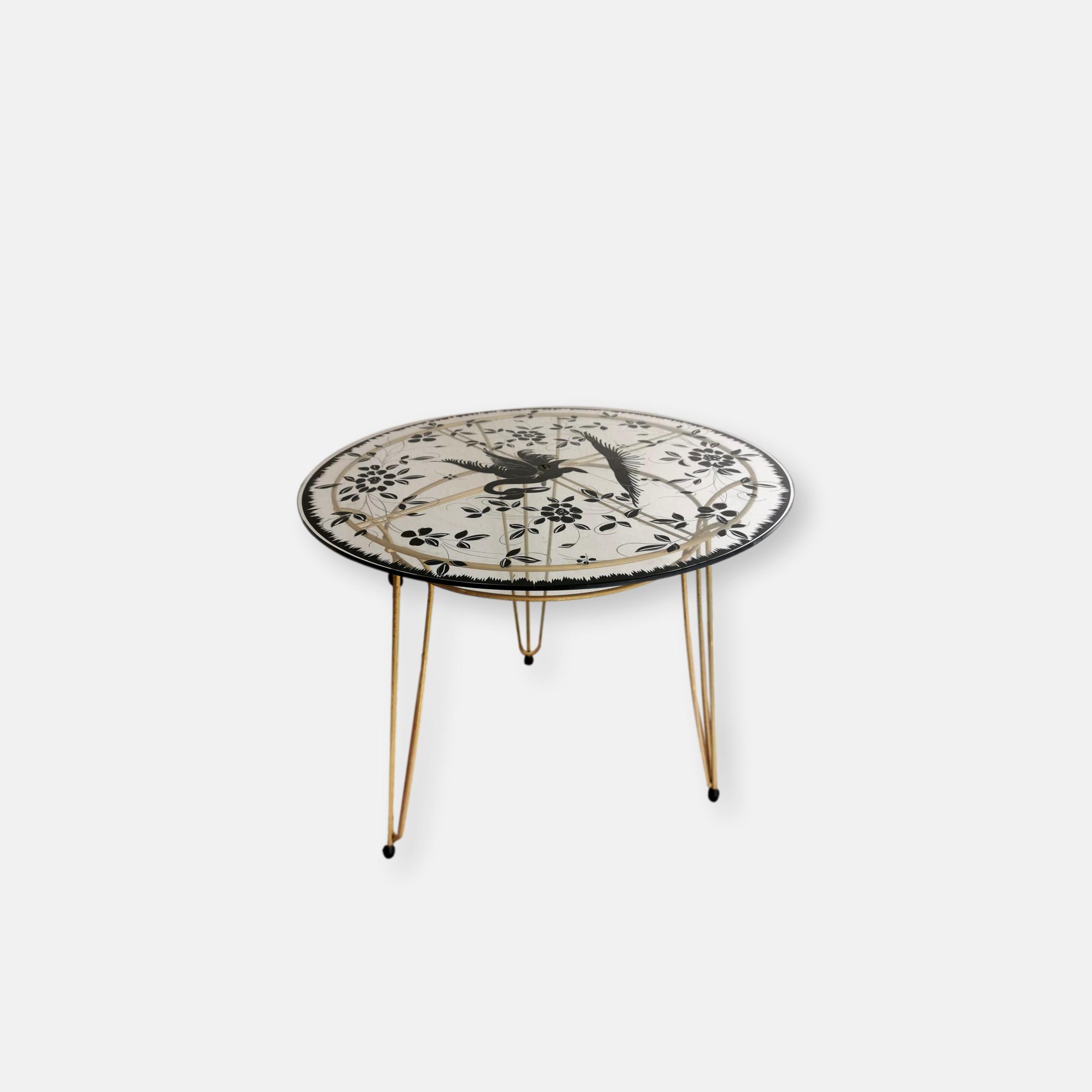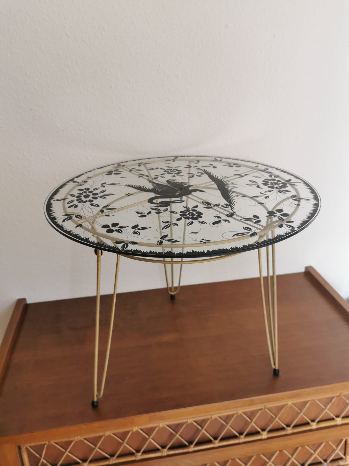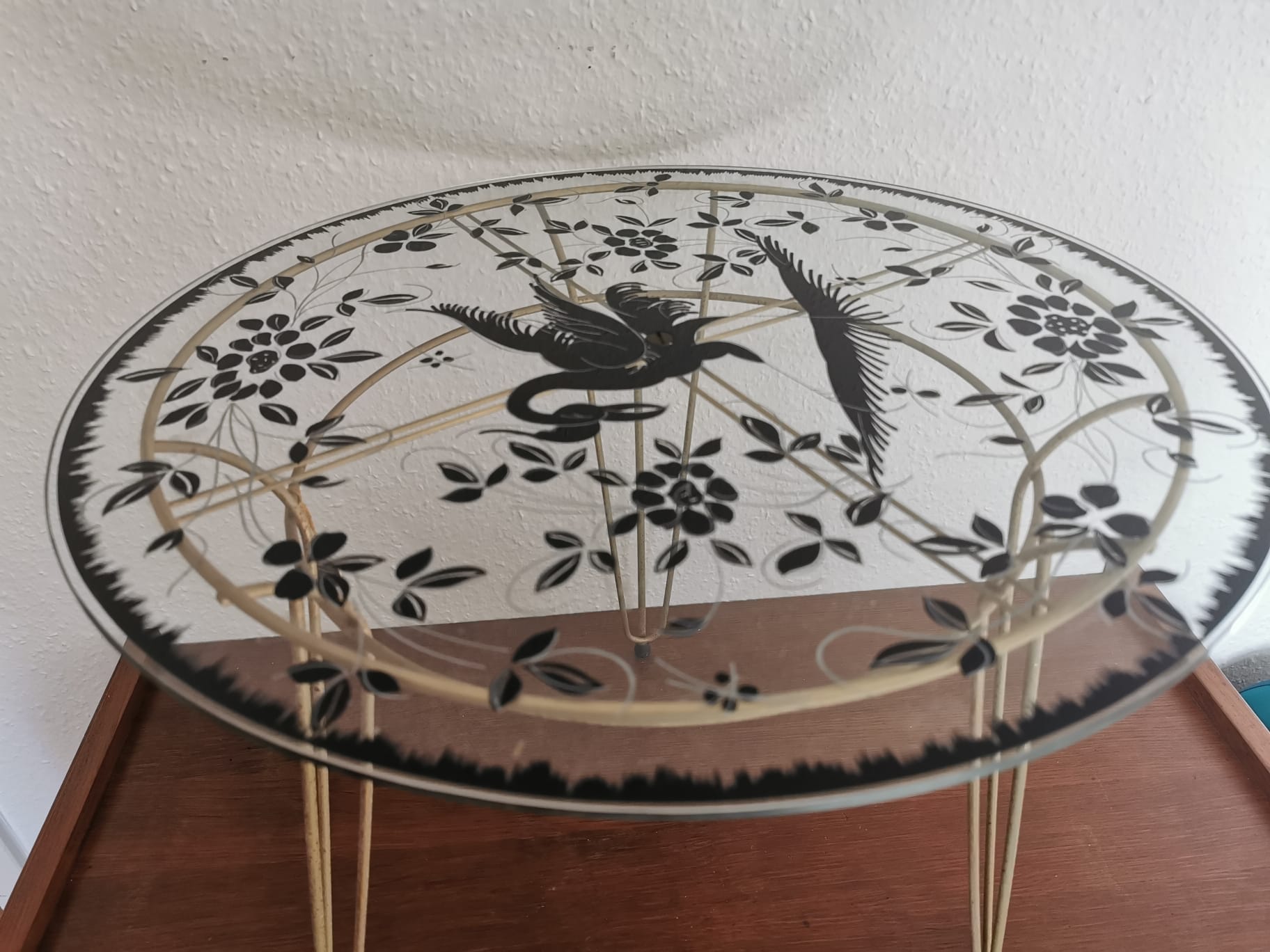 Table d’appoint 50/60s avec plateau en verre et structure en métal.