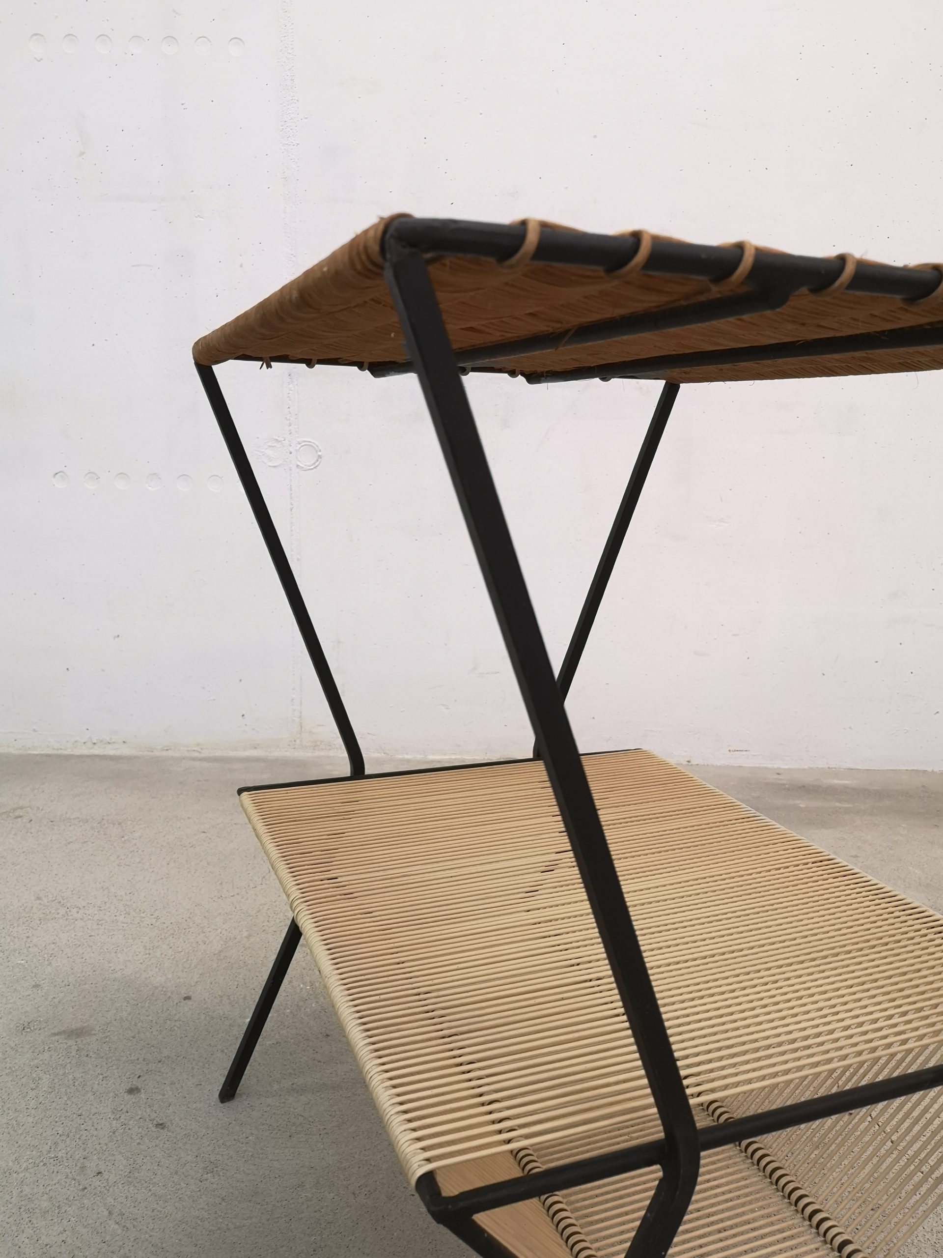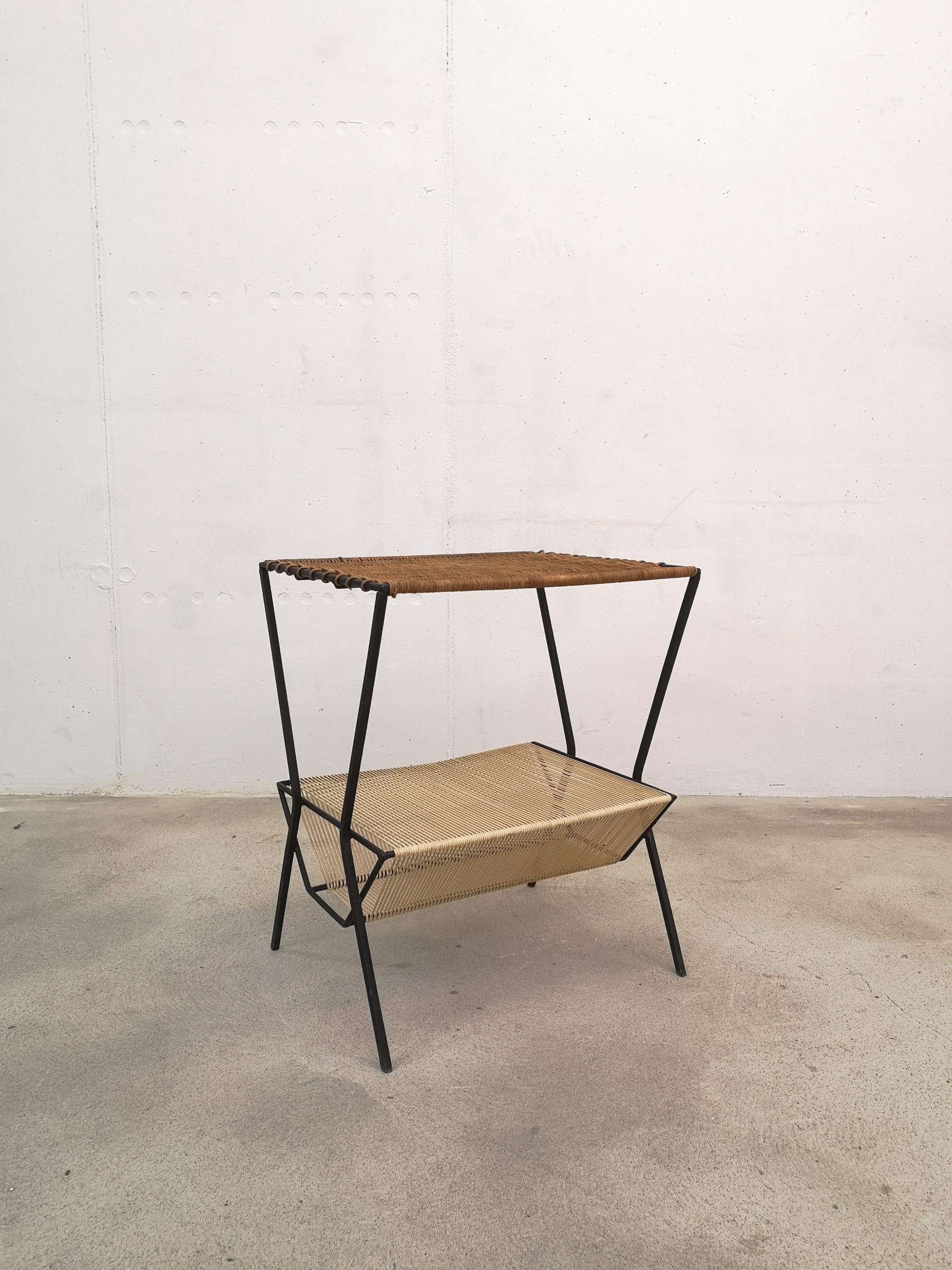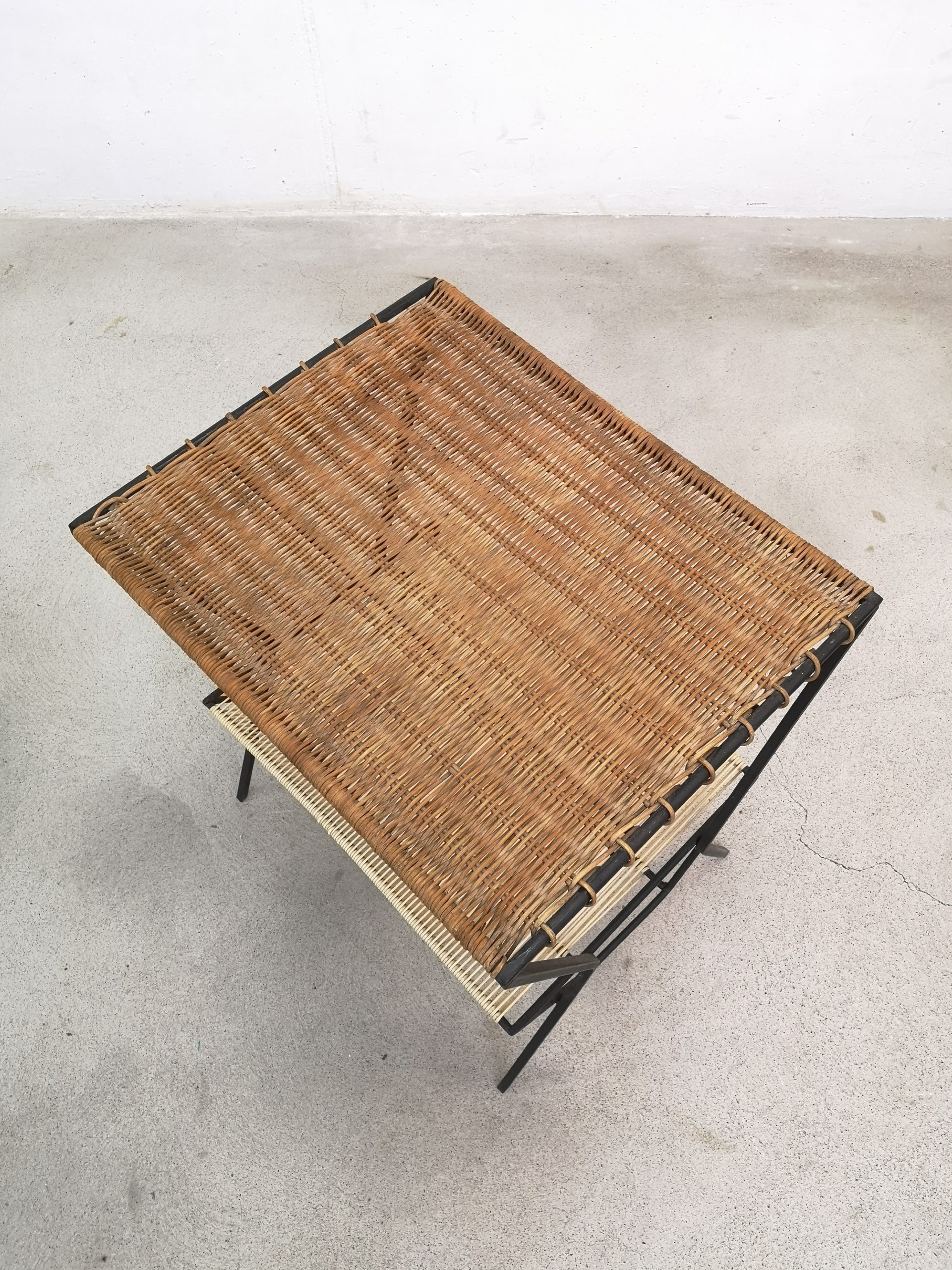 Produit venduTable d’appoint avec structure en métal noir, plateau en osier et range-vinyles en scoubidou (pour les 33 tours).