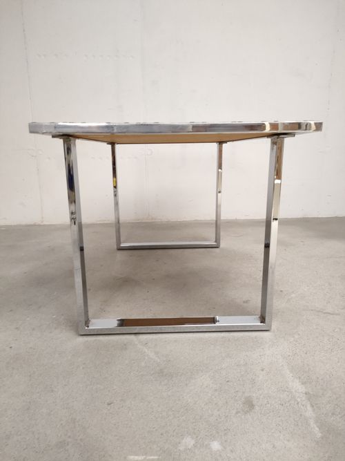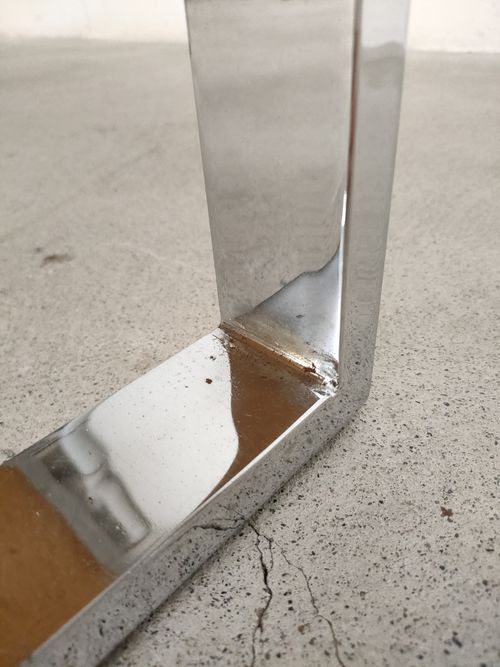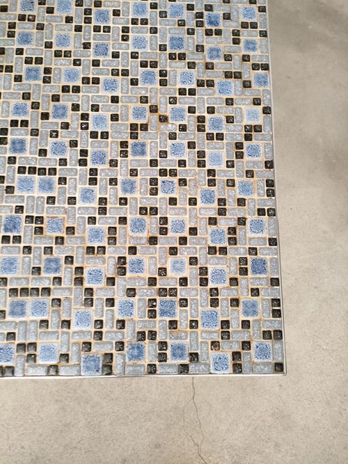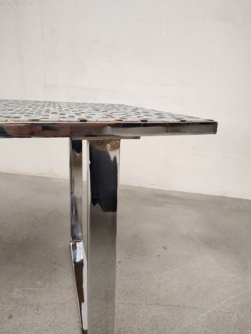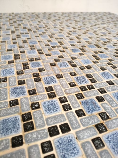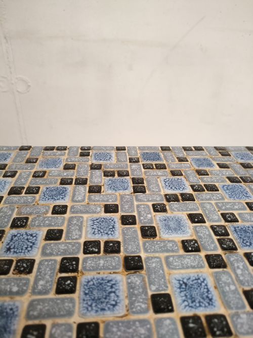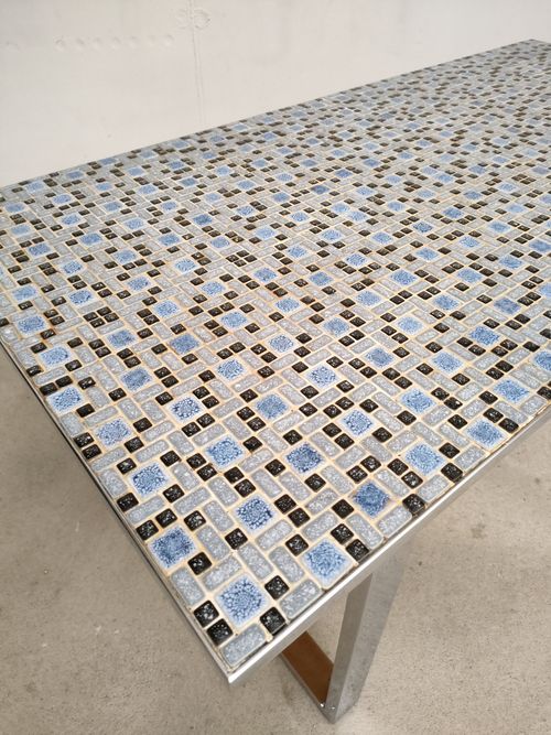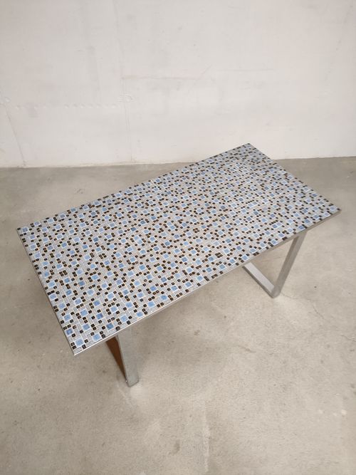 Produit venduTable d’appoint vintage avec piètement en métal et plateau en bois recouvert d’un joli mosaïque dans des couleurs bleus. Quelques traces sur le piètement et le plateau (voir photos).