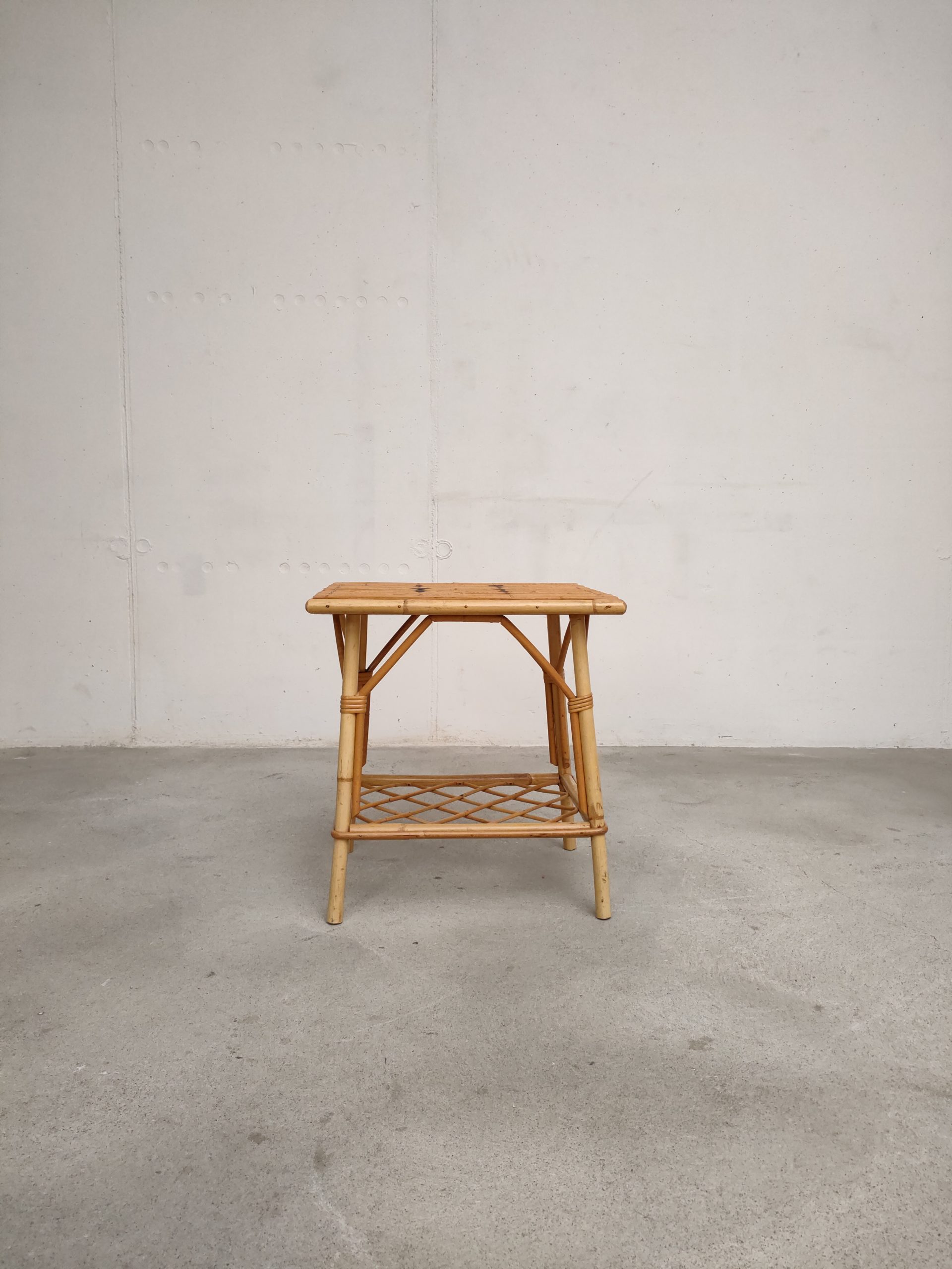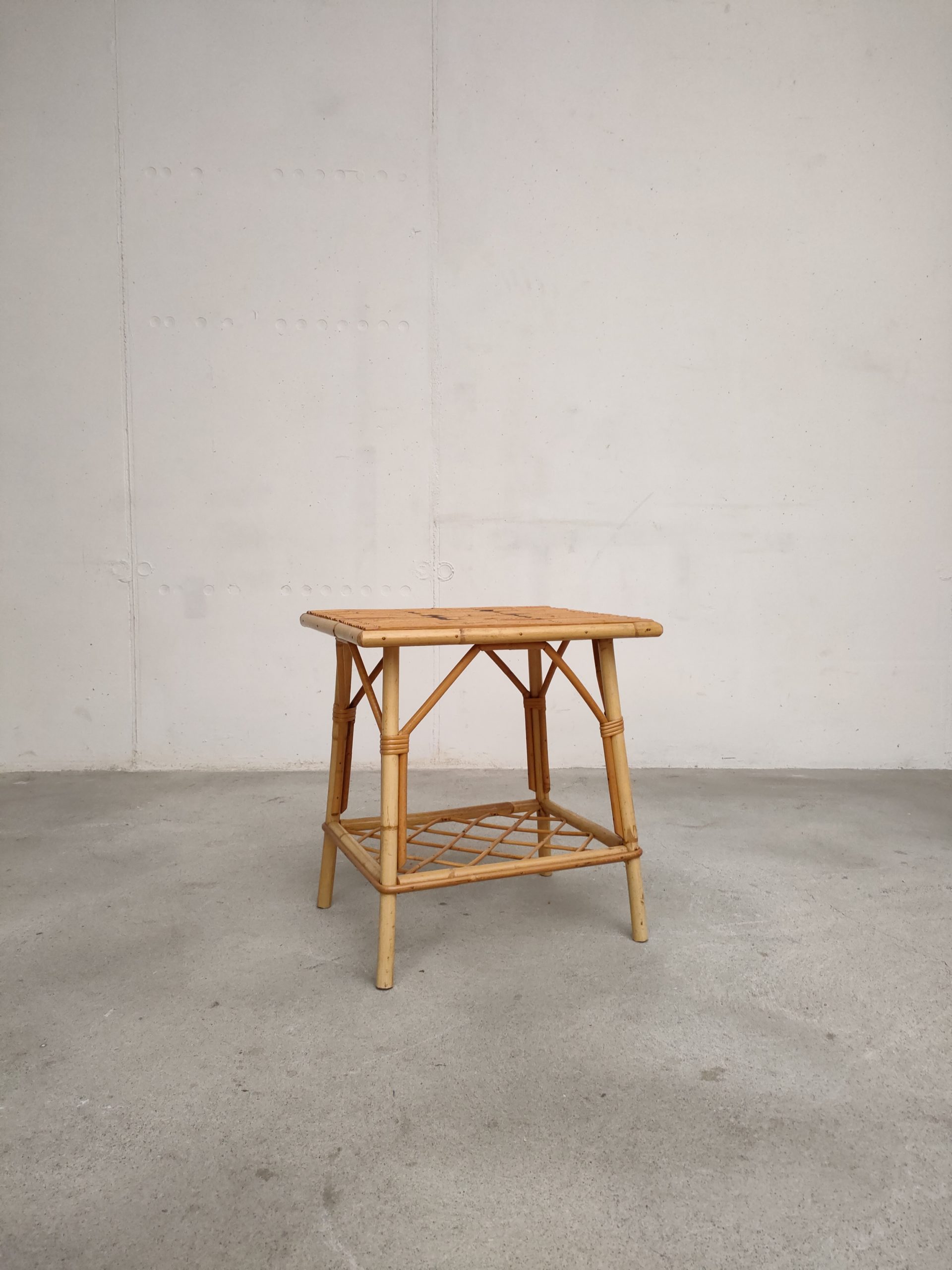 Produit venduTable d’appoint vintage avec plateau et espace de rangement inférieur en bambou/rotin. Elle peut être utilisé comme table d’appoint mais également comme table de nuit.