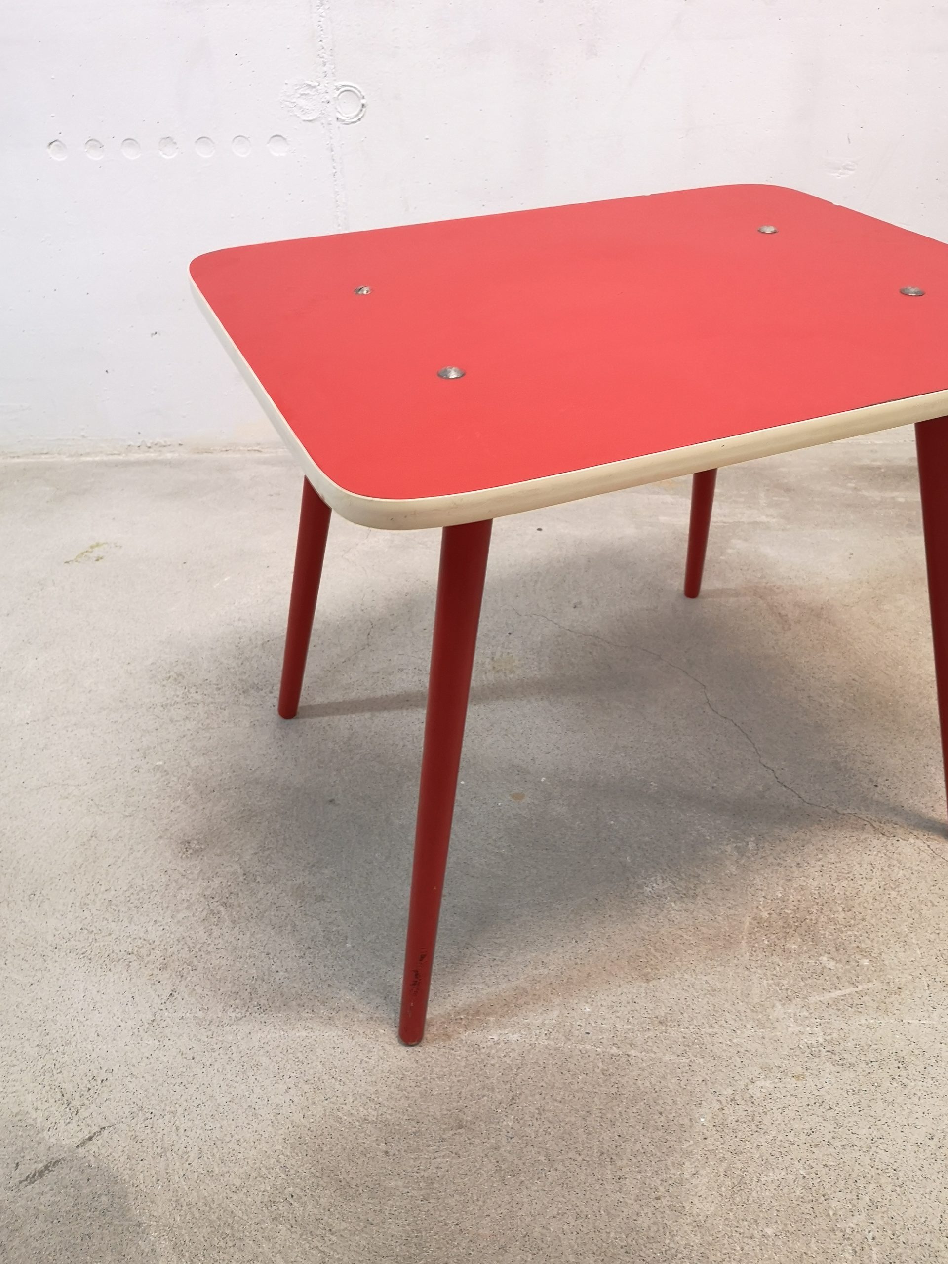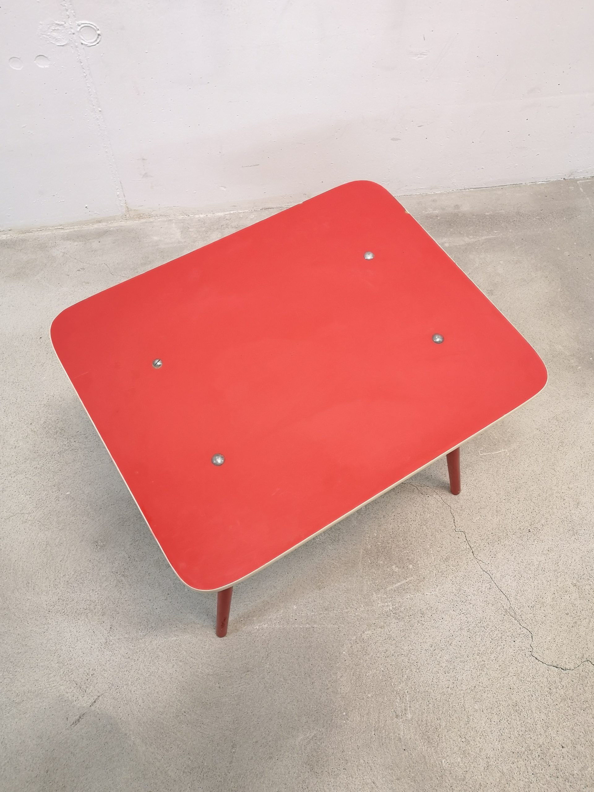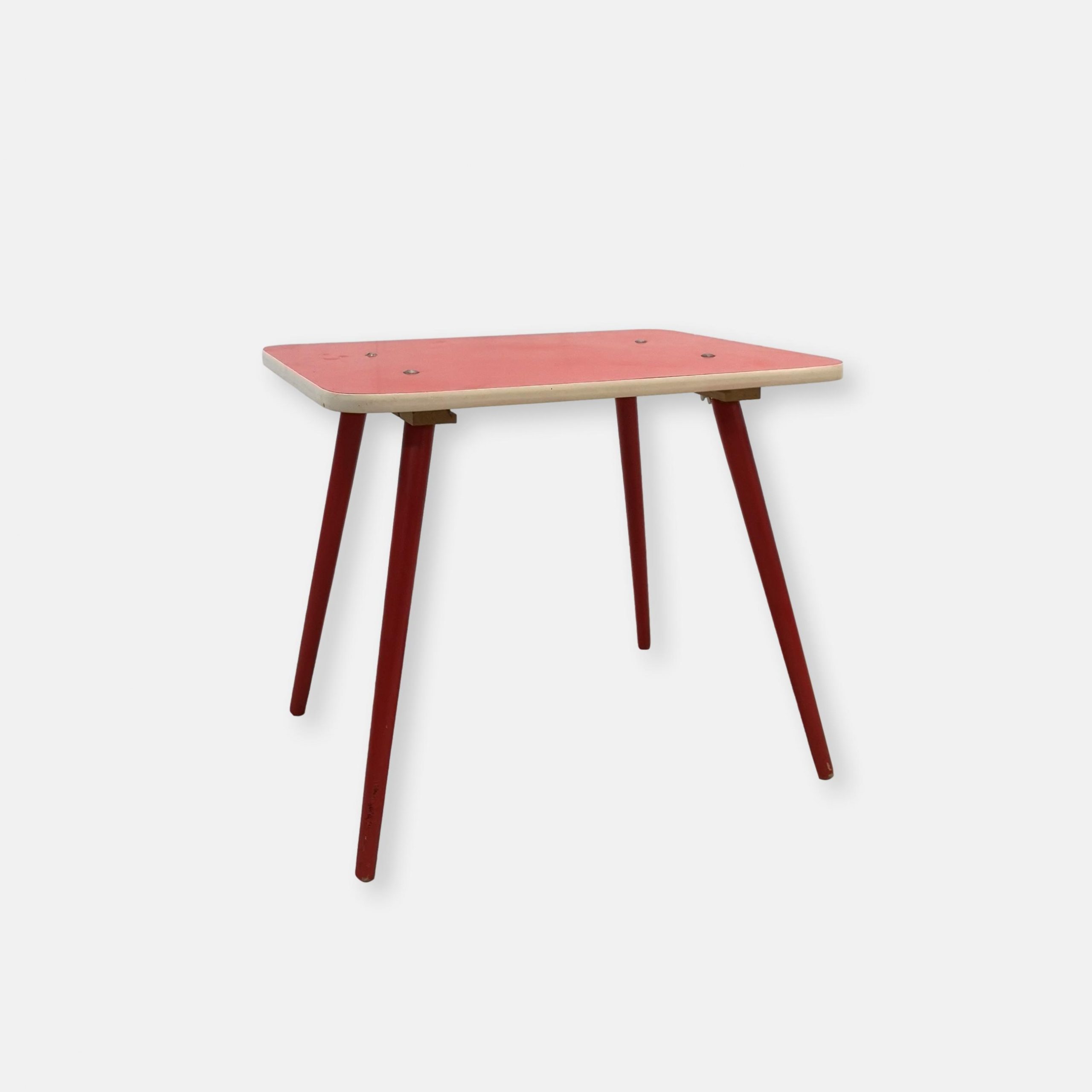Produit venduTable d’appoint vintage en bois avec plateau rouge. La table peut être utilisée aussi comme bureau pour enfants.