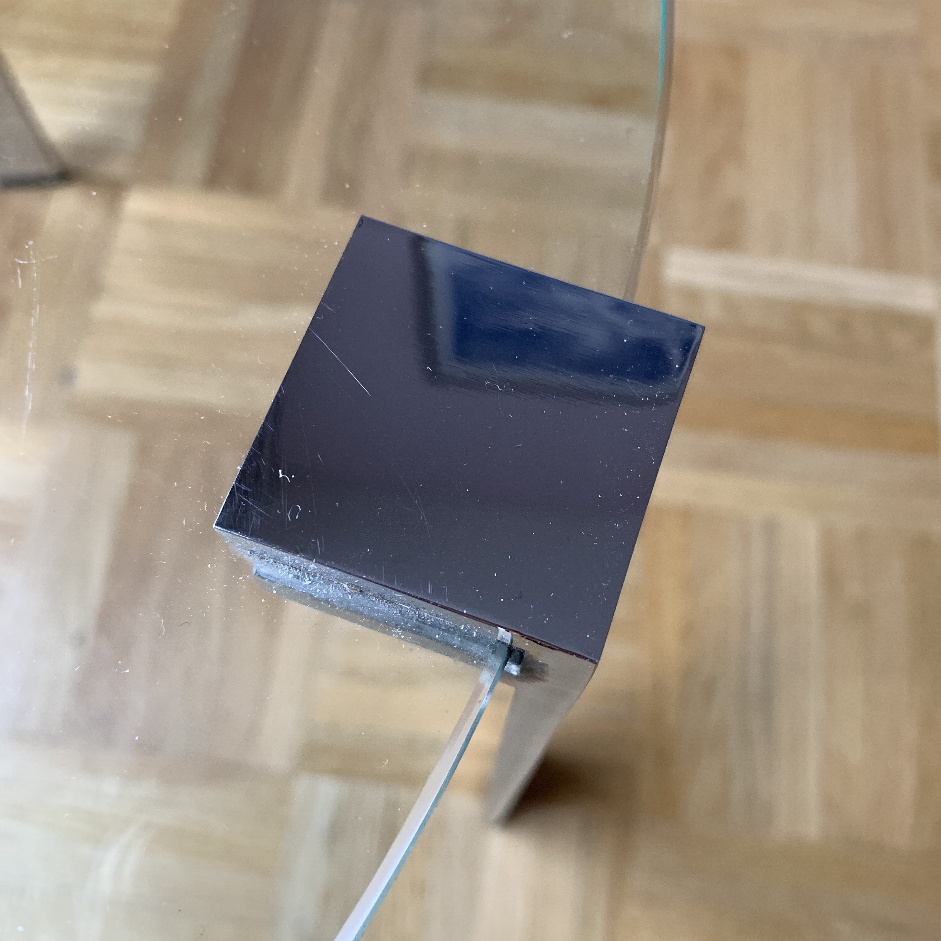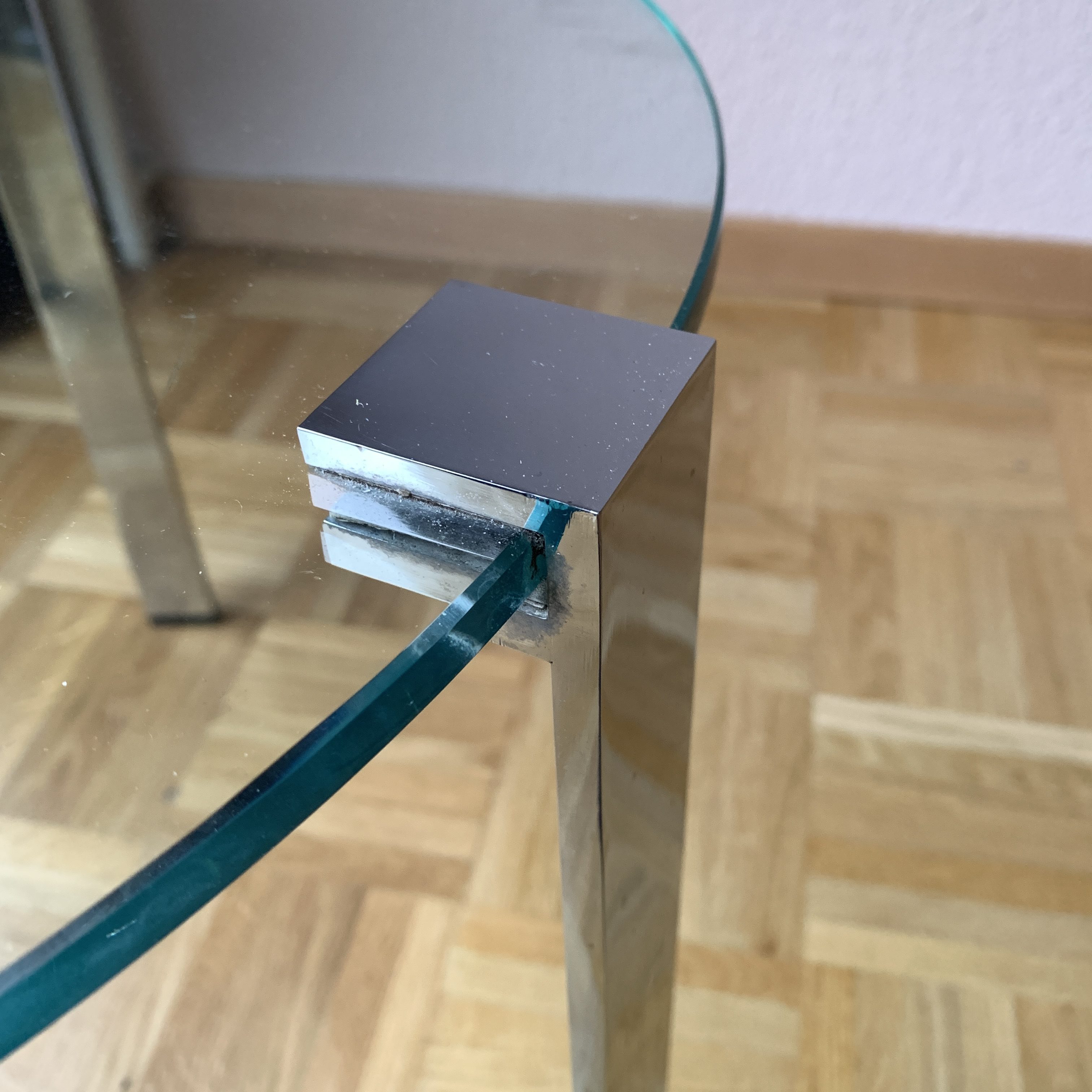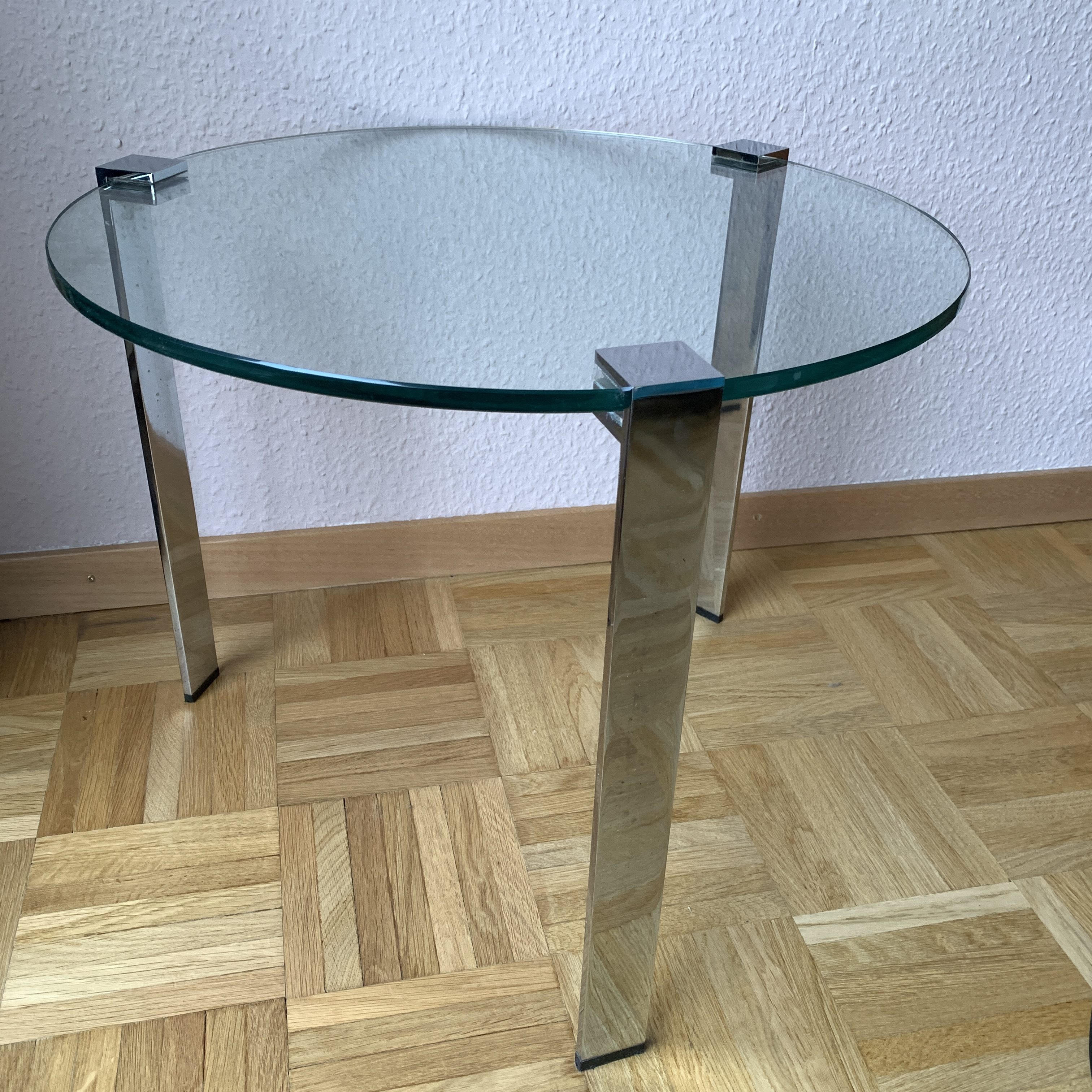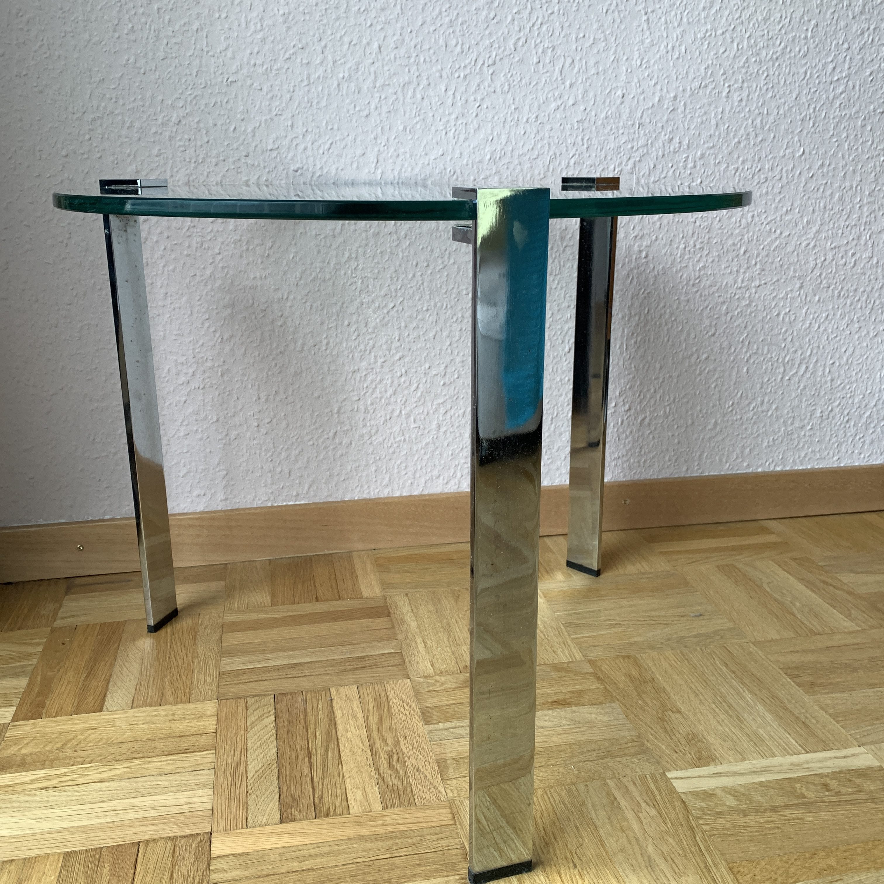 Le lourd plateau en verre est soutenu par trois pieds en métal chromé.