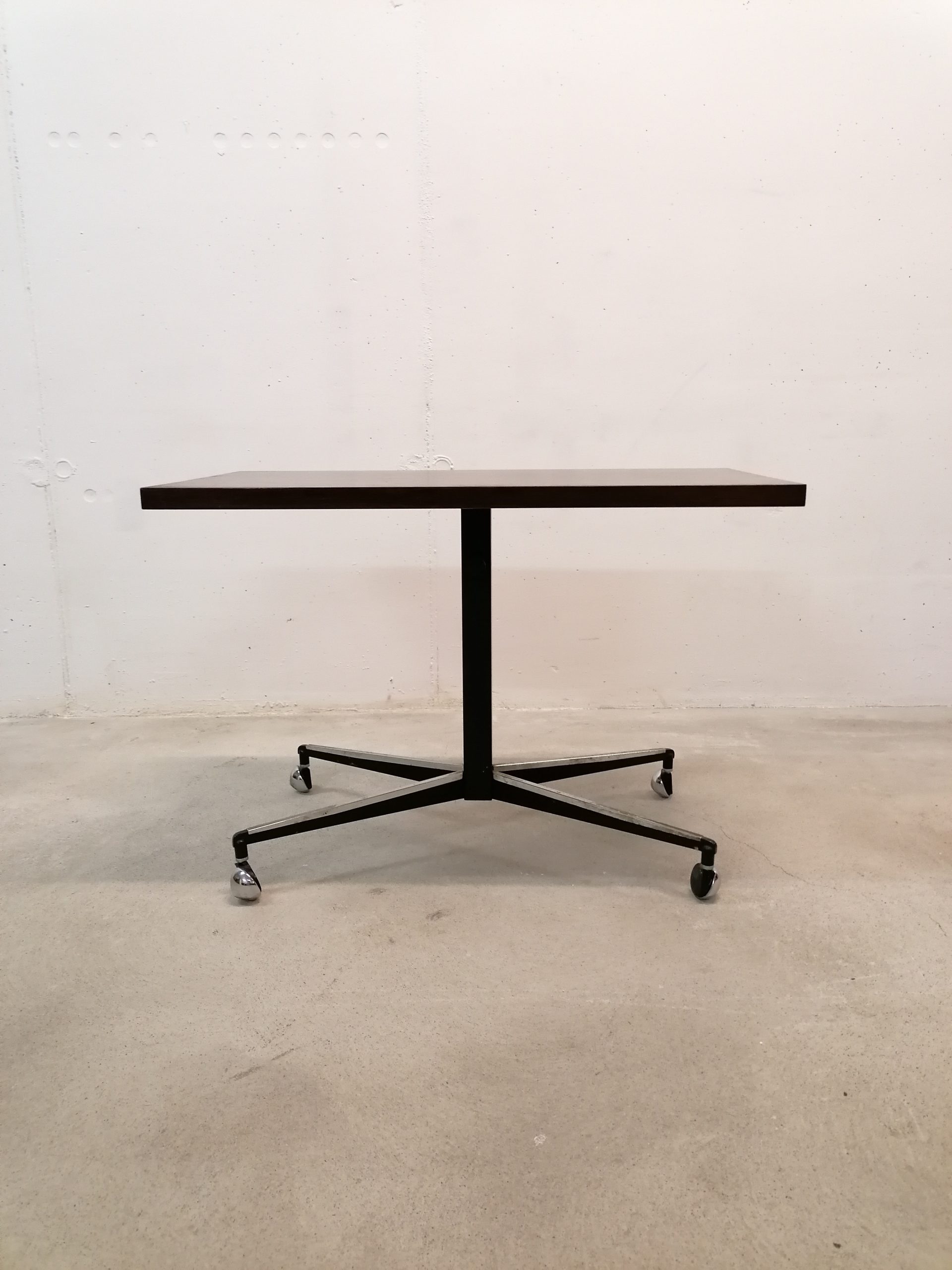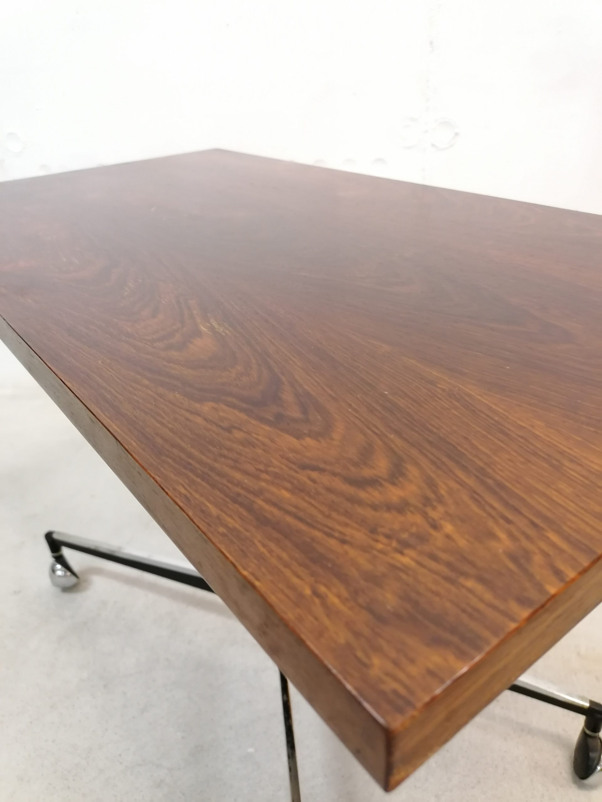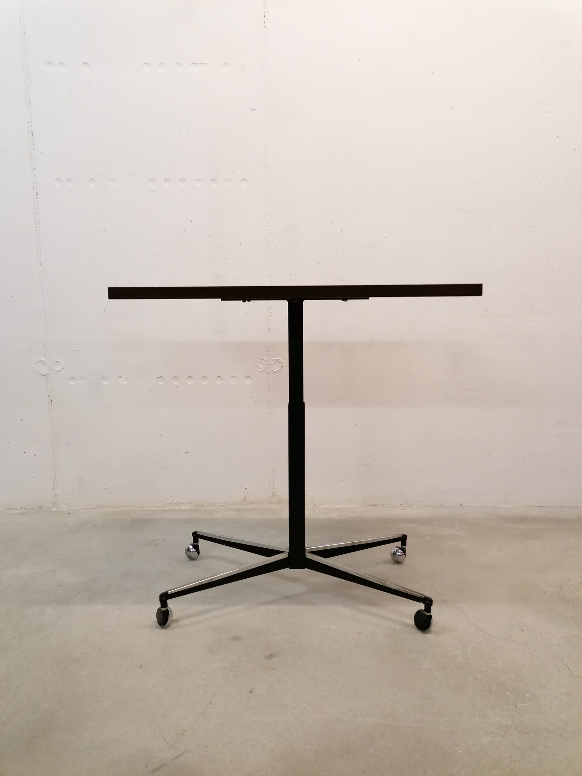 Produit venduTable d’appoint sur roulettes avec pied en métal et plateau en bois. Quelques traces d’utilisation sur le plateau. Hauteur réglable (min 50 cm; max 75 cm).
