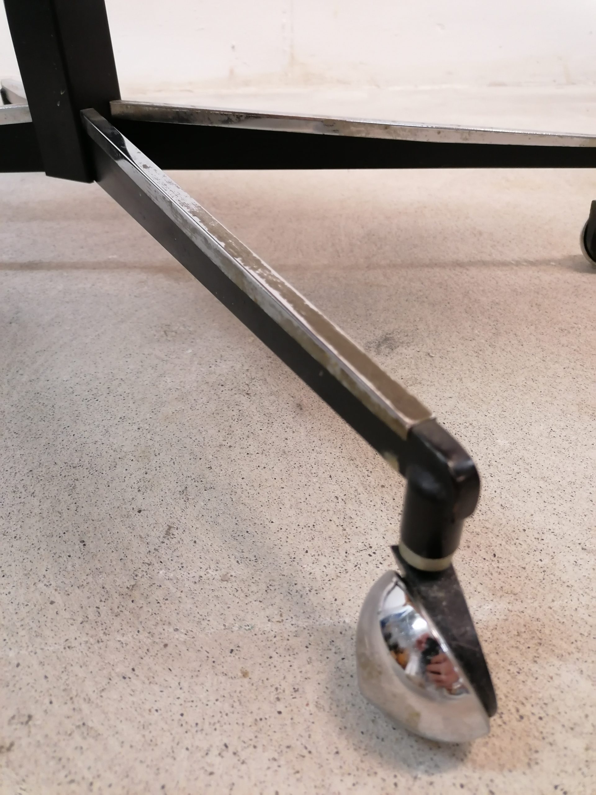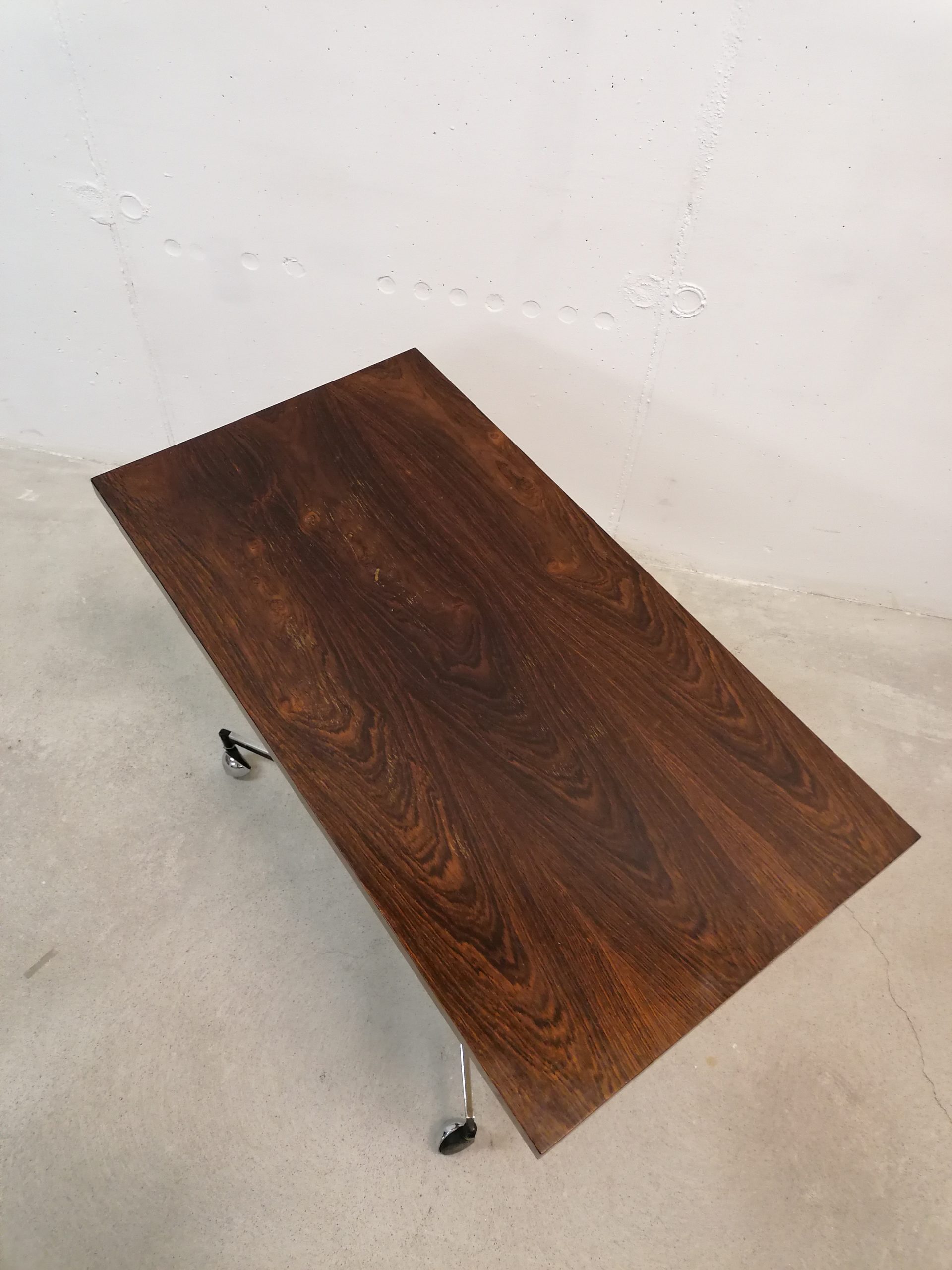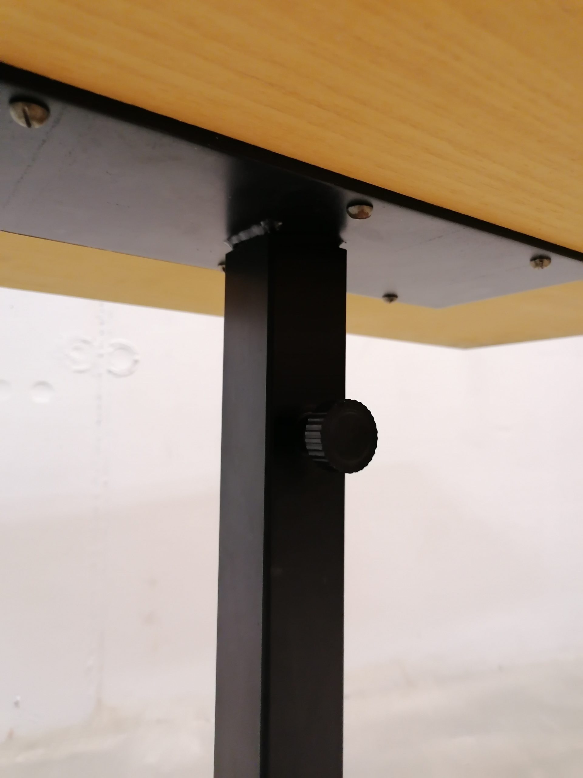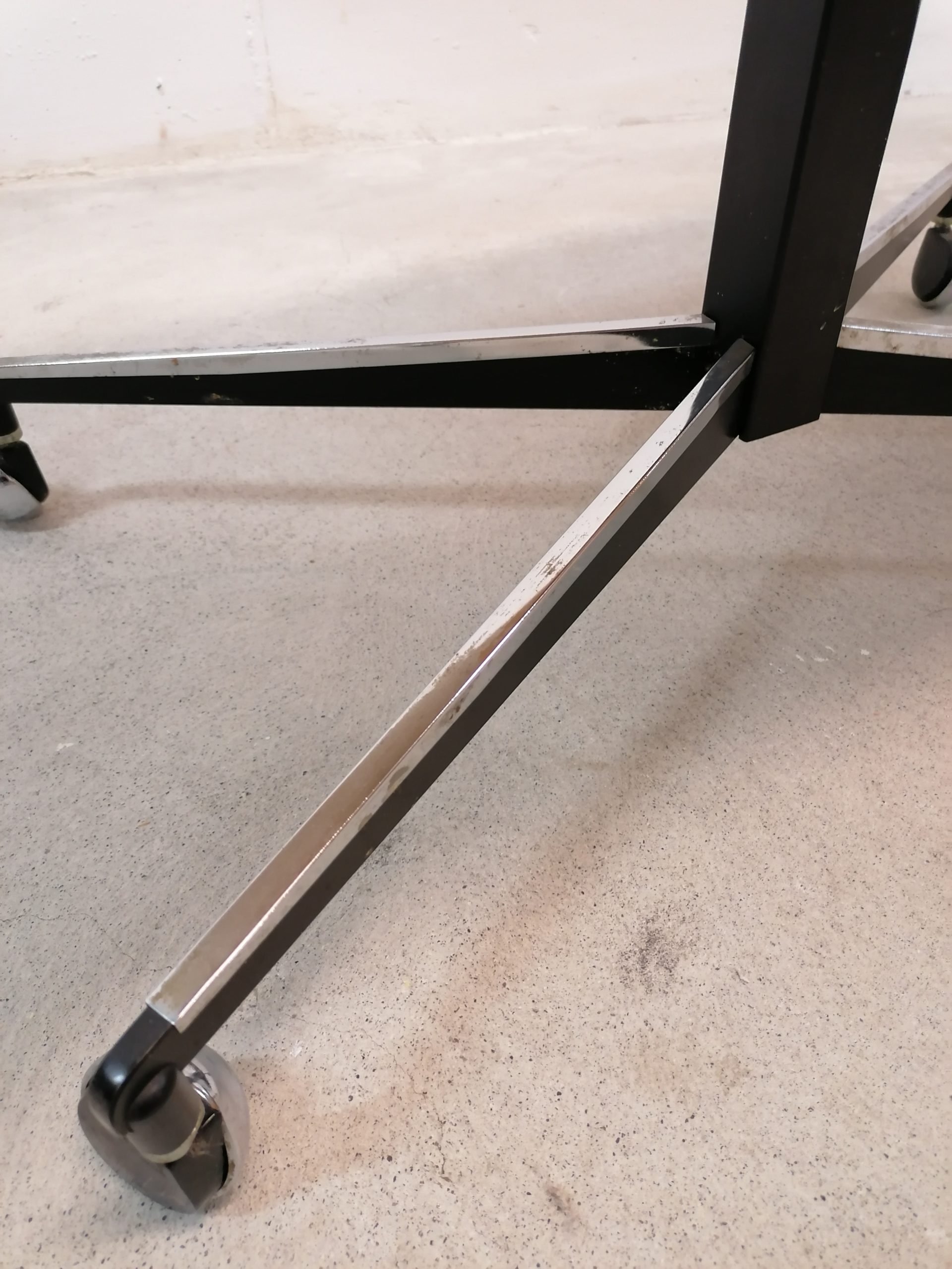 Produit venduTable d’appoint sur roulettes avec pied en métal et plateau en bois. Quelques traces d’utilisation sur le plateau. Hauteur réglable (min 50 cm; max 75 cm).