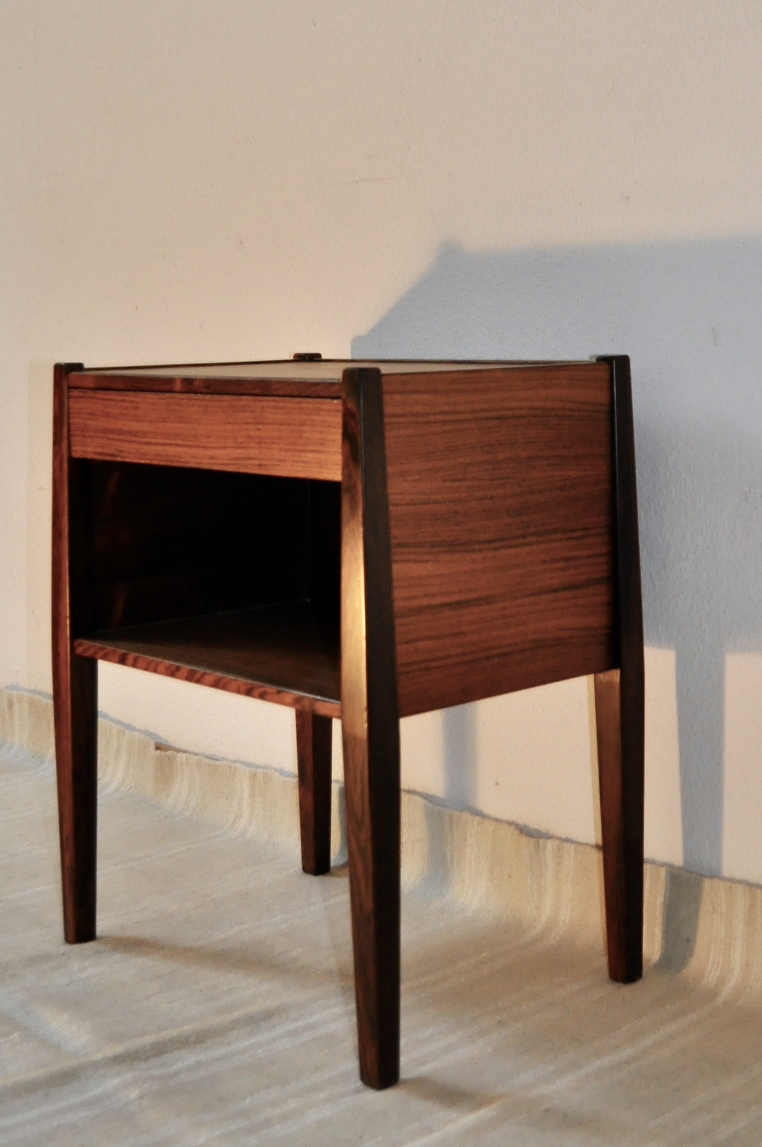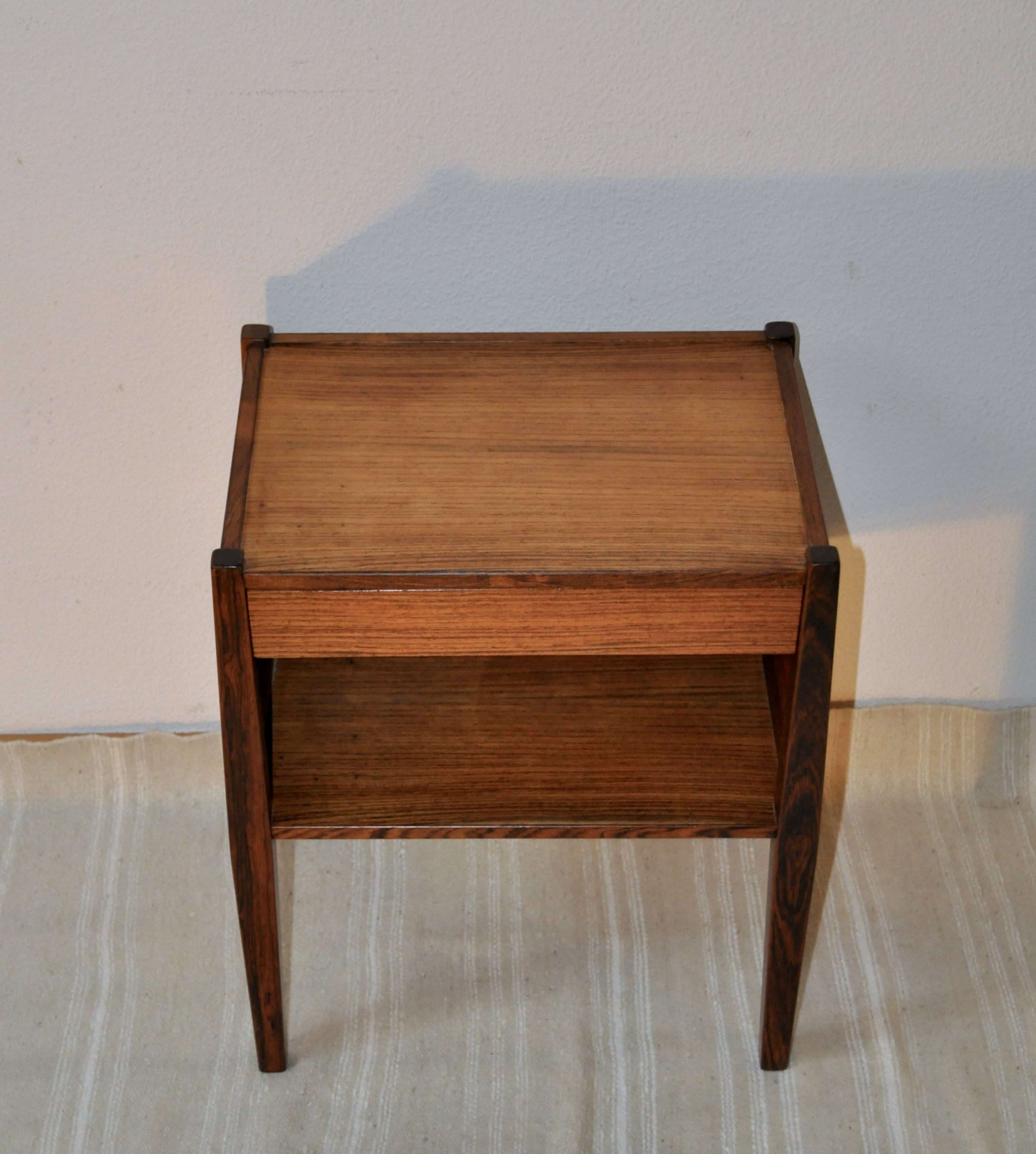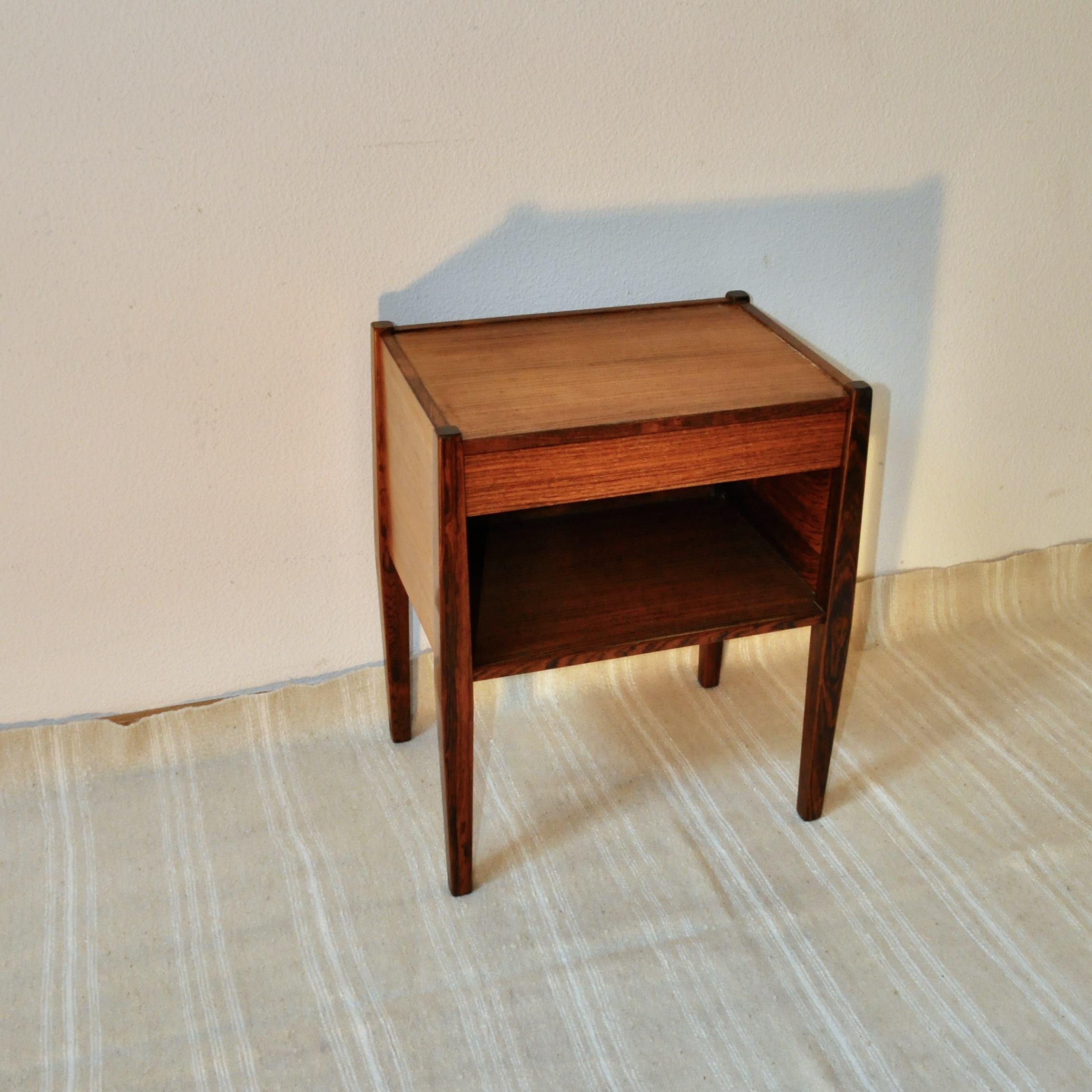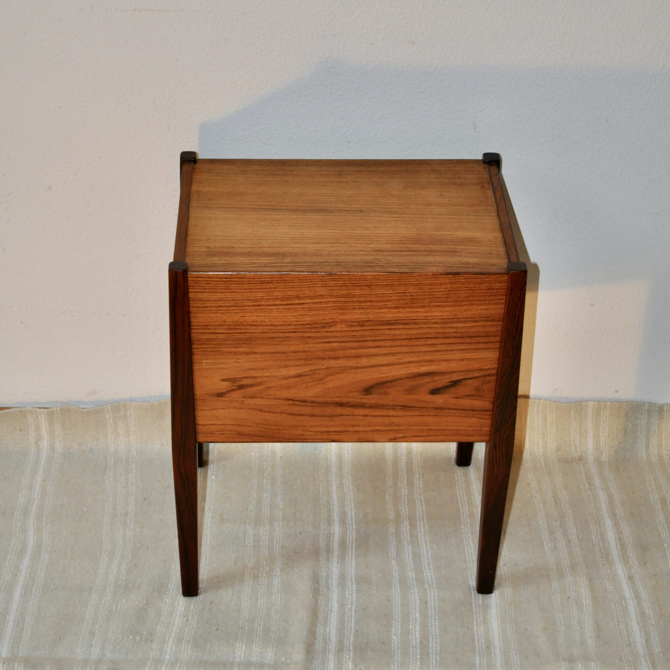Table de chevet danoise de Poul Hundevad pour Vamdrup des années 60. En bois de palissandre plaqué et massif, cette petite table de très belle facture peut servir de table de chevet mais également de table basse ou de table d’entrée.
