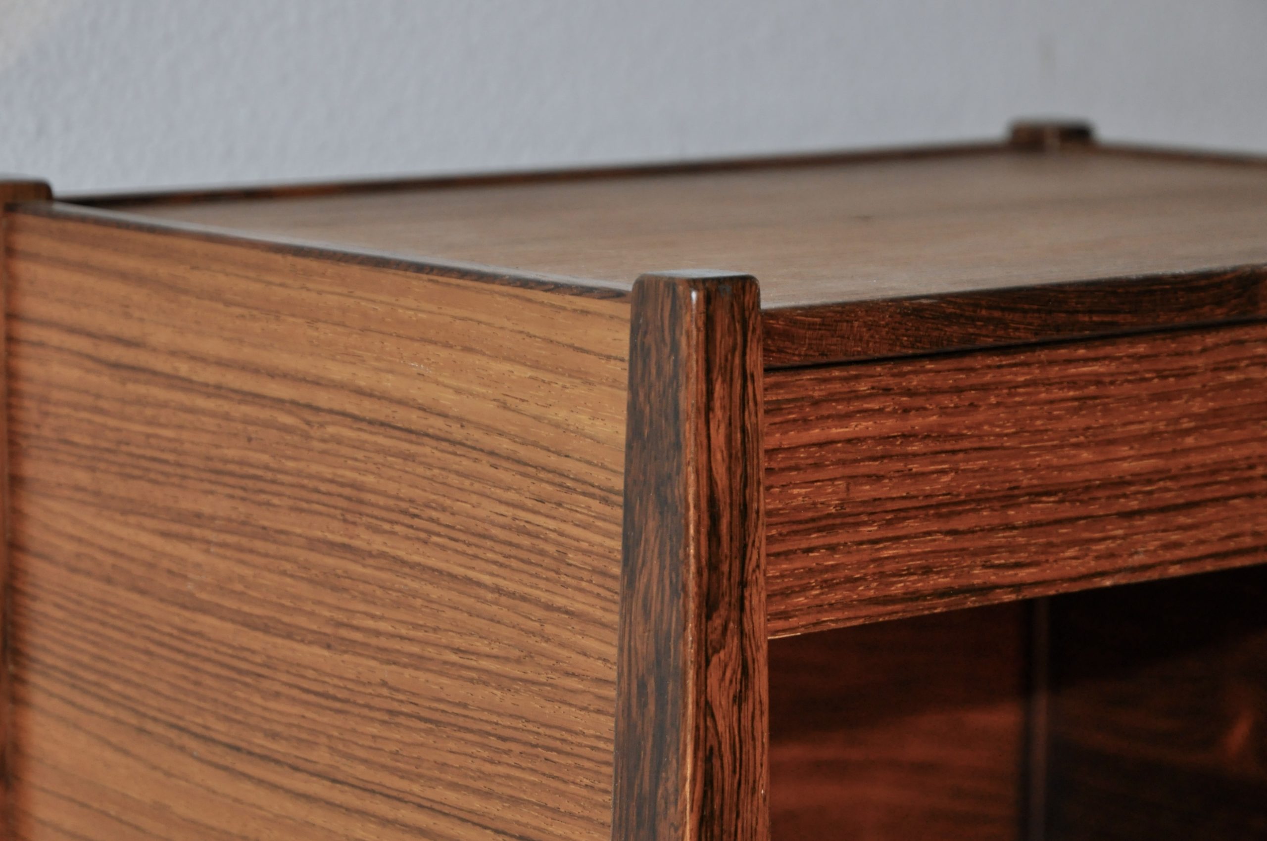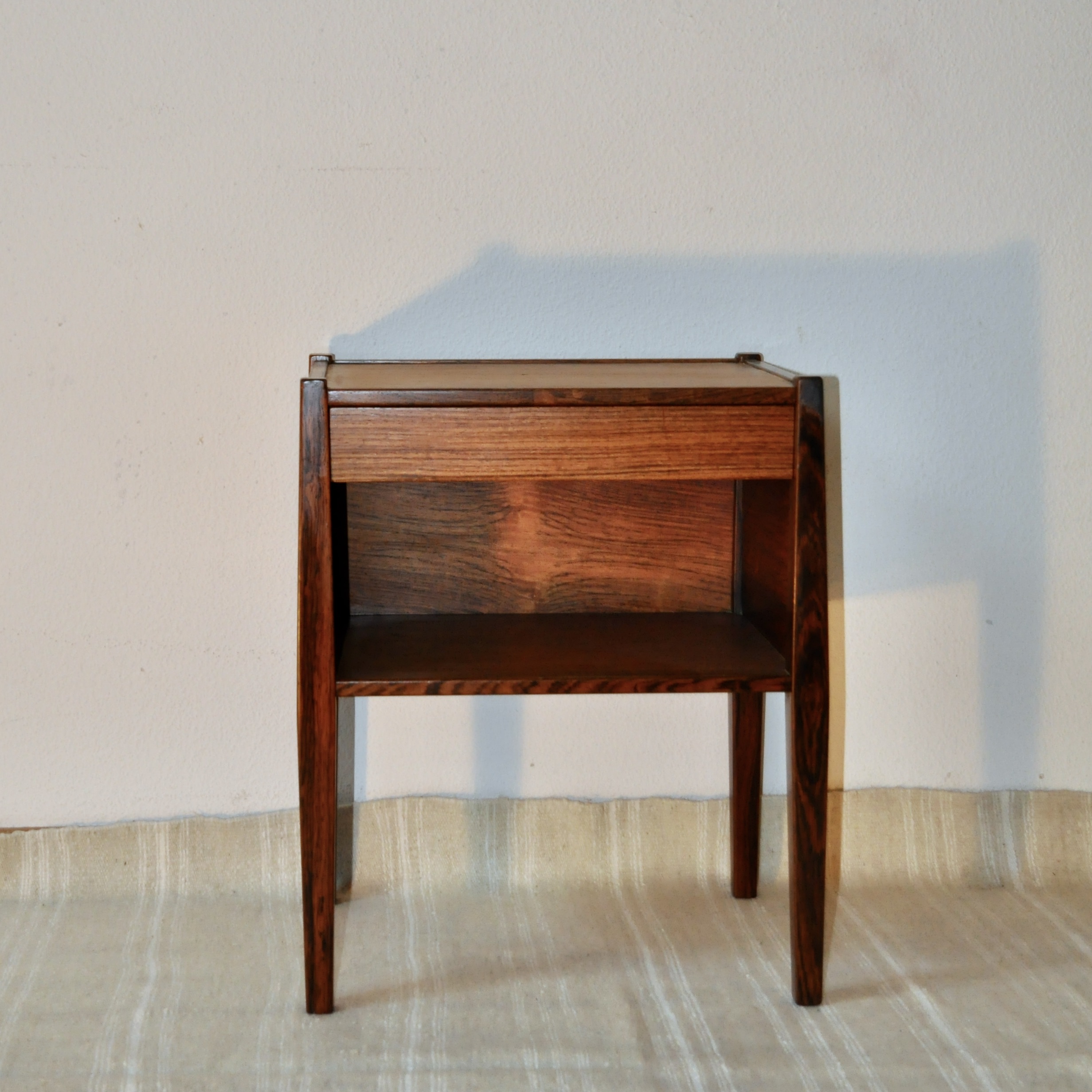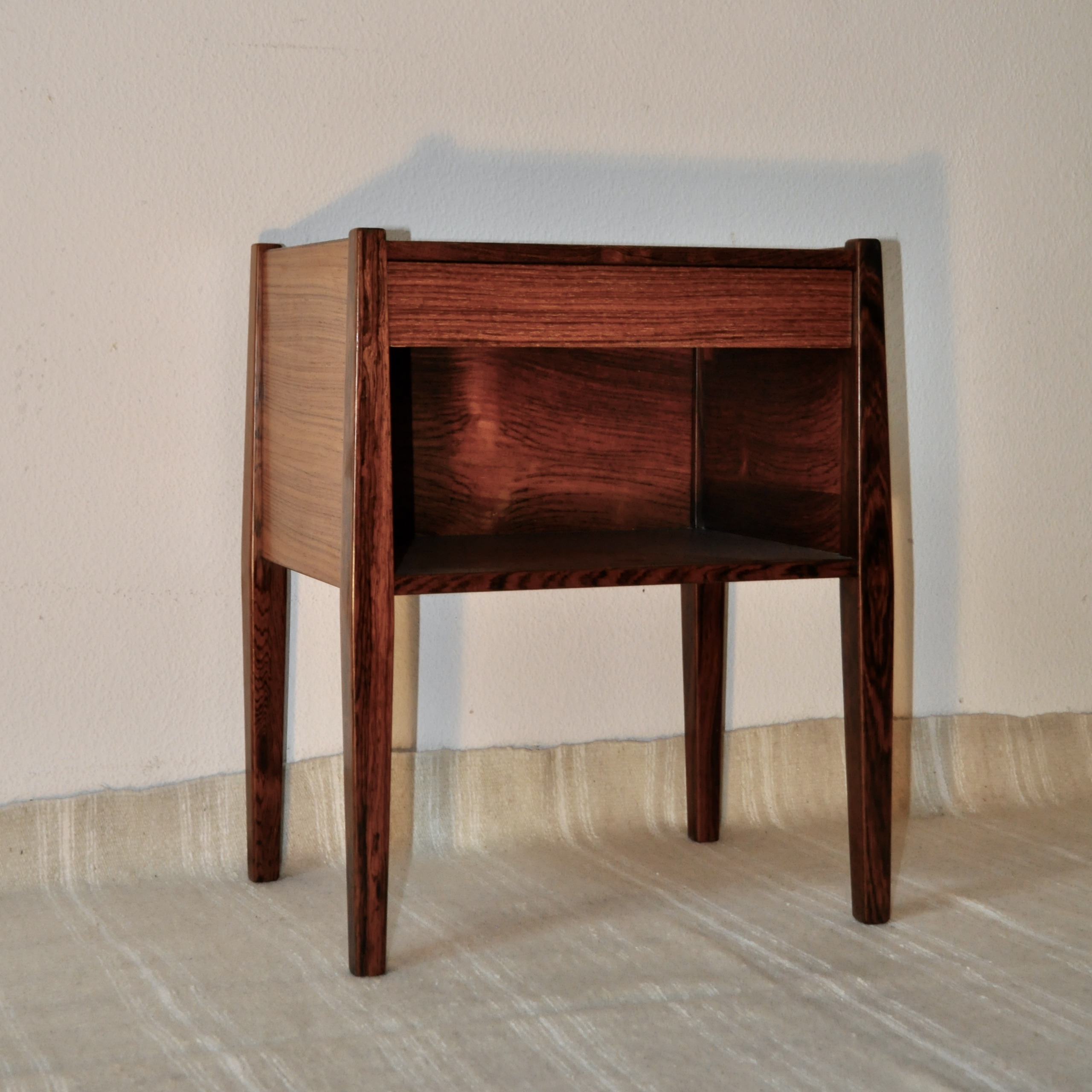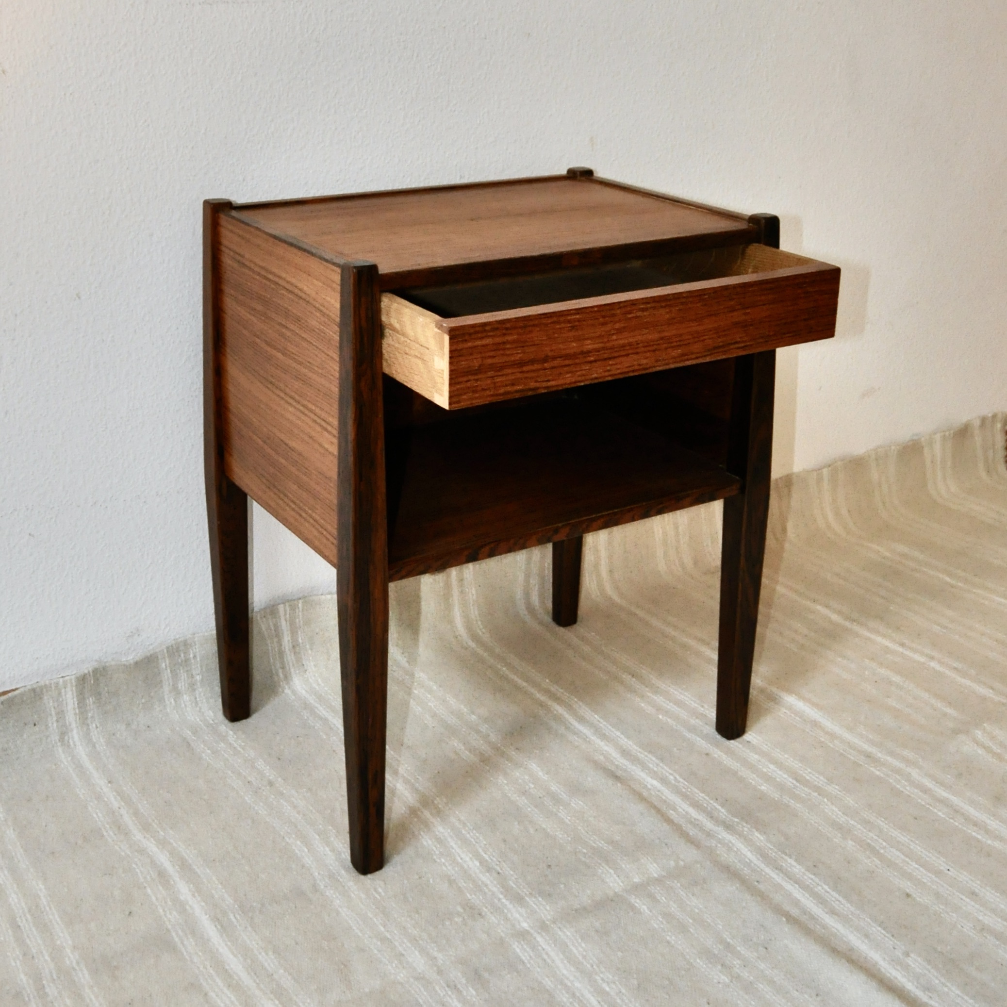 Table de chevet danoise de Poul Hundevad pour Vamdrup des années 60. En bois de palissandre plaqué et massif, cette petite table de très belle facture peut servir de table de chevet mais également de table basse ou de table d’entrée.
