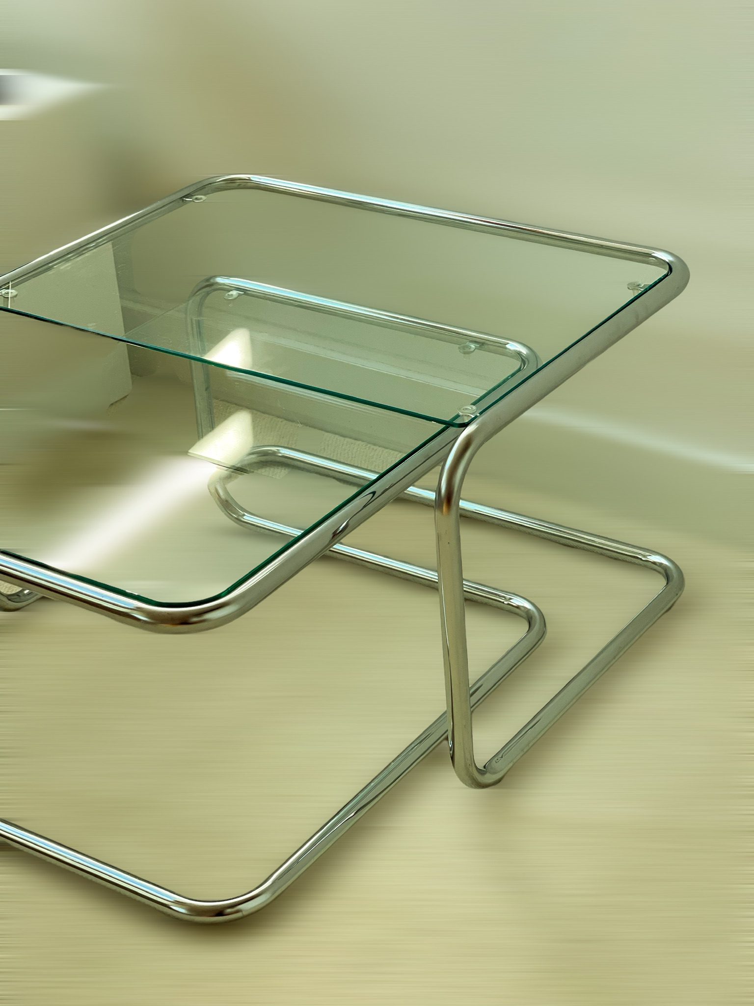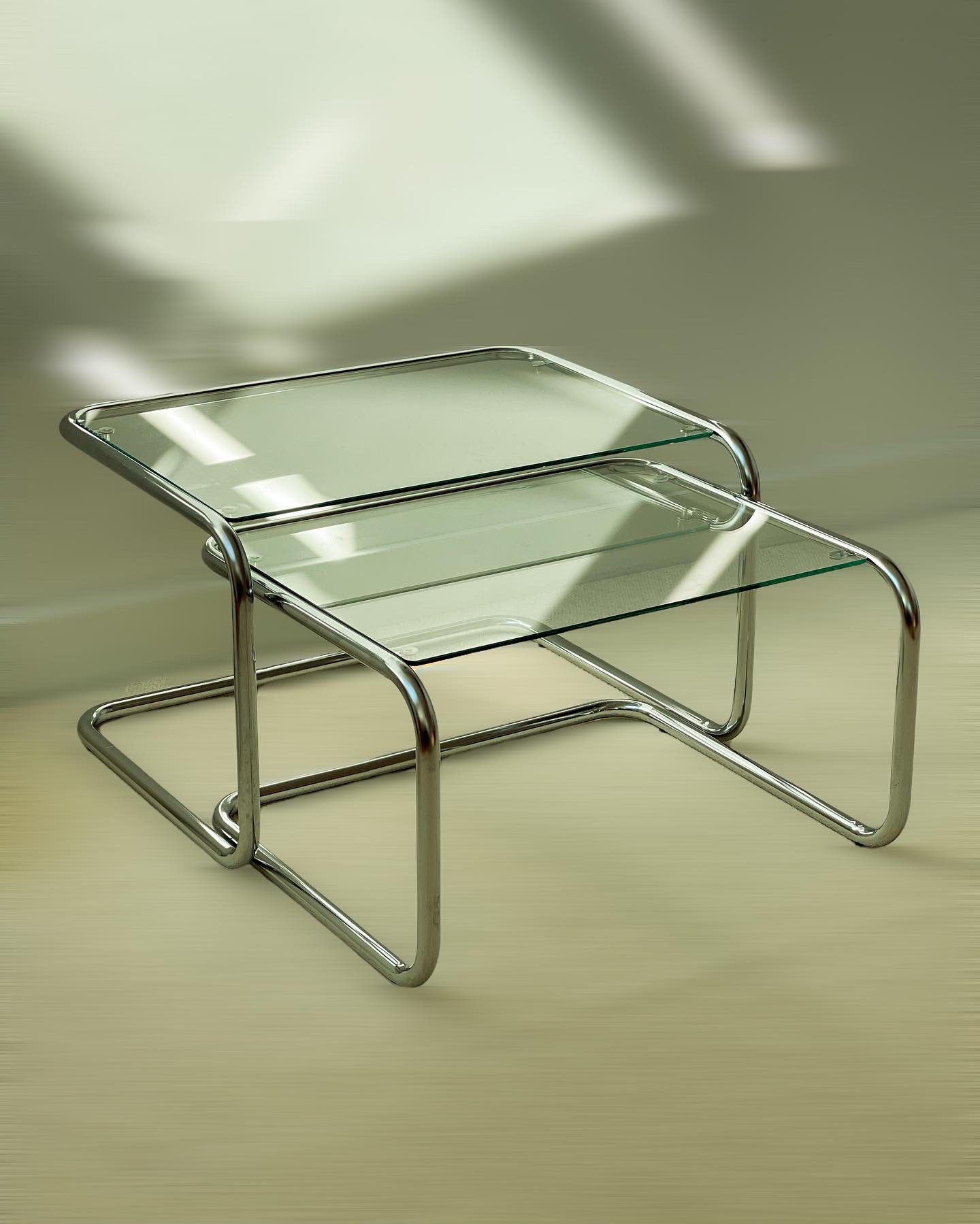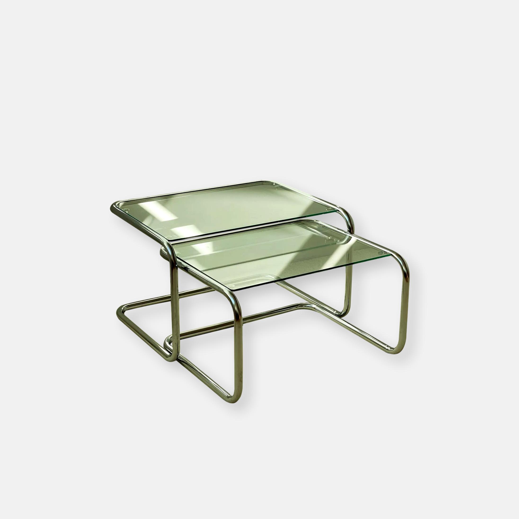 Produit venduTables gigognes, structure tubulaire en porte à faux en acier chromé, plateaux en verre très légèrement fumé.