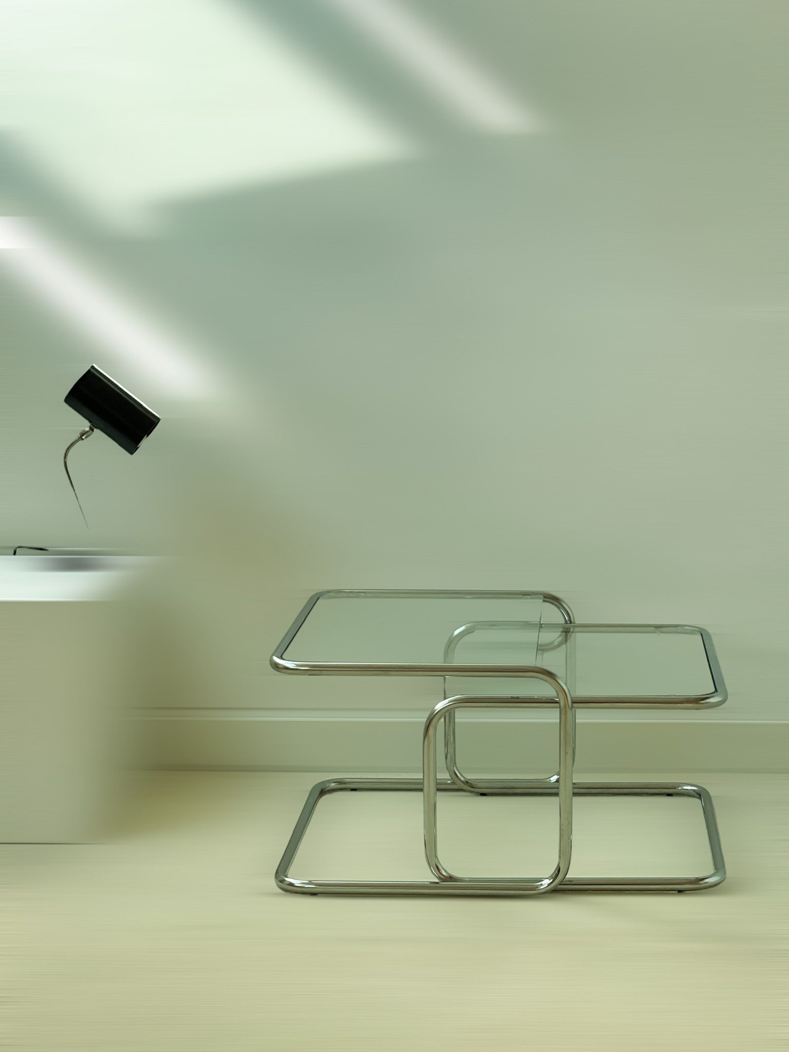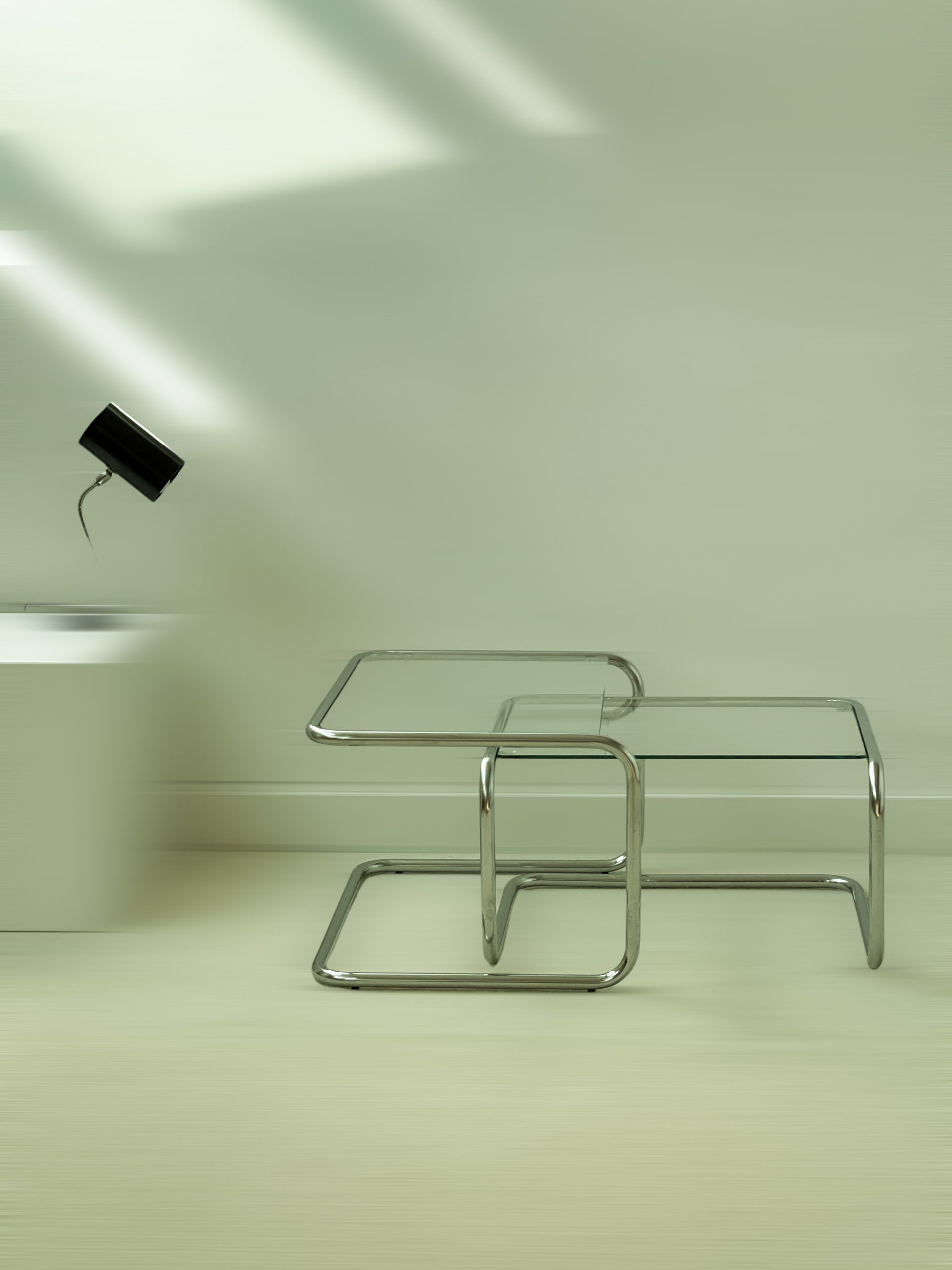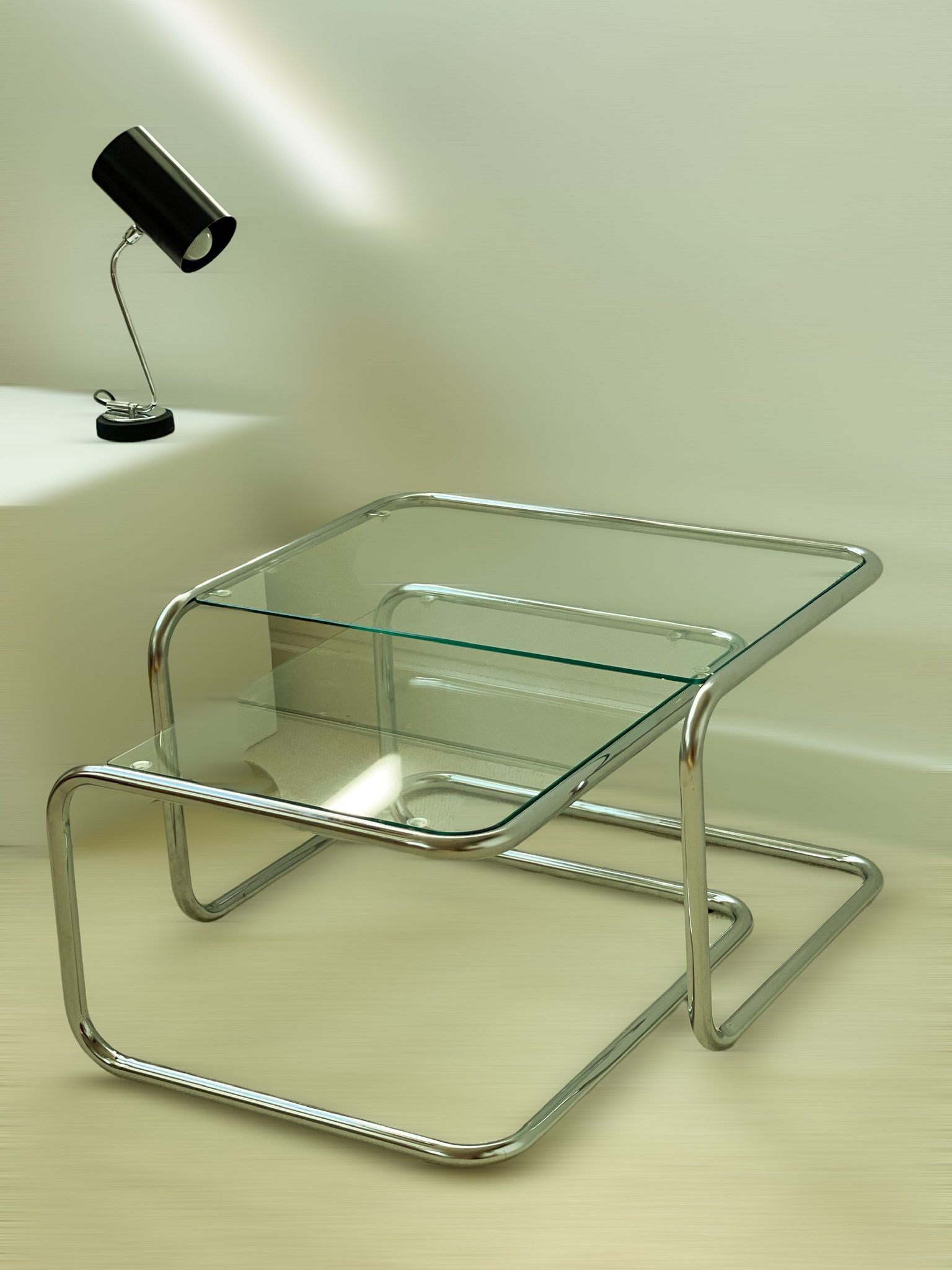 Produit venduTables gigognes, structure tubulaire en porte à faux en acier chromé, plateaux en verre très légèrement fumé.