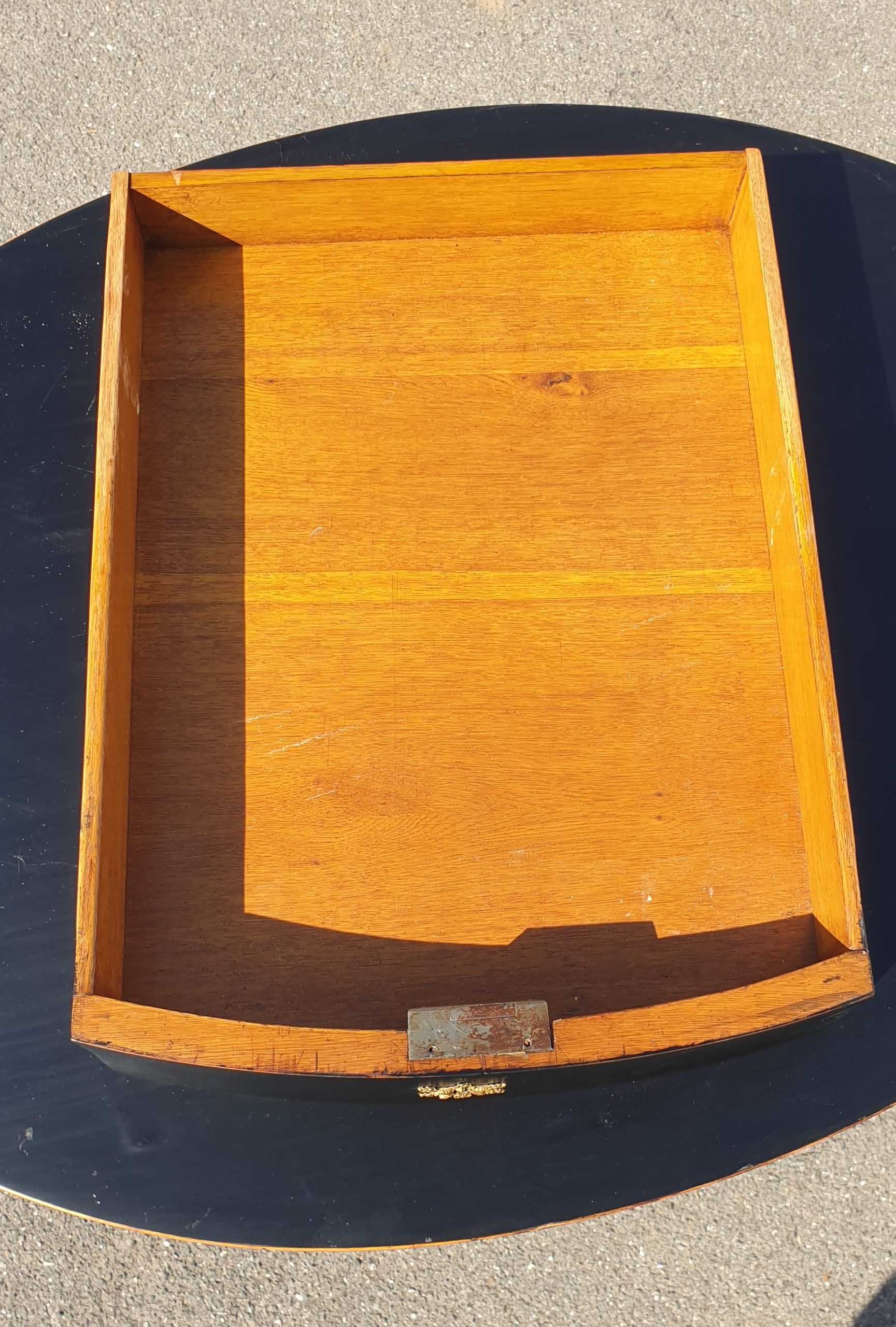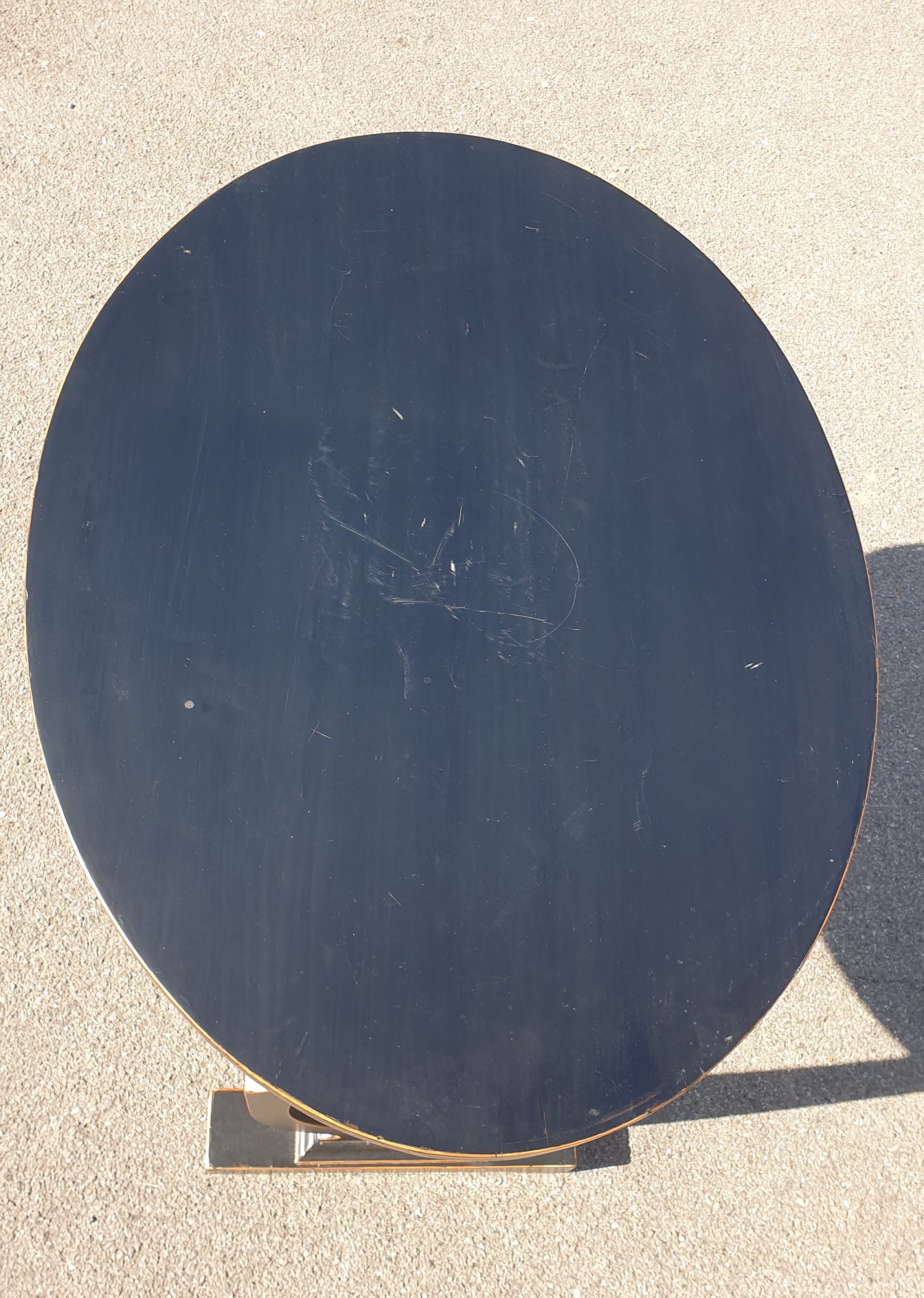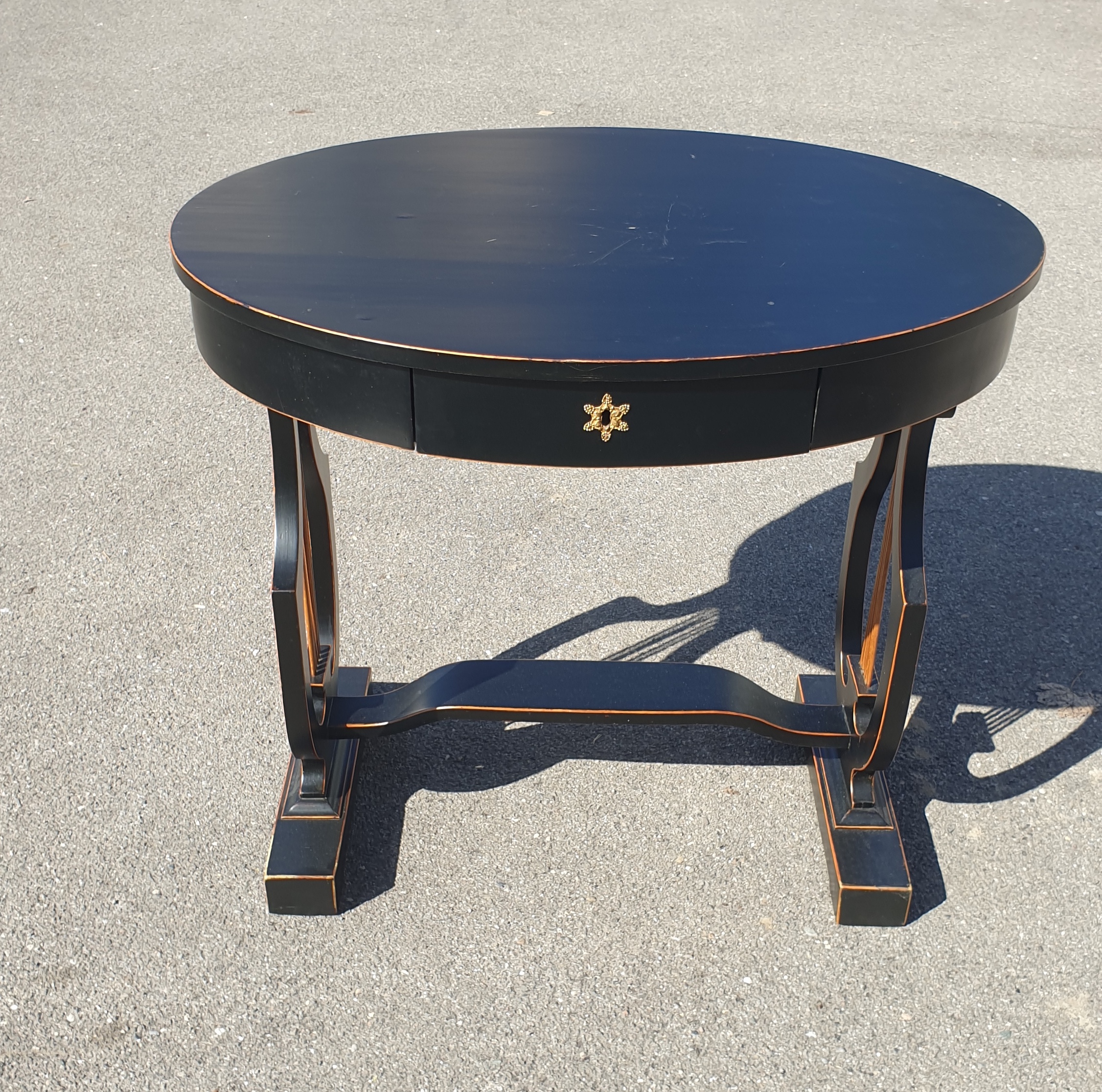 Table d’appoint / guéridon ovale sur piètement Lyre en bois ébonisé, un tiroir, d’époque Napoléon III (1852-1870) , soigneusement restauré il y a une quinzaine d’années.