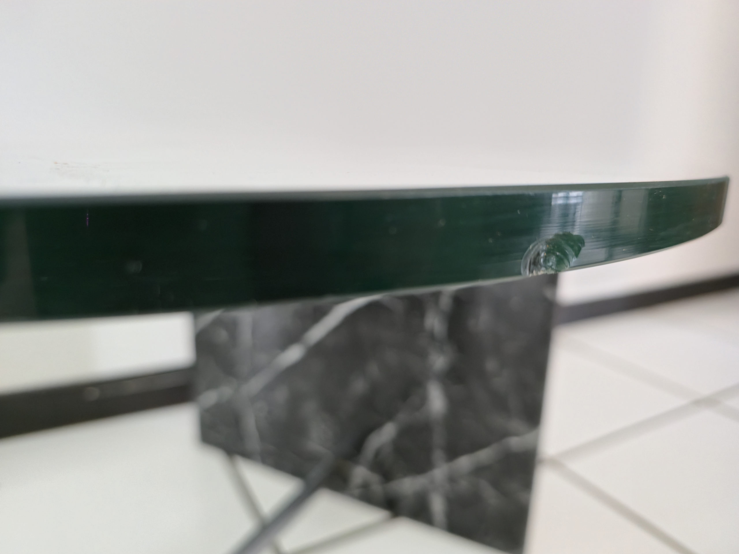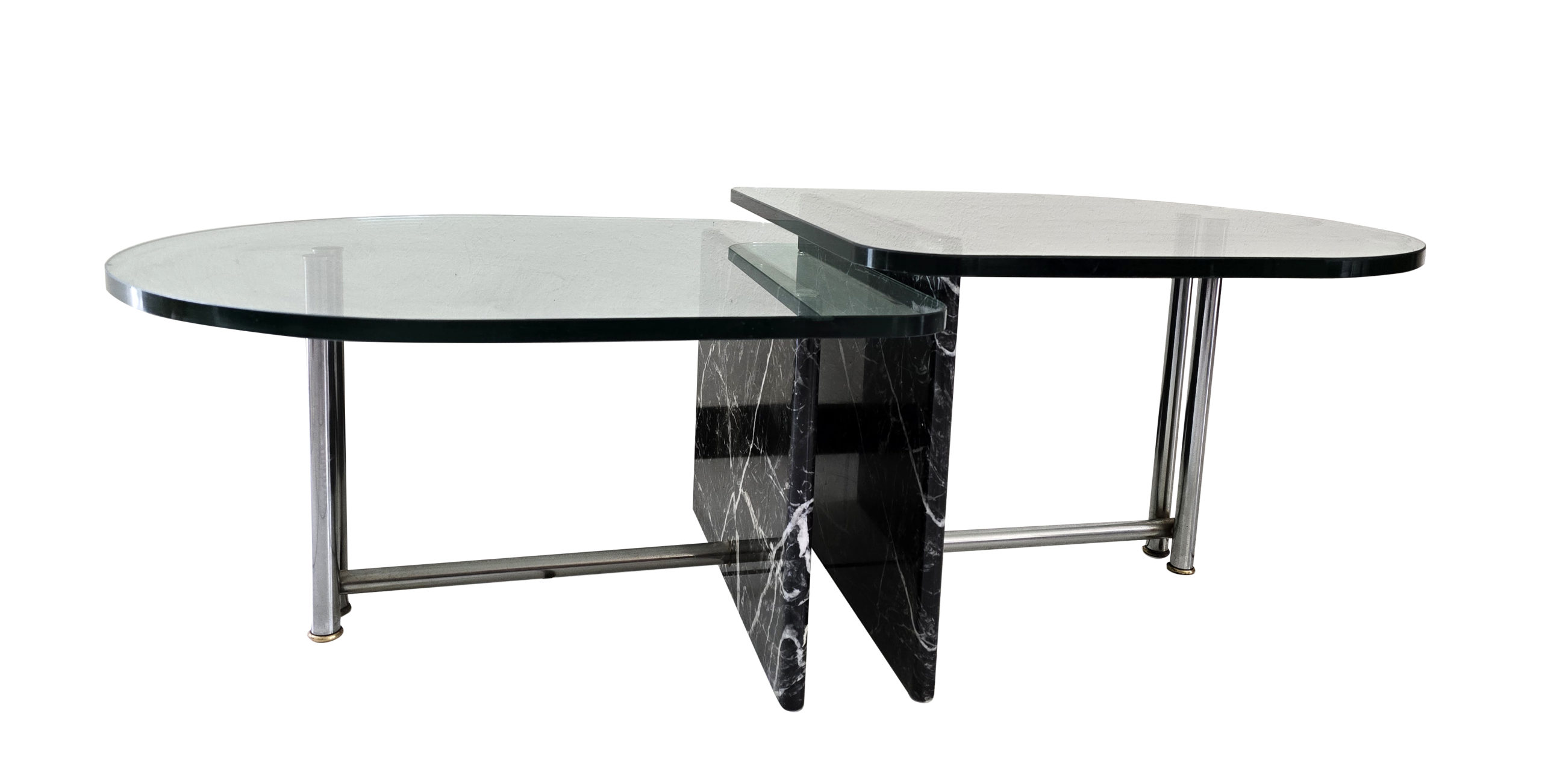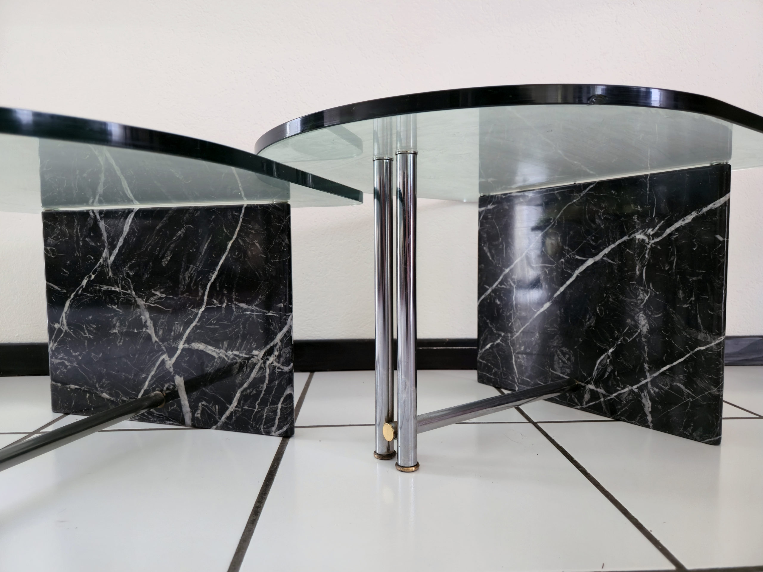 Paire de tables gigognes mêlant verre, marbre noir et blanc et structure métallique. Design élégant et graphique, typique des intérieurs vintage chic.