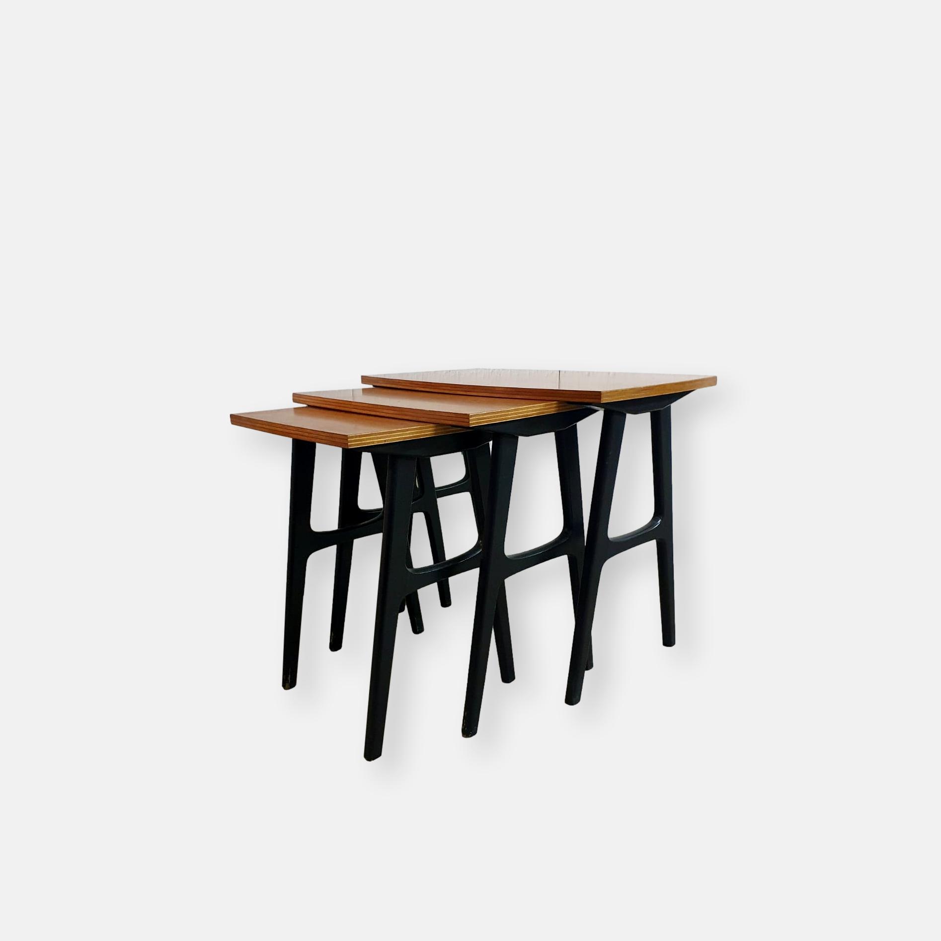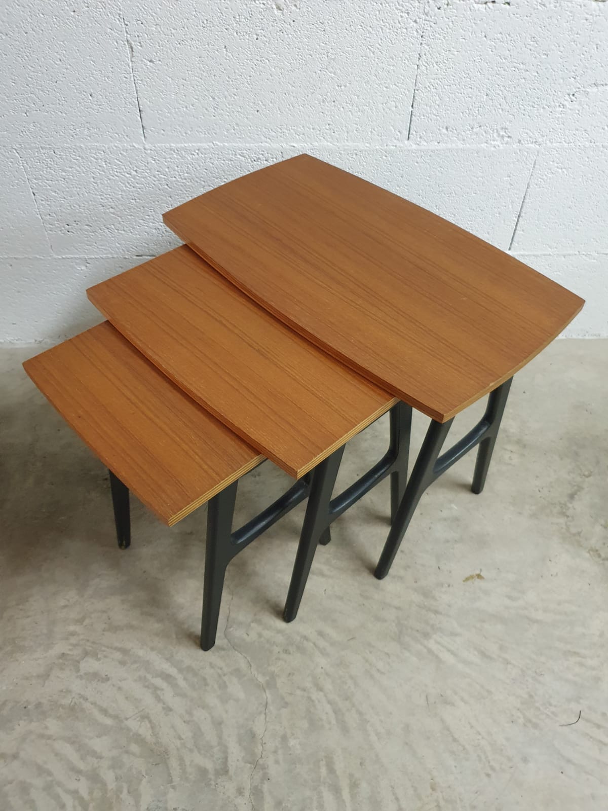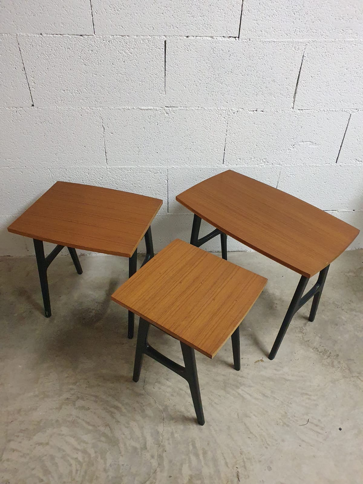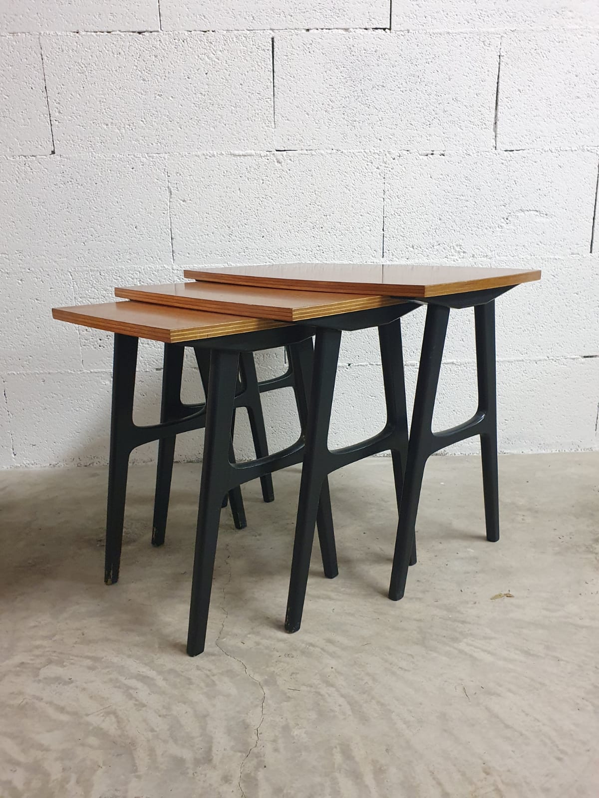 Produit venduEnsemble de 3 tables gigognes, piètement noir des années 70.