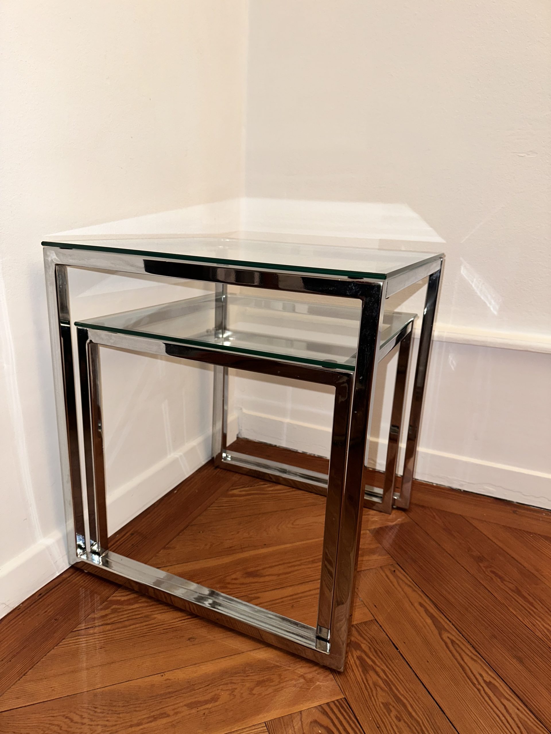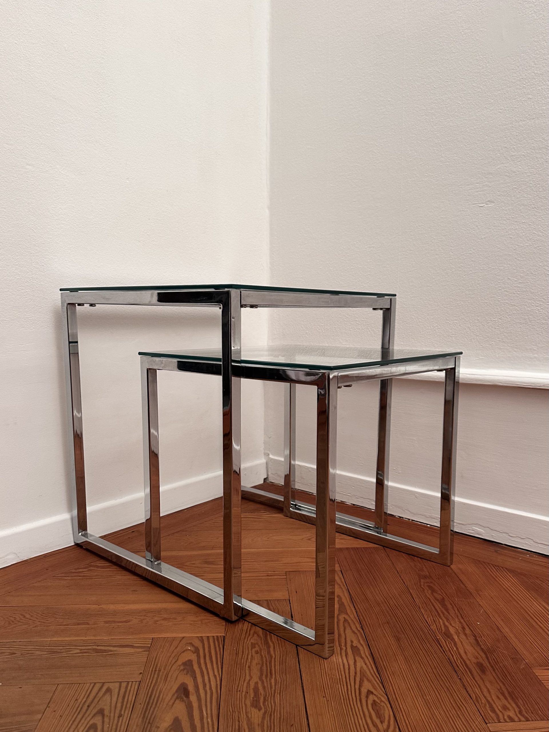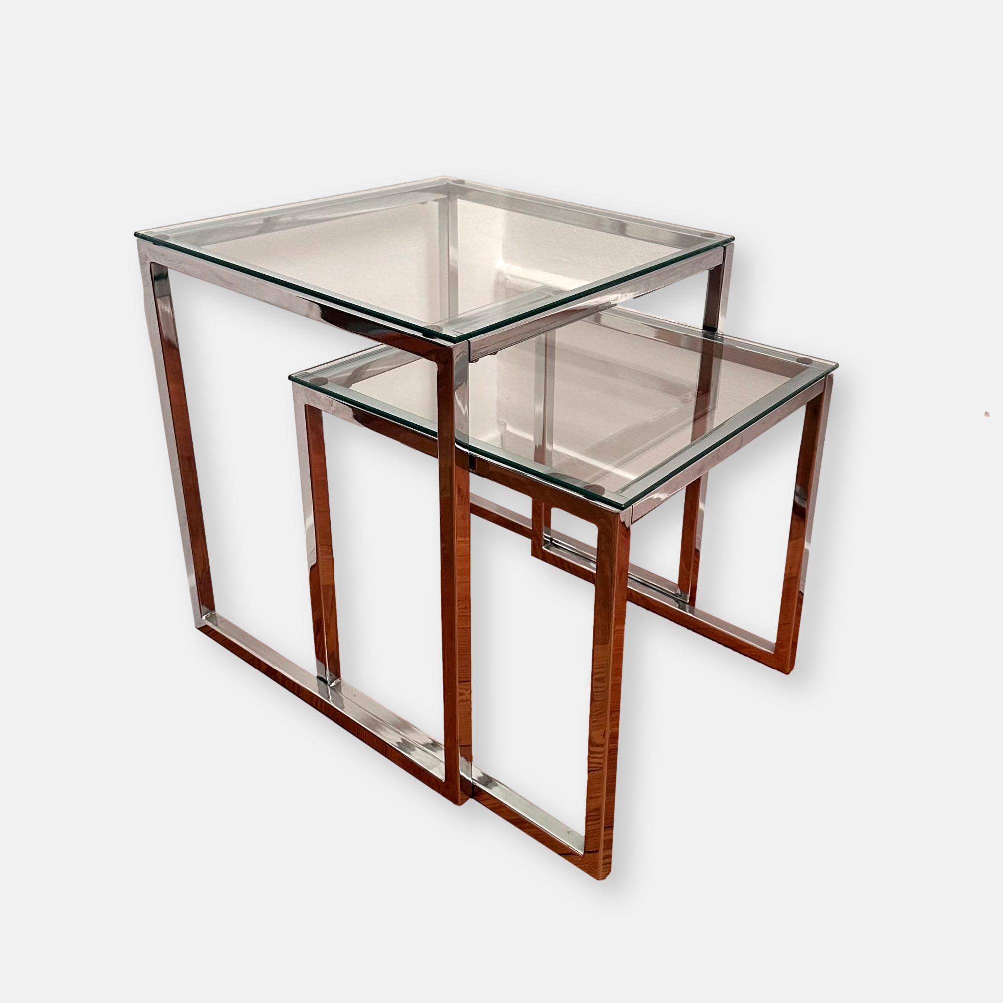 Très belle paire de tables gigognes carrées vintage des années 1980, structure en acier chromé et plateaux en verre transparent. Verre aux bords polis et biseautés, avec petites ventouses de maintien aux angles, permettant de caler le plateau et d’éviter le contact direct verre sur métal.