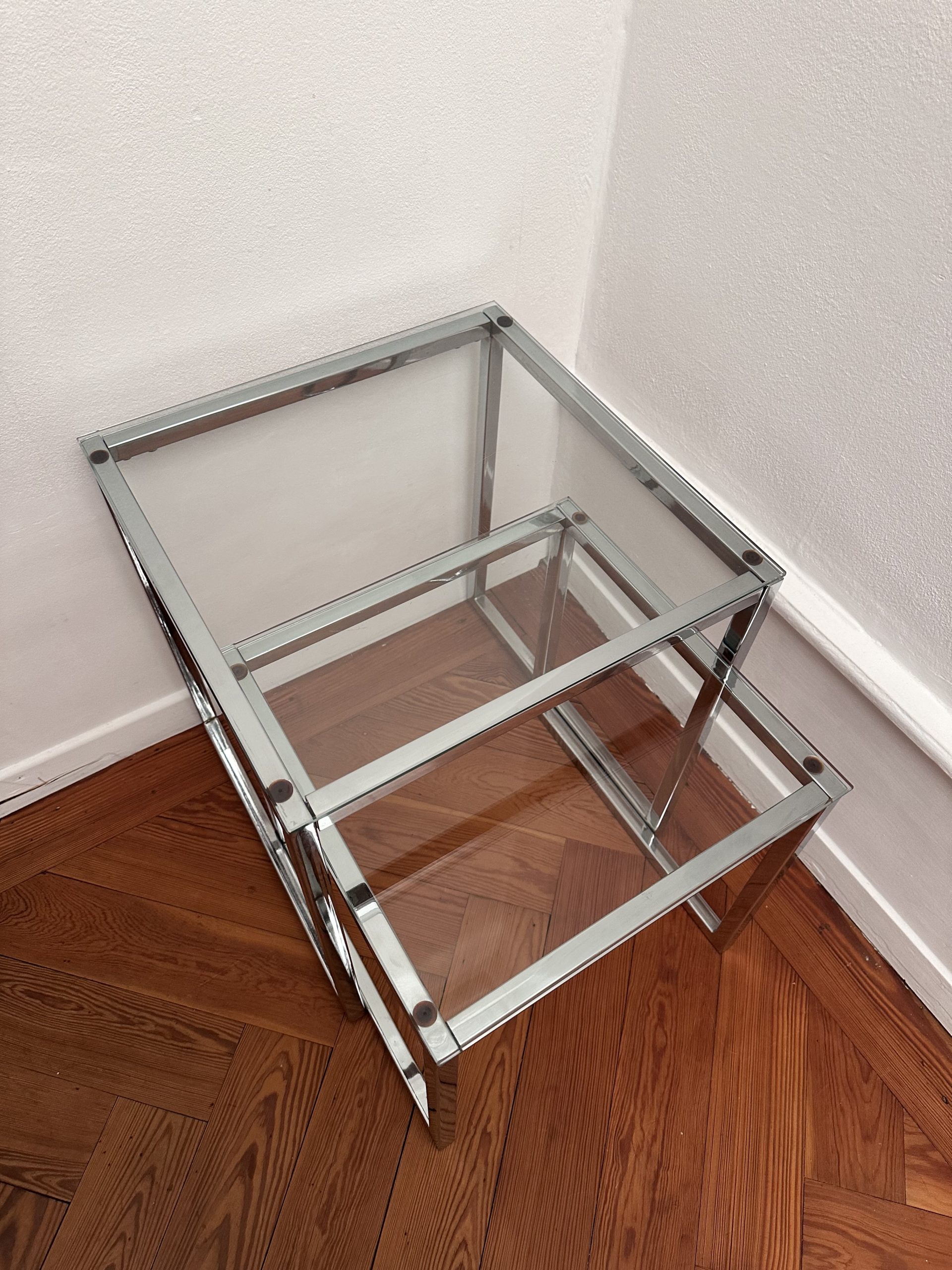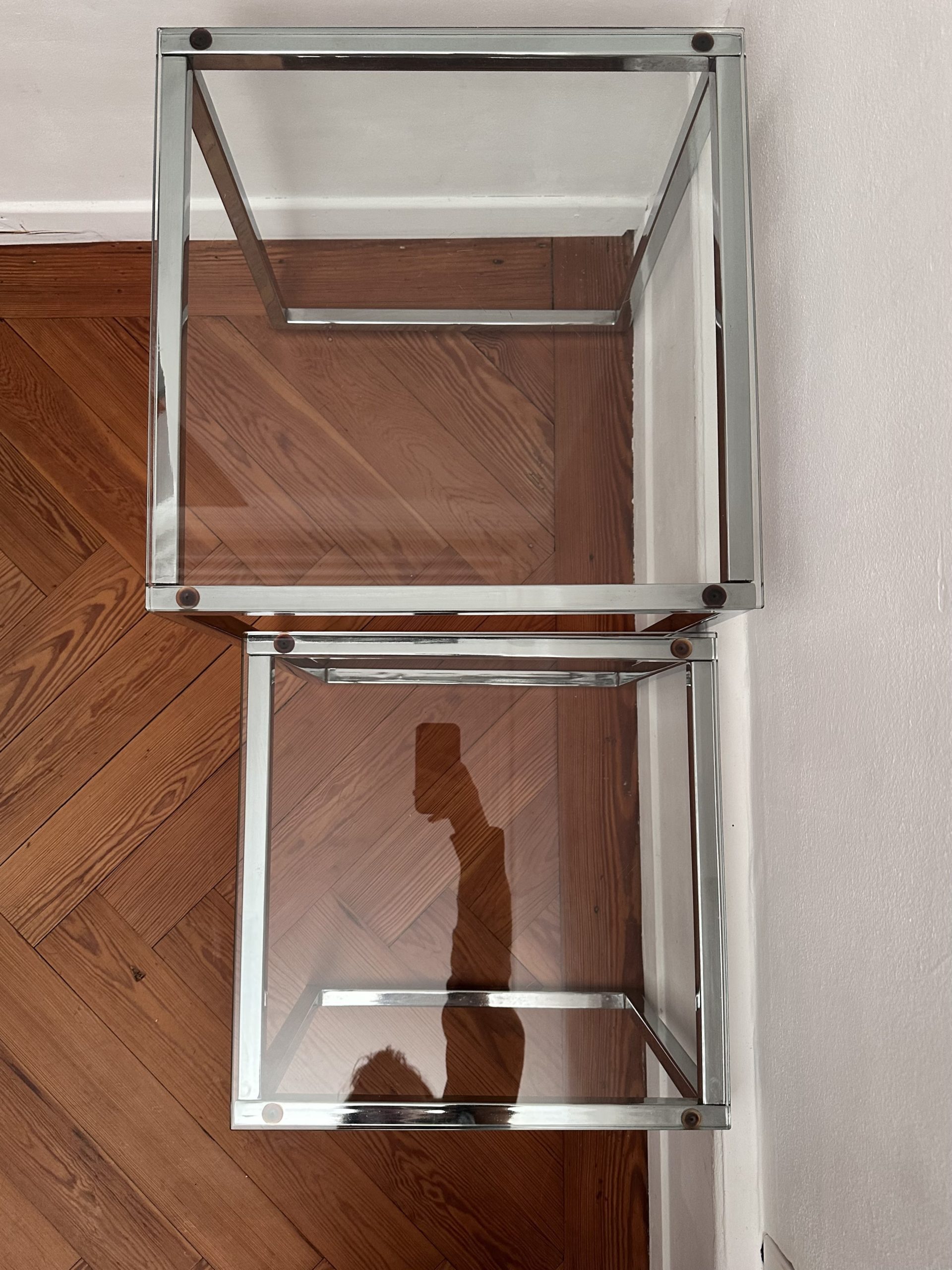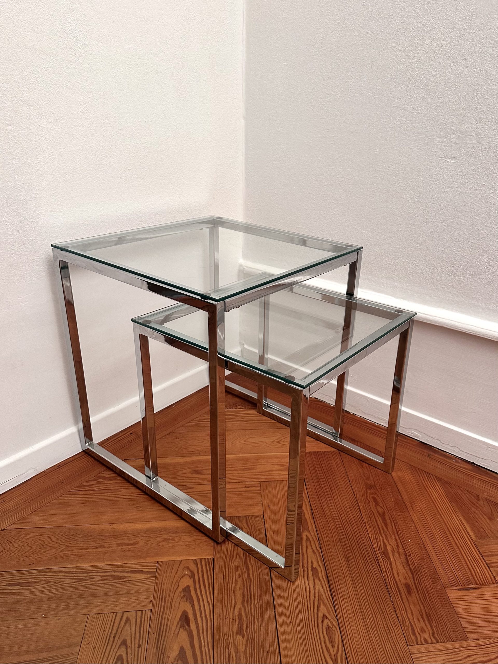 Très belle paire de tables gigognes carrées vintage des années 1980, structure en acier chromé et plateaux en verre transparent. Verre aux bords polis et biseautés, avec petites ventouses de maintien aux angles, permettant de caler le plateau et d’éviter le contact direct verre sur métal.