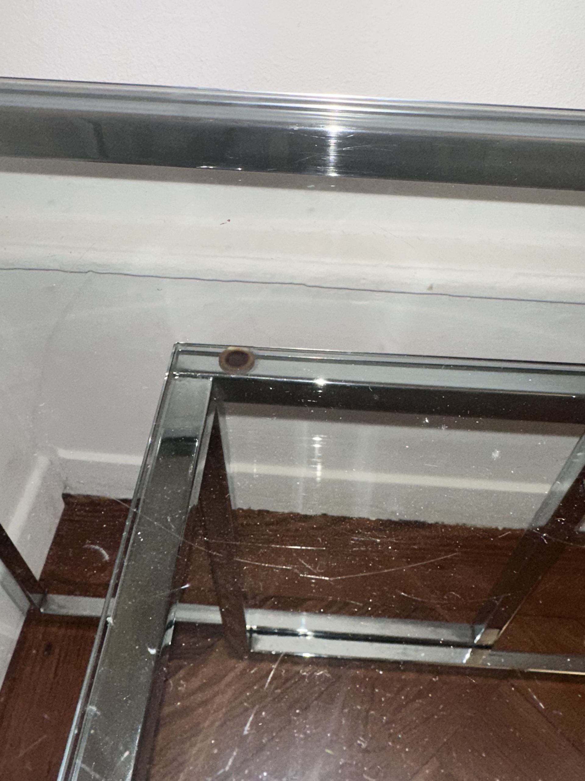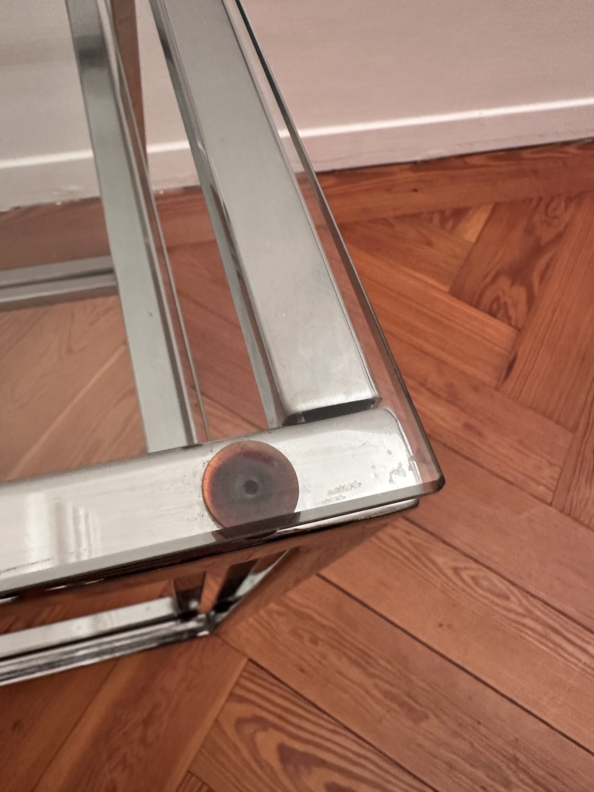 Bon état général.Sur la grande table, une griffure d’environ 12 cm sur le verre, assez légère et peu visible. Quelques petits signes d’âge, avec piqûres ponctuelles sur le chrome. Ensemble stable et totalement fonctionnel.