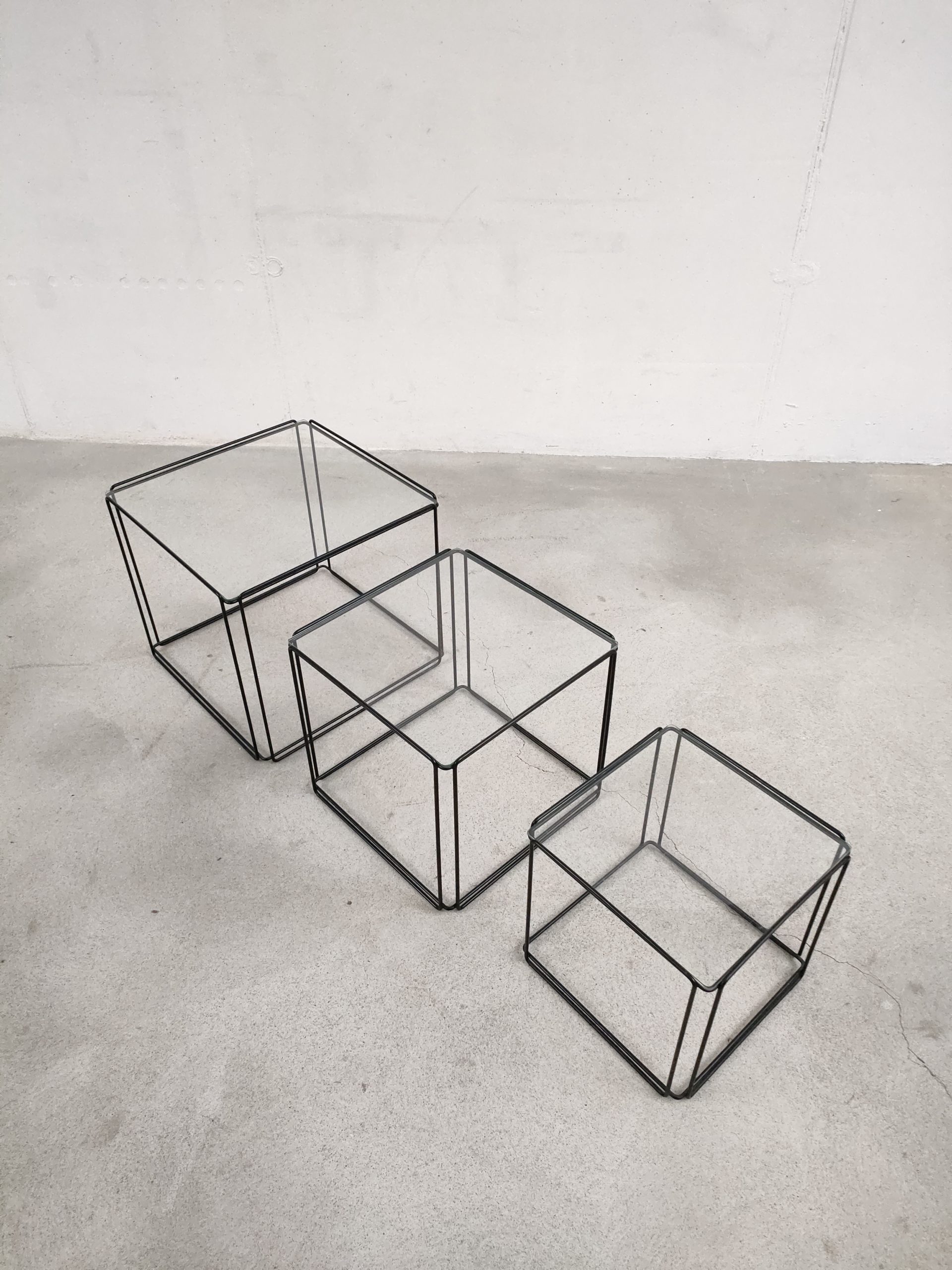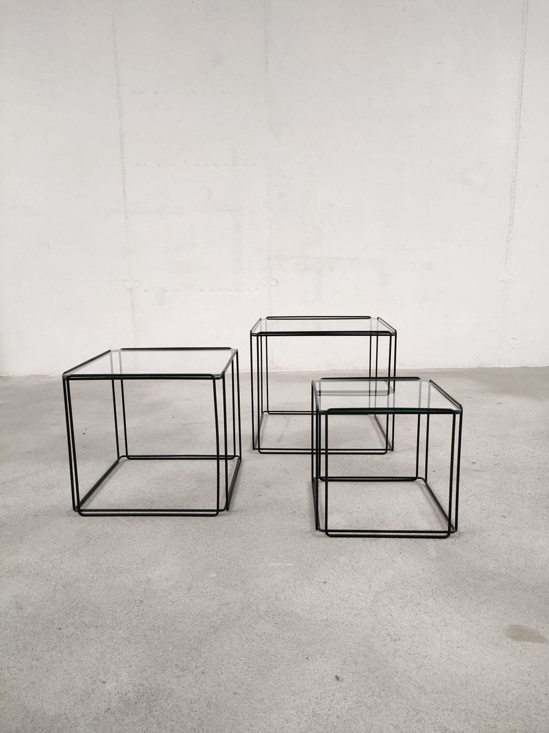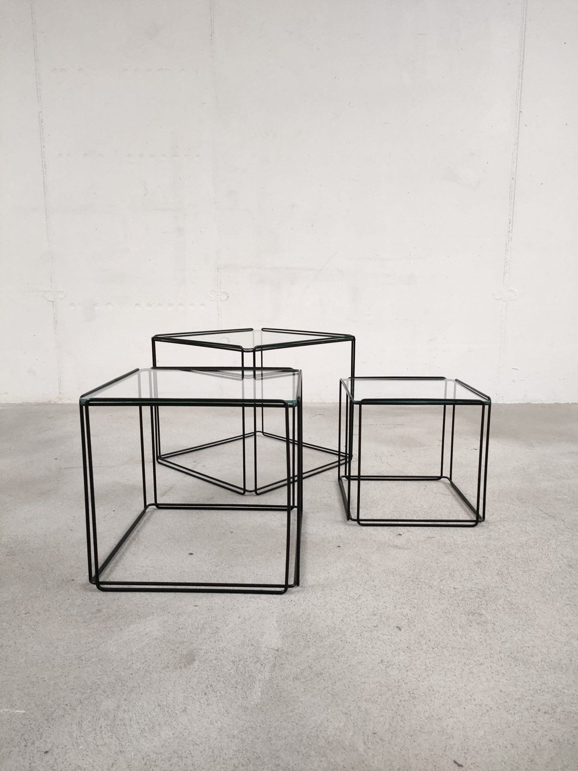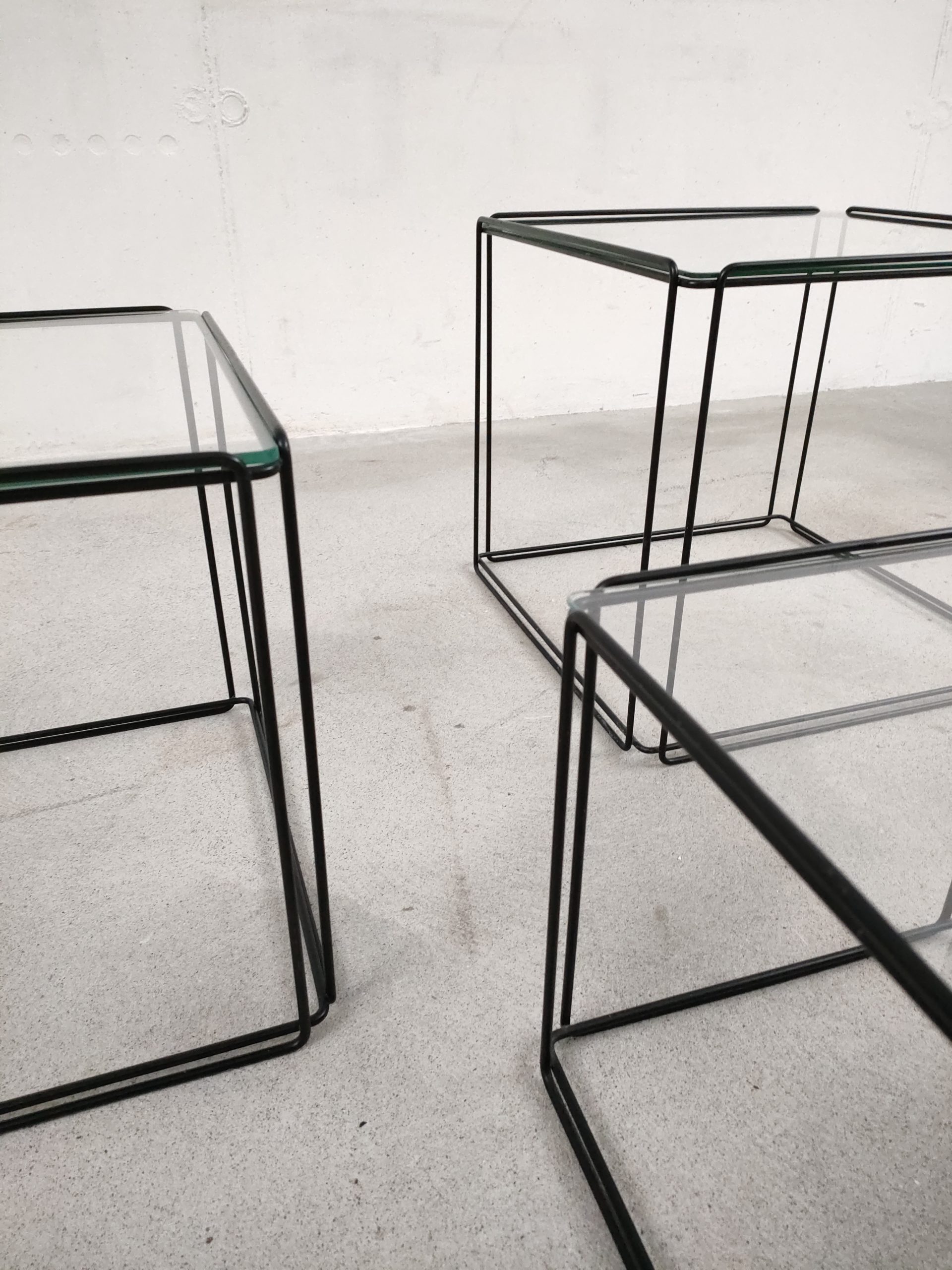 Produit venduSérie de trois tables gigognes Isocèle de Max Sauze avec piétements en métal noir et plateaux en verre aux bords arrondis. Sur le plus petit plateau en verre des rayures sont présentes (difficiles à montrer en photo). Le plateau moyen a été remplacé par l’ancien propriétaire et il est légèrment plus épais que les deux autres.