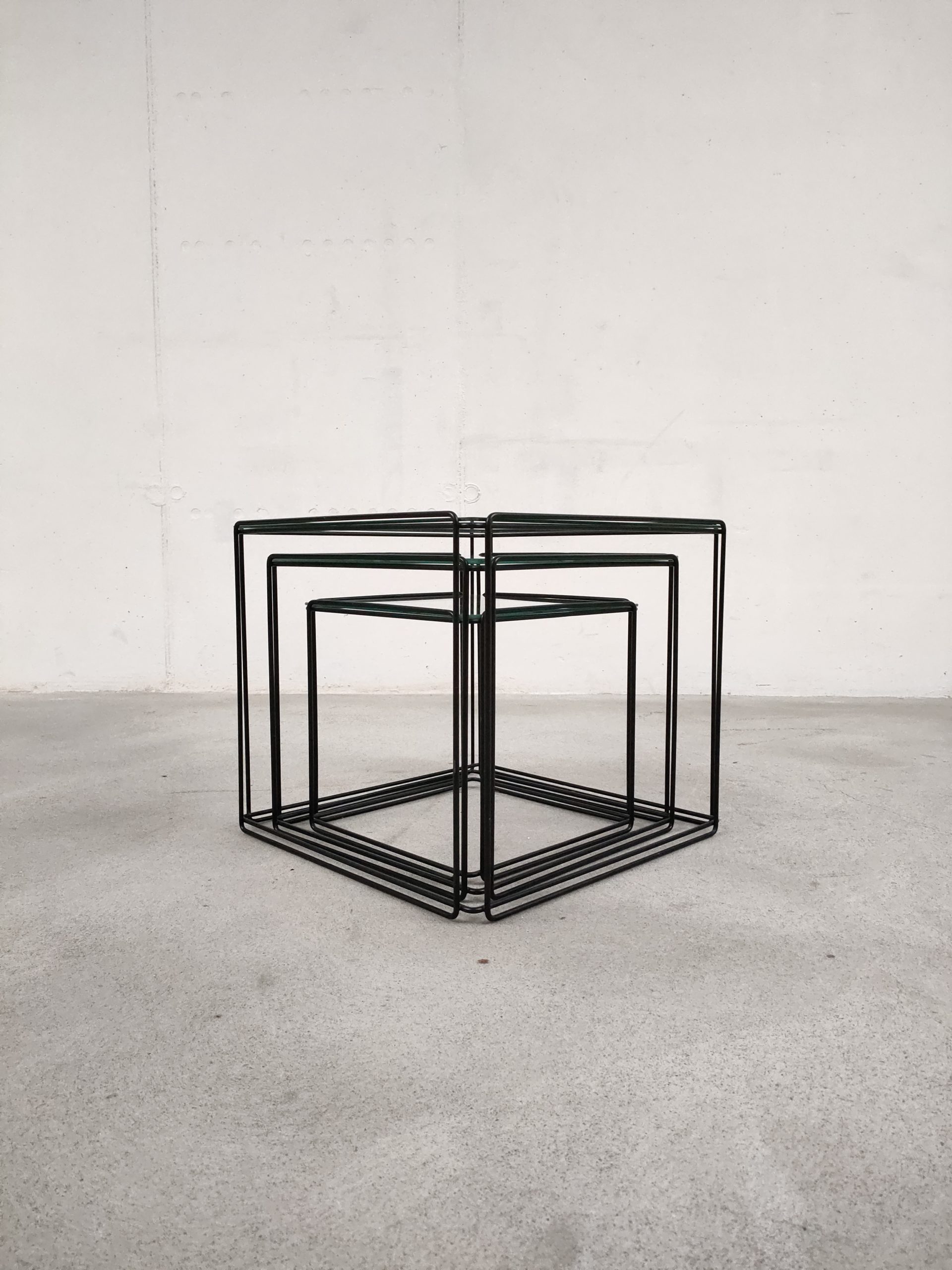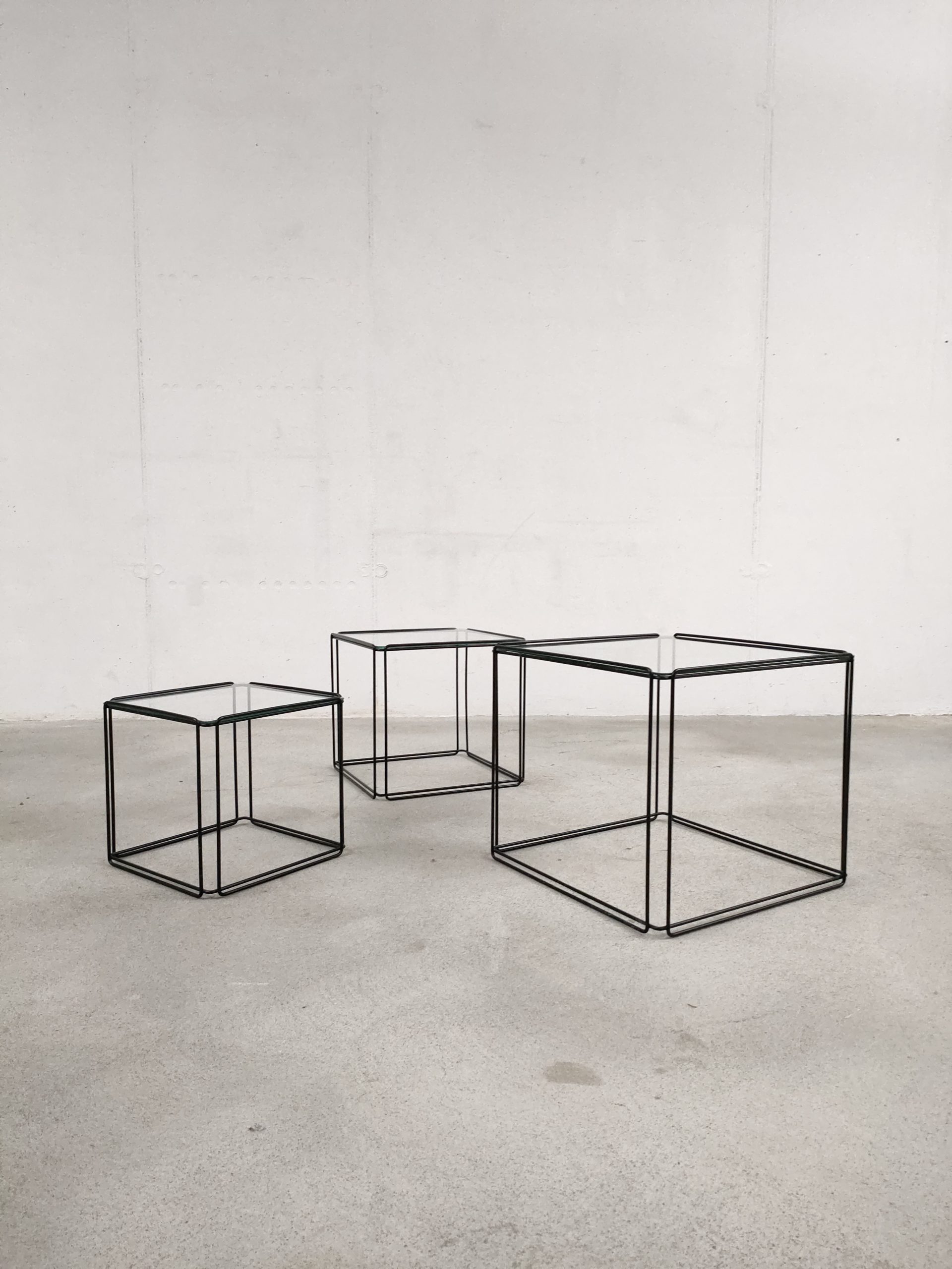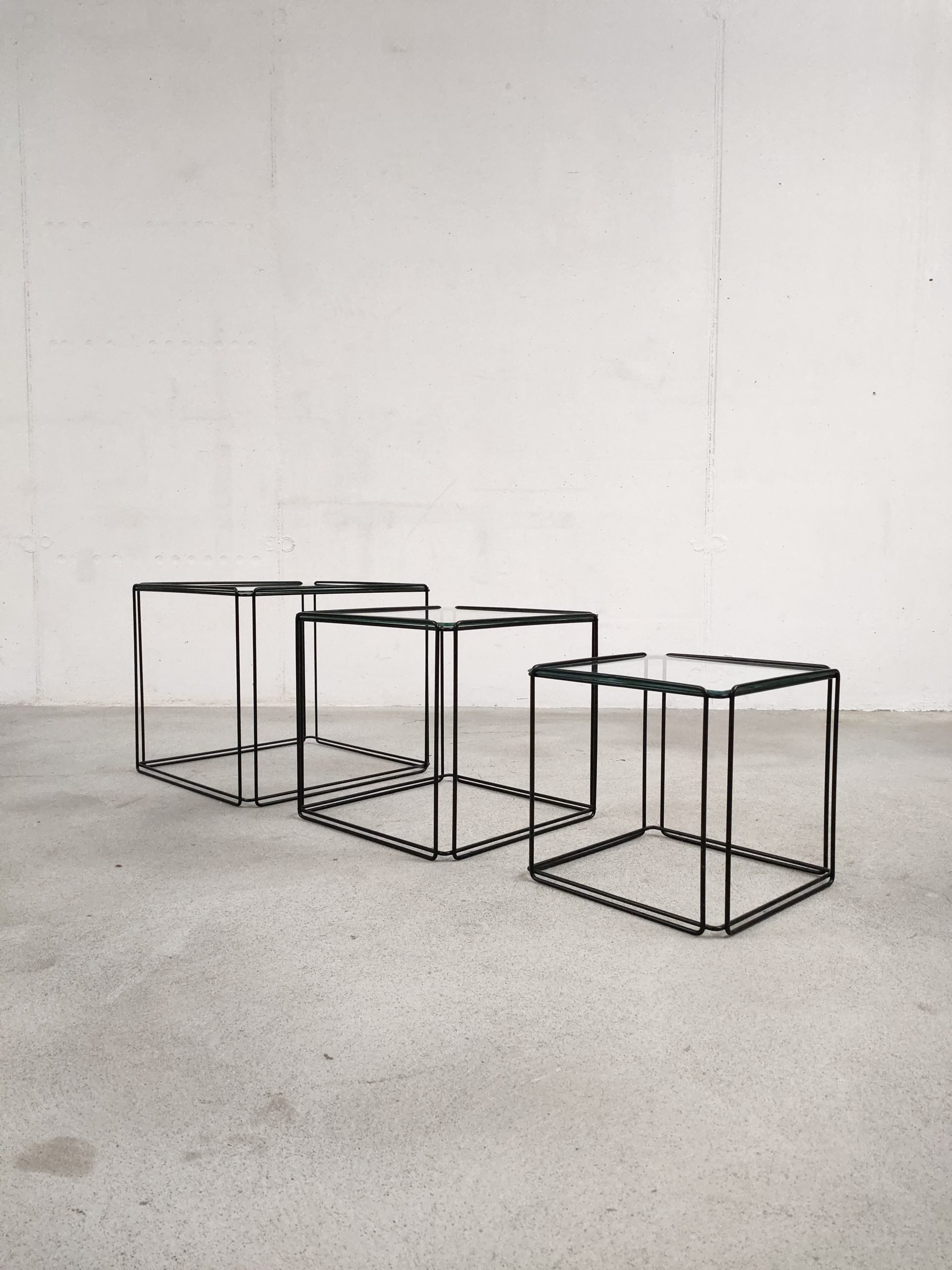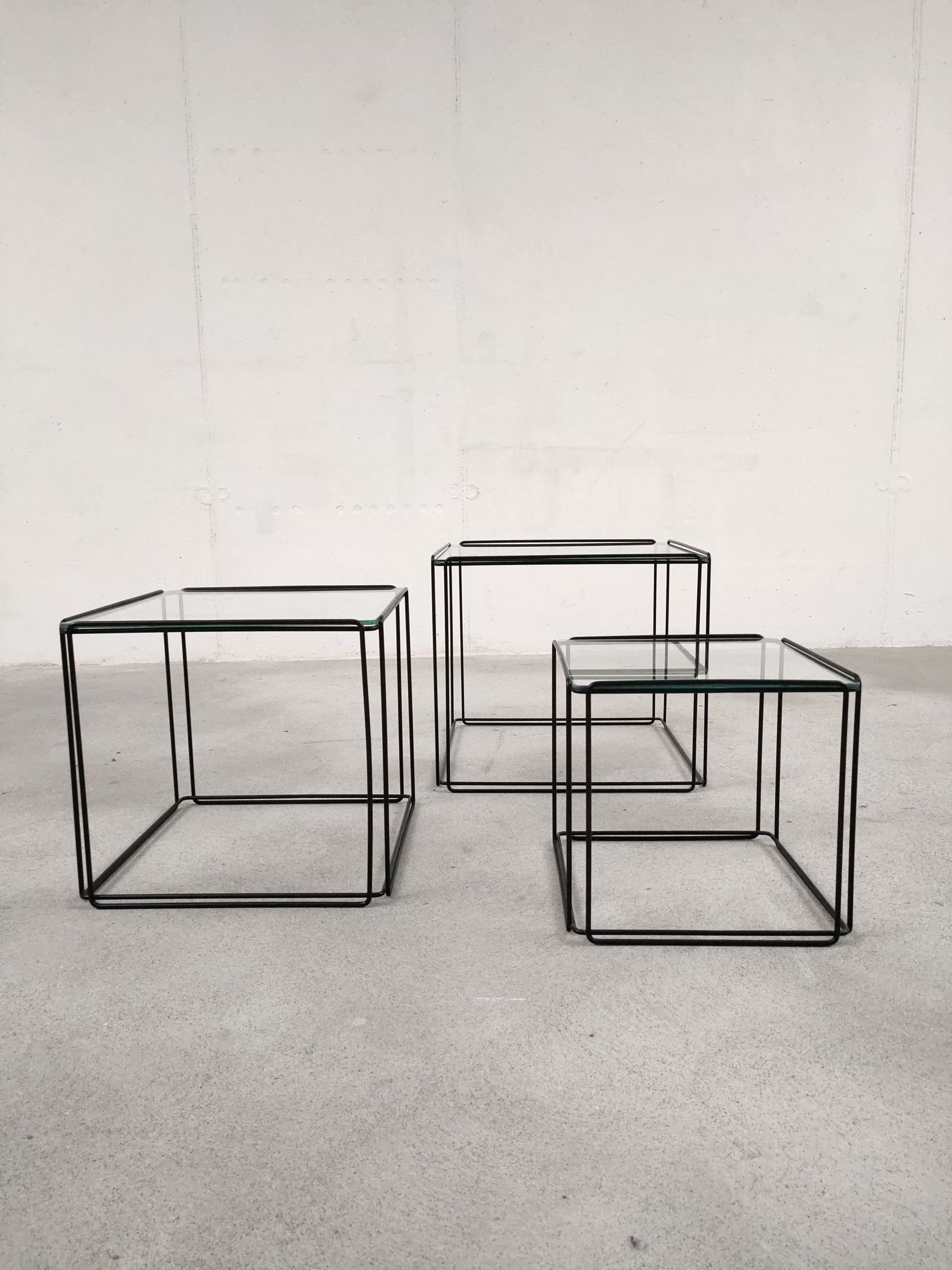 Produit venduSérie de trois tables gigognes Isocèle de Max Sauze avec piétements en métal noir et plateaux en verre aux bords arrondis. Sur le plus petit plateau en verre des rayures sont présentes (difficiles à montrer en photo). Le plateau moyen a été remplacé par l’ancien propriétaire et il est légèrment plus épais que les deux autres.