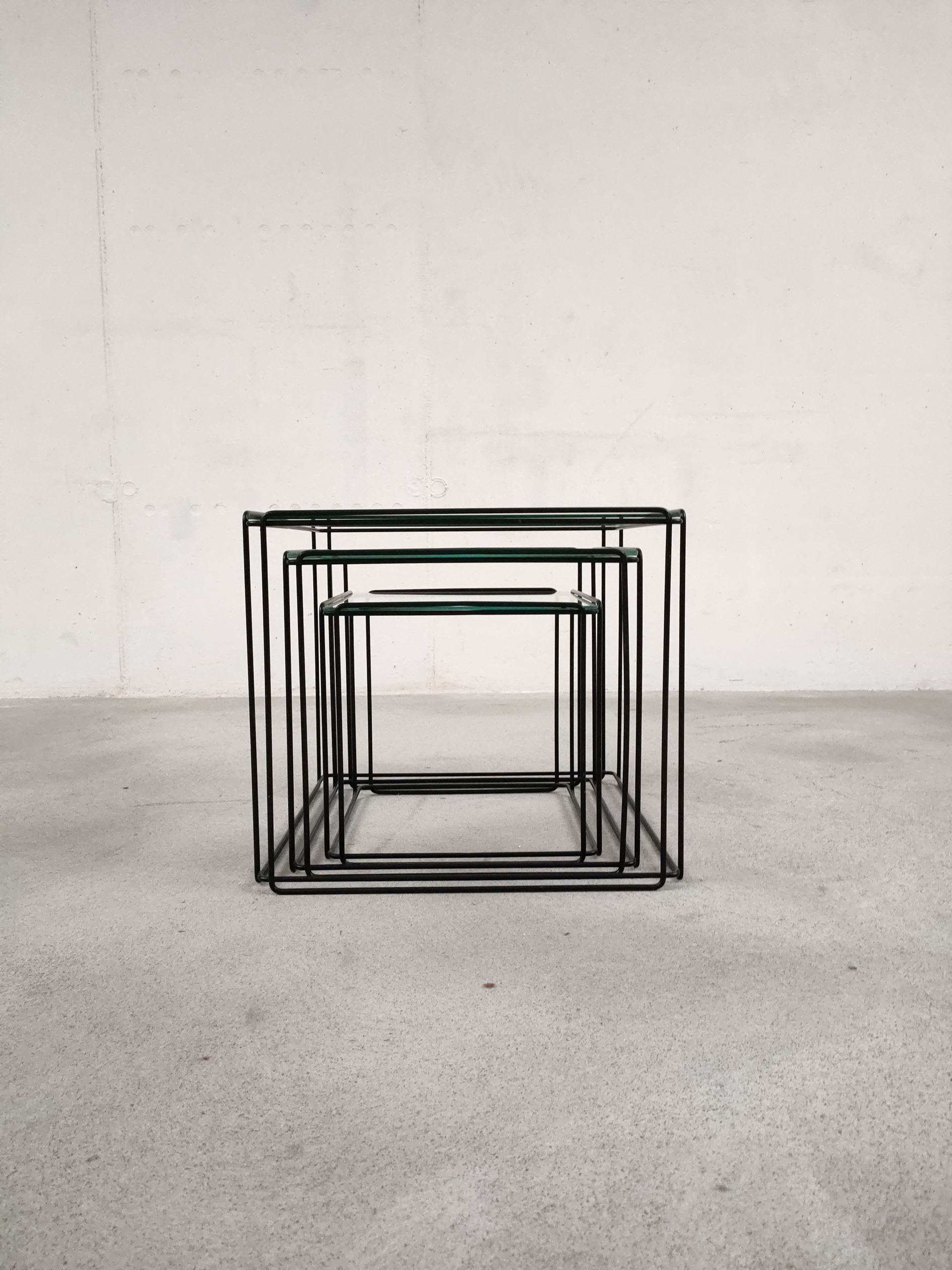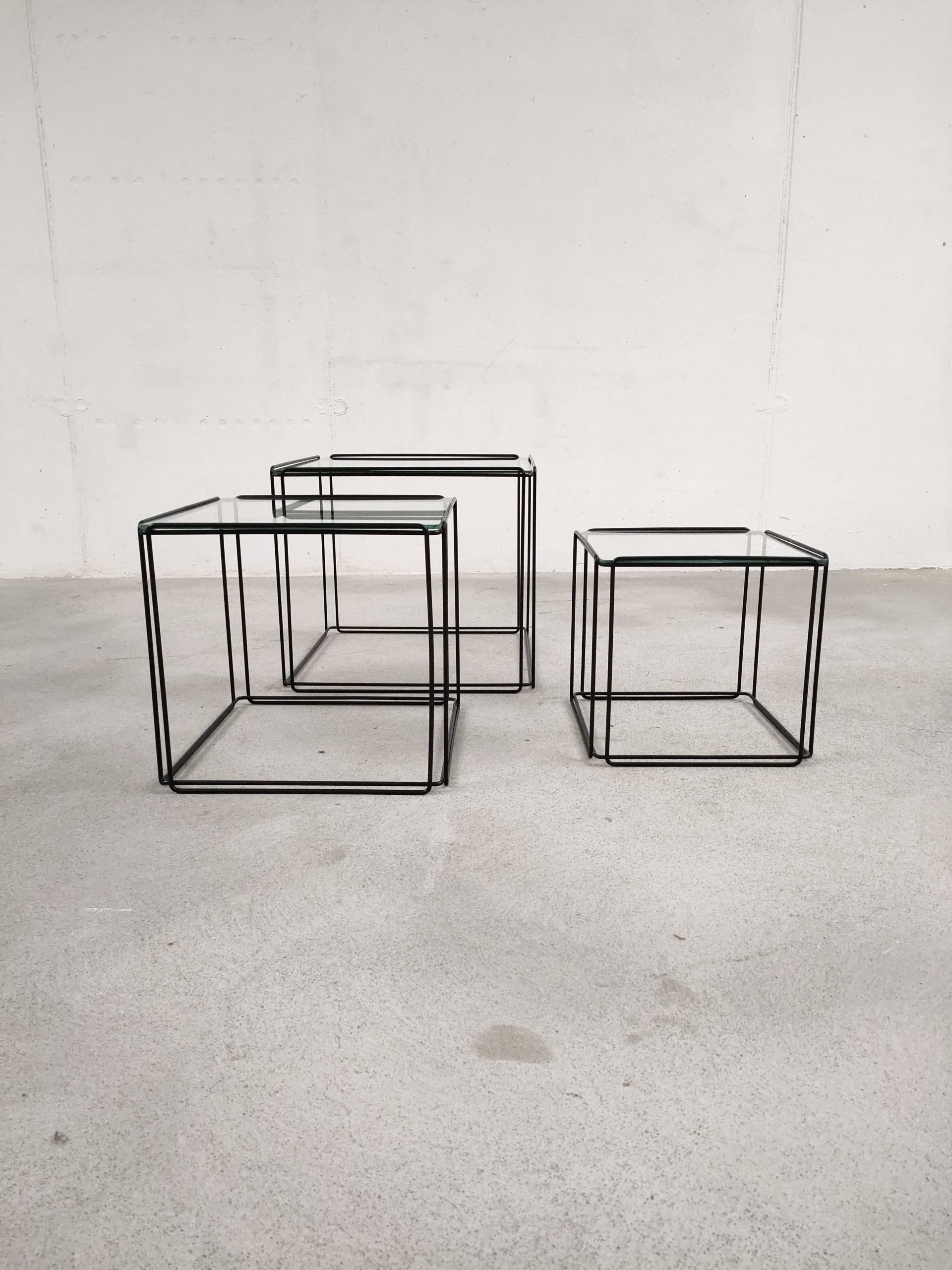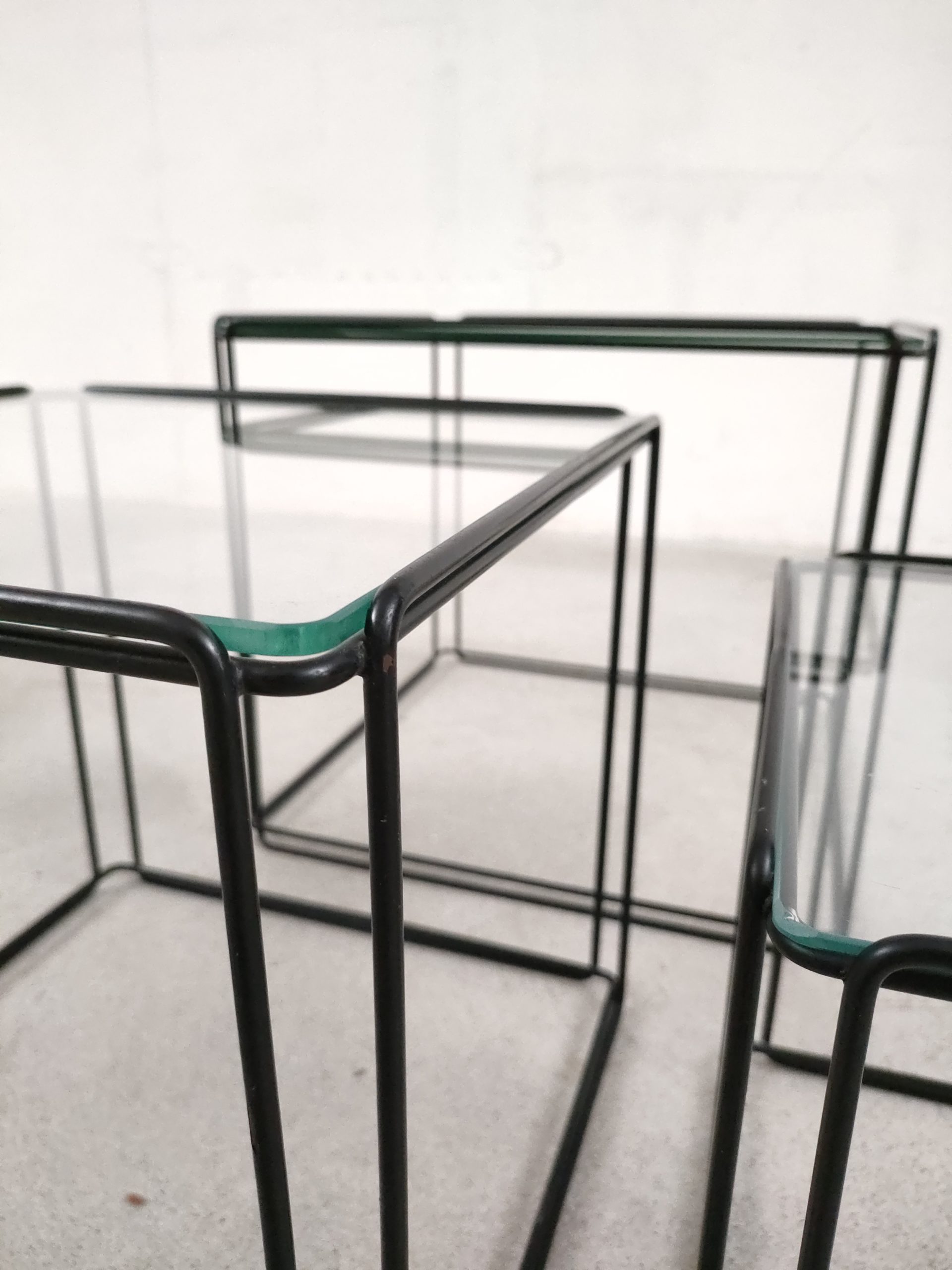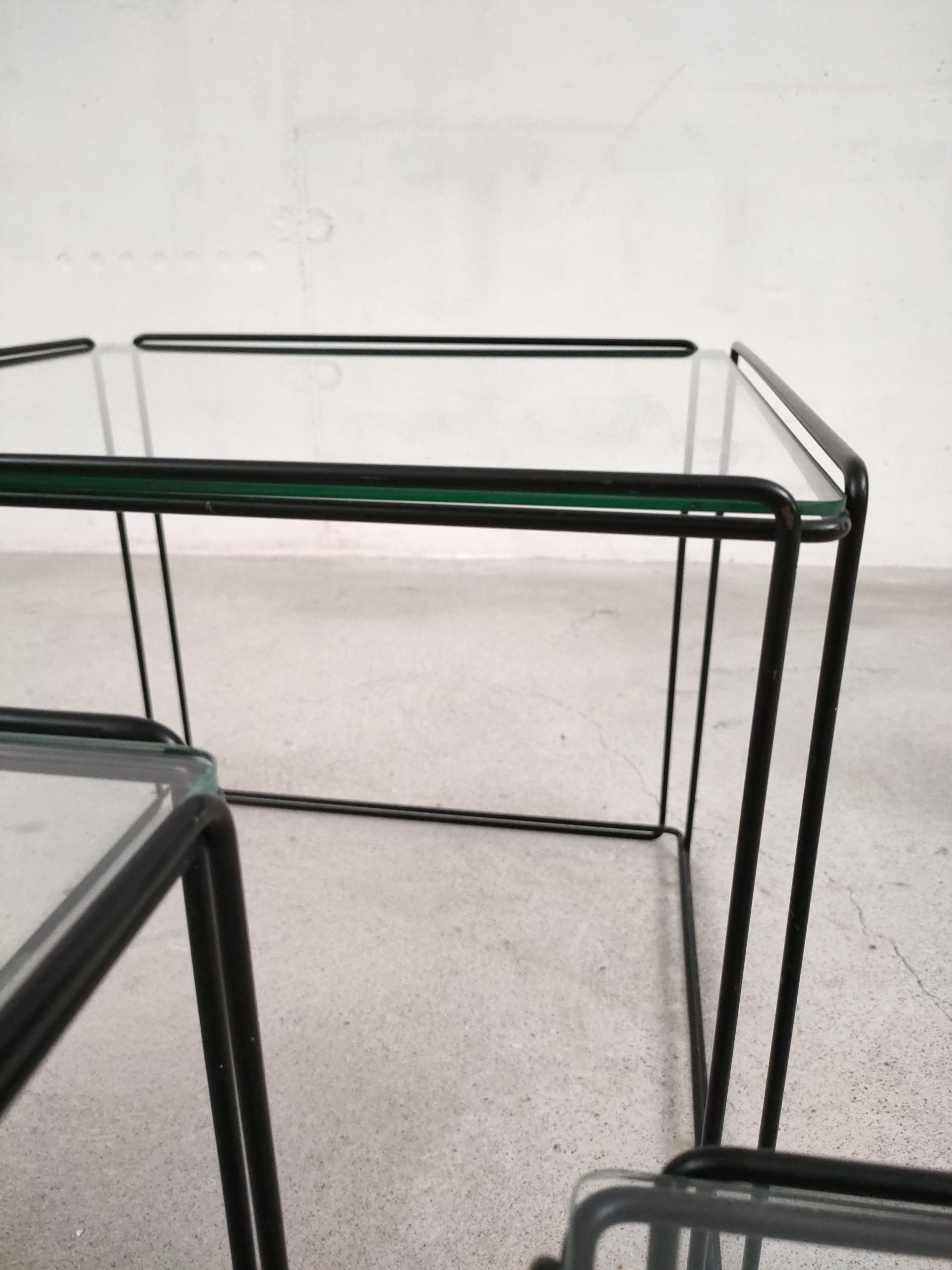 Série de trois tables gigognes Isocèle de Max Sauze avec piétements en métal noir et plateaux en verre aux bords arrondis. Sur le plus petit plateau en verre des rayures sont présentes (difficiles à montrer en photo). Le plateau moyen a été remplacé par l’ancien propriétaire et il est légèrment plus épais que les deux autres.