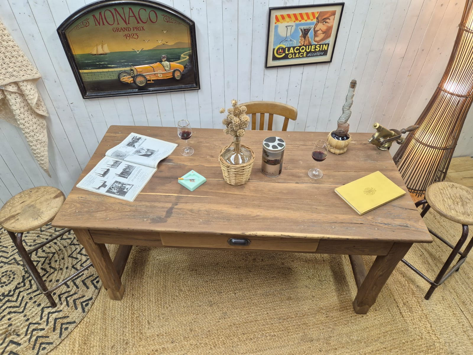 Jolie et très ancienne table de ferme. Entièrement restaurée, elle dispose d’un grand tiroir centrale avec sa belle poignée coquille. Très joli travail du temps sur l’ensemble, piètement chevillé.
