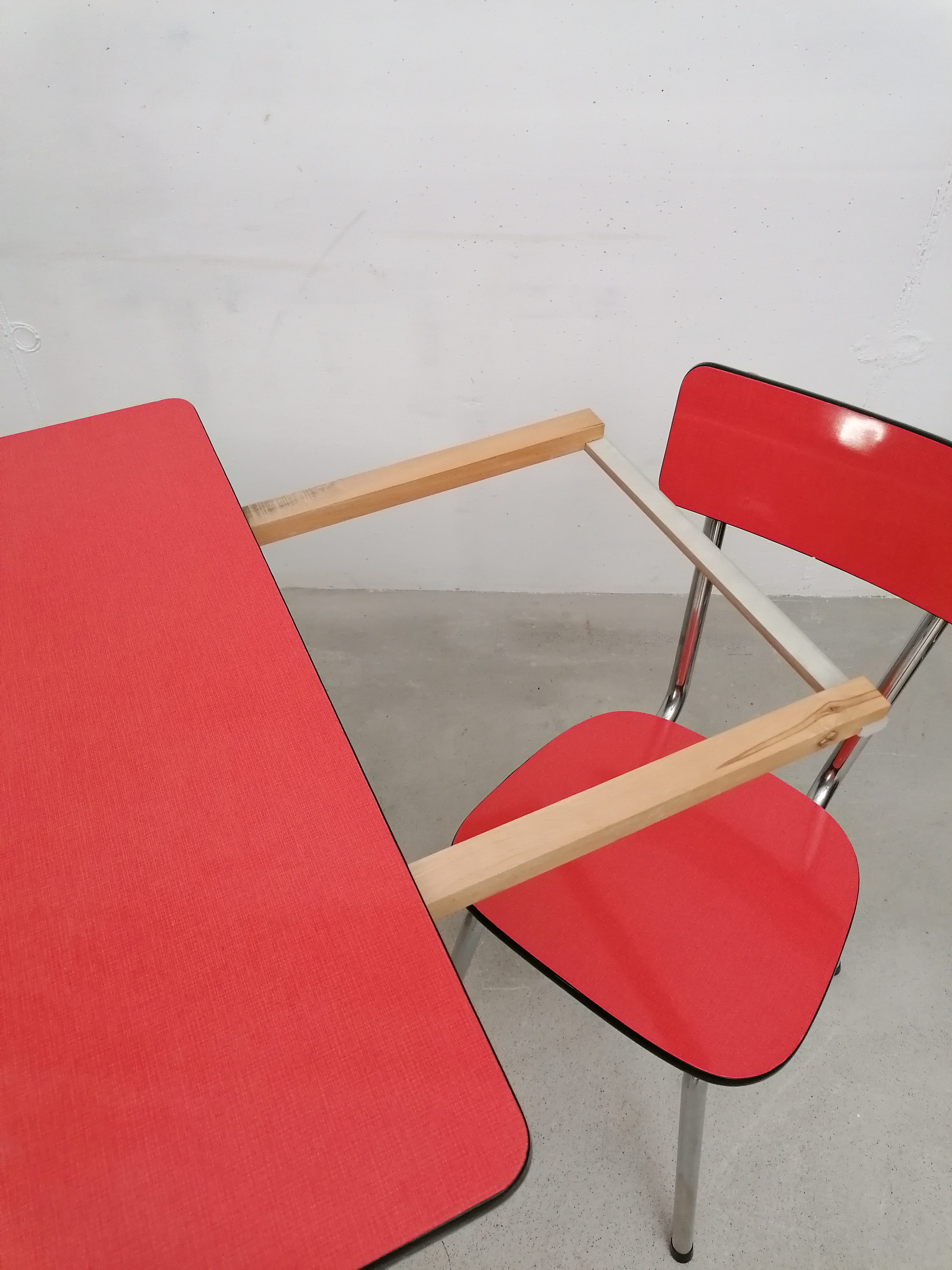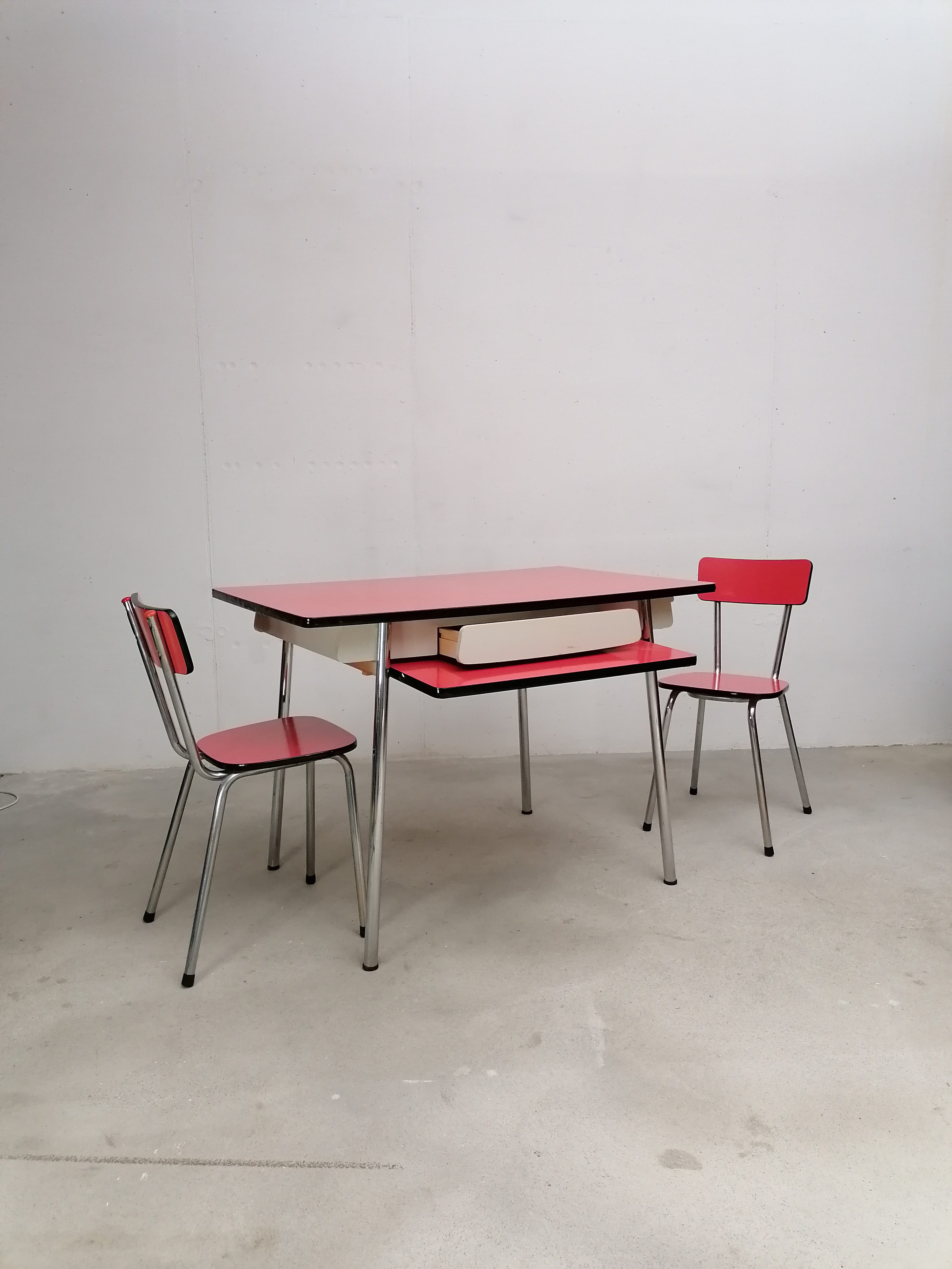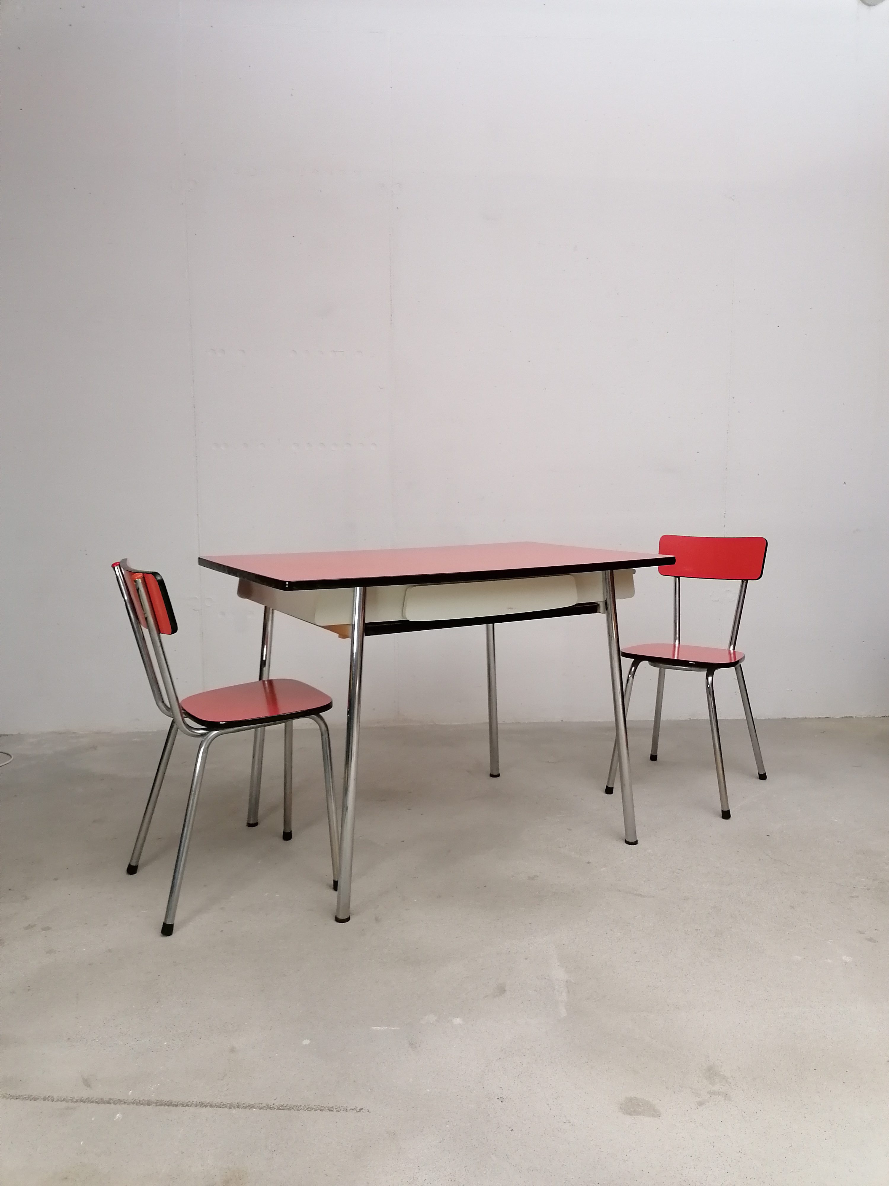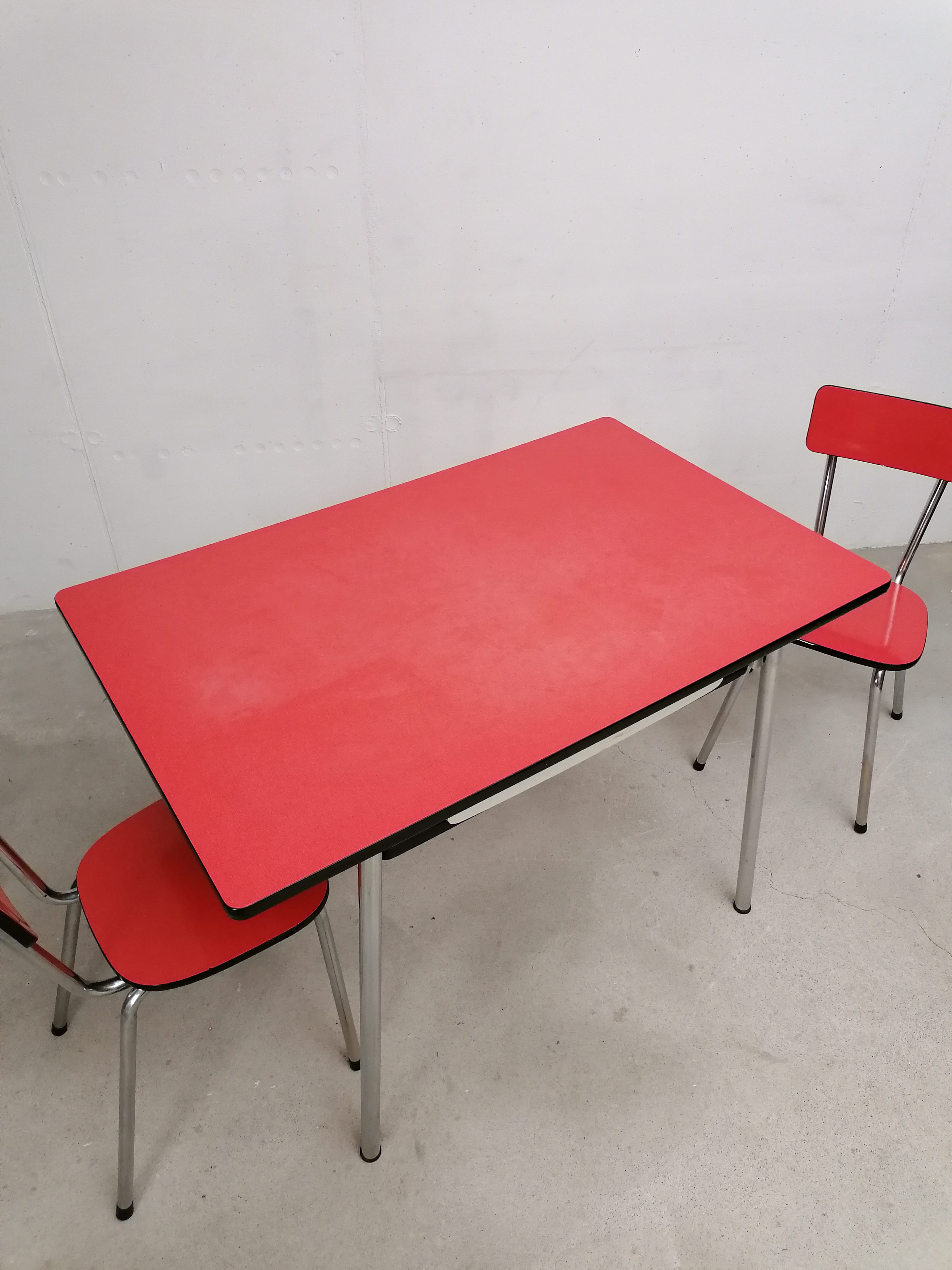 Produit venduEnsemble vintage en formica rouge. Deux chaises avec structure en métal et assise et dossier en formica rouge. Quelques traces d’usure sur le métal (voir photos) mais stable et solide et formica en très bon état. Table avec tiroir et une rallonge de 40 cm caché sous le plateau. Dotée d’un tiroir également sous le plateau. À signaler une décoloration de la couleur rouge visible sur le plateau visible sur les photos.