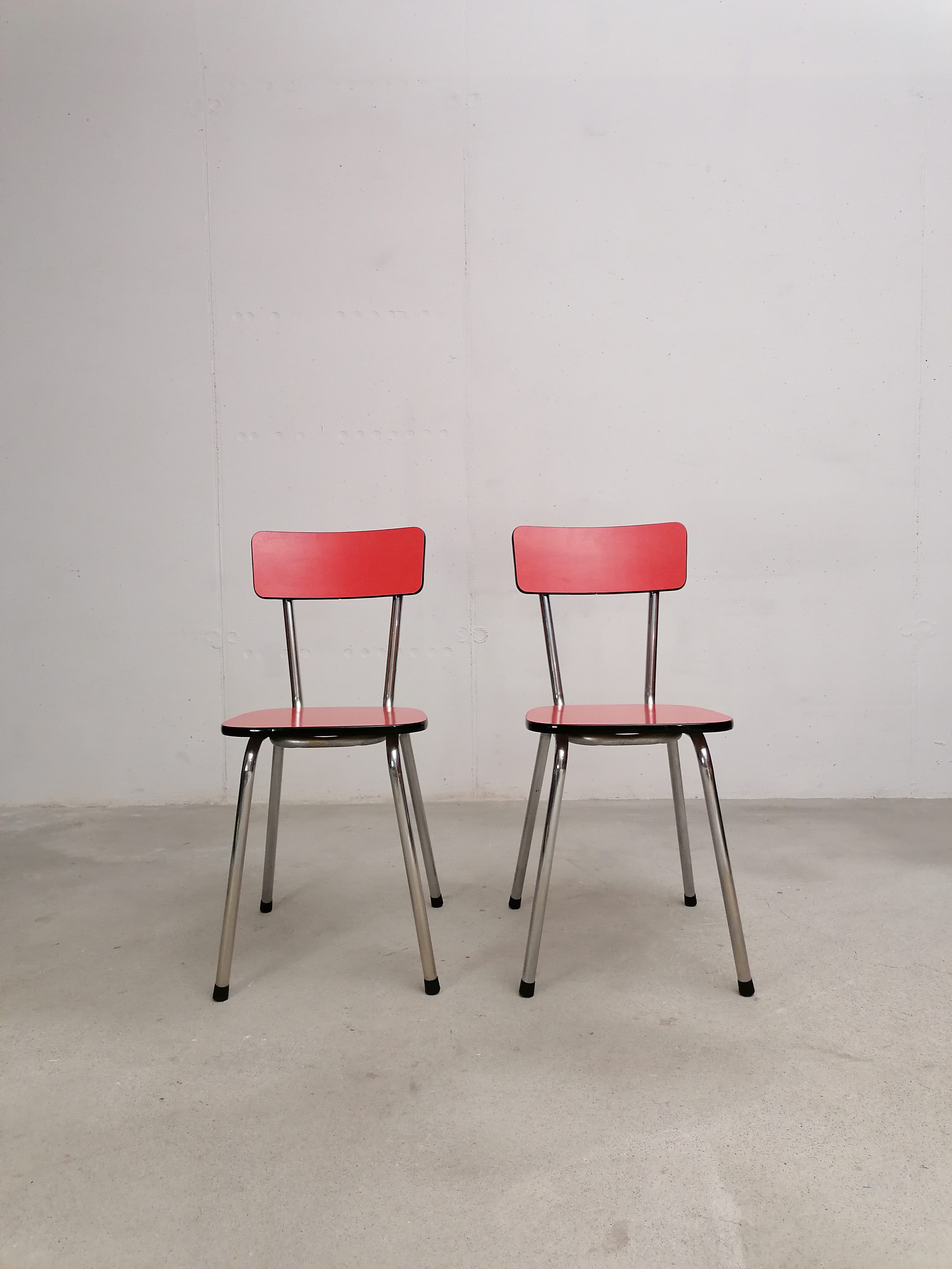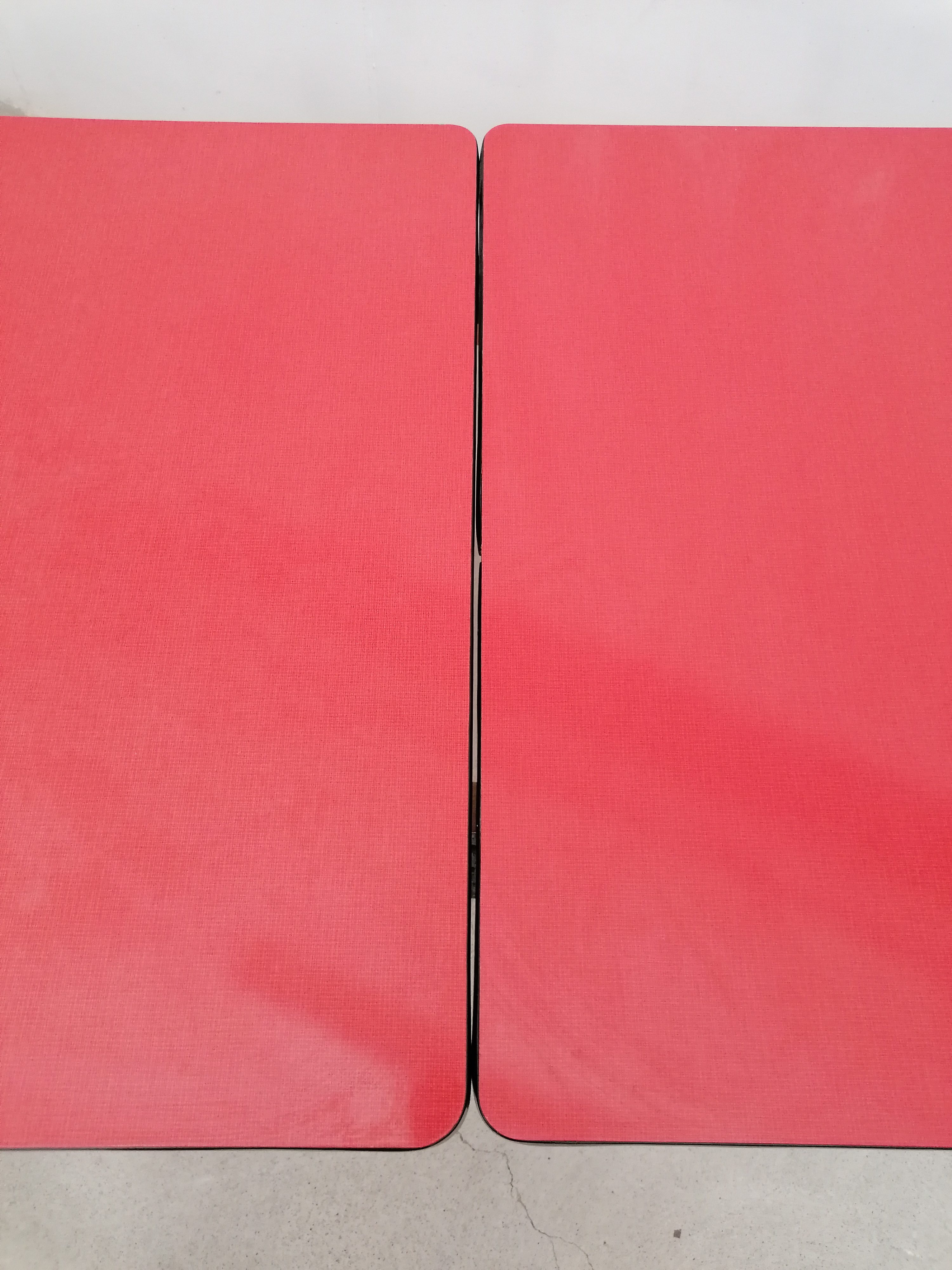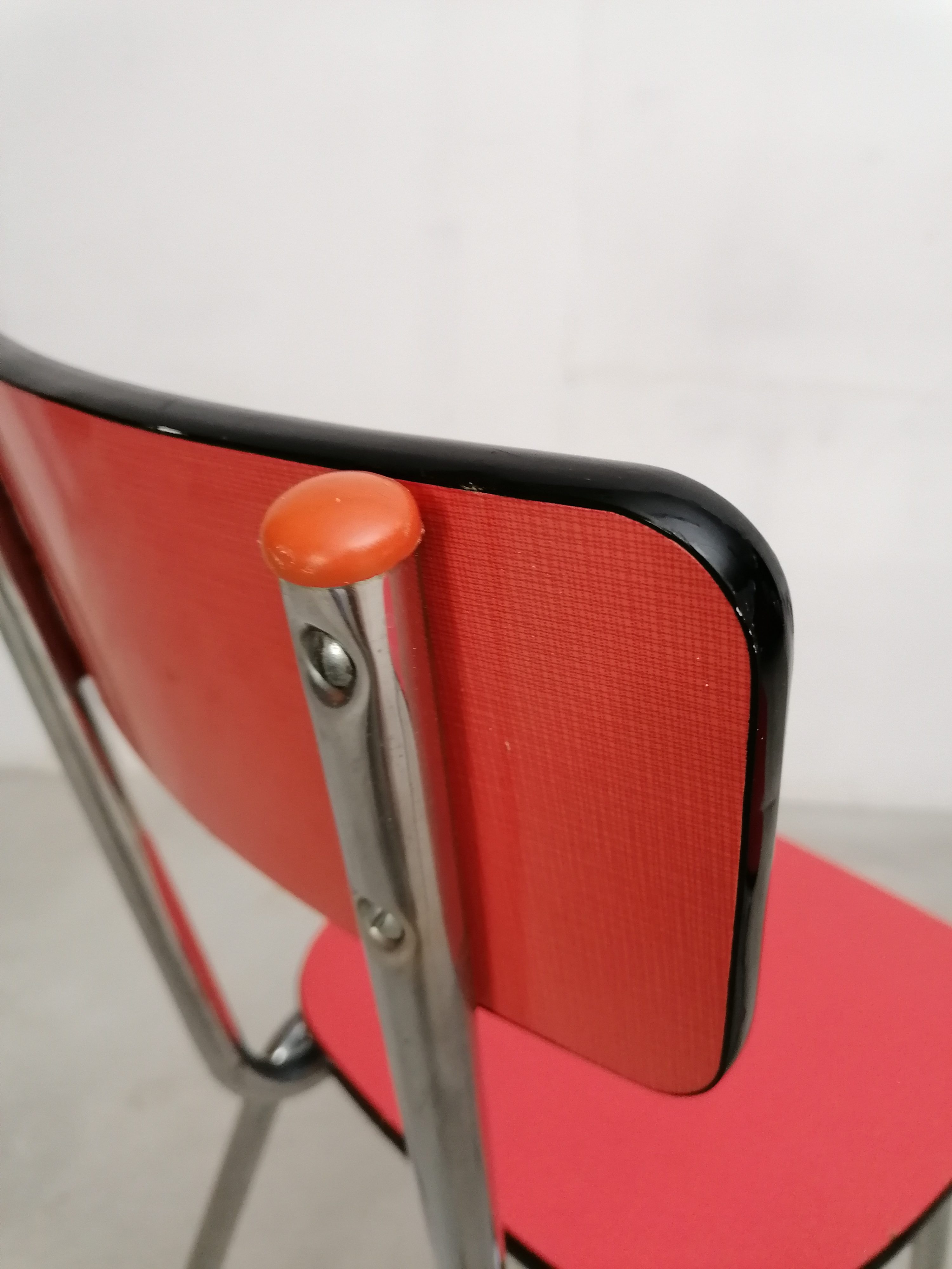 Produit venduEnsemble vintage en formica rouge. Deux chaises avec structure en métal et assise et dossier en formica rouge. Quelques traces d’usure sur le métal (voir photos) mais stable et solide et formica en très bon état. Table avec tiroir et une rallonge de 40 cm caché sous le plateau. Dotée d’un tiroir également sous le plateau. À signaler une décoloration de la couleur rouge visible sur le plateau visible sur les photos.