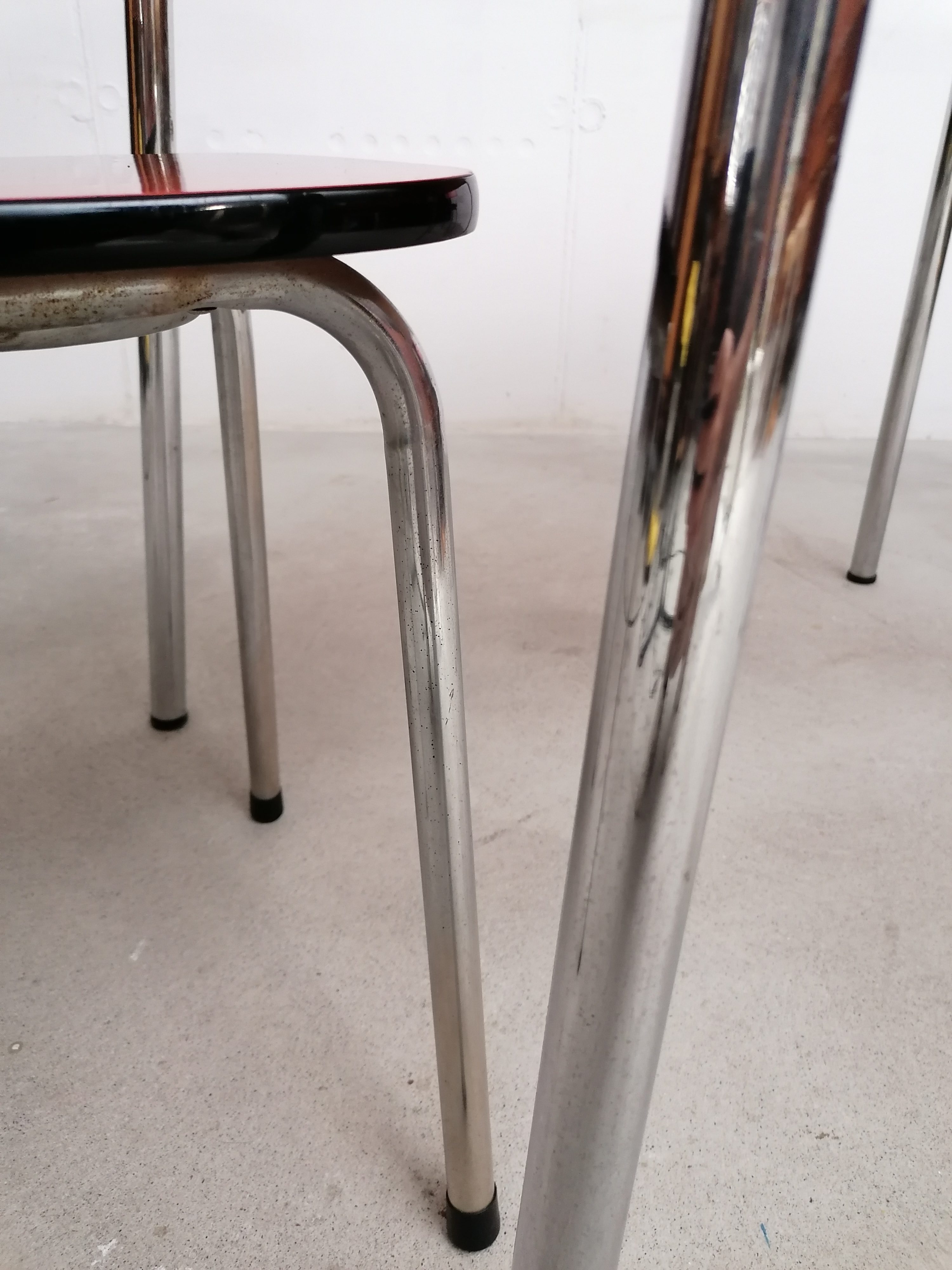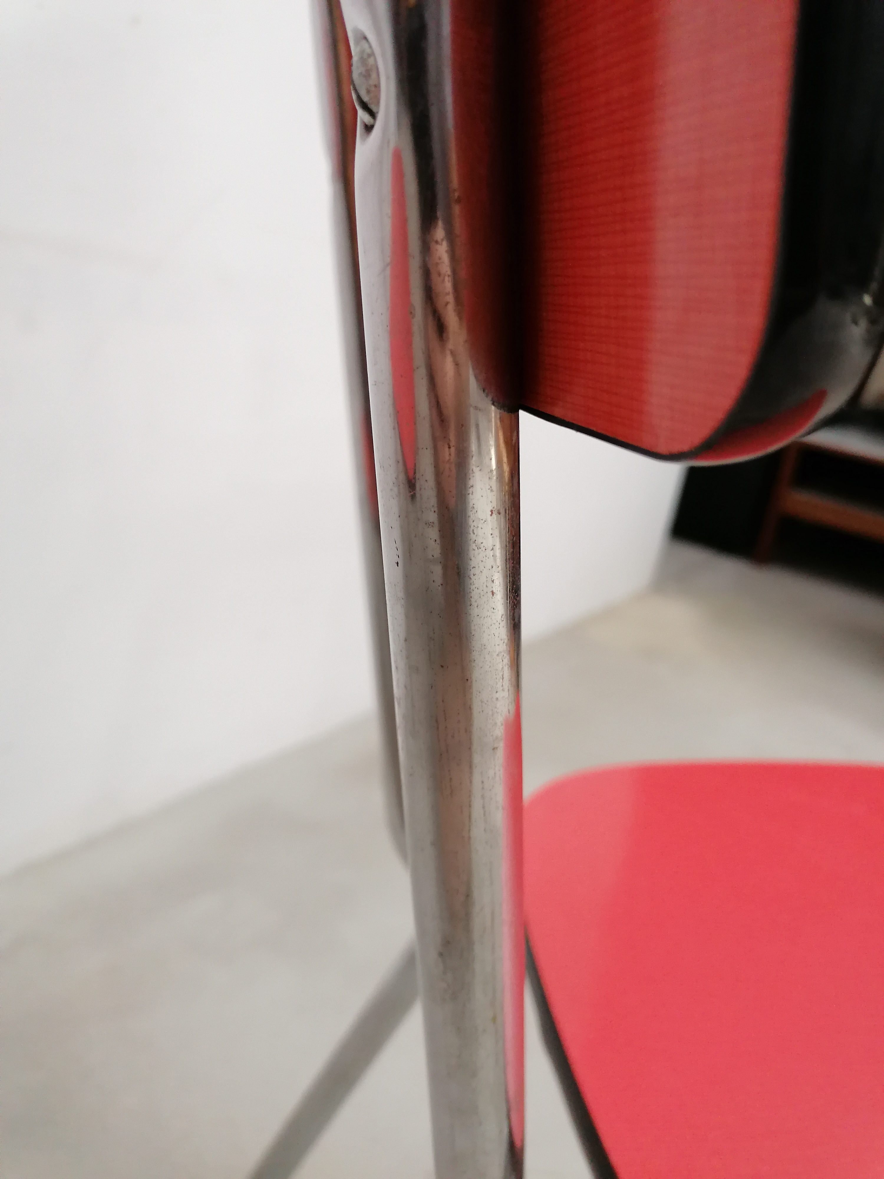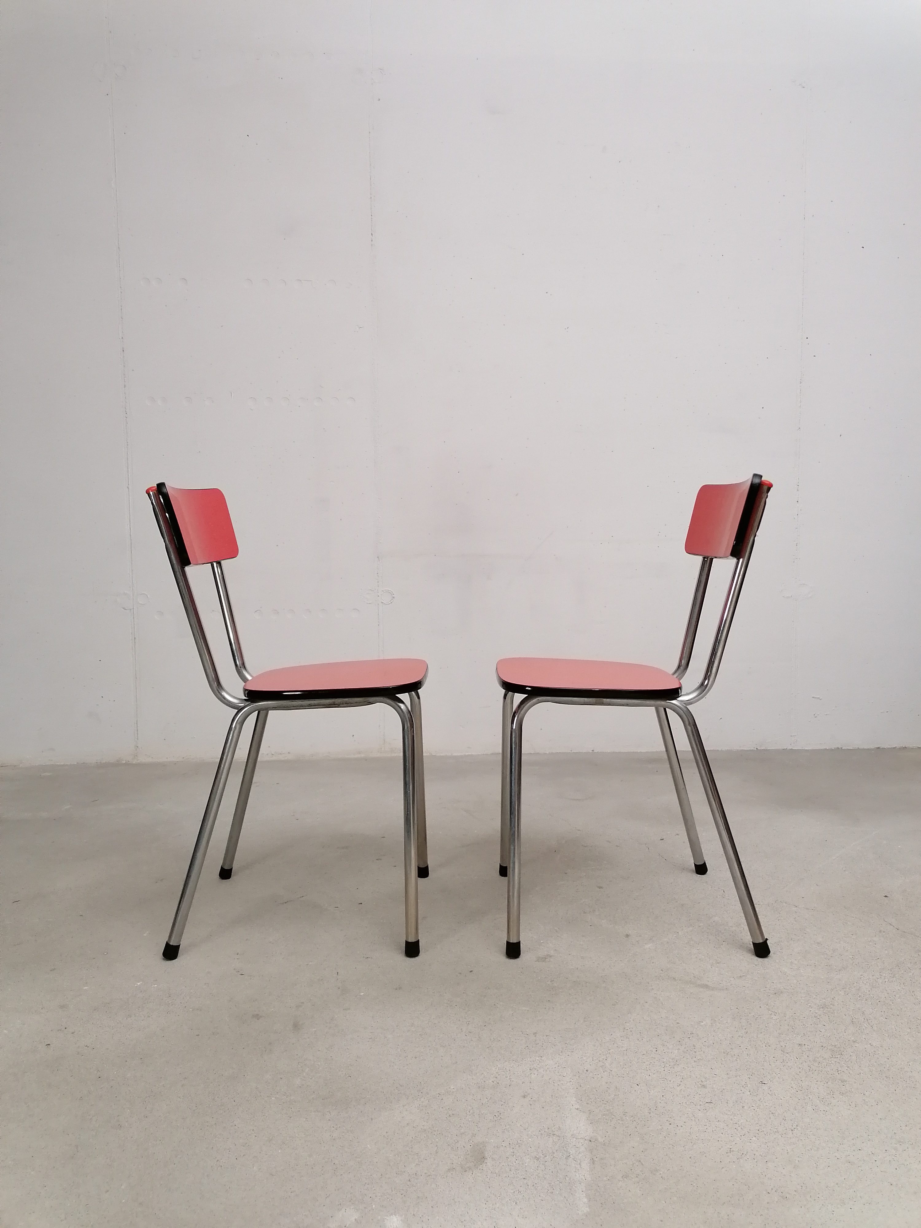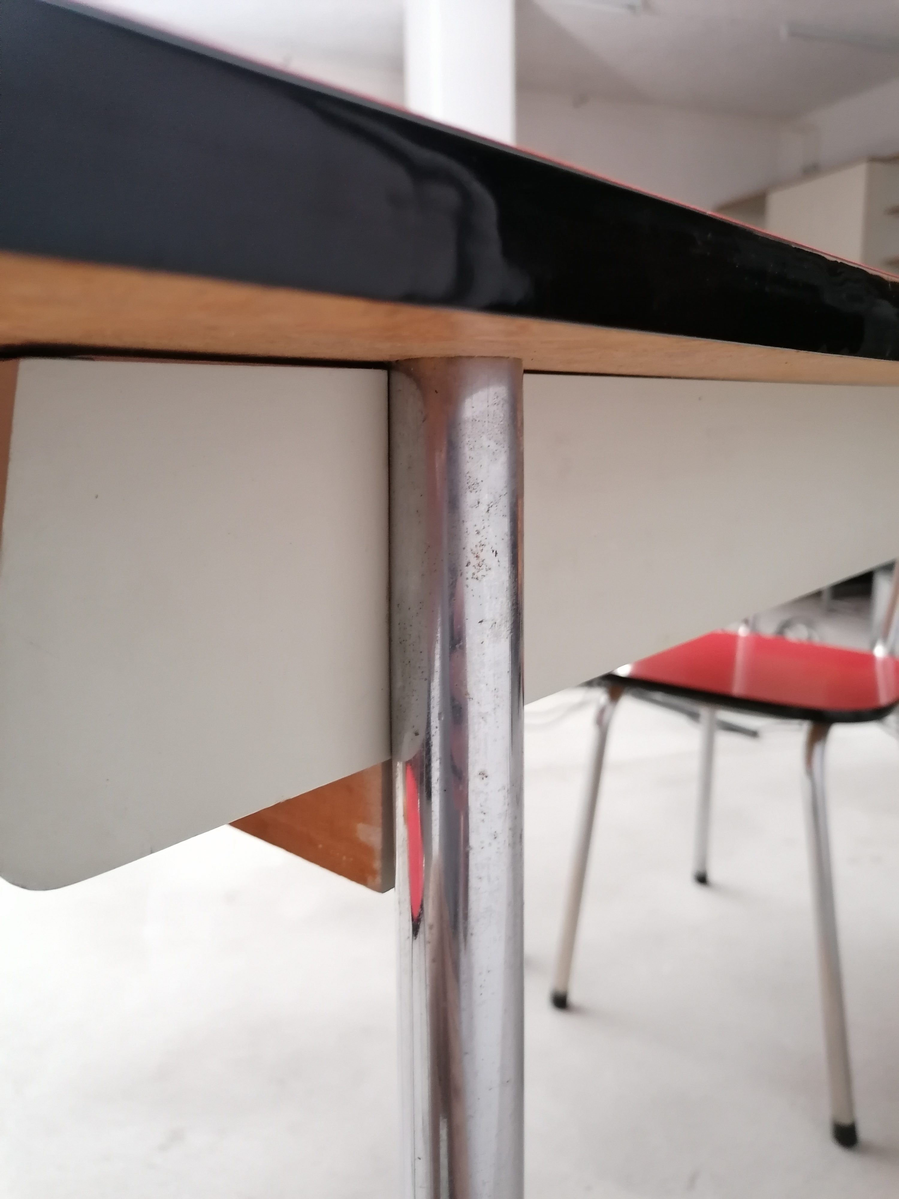 Produit venduEnsemble vintage en formica rouge. Deux chaises avec structure en métal et assise et dossier en formica rouge. Quelques traces d’usure sur le métal (voir photos) mais stable et solide et formica en très bon état. Table avec tiroir et une rallonge de 40 cm caché sous le plateau. Dotée d’un tiroir également sous le plateau. À signaler une décoloration de la couleur rouge visible sur le plateau visible sur les photos.