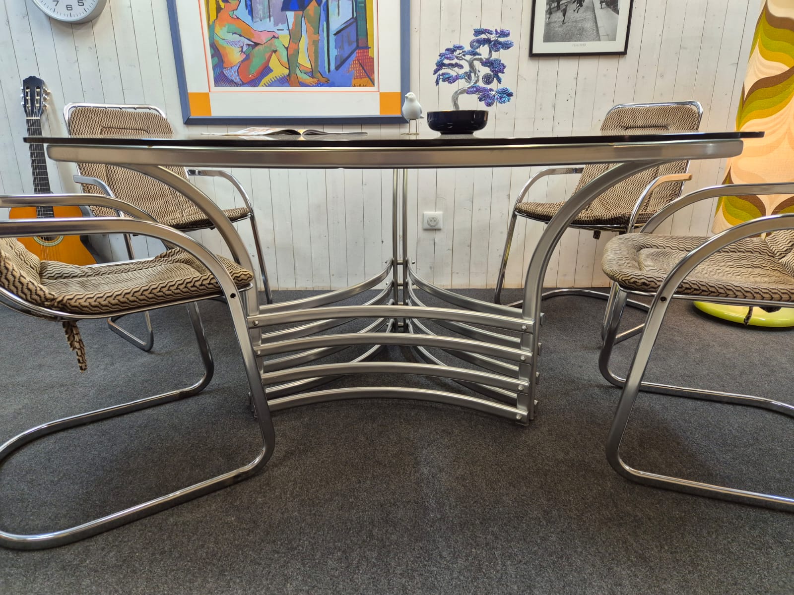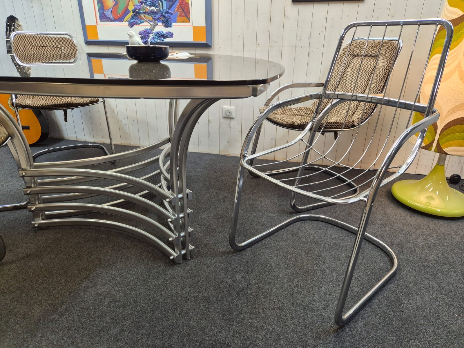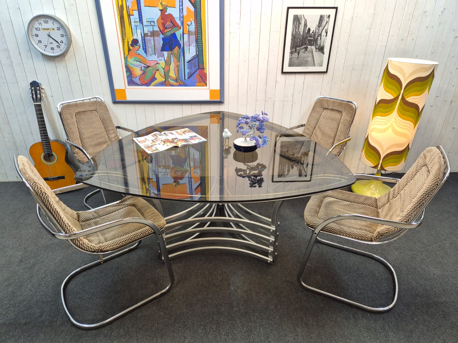 Très bel ensemble des années 70 composé d’une table triangulaire en verre fumé et chrome (Italie) et de 4 chaises cidue avec leurs galettes tissu d’origine.