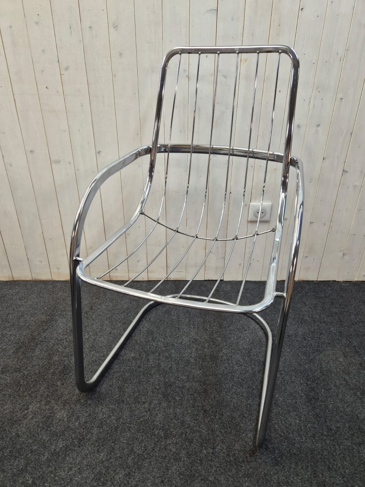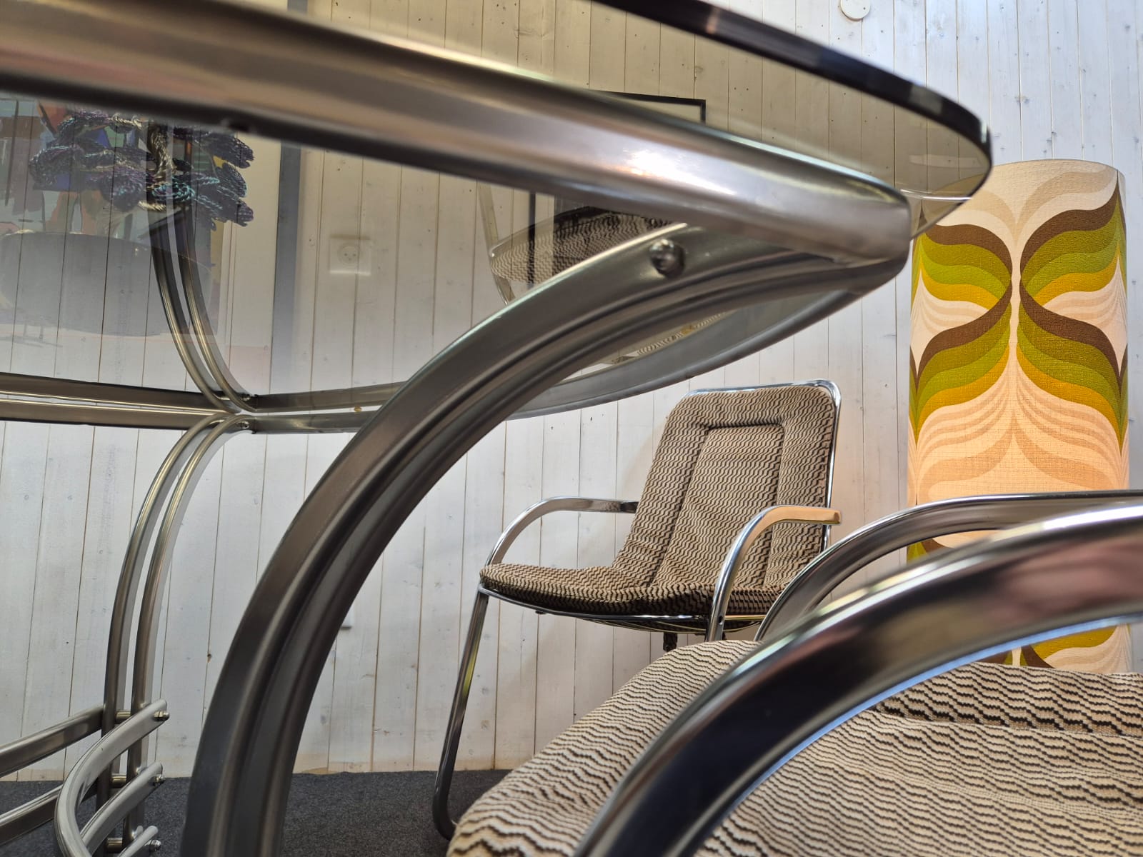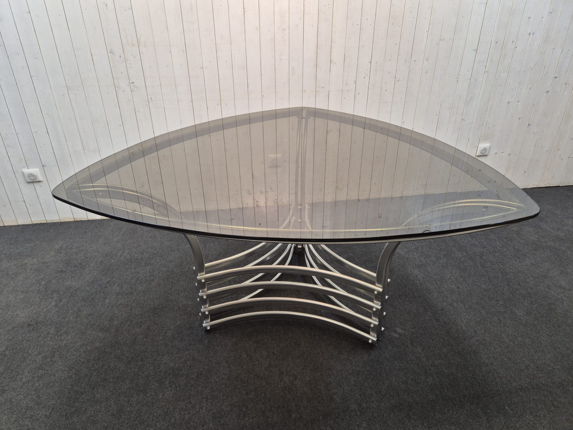 Très bel ensemble des années 70 composé d’une table triangulaire en verre fumé et chrome (Italie) et de 4 chaises cidue avec leurs galettes tissu d’origine.