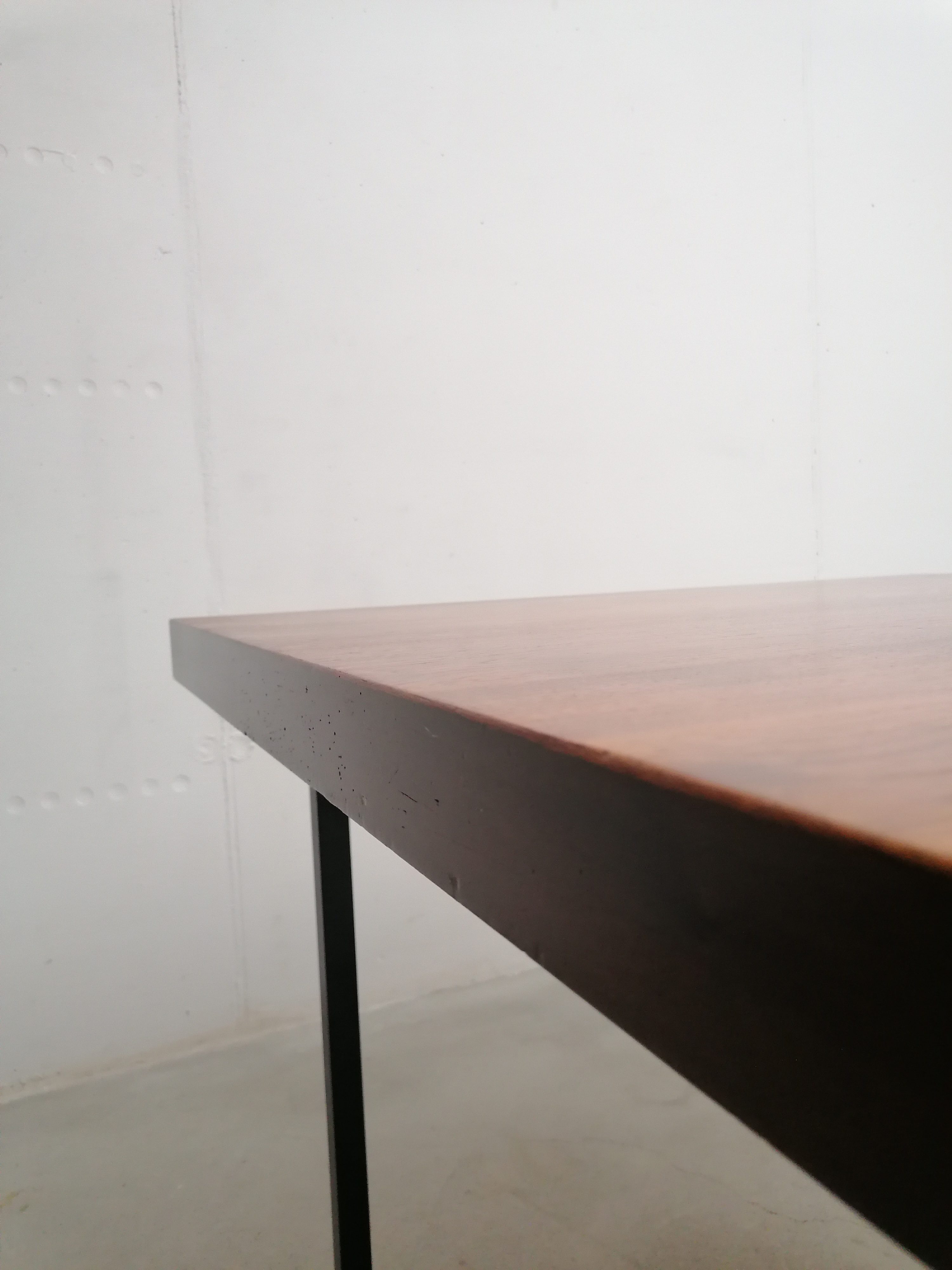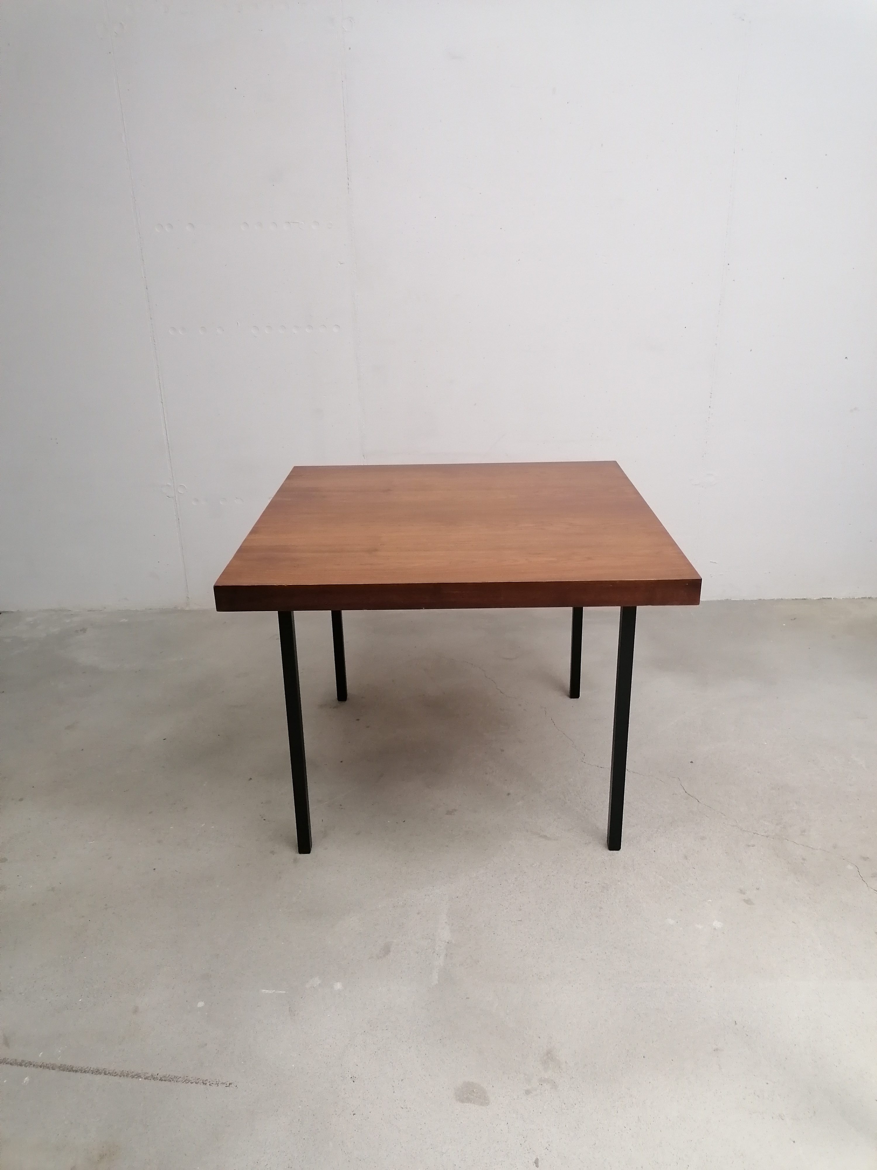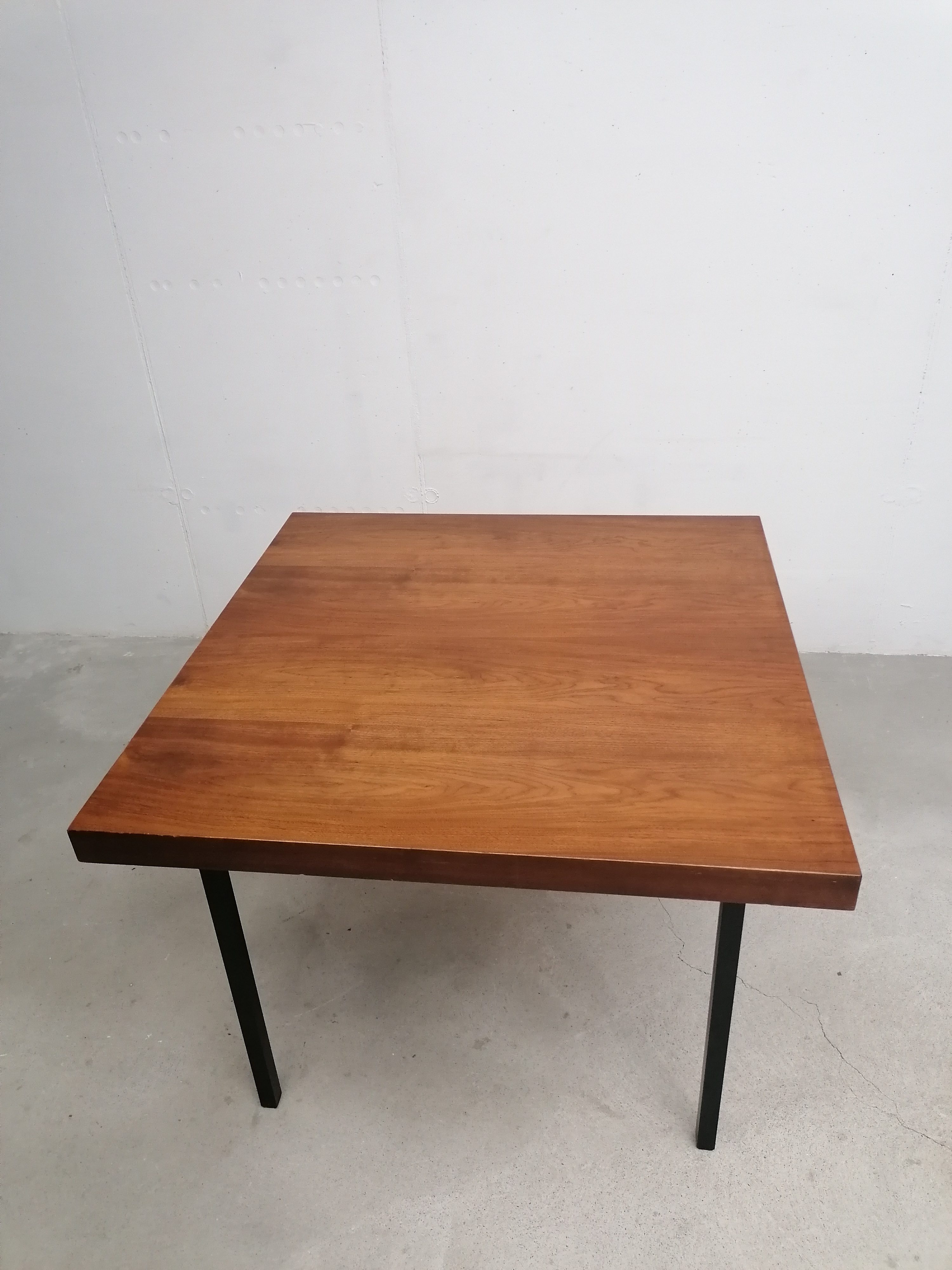 Produit venduTable à manger carrée des années 60 probablement produite par Möbel Willisau. Le plateau est en bois plaqué (noyer). Le piètement en métal noir est stable et de qualité. Quelques légères traces d’usure (voir photos).Épaisseur du plateau : 6 cm.
