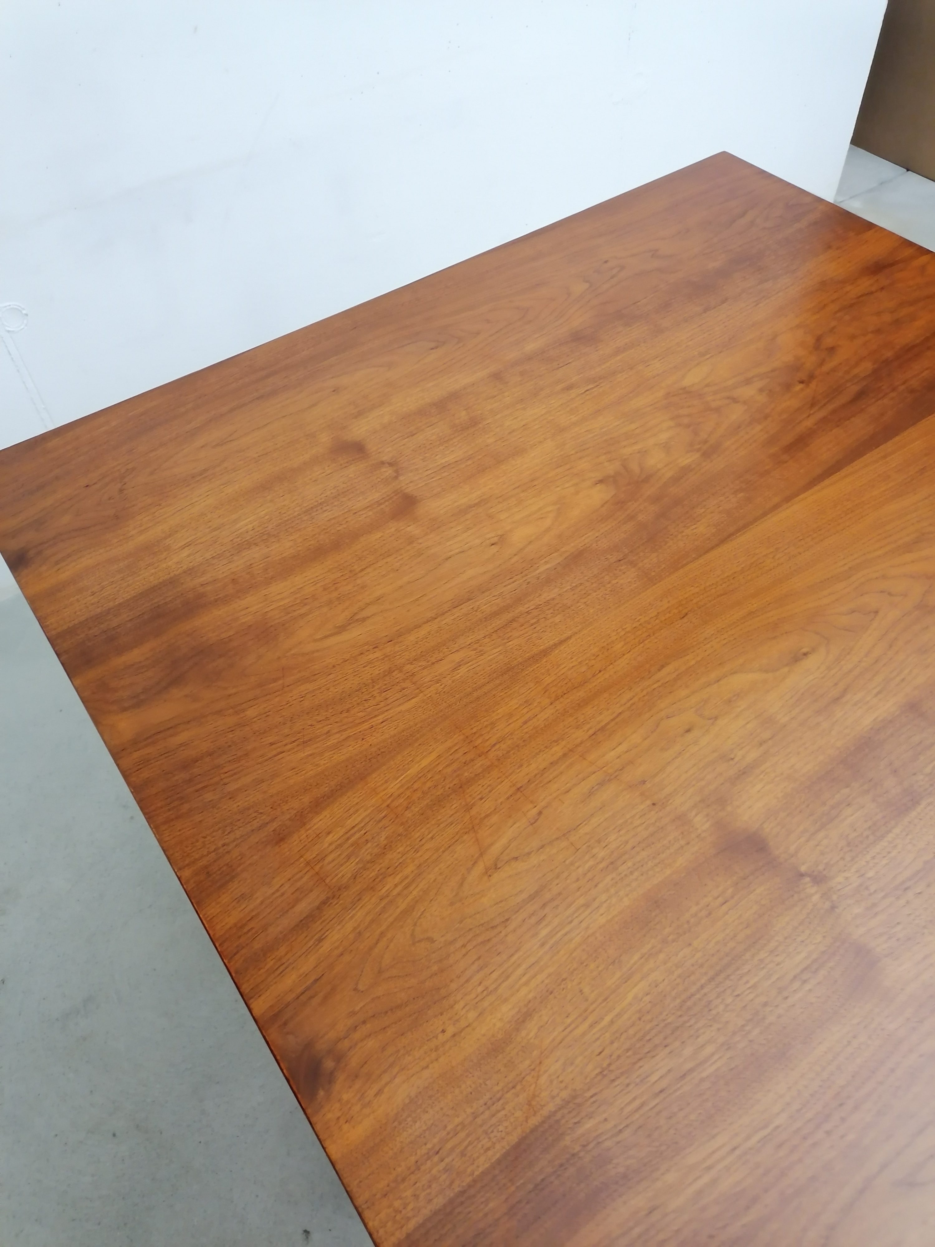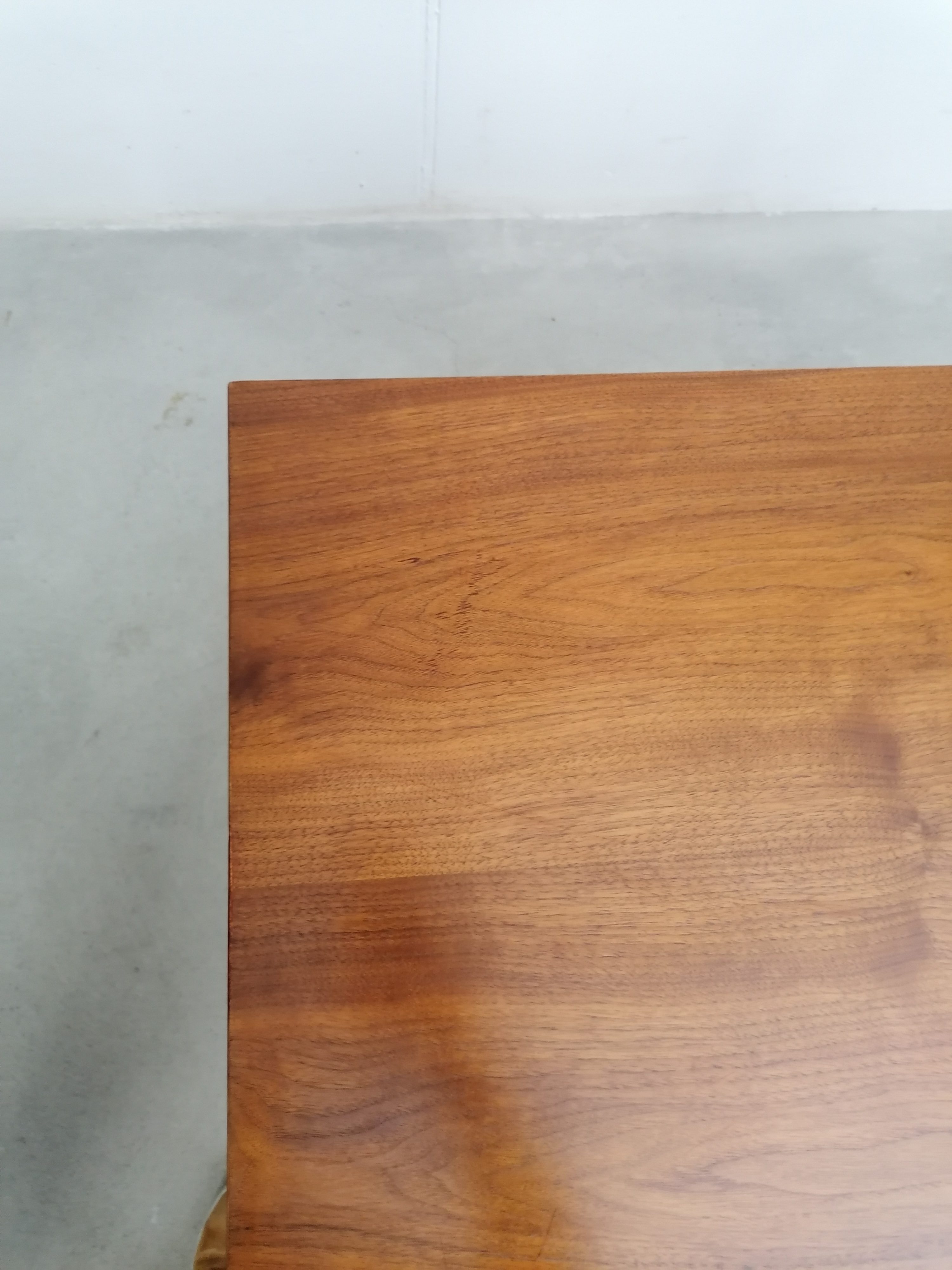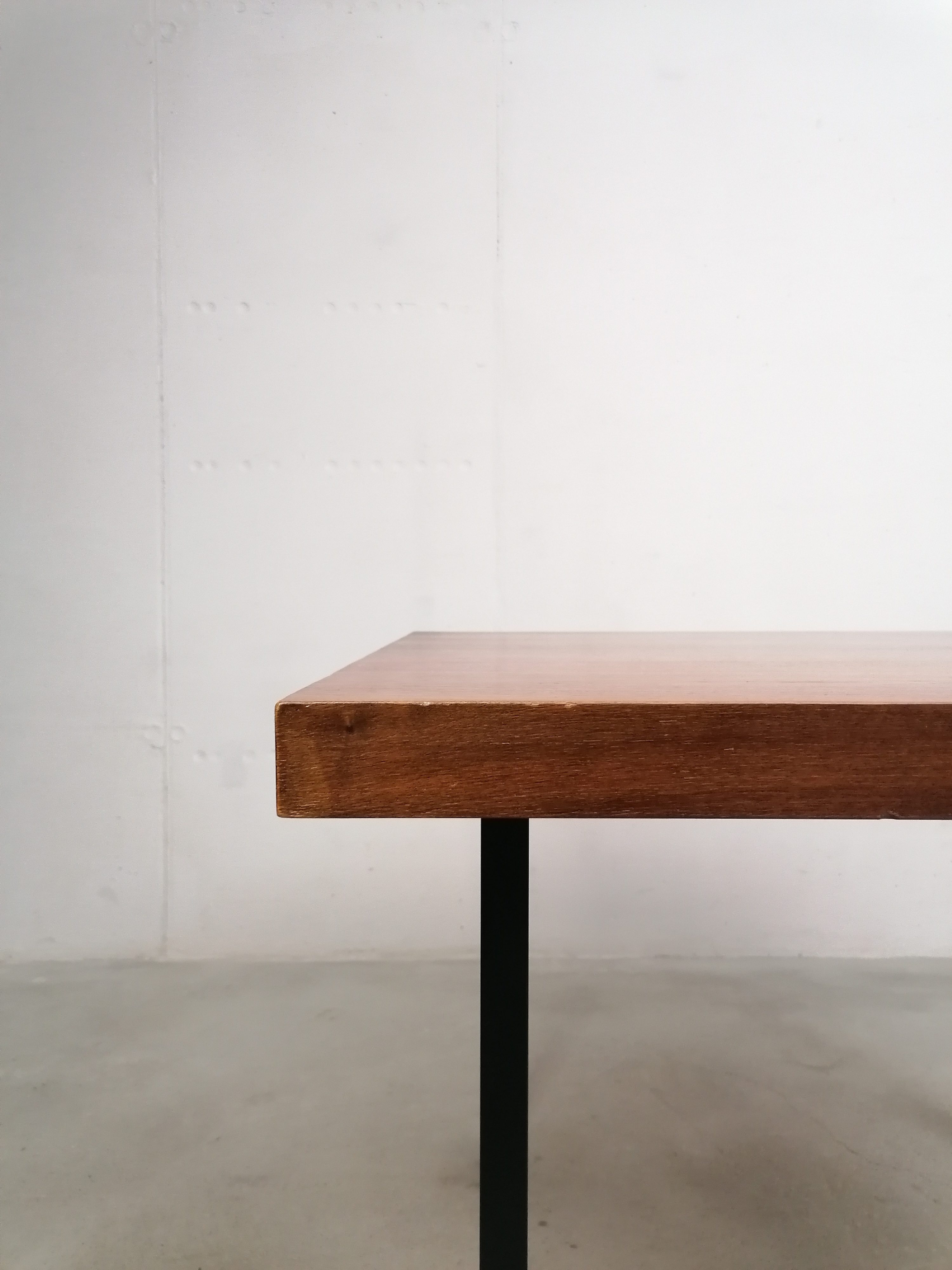 Produit venduTable à manger carrée des années 60 probablement produite par Möbel Willisau. Le plateau est en bois plaqué (noyer). Le piètement en métal noir est stable et de qualité. Quelques légères traces d’usure (voir photos).Épaisseur du plateau : 6 cm.