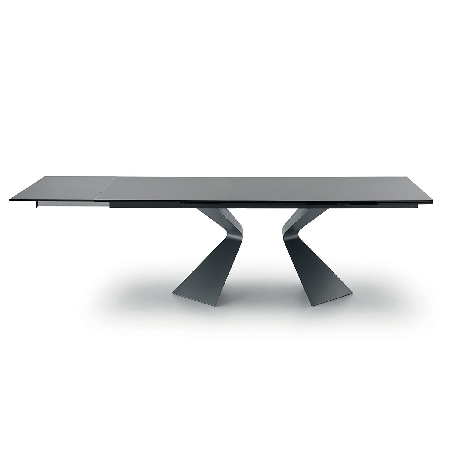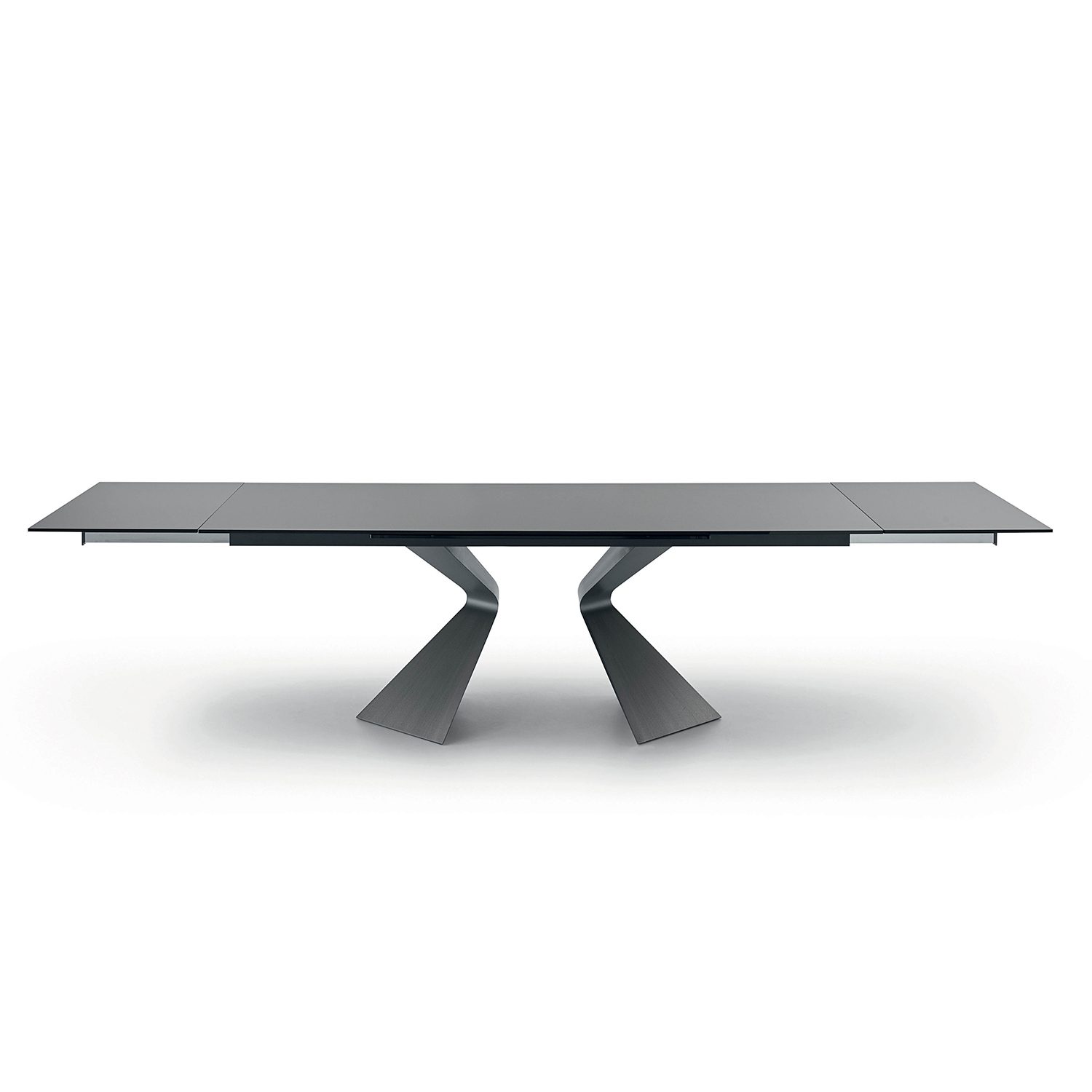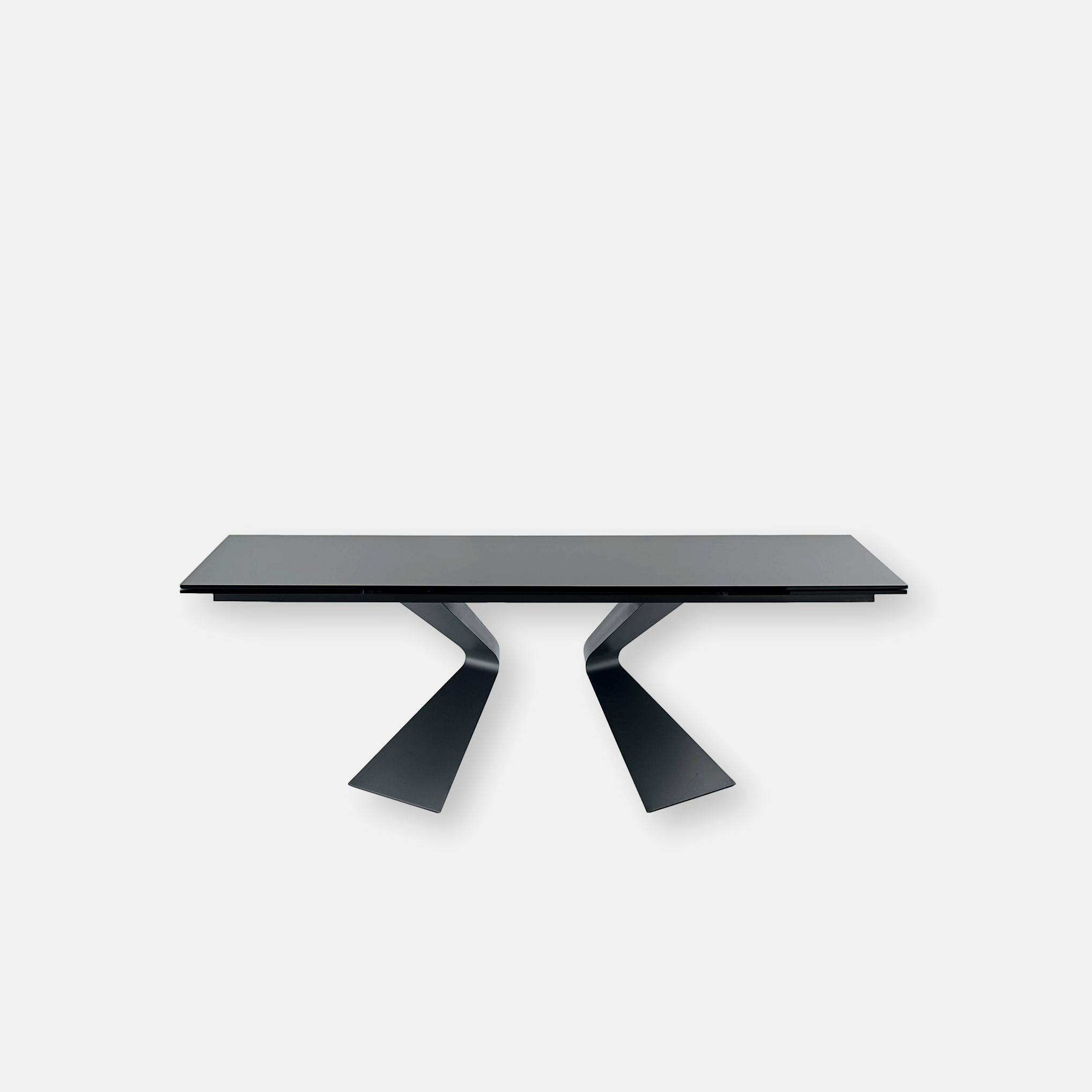 Produit venduLa table à manger Prora de la marque italienne Bonaldo est une table à rallonges avec un plateau en cristal noir et une structure et une base centrale imposante en acier vernis noir dont la forme rappelle celle de la proue d’un navire. Les rallonges latérales sont placées sous le plateau et une fois ouverte, la table peut accueillir jusqu’à 14 convives.