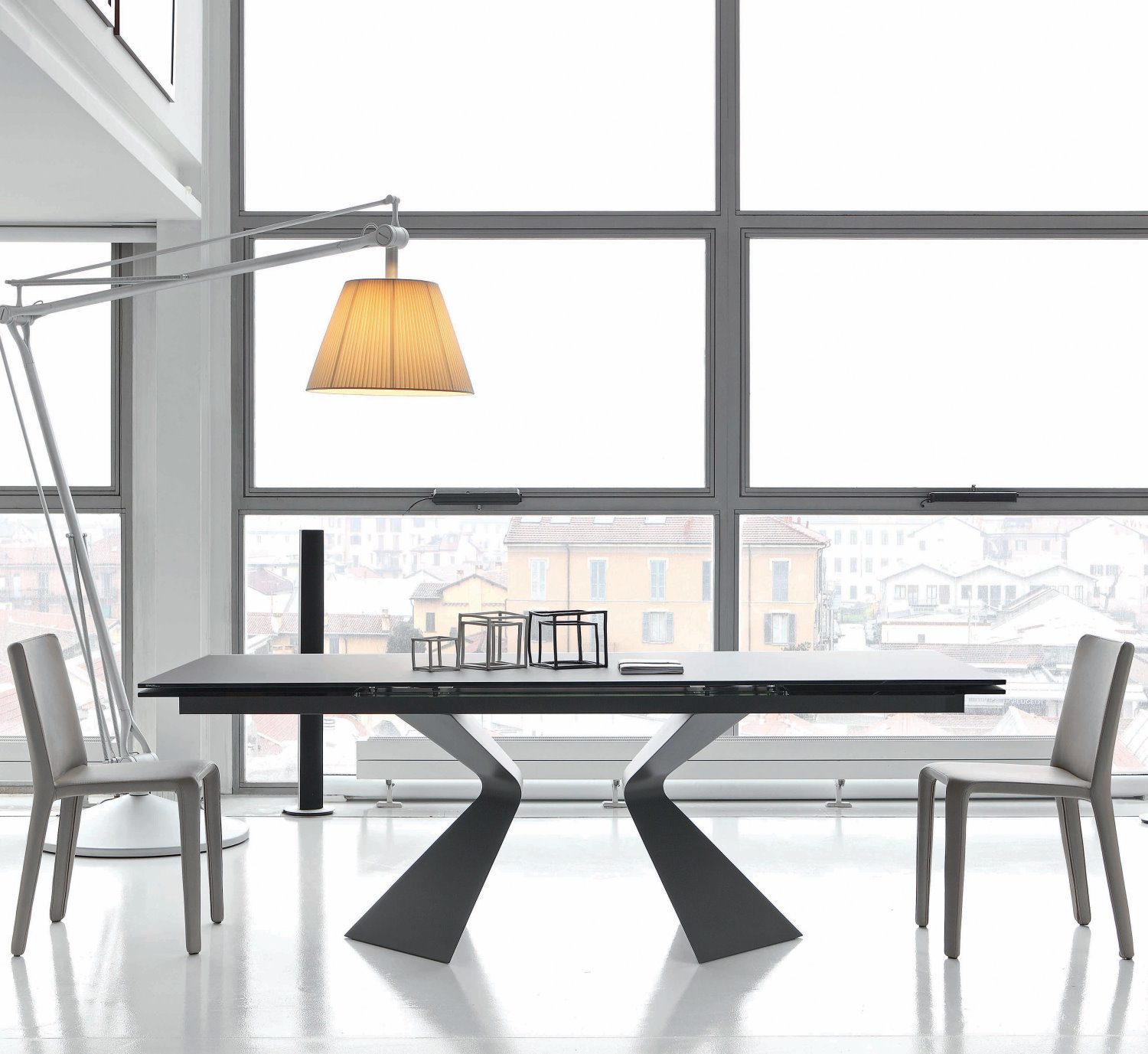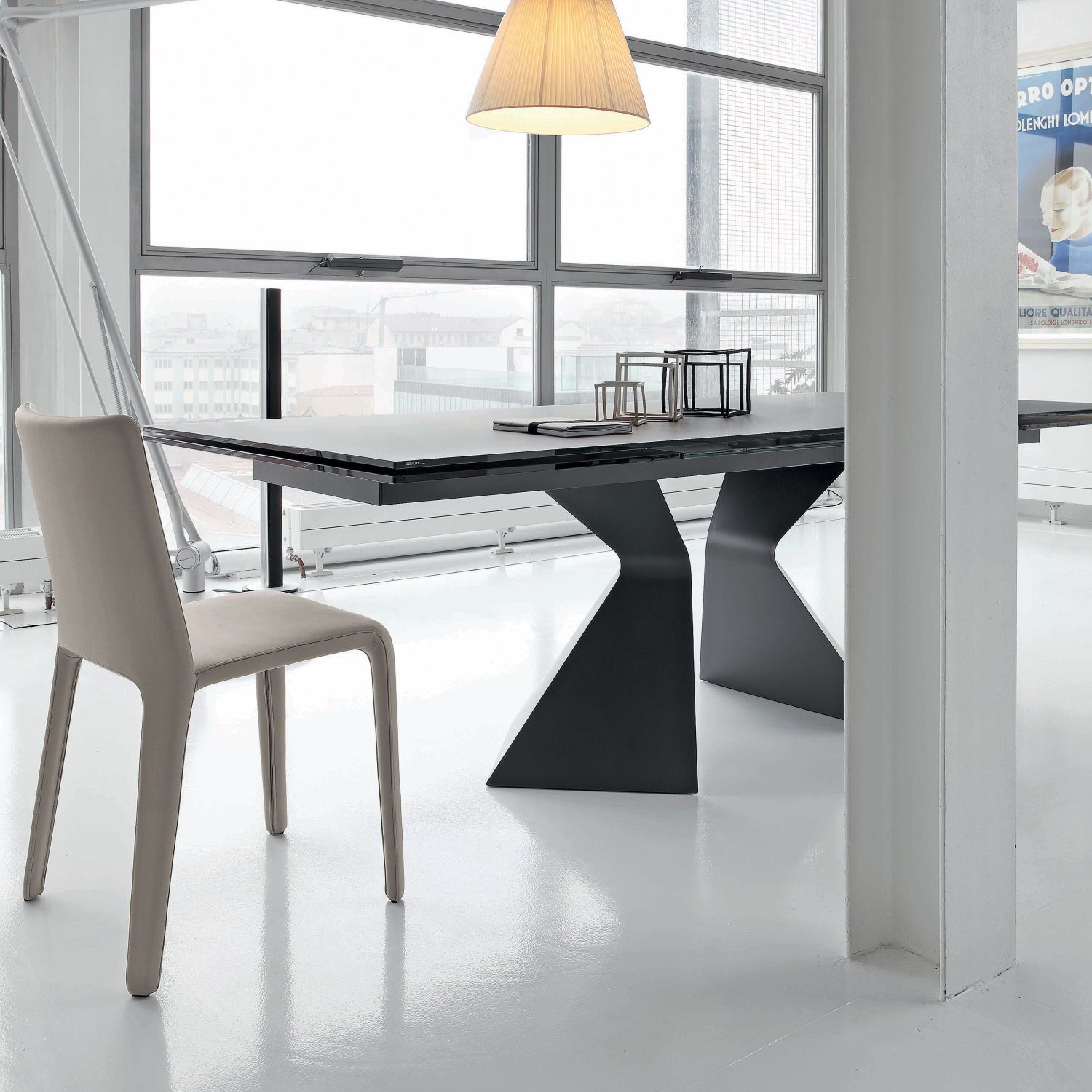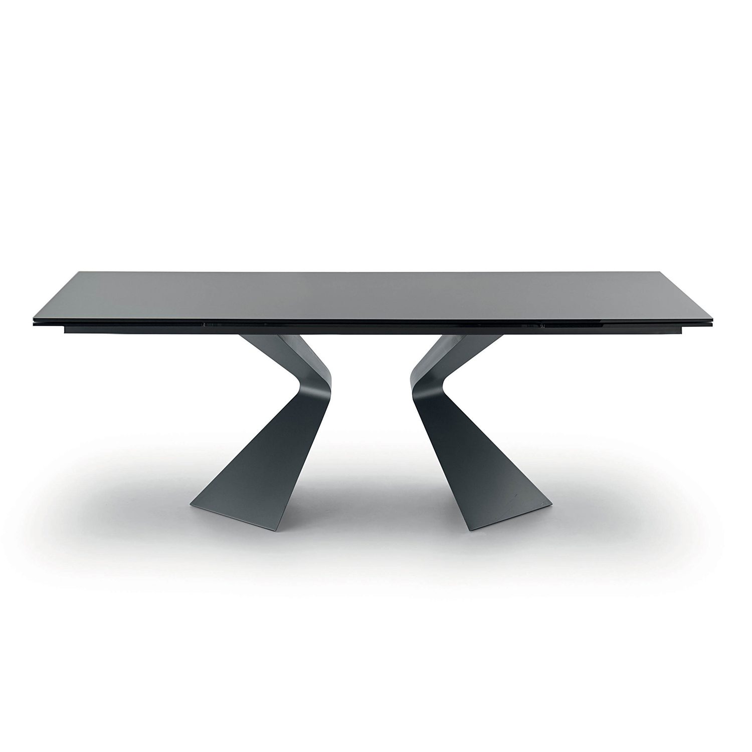 Produit venduLa table à manger Prora de la marque italienne Bonaldo est une table à rallonges avec un plateau en cristal noir et une structure et une base centrale imposante en acier vernis noir dont la forme rappelle celle de la proue d’un navire. Les rallonges latérales sont placées sous le plateau et une fois ouverte, la table peut accueillir jusqu’à 14 convives.