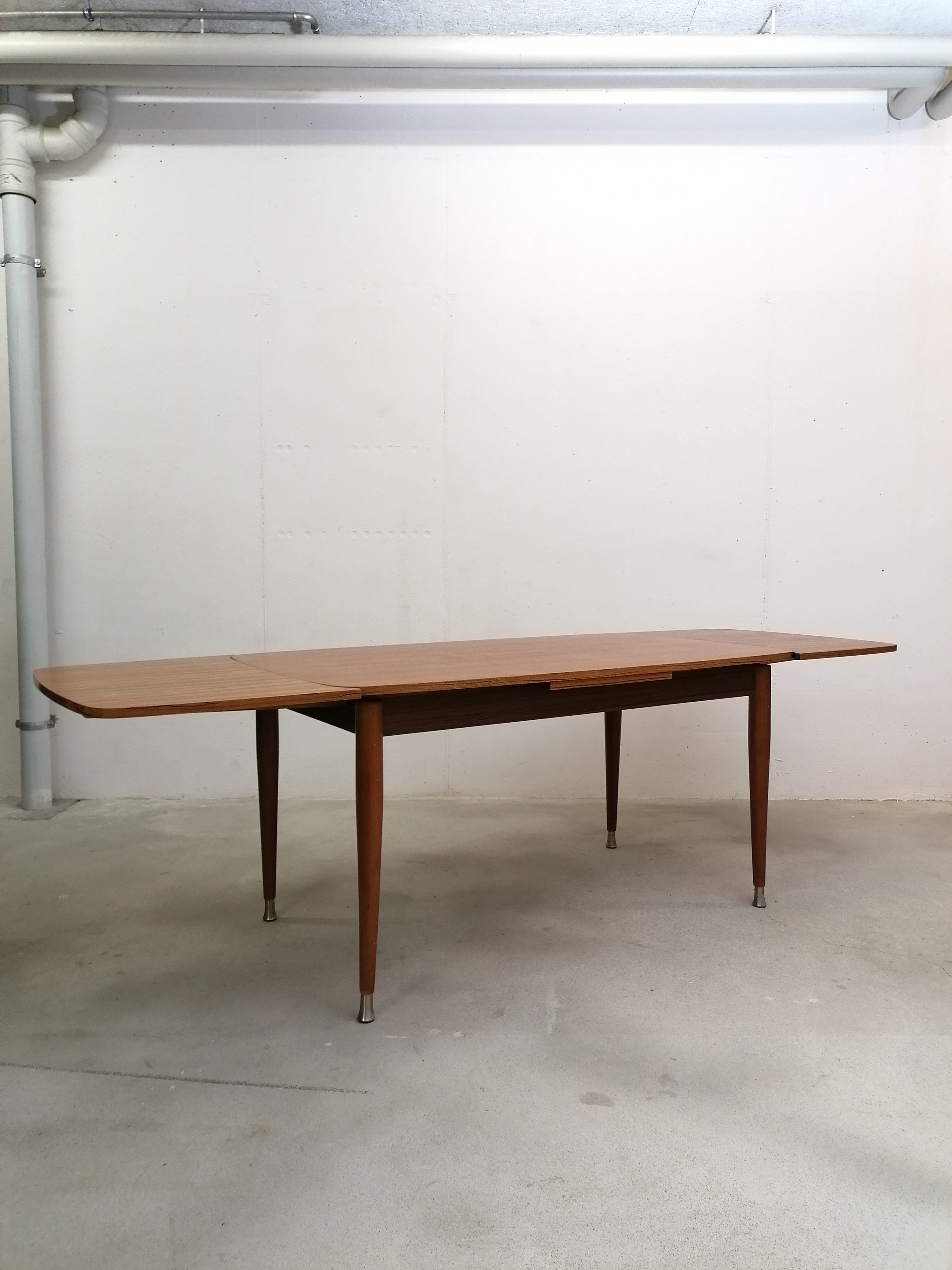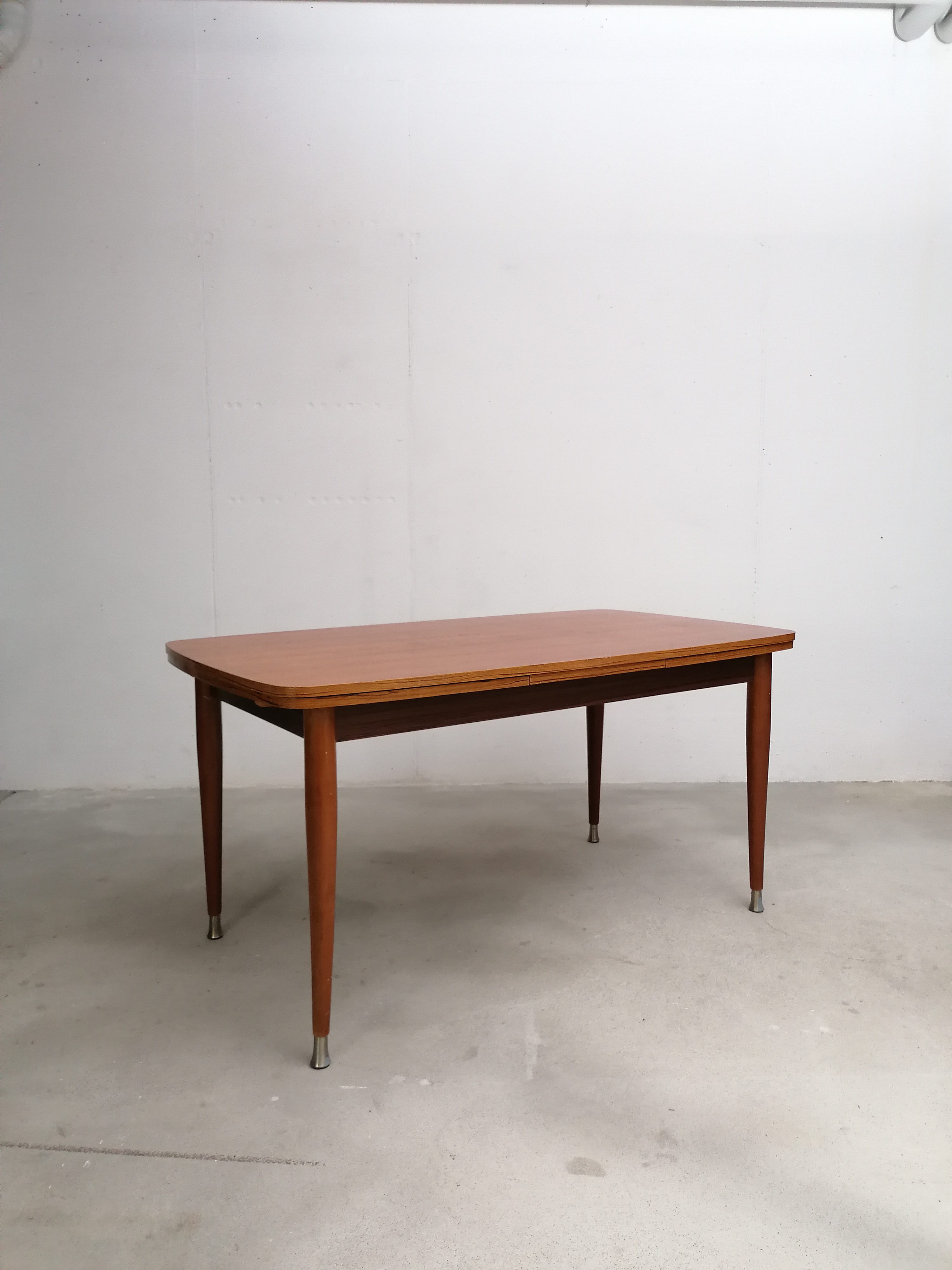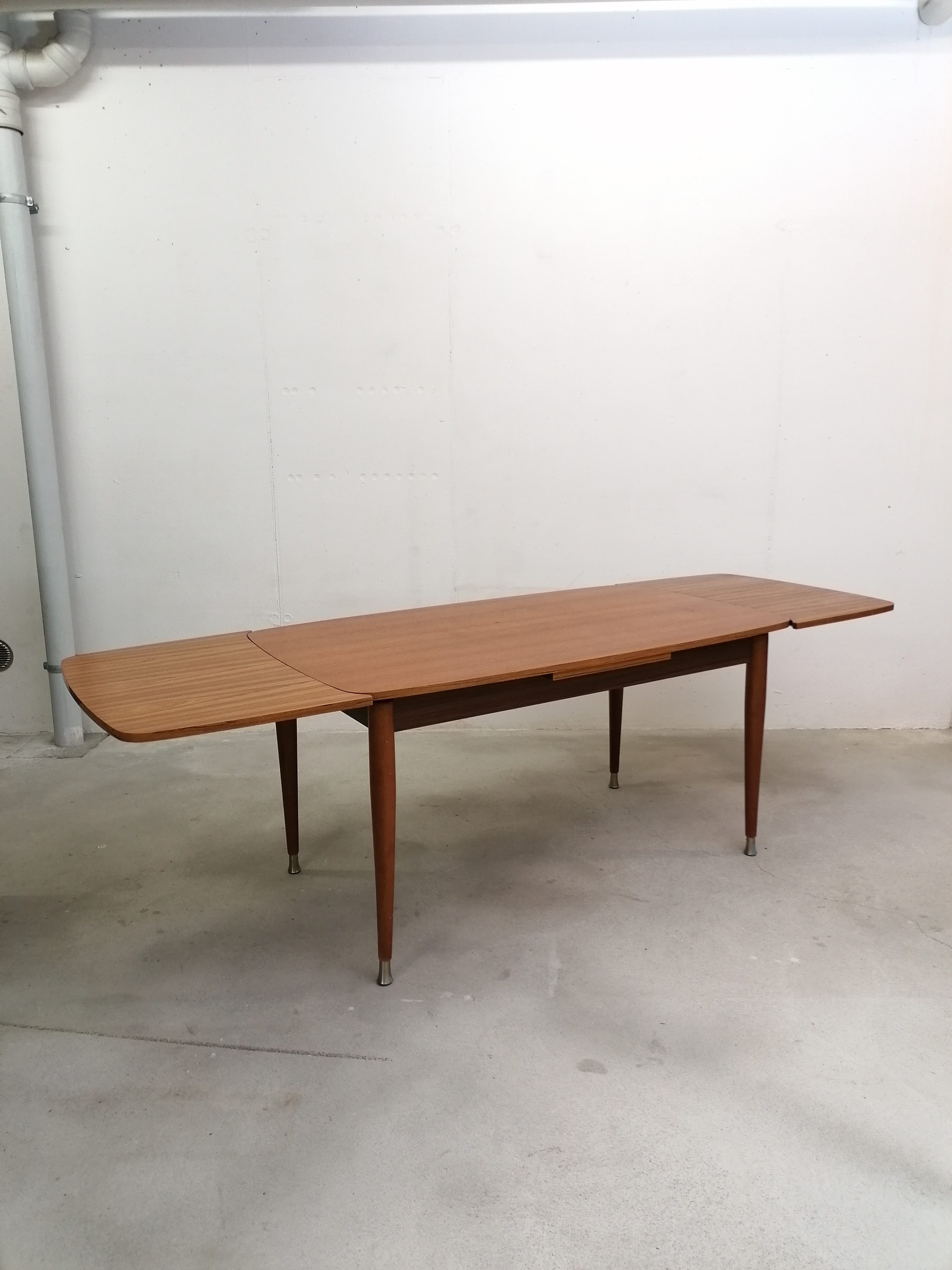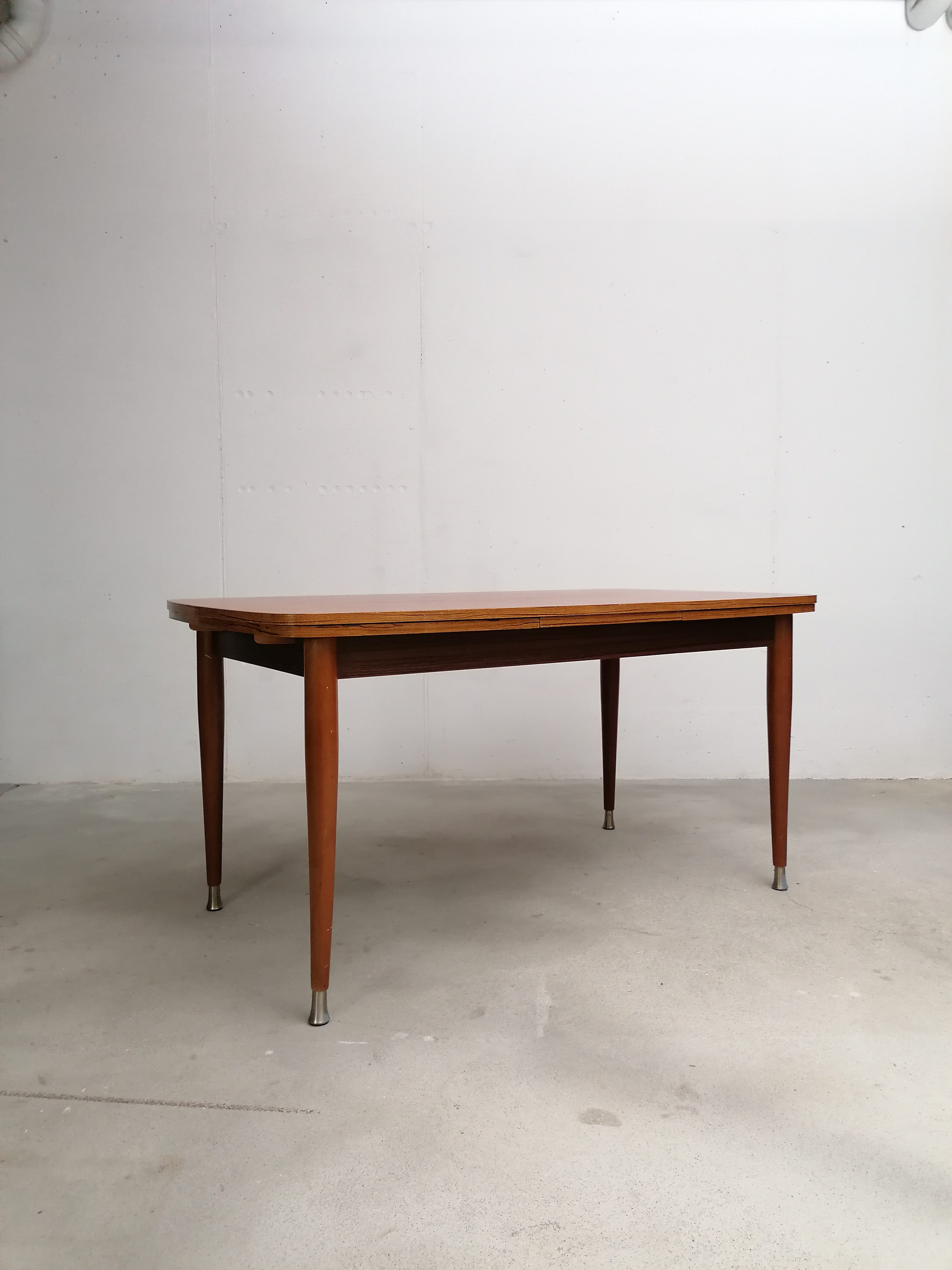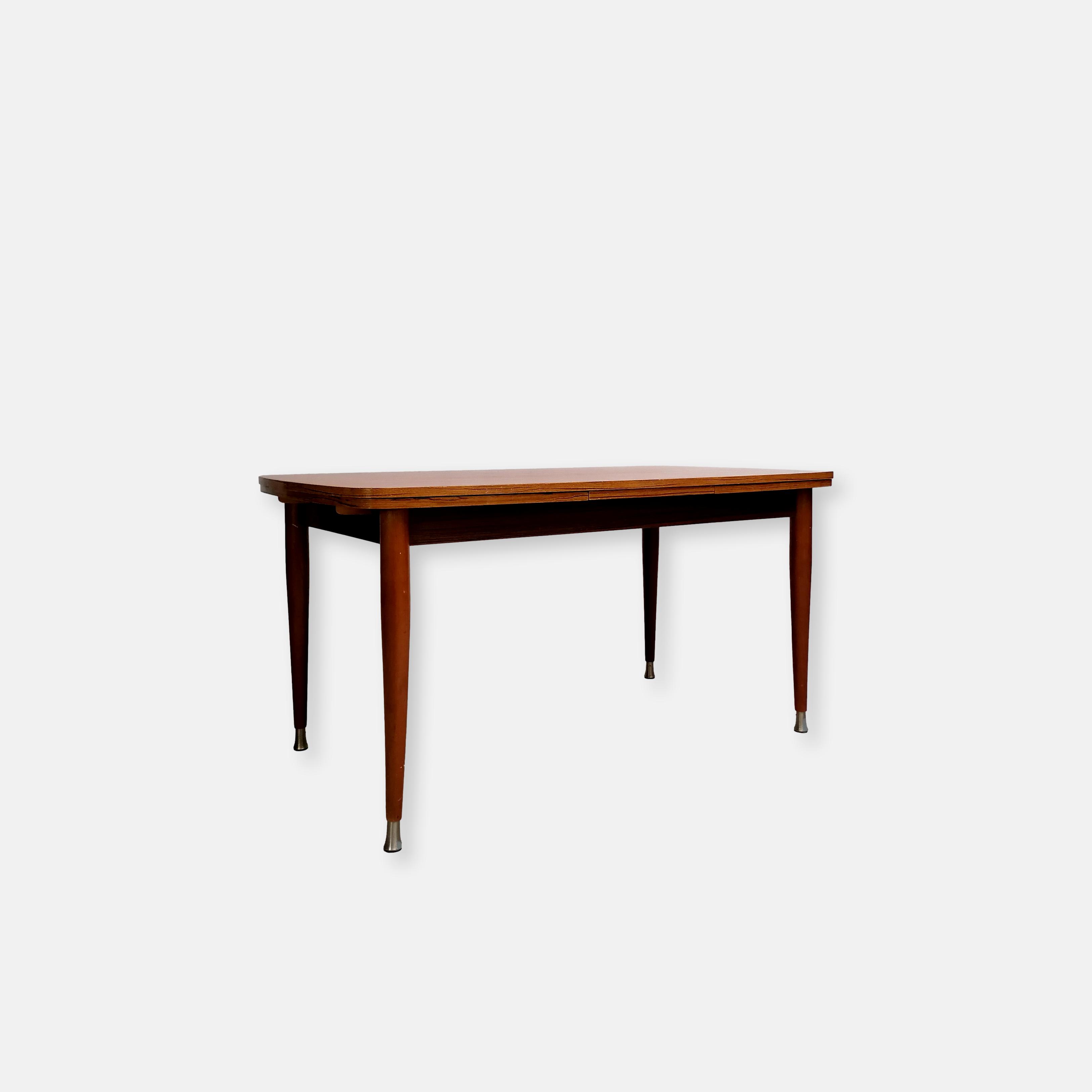 Produit venduTable à manger vintage en bois avec 2 rallonges et bouts des pieds en métal. Les rallonges mesurent chacune 48 cm. Le bois des rallonges est différent de celui du plateau principal et ce dernier présente quelques traces d’usure visibles sur les photos. La table est stable et solide et parfaitement fonctionnelle.