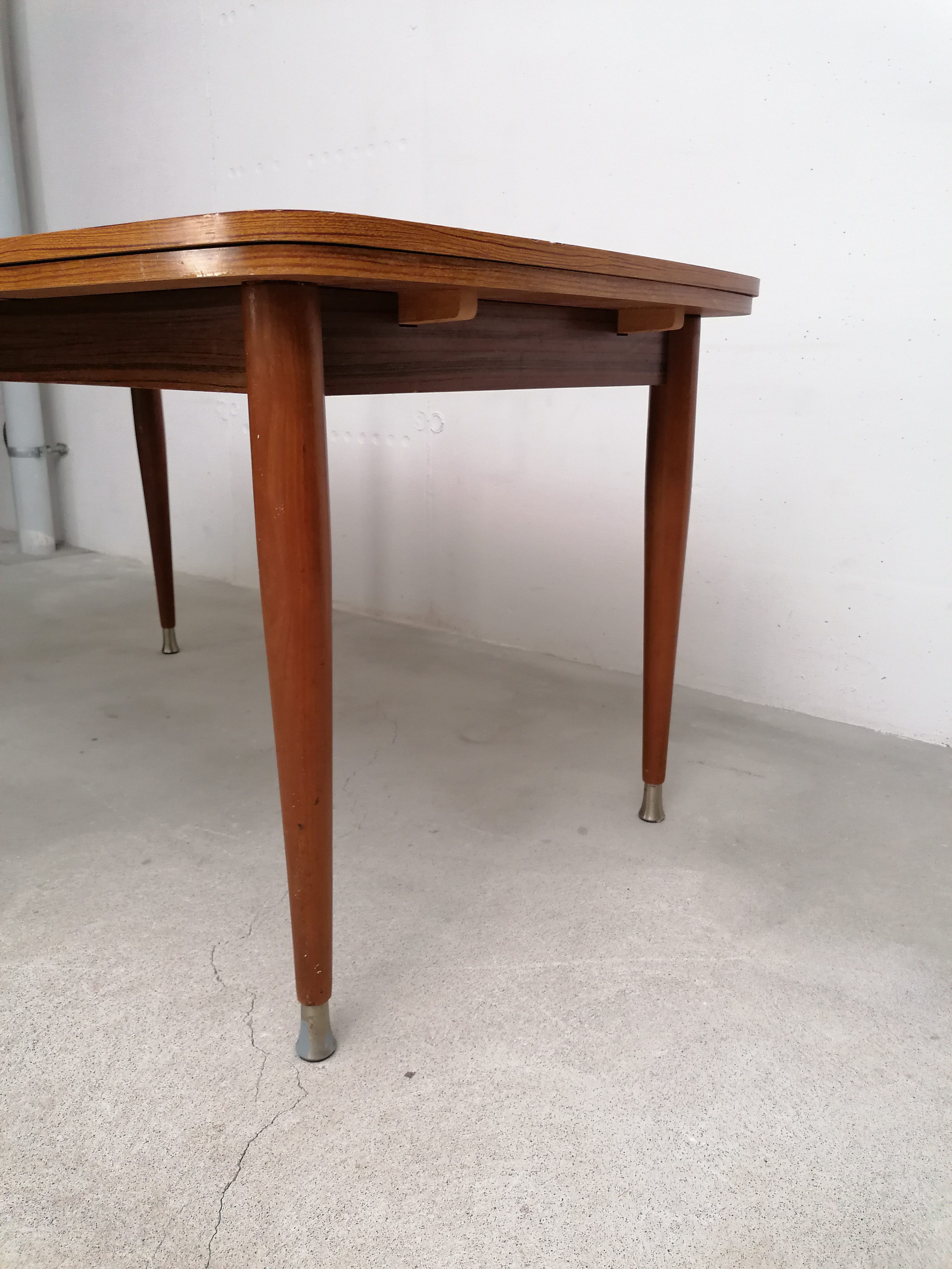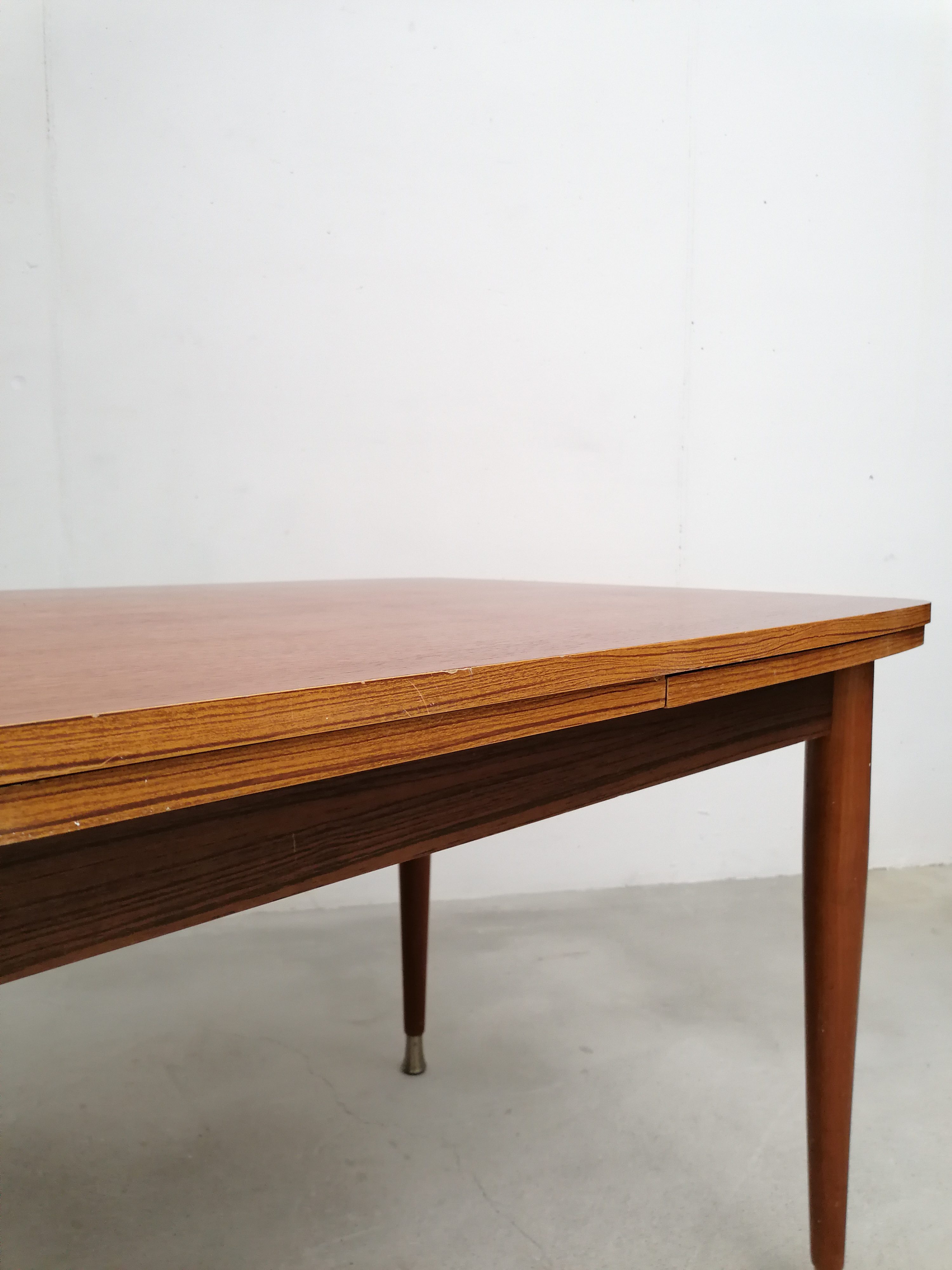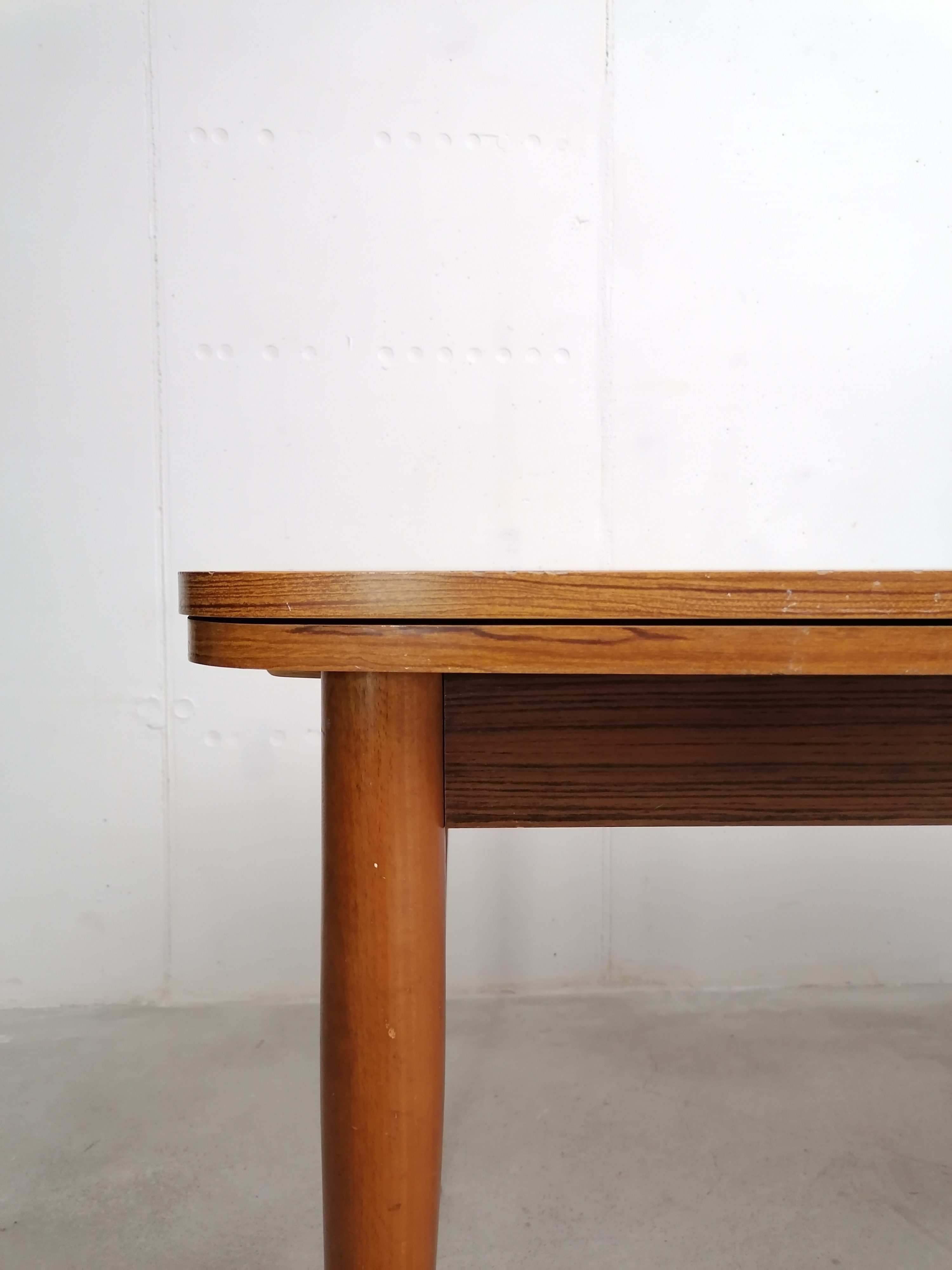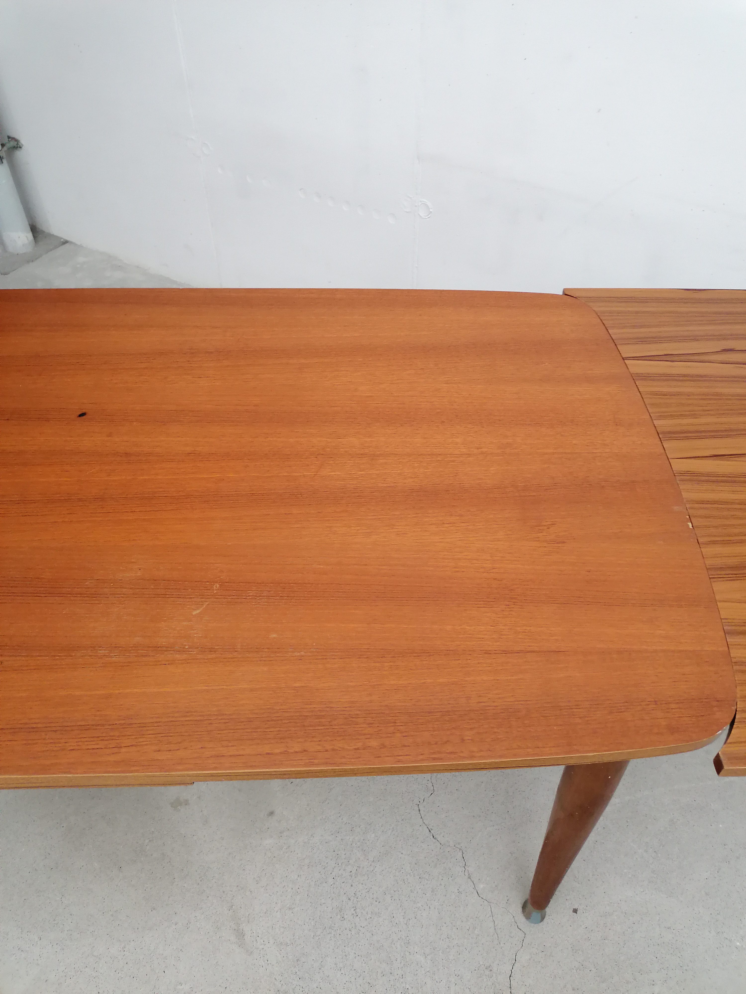 Produit venduTable à manger vintage en bois avec 2 rallonges et bouts des pieds en métal. Les rallonges mesurent chacune 48 cm. Le bois des rallonges est différent de celui du plateau principal et ce dernier présente quelques traces d’usure visibles sur les photos. La table est stable et solide et parfaitement fonctionnelle.