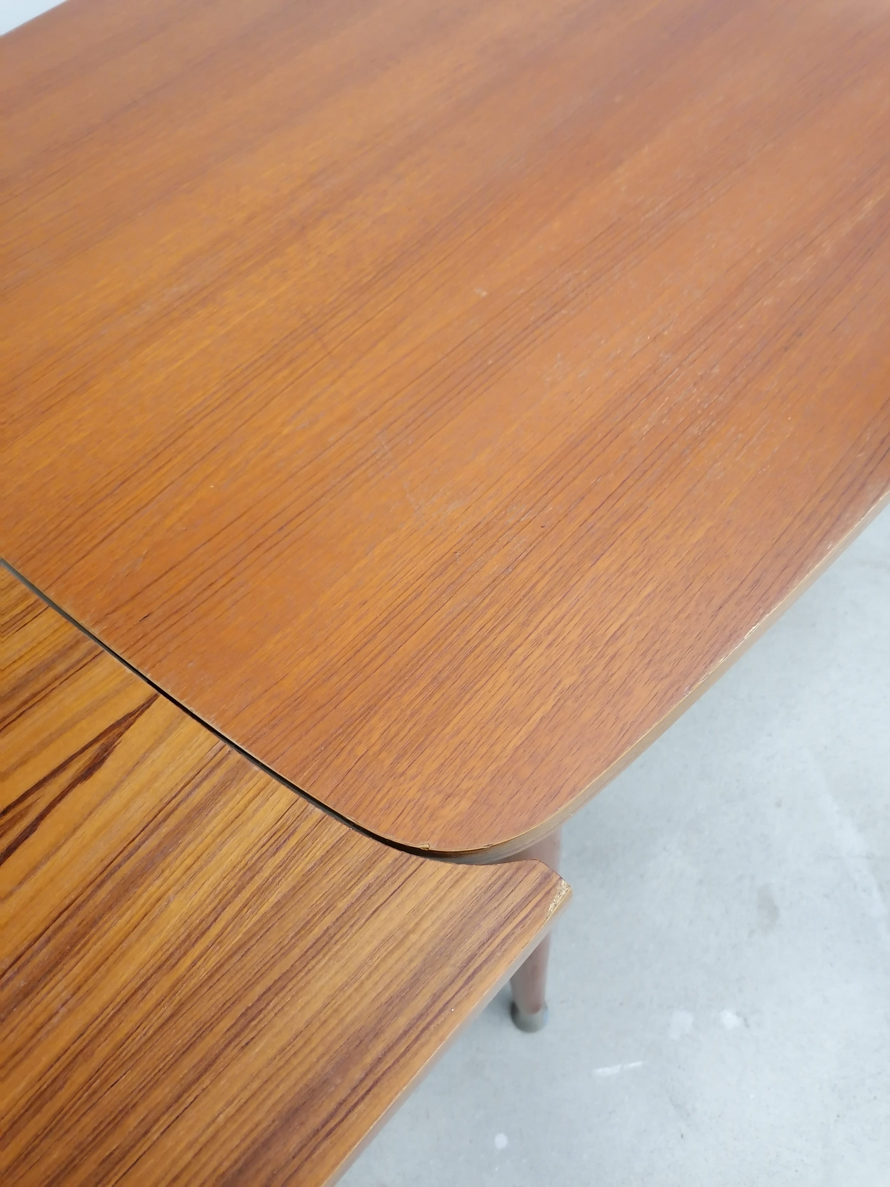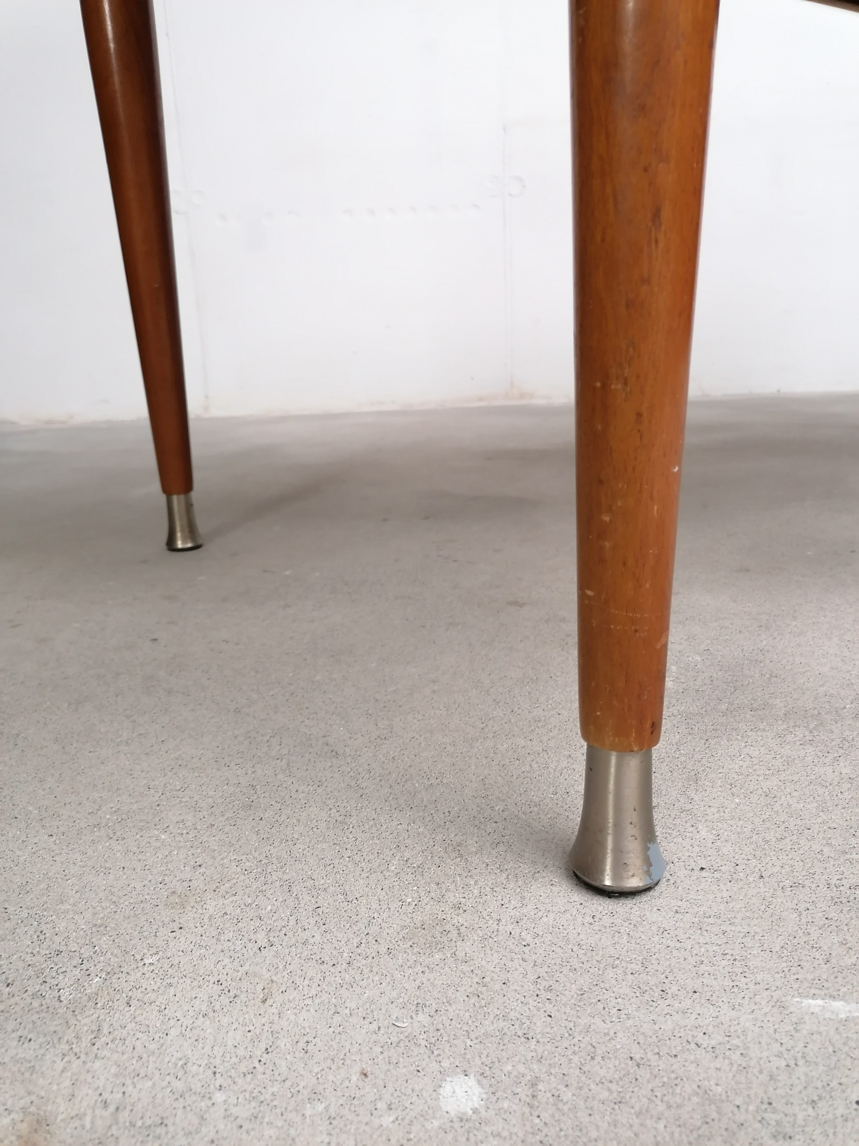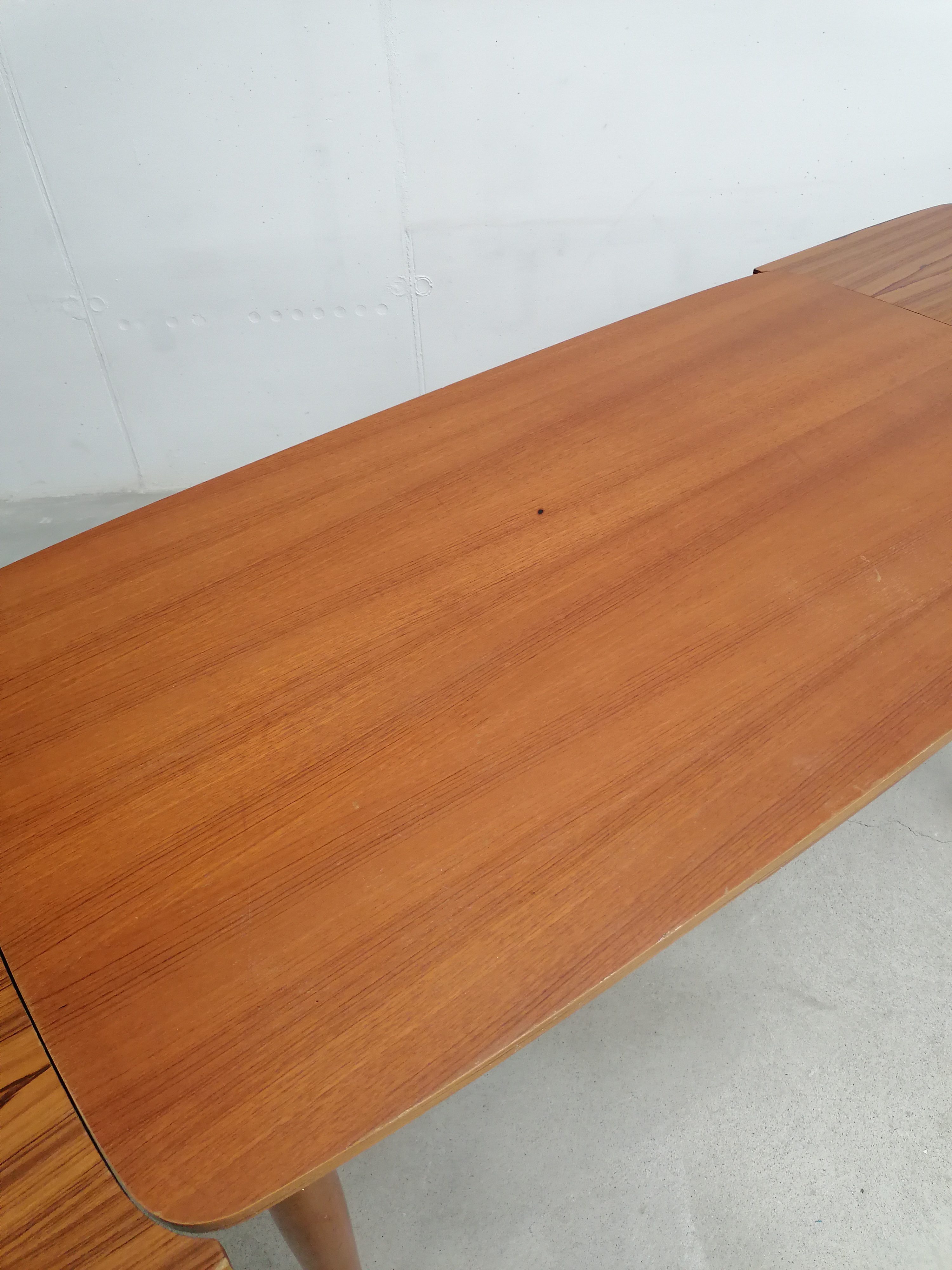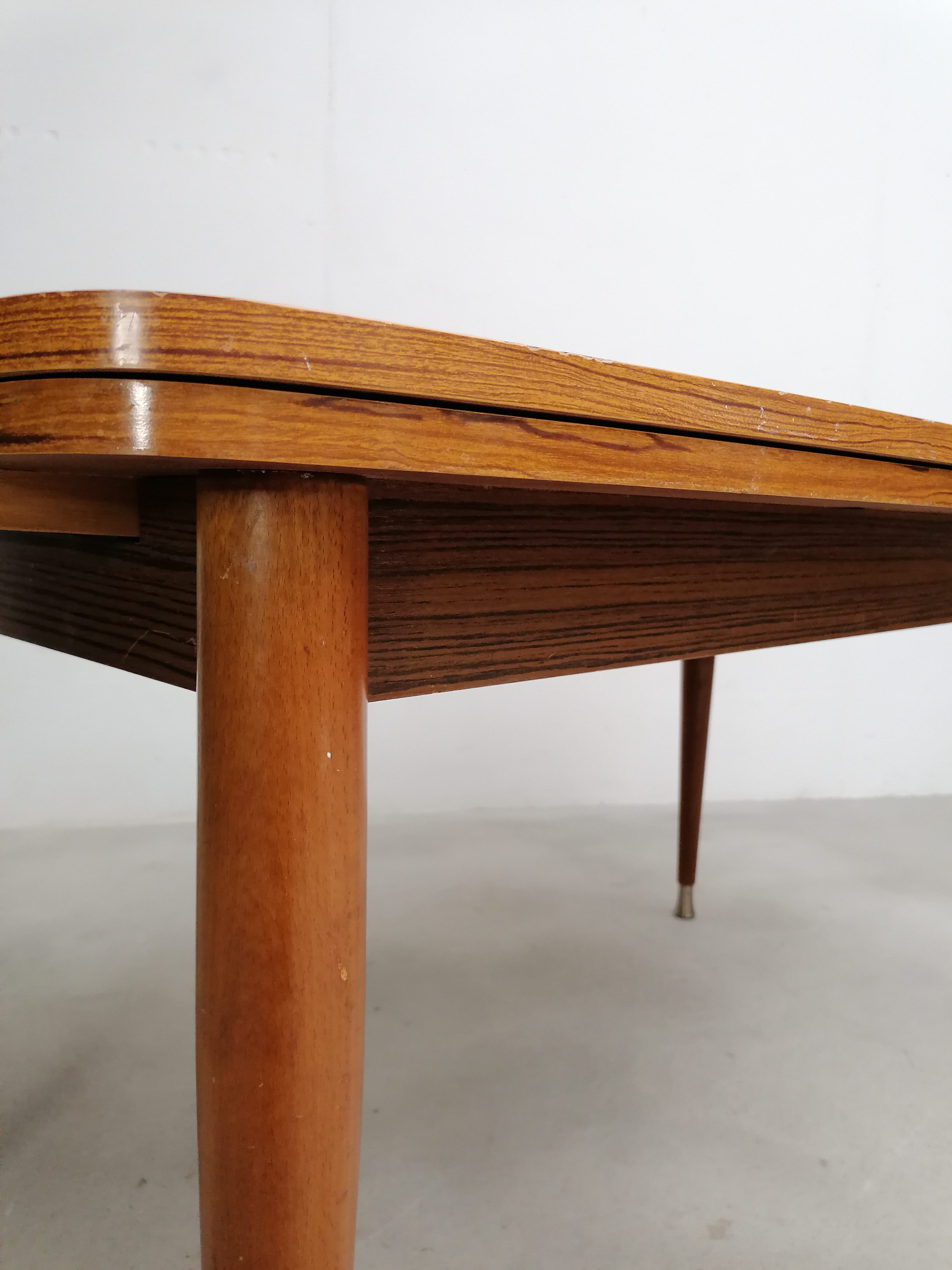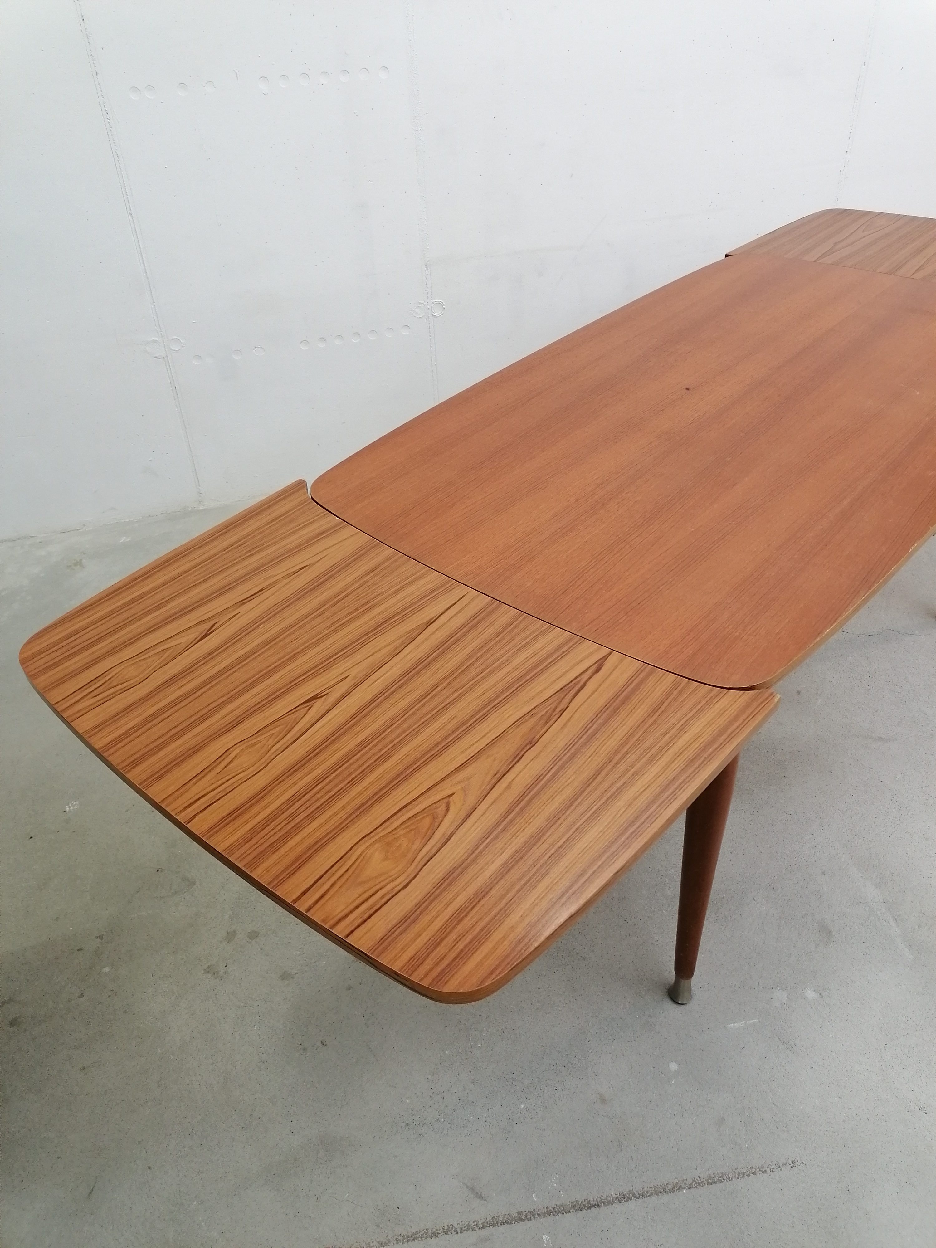 Produit venduTable à manger vintage en bois avec 2 rallonges et bouts des pieds en métal. Les rallonges mesurent chacune 48 cm. Le bois des rallonges est différent de celui du plateau principal et ce dernier présente quelques traces d’usure visibles sur les photos. La table est stable et solide et parfaitement fonctionnelle.
