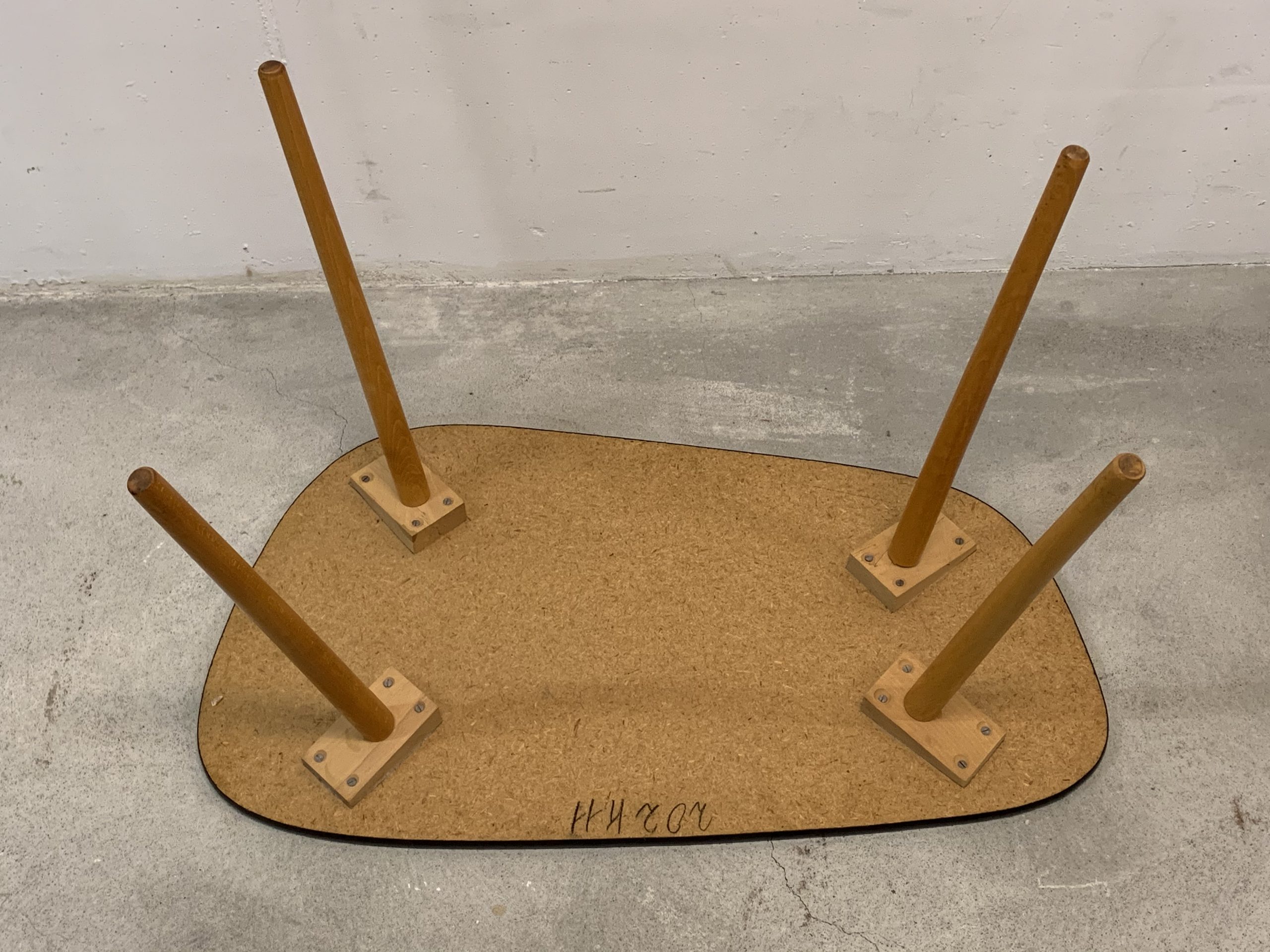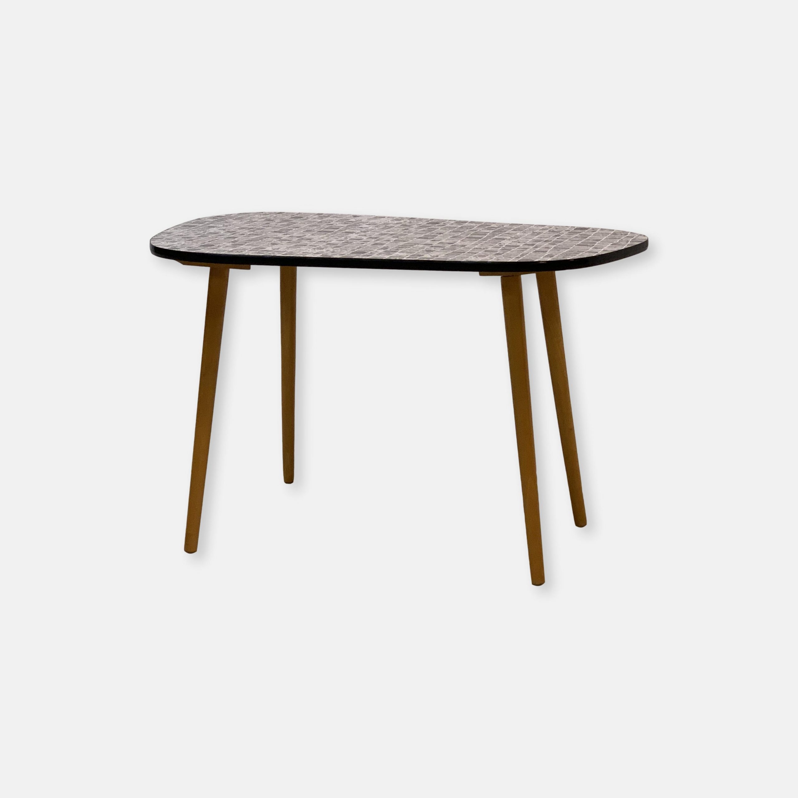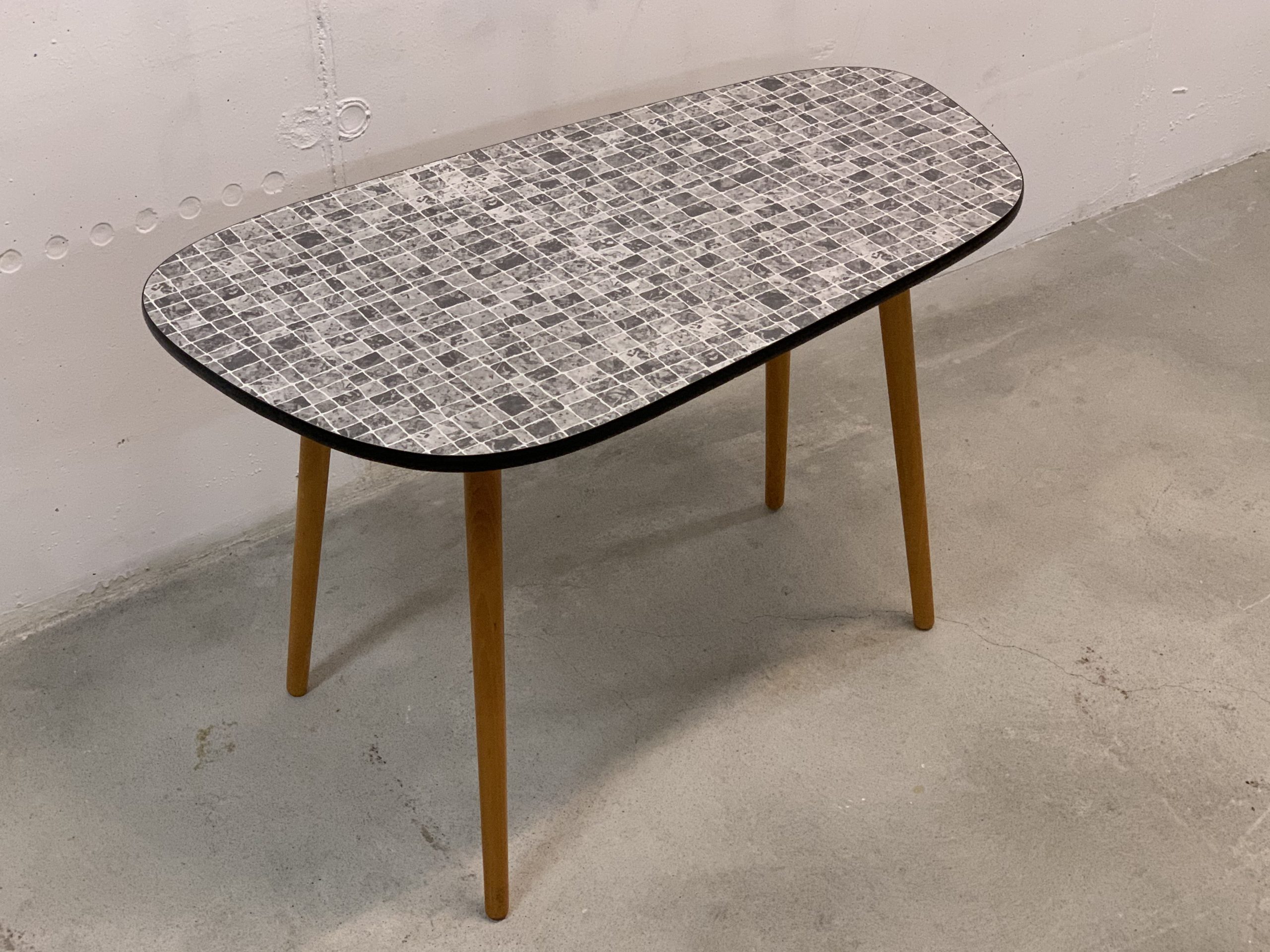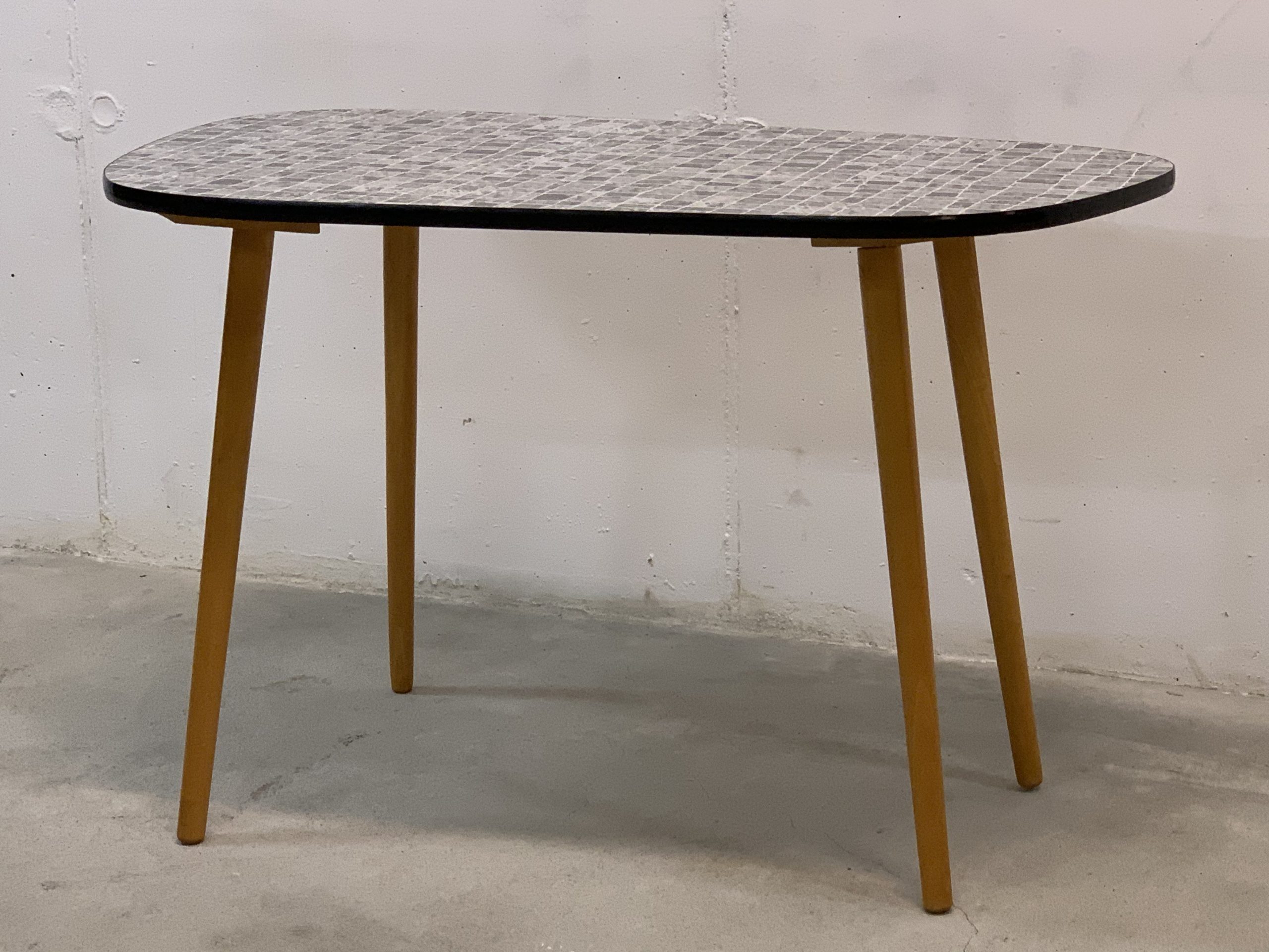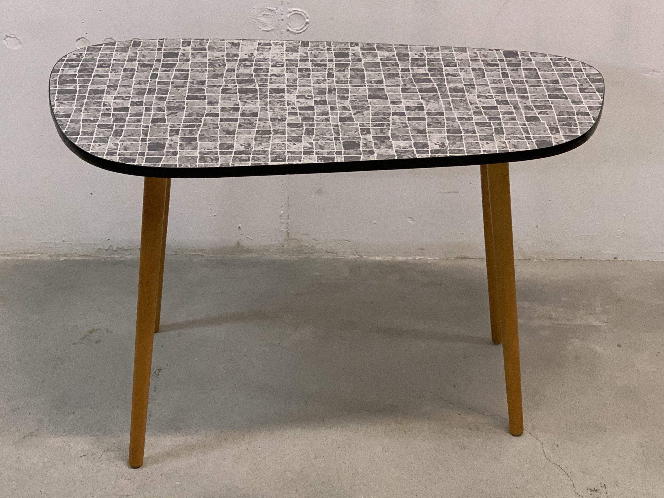 Produit venduTable basse vintage recouverte d’une surface en matière synthétique. Chaque pied est simplement enfoncé dans une encoche prévue à cet effet. Ils peuvent être facilement enlevés et remis (et pourquoi pas, collés), et un envoi par poste est ainsi possible.