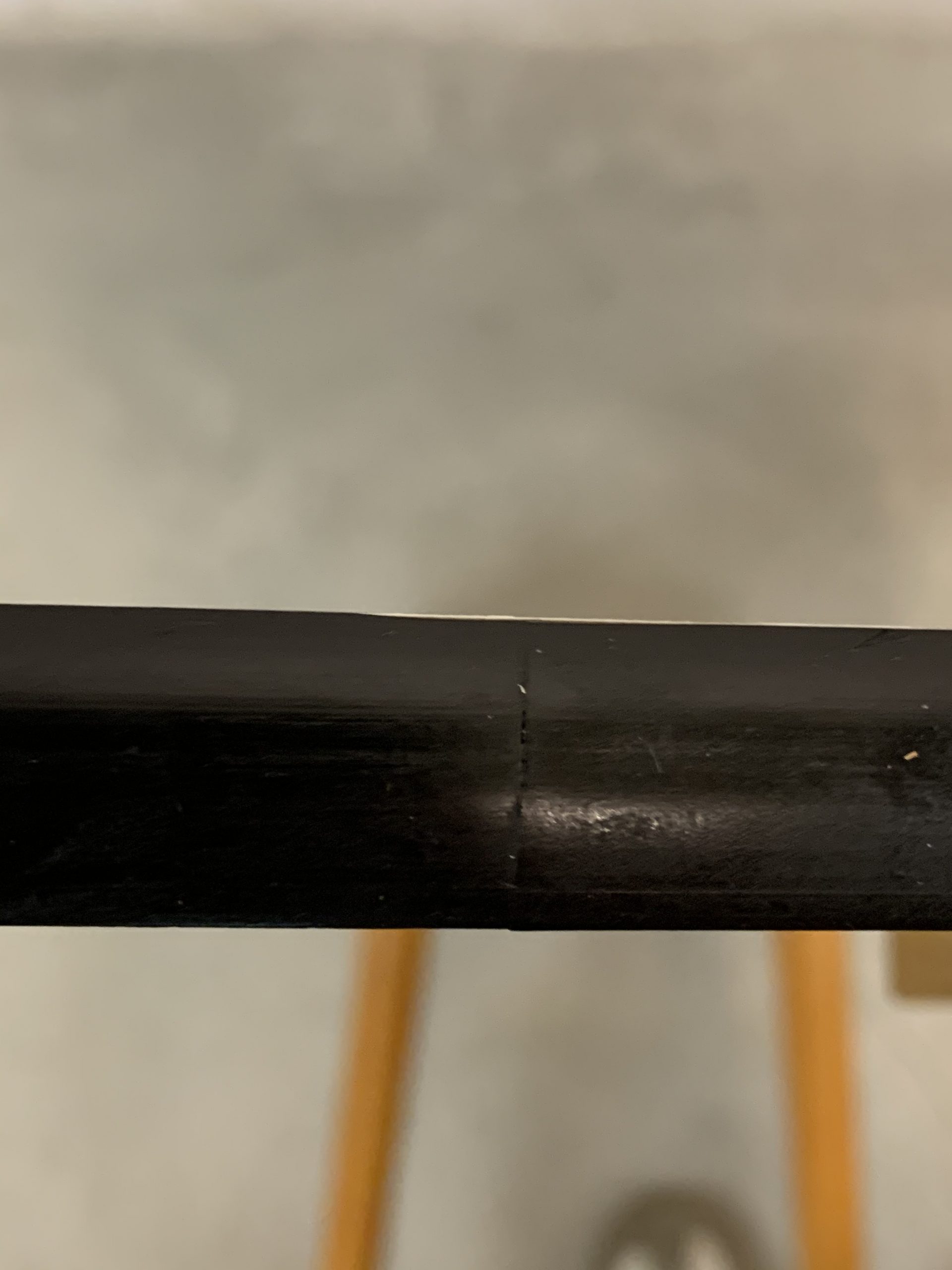 L’état général de la table est très bon: la surface est comme neuve et le bord en plastique noir aussi (il est bien collé et il ne lui manque pas quelques centimètres, comme c’est souvent le cas!). Les pieds ont quelques traces d’utilisation.