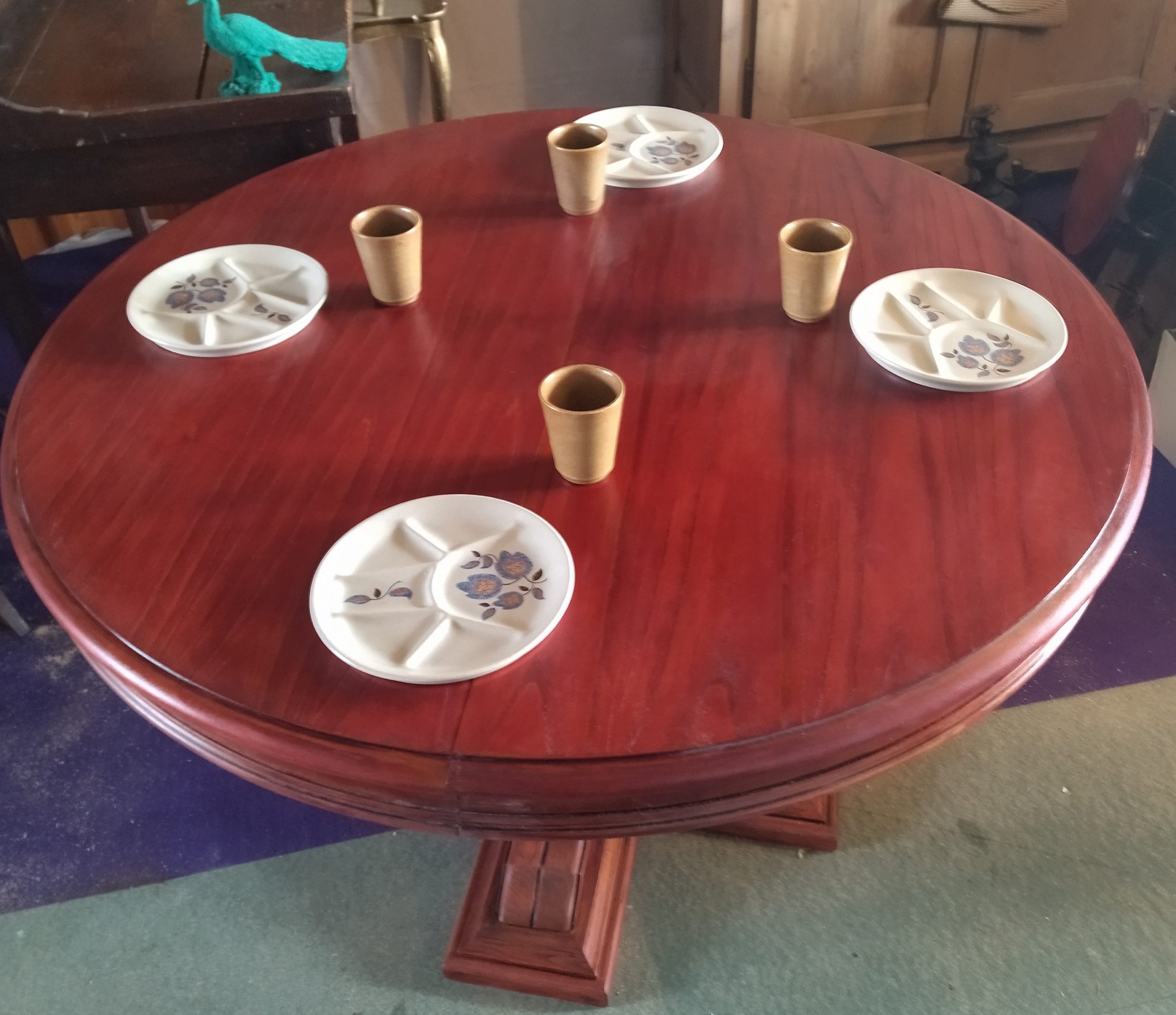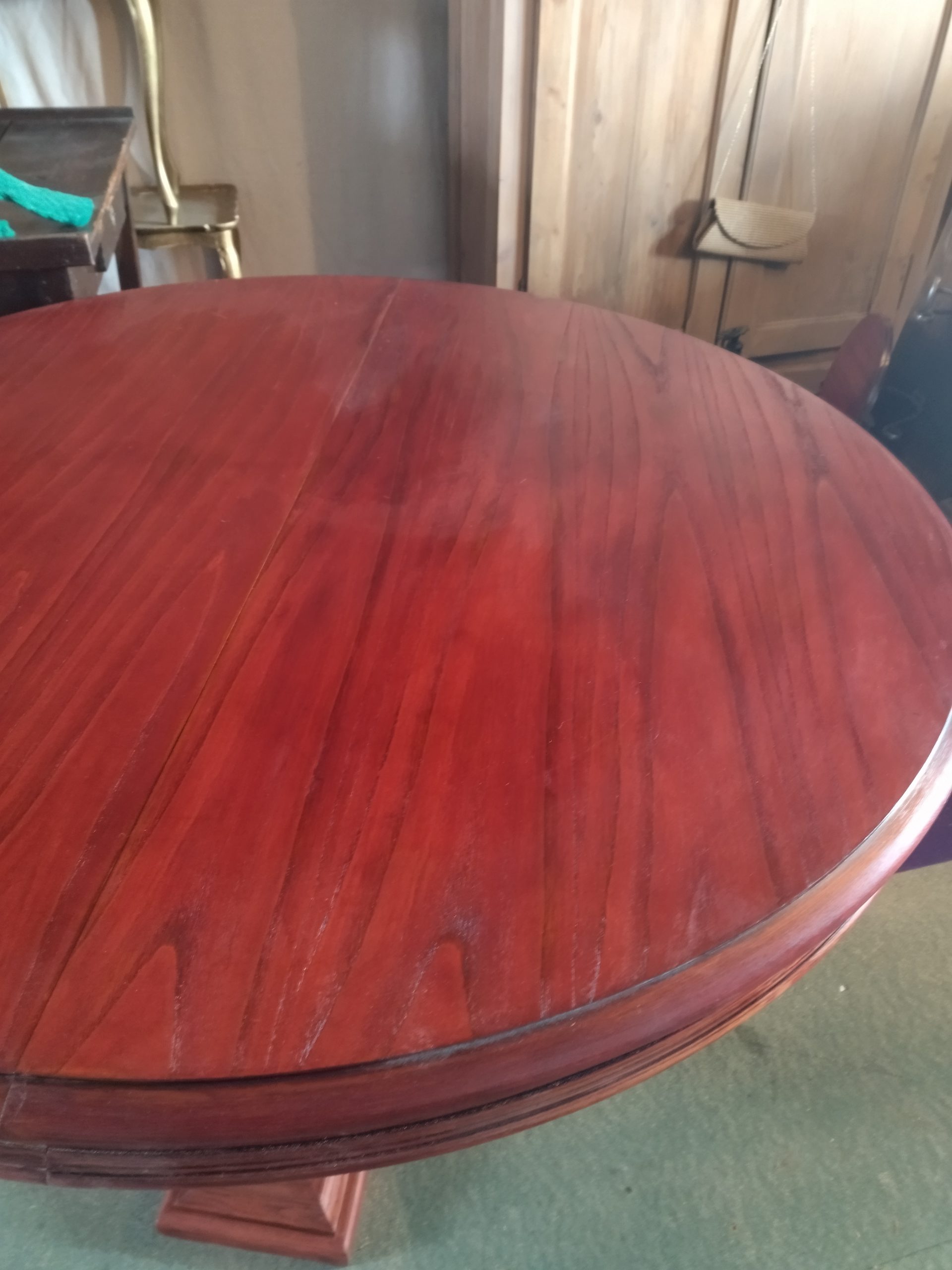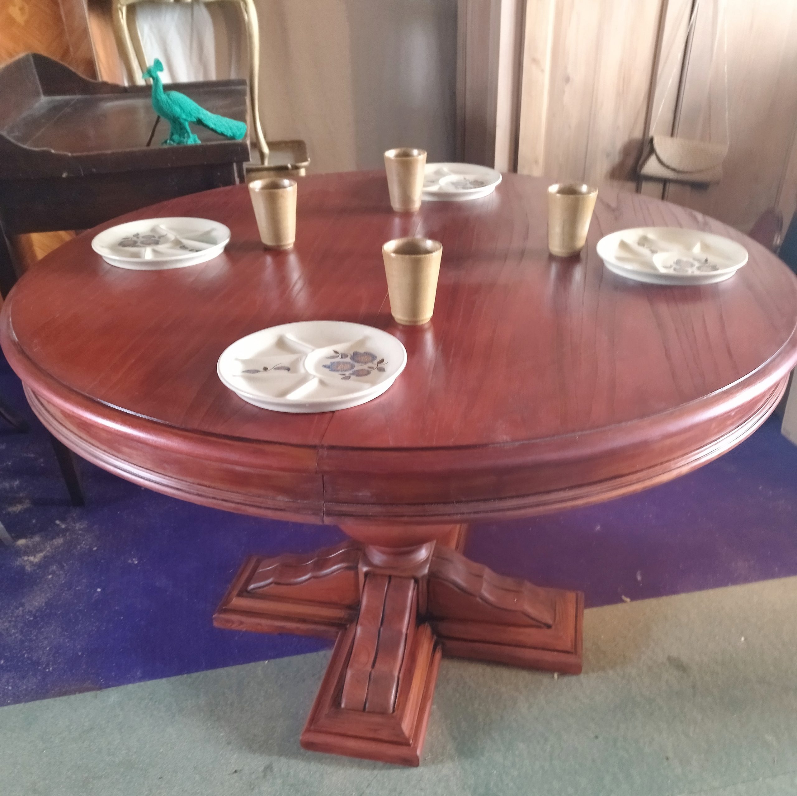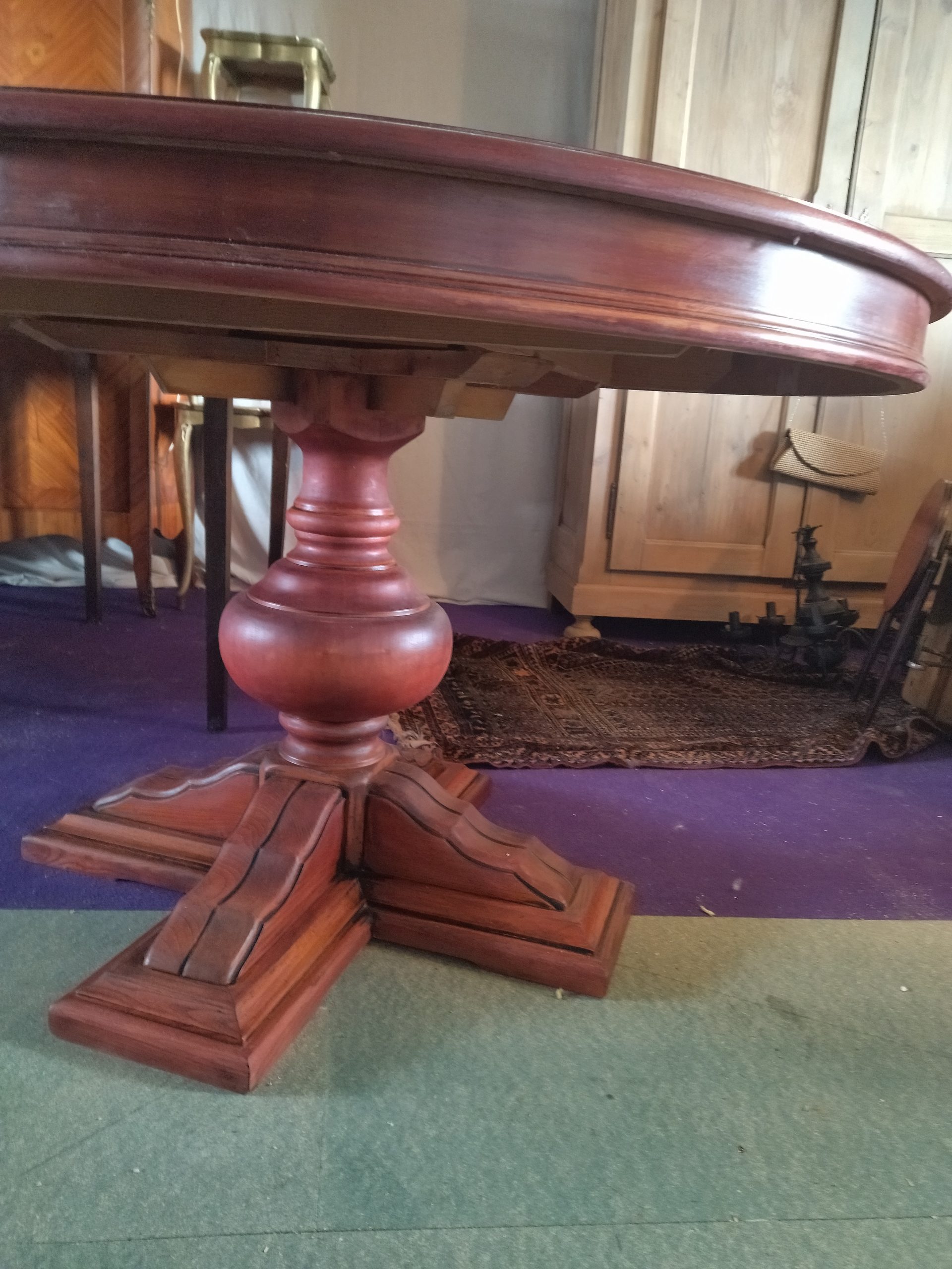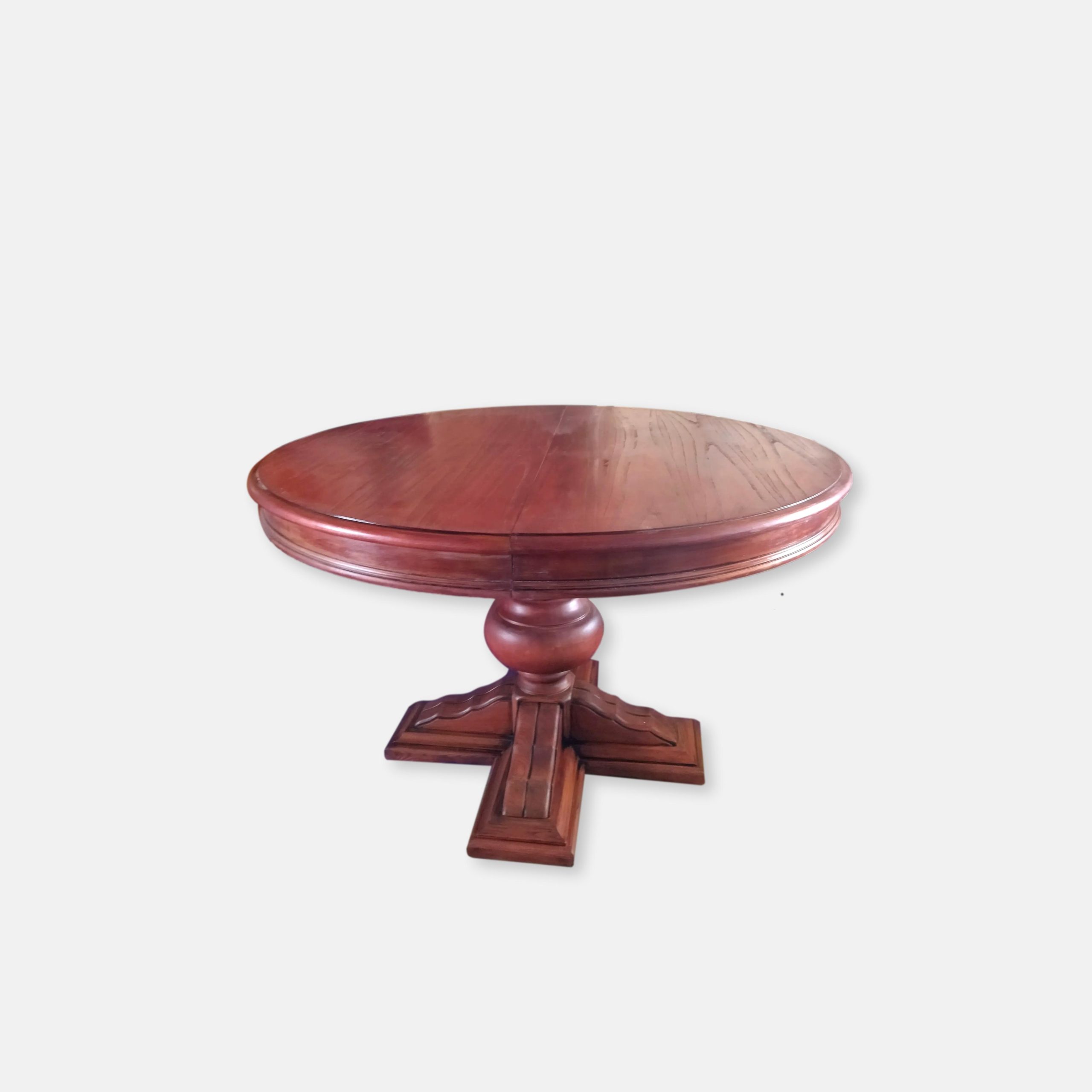 Table de salle à manger en bois massif de couleur acajou avec rallonges intérieures.