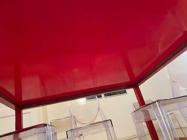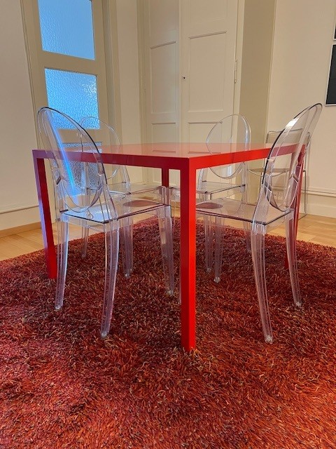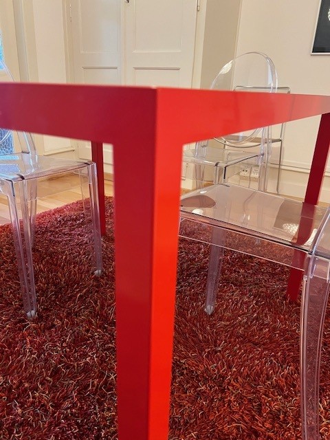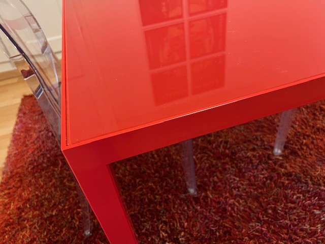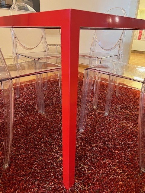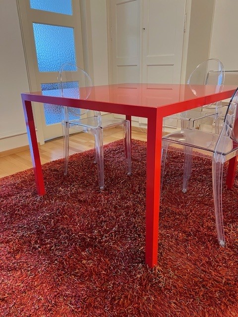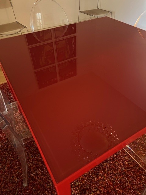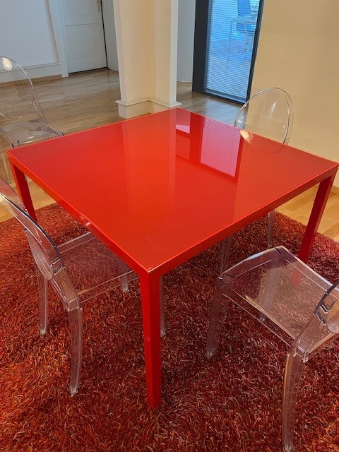 Table design rouge (style Cassina), en métal et verre, pièce unique fabriquée en Suisse chez Metallix (Berne), en très bon état (quelques rayures mais peu visibles), 100x100x73cm. À retirer à Fribourg.