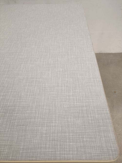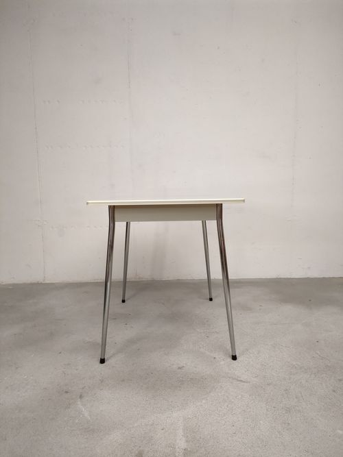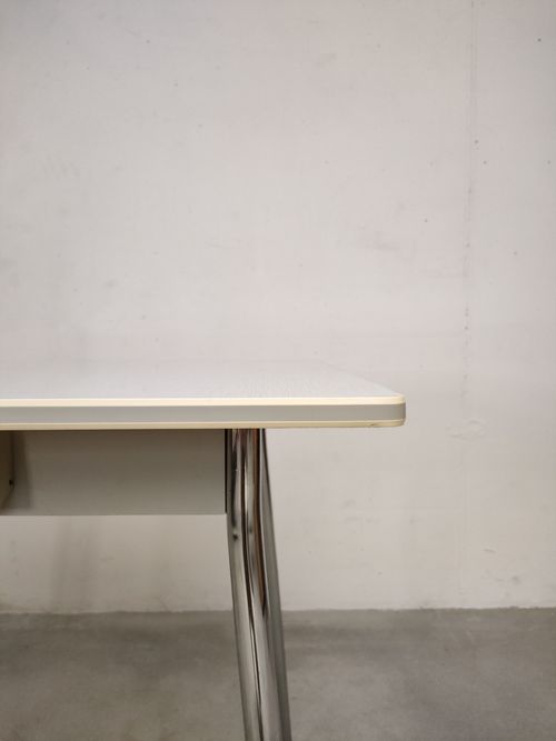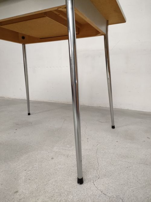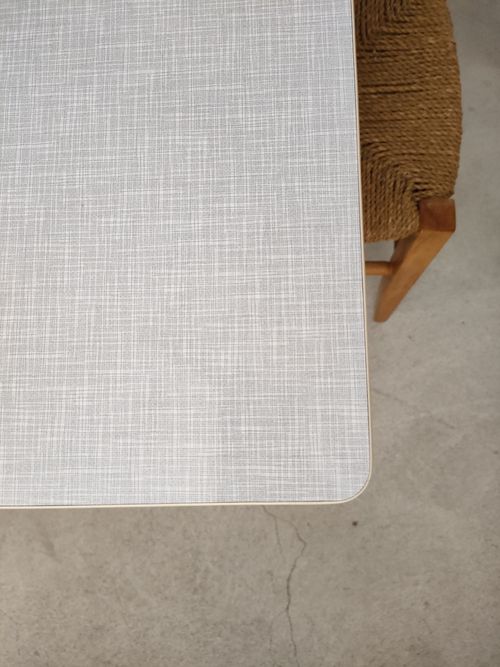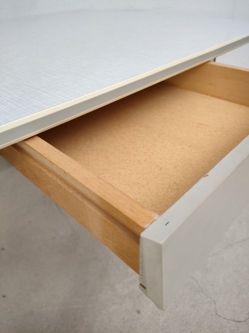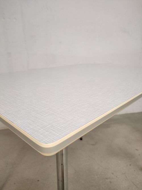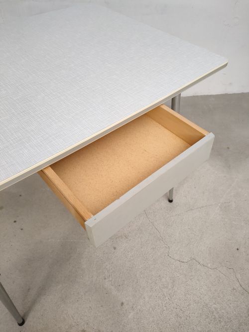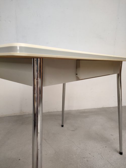 Produit venduTable vintage avec plateau en formica de couleur bleu/gris, piétement en métal et tiroir sous le plateau. Stable et solide et plateau en formica en parfait état. Elle peut servir comme table à manger mais également comme bureau.